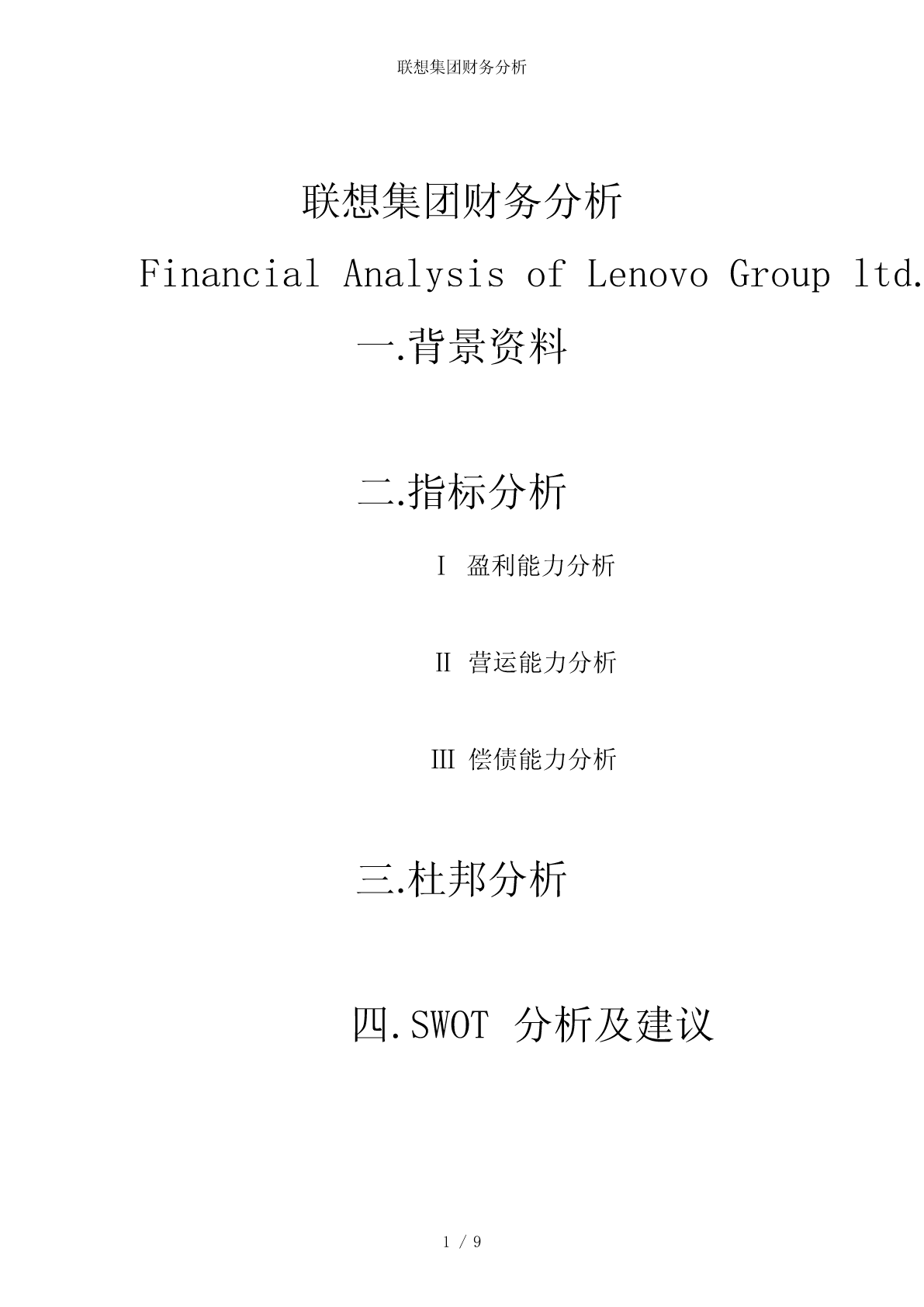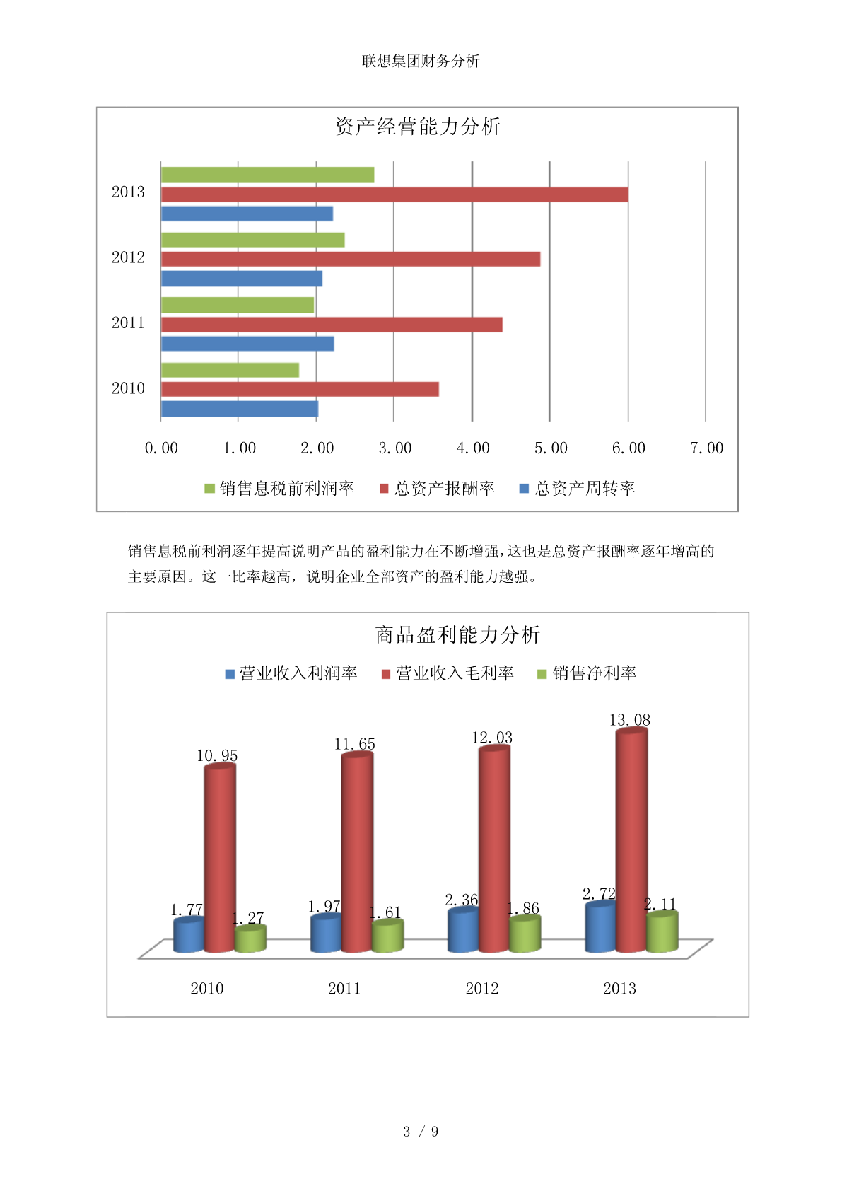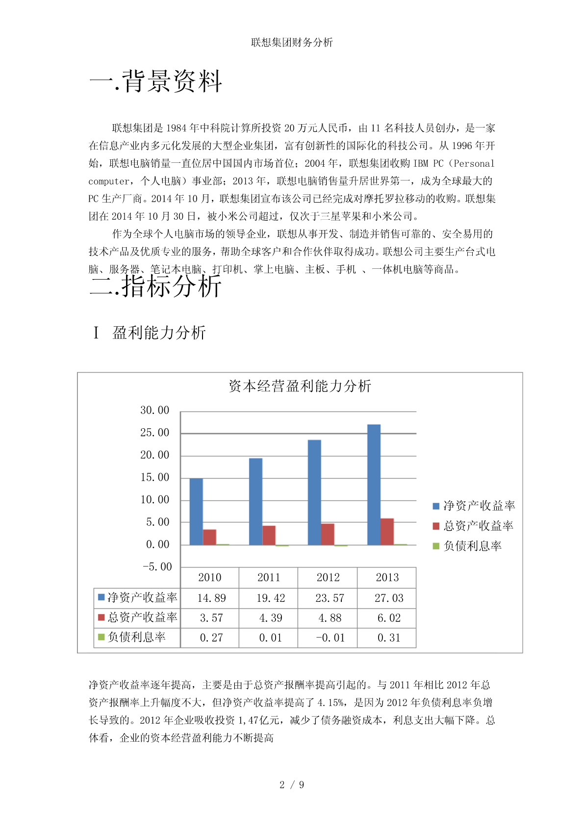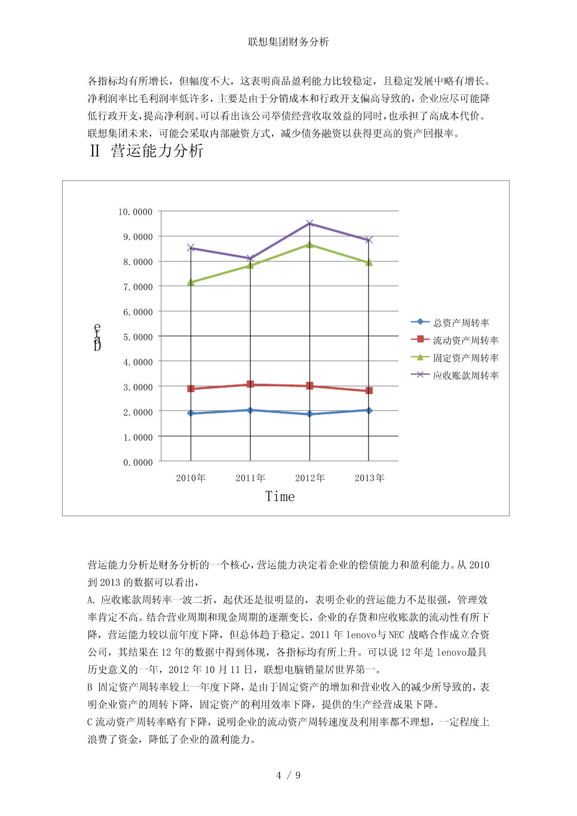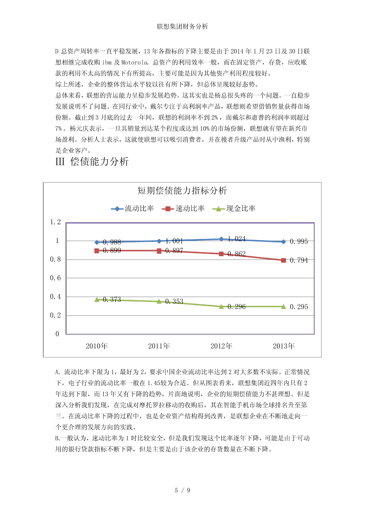 联想集团财务分析联想集团财务分析FinancialAnalysisofLenovoGroupltd.一.背景资料二.指标分析Ⅰ盈利能力分析Ⅱ营运能力分析Ⅲ偿债能力分析三.杜邦分析四.SWOT分析及建议1/9联想集团财务分析一.背景资料联想集团是1984年中科院计算所投资20万元人民币,由11名科技人员创办,是一家在信息产业内多元化发展的大型企业集团,富有创新性的国际化的科技公司。从1996年开始,联想电脑销量一直位居中国国内市场首位;2004年,联想集团收购IBMPC(Personalcomputer,个人电脑)事业部;2013年,联想电脑销售量升居世界第一,成为全球最大的PC生产厂商。2014年10月,联想集团宣布该公司已经完成对摩托罗拉移动的收购。联想集团在2014年10月30日,被小米公司超过,仅次于三星苹果和小米公司。作为全球个人电脑市场的领导企业,联想从事开发、制造并销售可靠的、安全易用的技术产品及优质专业的服务,帮助全球客户和合作伙伴取得成功。联想公司主要生产台式电脑、服务器、笔记本电脑、打印机、掌上电脑、主板、手机、一体机电脑等商品。二.指标分析Ⅰ盈利能力分析资本经营盈利能力分析30.0025.0020.0015.0010.00净资产收益率5.00总资产收益率0.00负债利息率-5.002010201120122013净资产收益率14.8919.4223.5727.03总资产收益率3.574.394.886.02负债利息率0.270.01-0.010.31净资产收益率逐年提高,主要是由于总资产报酬率提高引起的。与2011年相比2012年总资产报酬率上升幅度不大,但净资产收益率提高了4.15%,是因为2012年负债利息率负增长导致的。2012年企业吸收投资1,47亿元,减少了债务融资成本,利息支出大幅下降。总体看,企业的资本经营盈利能力不断提高2/9联想集团财务分析资产经营能力分析20132012201120100.001.002.003.004.005.006.007.00销售息税前利润率总资产报酬率总资产周转率销售息税前利润逐年提高说明产品的盈利能力在不断增强,这也是总资产报酬率逐年增高的主要原因。这一比率越高,说明企业全部资产的盈利能力越强。商品盈利能力分析营业收入利润率营业收入毛利率销售净利率13.0811.6512.0310.952.362.721.971.862.111.771.271.6120102011201220133/9联想集团财务分析各指标均有所增长,但幅度不大,这表明商品盈利能力比较稳定,且稳定发展中略有增长。净利润率比毛利润率低许多,主要是由于分销成本和行政开支偏高导致的,企业应尽可能降低行政开支,提高净利润。可以看出该公司举债经营收取效益的同时,也承担了高成本代价。联想集团未来,可能会采取内部融资方式,减少债务融资以获得更高的资产回报率。Ⅱ营运能力分析10.00009.00008.00007.00006.0000e总资产周转率t5.0000Da流动资产周转率4.0000固定资产周转率应收账款周转率3.00002.00001.00000.00002010年2011年2012年2013年Time营运能力分析是财务分析的一个核心,营运能力决定着企业的偿债能力和盈利能力。从2010到2013的数据可以看出,A.应收账款周转率一波二折,起伏还是很明显的,表明企业的营运能力不是很强,管理效率肯定不高。结合营业周期和现金周期的逐渐变长,企业的存货和应收账款的流动性有所下降,营运能力较以前年度下降,但总体趋于稳定。2011年lenovo与NEC战略合作成立合资公司,其结果在12年的数据中得到体现,各指标均有所上升。可以说12年是lenovo最具历史意义的一年,2012年10月11日,联想电脑销量居世界第一。B固定资产周转率较上一年度下降,是由于固定资产的增加和营业收入的减少所导致的,表明企业资产的周转下降,固定资产的利用效率下降,提供的生产经营成果下降。C流动资产周转率略有下降,说明企业的流动资产周转速度及利用率都不理想,一定程度上浪费了资金,降低了企业的盈利能力。4/9联想集团财务分析D总资产周转率一直平稳发展,13年各指标的下降主要是由于2014年1月23日及30日联想相继完成收购ibm及Motorola。总资产的利用效率一般,而在固定资产,存货,应收账款的利用不太高的情况下有所提高,主要可能是因为其他资产利用程度较好。综上所述,企业的整体营运水平较以往有所下降,但总体呈现较好态势。总体来看,联想的营运能力呈稳步发展趋势。这其实也是杨总很头疼的一个问题。一直稳步发展说明不了问题。在同行业中,戴尔专注于高利润率产品,联想则希望借销售量获得市场份额。截止到3月底的过去一年间,联想的利润率不到2%,而戴尔