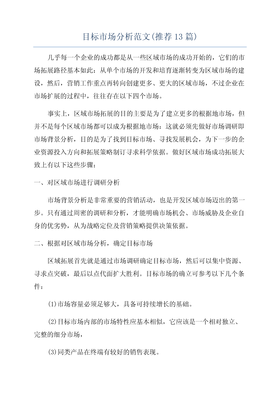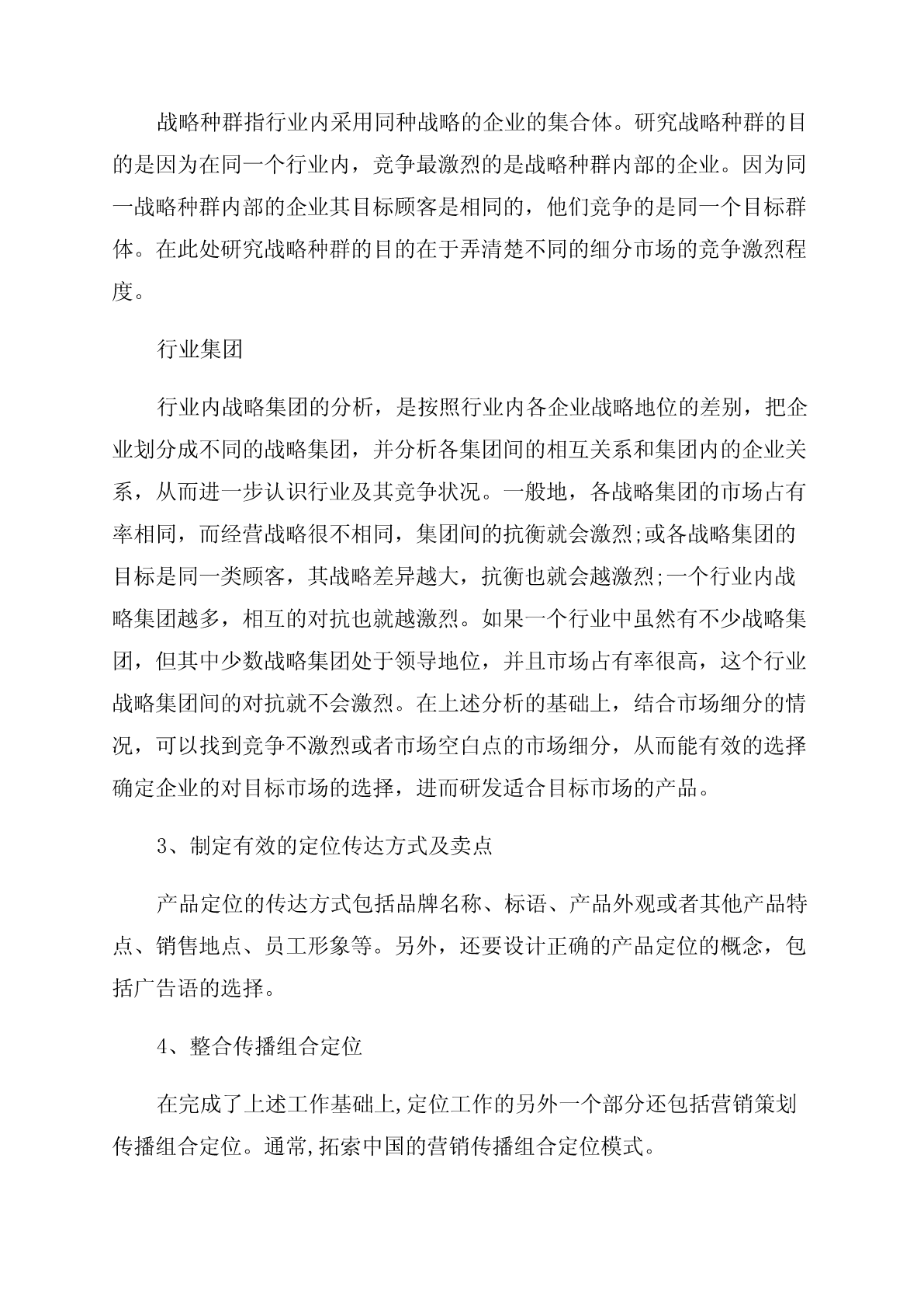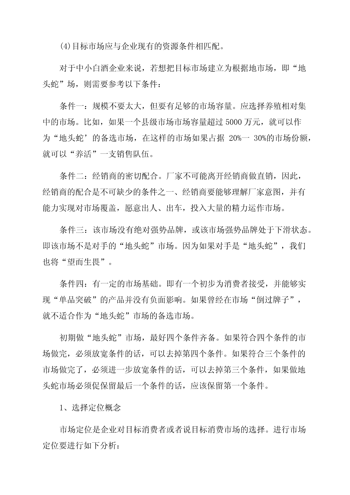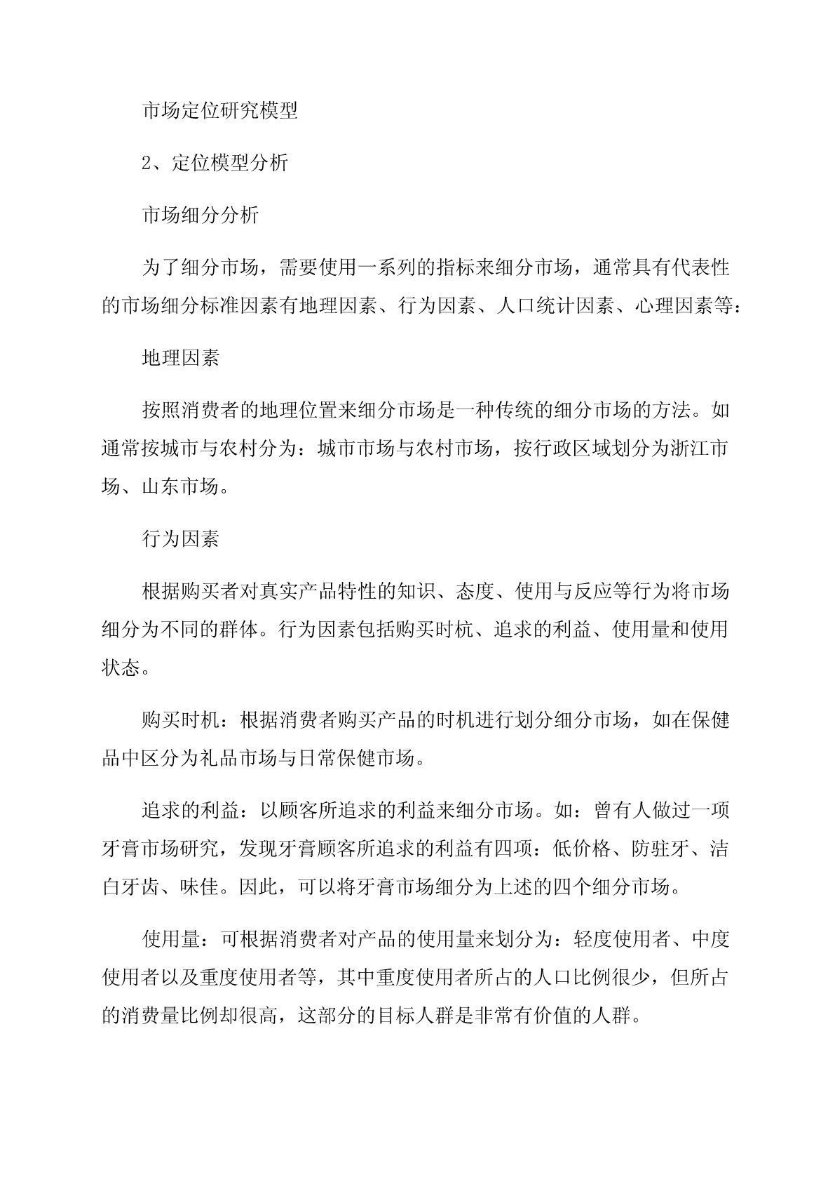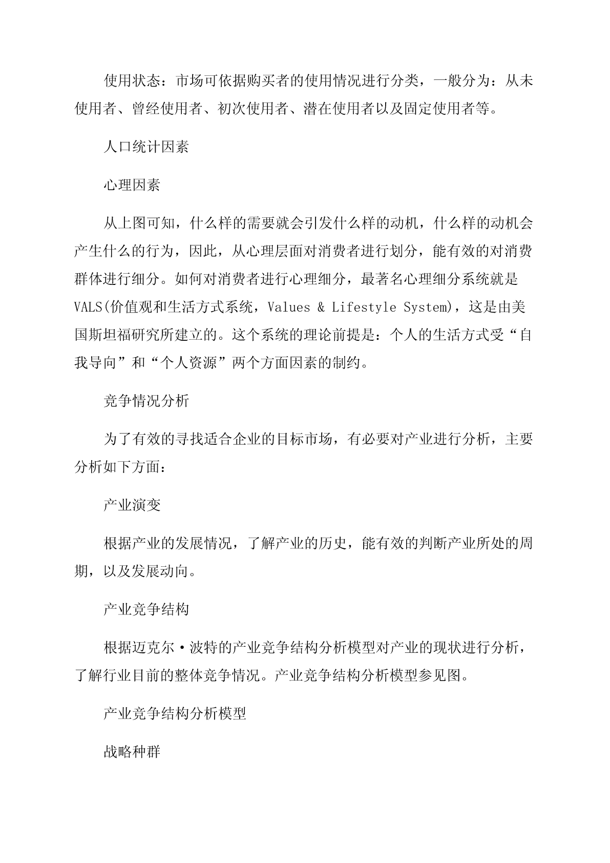 目标市场分析范文(推荐13篇)几乎每一个企业的成功都是从一些区域市场的成功开始的,它们的市场拓展路径基本如此:从单个市场的开发和培育逐渐转变为区域市场的建设,然后,营销工作重点再转向创建更多、更大的区域市场,不过企业在市场扩展的过程中,往往存在以下四个市场。事实上,区域市场拓展的目的主要是为了建立更多的根据地市场,但并不是每个区域市场都可以成为根据地市场:这就必须先做好市场调研即市场背景分析,目的是为了找到目标市场、寻找发展机会,为下一步的企业资源投入方向和拓展策略制订寻求科学依据。做好区域市场成功拓展大致上有以下这些步骤:一、对区域市场进行调研分析市场背景分析是非常重要的营销活动,也是开发区域市场迈出的第一步。只有通过周密的调研和分析,才能明确市场机会、市场威胁及企业自身的优劣势,从为战略定位及营销策略提供决策依据。二、根据对区域市场分析,确定目标市场区域拓展首先就是通过市场调研确定目标市场,然后可以集中资源、寻求点突破,最后以点代面扩大胜利。目标市场的确立可参考以下几个条件:(1)市场容量必须足够大,具备可持续增长的基础。(2)目标市场内部的市场特性应基本相似,它应该是一个相对独立、完整的细分市场,(3)同类产品在终端有较好的销售表现。(4)目标市场应与企业现有的资源条件相匹配。对于中小白酒企业来说,若想把目标市场建立为根据地市场,即“地头蛇”场,则需要参考以下条件:条件一:规模不要太大,但要有足够的市场容量。应选择养殖相对集中的市场。比如,如果一个县级市场市场容量超过5000万元,就可以作为“地头蛇’的备选市场,在这样的市场如果占据20%一30%的市场份额,就可以“养活”一支销售队伍。条件二:经销商的密切配合。厂家不可能离开经销商做直销,因此,经销商的配合是不可缺少的条件之一、经销商要能够理解厂家意图,并有能力实现对市场覆盖,愿意出人、出车,投入大量的精力运作市场。条件三:该市场没有绝对强势品牌,或该市场强势品牌处于下滑状态。即该市场不是对手的“地头蛇”市场。因为如果对手是“地头蛇”,我们也将“望而生畏”。条件四:有一定的市场基础。即有一个初步为消费者接受,并能够实现“单品突破”的产品并没有负面影响。如果曾经在市场“倒过牌子”,就不适合作为“地头蛇”市场的备选市场。初期做“地头蛇”市场,最好四个条件齐备。如果符合四个条件的市场做完,必须放宽条件的话,可以去掉第四个条件。如果符合三个条件的市场做完了,必须进一步放宽条件的话,可以去掉第三个条件,如果做地头蛇市场必须促保留最后一个条件的话,应该保留第一个条件。1、选择定位概念市场定位是企业对目标消费者或者说目标消费市场的选择。进行市场定位要进行如下分析:市场定位研究模型2、定位模型分析市场细分分析为了细分市场,需要使用一系列的指标来细分市场,通常具有代表性的市场细分标准因素有地理因素、行为因素、人口统计因素、心理因素等:地理因素按照消费者的地理位置来细分市场是一种传统的细分市场的方法。如通常按城市与农村分为:城市市场与农村市场,按行政区域划分为浙江市场、山东市场。行为因素根据购买者对真实产品特性的知识、态度、使用与反应等行为将市场细分为不同的群体。行为因素包括购买时杭、追求的利益、使用量和使用状态。购买时机:根据消费者购买产品的时机进行划分细分市场,如在保健品中区分为礼品市场与日常保健市场。追求的利益:以顾客所追求的利益来细分市场。如:曾有人做过一项牙膏市场研究,发现牙膏顾客所追求的利益有四项:低价格、防驻牙、洁白牙齿、味佳。因此,可以将牙膏市场细分为上述的四个细分市场。使用量:可根据消费者对产品的使用量来划分为:轻度使用者、中度使用者以及重度使用者等,其中重度使用者所占的人口比例很少,但所占的消费量比例却很高,这部分的目标人群是非常有价值的人群。使用状态:市场可依据购买者的使用情况进行分类,一般分为:从未使用者、曾经使用者、初次使用者、潜在使用者以及固定使用者等。人口统计因素心理因素从上图可知,什么样的需要就会引发什么样的动机,什么样的动机会产生什么的行为,因此,从心理层面对消费者进行划分,能有效的对消费群体进行细分。如何对消费者进行心理细分,最著名心理细分系统就是VALS(价值观和生活方式系统,Values&LifestyleSystem),这是由美国斯坦福研究所建立的。这个系统的理论前提是:个人的生活方式受“自我导向”和“个人资源”两个方面因素的制约。竞争情况分析为了有效的寻找适合企业的目标市场,有必要对产业进行分析,主要分析如下方面:产业演变根据产业的发展情况,了解产业的历史,能有效的判断产业所处的周期,以及发展动向。产业竞争结构根据迈克尔·波特的产业竞争结构分析模型对产业的现状进行分析,了解行业目前的整体竞争情况。产业竞争结构分析模型参见图。产业竞争结构分析模型战略