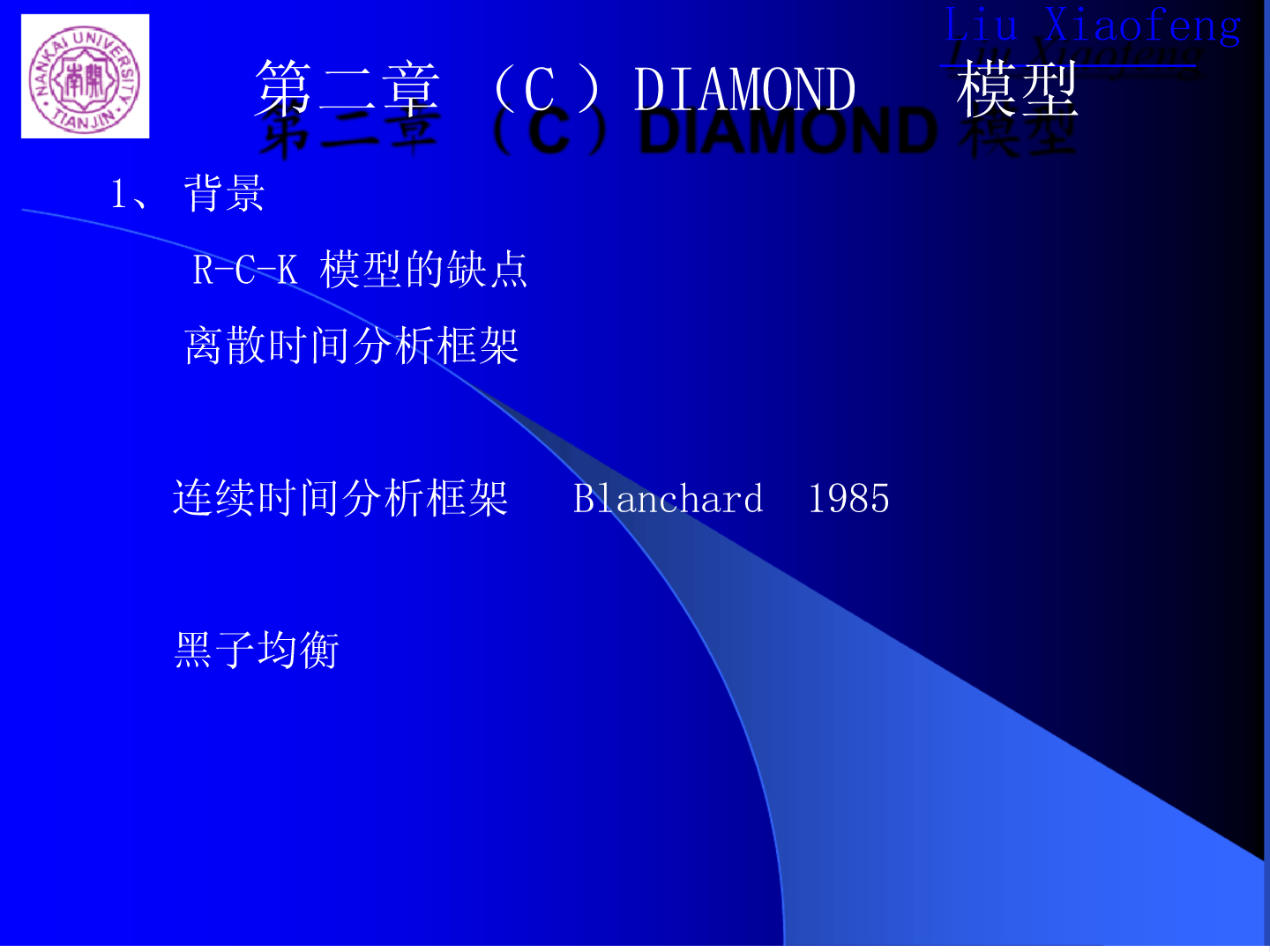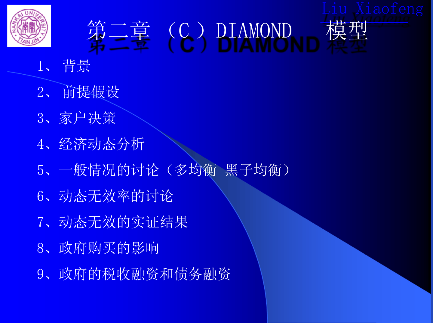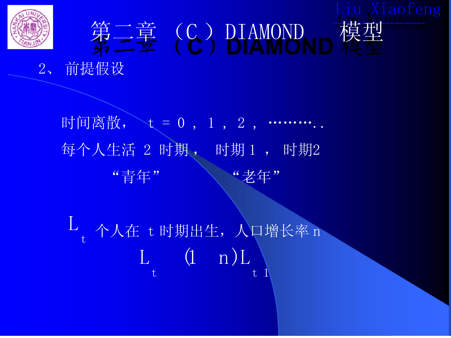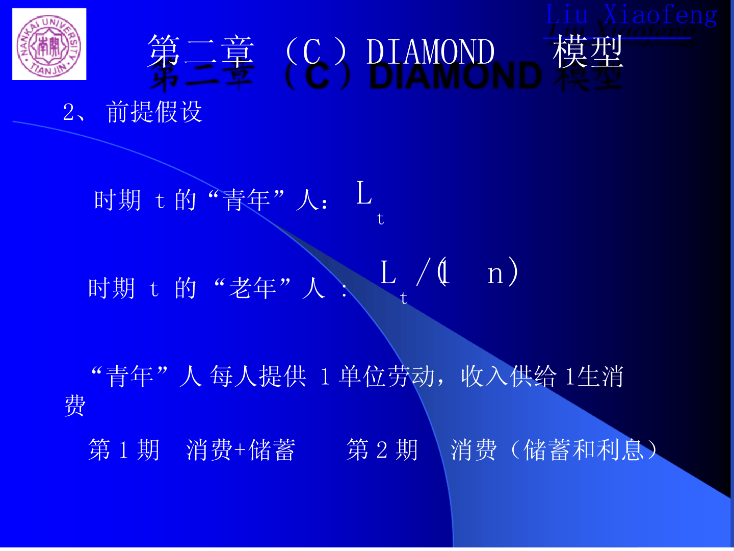 LiuXiaofeng第二章(C)DIAMOND模型1、背景2、前提假设3、家户决策4、经济动态分析5、一般情况的讨论(多均衡黑子均衡)6、动态无效率的讨论7、动态无效的实证结果8、政府购买的影响9、政府的税收融资和债务融资LiuXiaofeng第二章(C)DIAMOND模型1、背景R-C-K模型的缺点离散时间分析框架连续时间分析框架Blanchard1985黑子均衡LiuXiaofeng第二章(C)DIAMOND模型1、背景2、前提假设3、家户决策4、经济动态分析5、一般情况的讨论(多均衡黑子均衡)6、动态无效率的讨论7、动态无效的实证结果8、政府购买的影响9、政府的税收融资和债务融资LiuXiaofeng第二章(C)DIAMOND模型2、前提假设时间离散,t=0,1,2,………..每个人生活2时期,时期1,时期2“青年”“老年”L个人在t时期出生,人口增长率ntL(1n)Ltt1LiuXiaofeng第二章(C)DIAMOND模型2、前提假设时期t的“青年”人:LtL/(1n)时期t的“老年”人:t“青年”人每人提供1单位劳动,收入供给1生消费第1期消费+储蓄第2期消费(储蓄和利息)LiuXiaofeng第二章(C)DIAMOND模型2、前提假设C,C分别表示时期t青年人和老年人的消费。1t2t个体的一生总效用的决定:C,C1t2t1假定效用函数为CRRA则:C11C1U1t2t1t11101LiuXiaofeng第二章(C)DIAMOND模型2、前提假设经济中存在许多相同的厂商:YF(K,AL)tttt规模报酬不变稻田条件A(1g)Att1wf(k)kf'(k)市场完全竞争ttttrf'(k)ttLiuXiaofeng第二章(C)DIAMOND模型2、前提假设每个时期:青年人提供劳动老年人提供资本青年人得到工资老年人得到利润KL(wAC)t1ttt1tLiuXiaofeng第二章(C)DIAMOND模型1、背景2、前提假设3、家户决策4、经济动态分析5、一般情况的讨论(多均衡黑子均衡)6、动态无效率的讨论7、动态无效的实证结果8、政府购买的影响9、政府的税收融资和债务融资LiuXiaofeng第二章(C)DIAMOND模型3、家户决策预算约束:C(1r)(wAC)2t1t1tt1t1CCwA1t1r2t1ttt1一生消费现值等于总收入LiuXiaofeng第二章(C)DIAMOND模型3、家户决策家户最大化决策:C11C1MaxU1t2t1tC,C1111t2t11s.t.CCwA1t1r2t1ttt1LiuXiaofeng第二章(C)DIAMOND模型3、家户决策C11C1L1t2t11111wACCtt1t1r2t1t1LiuXiaofeng第二章(C)DIAMOND模型3、家户决策F.O.C.C1t11C12t11rt1LiuXiaofeng第二章(C)DIAMOND模型3、家户决策11CC12t11r1tt1C1r1/2t1t1C11tLiuXiaofeng第二章(C)DIAMOND模型3、家户决策经济含义:个体将C减少C1t将C用于储蓄C将增加(1r)C2t1t1效用成本CC1t1效用增加C(1r)C12t1t1LiuXiaofeng第二章(C)DIAMOND模型3、家户决策C1r1/2t1t1C11t1CCwA1t1r2t1ttt111/CAw1t1tt11/1rt1LiuXiaofeng第二章(C)DIAMOND模型3、家户决策11/CAw1t1tt11/1rt111rs(r)t1111/1rt1C1s(r)Aw1tttLiuXiaofeng第二章(C)DIAMOND模型3、家户决策11rs(r)t11d1r112t11rdrt1t111LiuXiaofeng第二章(C)DIAMOND模型3、家户决策rs(r)替代效用收入效应(一生收入现值增加)s(r)总效应?111LiuXiaofeng第二章(C)DIAMOND模型1、背景2、前提假设3、家户决策4、经济动态分析5、一般情况的讨论(多均衡黑子均衡)6、动态无效率的讨论7、动态无效的实证结果8、政