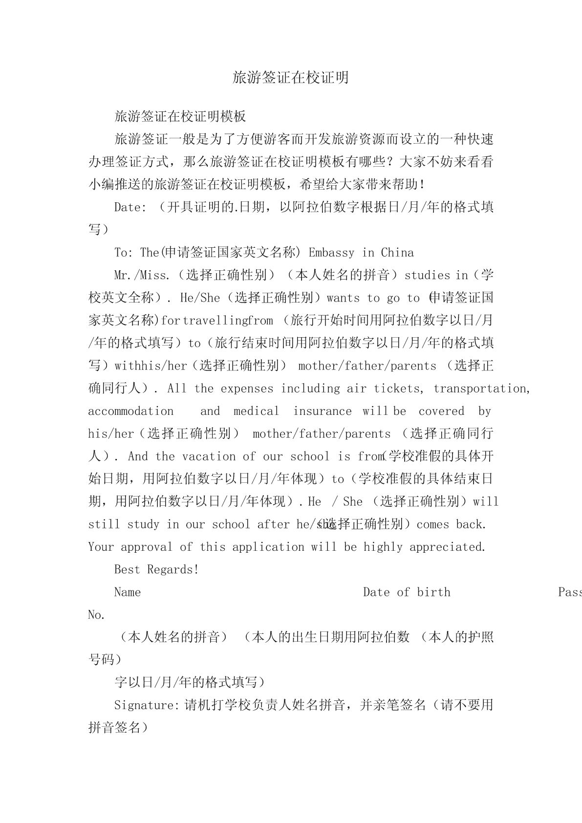 旅游签证在校证明旅游签证在校证明模板旅游签证一般是为了方便游客而开发旅游资源而设立的一种快速办理签证方式,那么旅游签证在校证明模板有哪些?大家不妨来看看小编推送的旅游签证在校证明模板,希望给大家带来帮助!Date:(开具证明的.日期,以阿拉伯数字根据日/月/年的格式填写)To:The(申请签证国家英文名称)EmbassyinChinaMr./Miss.(选择正确性别)(本人姓名的拼音)studiesin(学校英文全称).He/She(选择正确性别)wantstogoto(申请签证国家英文名称)fortravellingfrom(旅行开始时间用阿拉伯数字以日/月/年的格式填写)to(旅行结束时间用阿拉伯数字以日/月/年的格式填写)withhis/her(选择正确性别)mother/father/parents(选择正确同行人).Alltheexpensesincludingairtickets,transportation,accommodationandmedicalinsurancewillbecoveredbyhis/her(选择正确性别)mother/father/parents(选择正确同行人).Andthevacationofourschoolisfrom(学校准假的具体开始日期,用阿拉伯数字以日/月/年体现)to(学校准假的具体结束日期,用阿拉伯数字以日/月/年体现).He/She(选择正确性别)willstillstudyinourschoolafterhe/she(选择正确性别)comesback.Yourapprovalofthisapplicationwillbehighlyappreciated.BestRegards!NameDateofbirthPassportsNo.(本人姓名的拼音)(本人的出生日期用阿拉伯数(本人的护照号码)字以日/月/年的格式填写)Signature:请机打学校负责人姓名拼音,并亲笔签名(请不要用拼音签名)OccupationofSignature:签字人职务Seal:加盖学校公章SchoolName:学校英文名称Add:学校地址Tel:学校电话Fax:学校传真