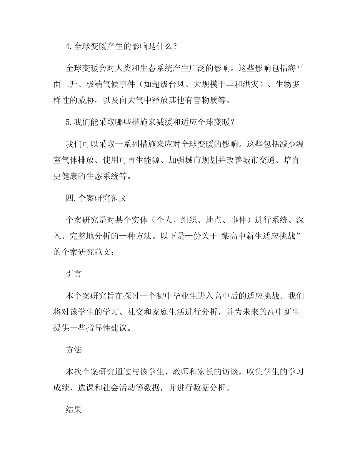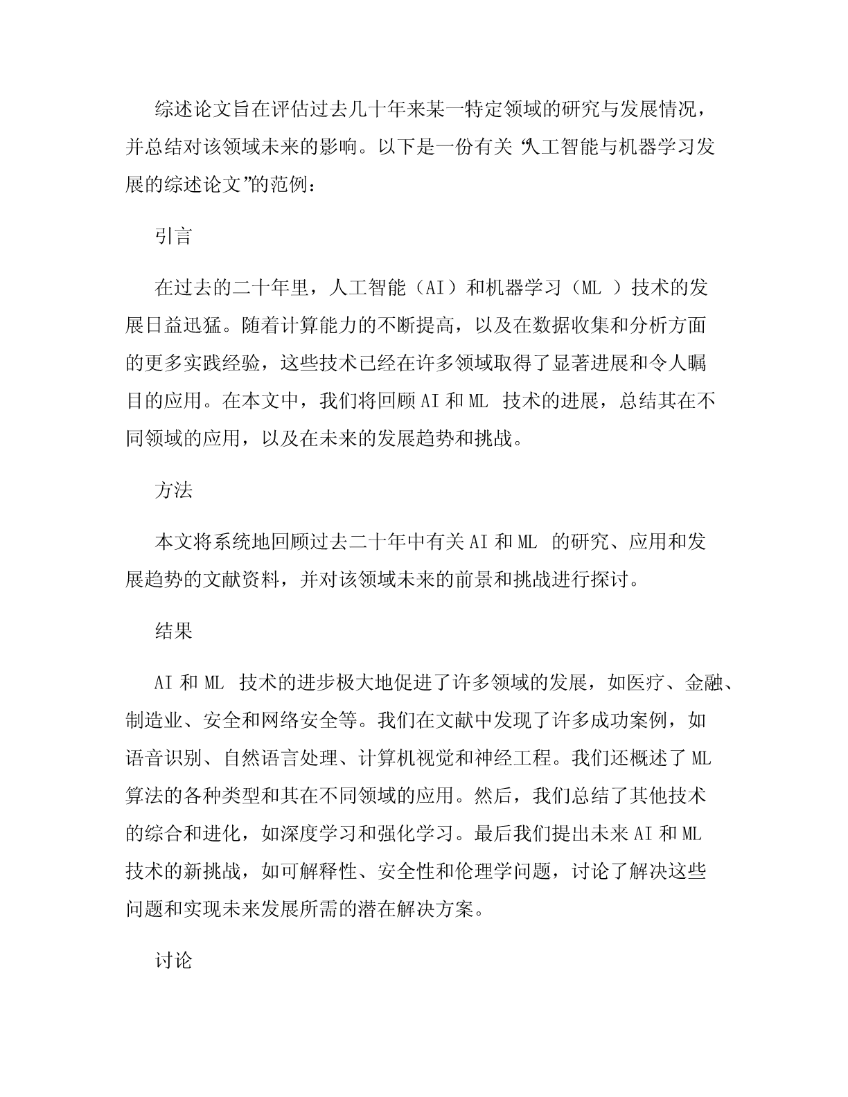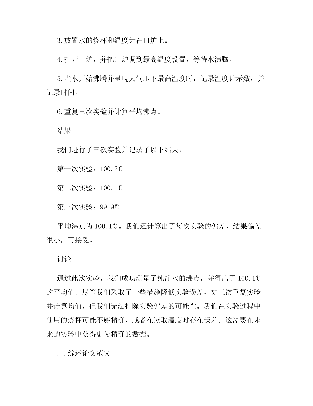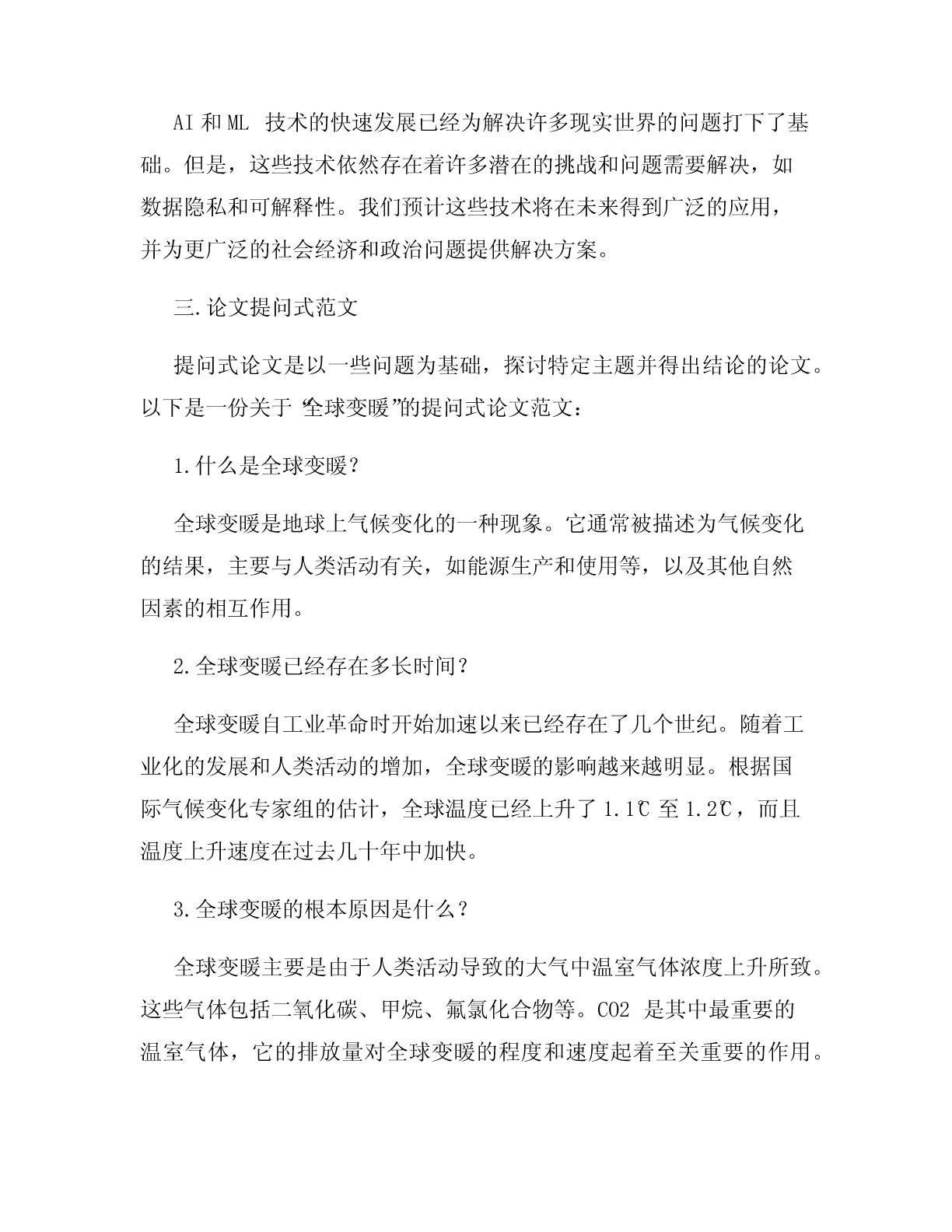 论文范文(4篇)在学术领域写论文是一项重要的任务,研究生甚至本科生都需要撰写一定数量的论文才能毕业。对于许多人来说,写论文是一项挑战,因为需要具备良好的研究技能、写作能力和时间管理技能。因此,在这篇文章中,我将提供四篇不同类型的论文范文,以便读者获得写好论文所需的基础知识和灵感。一.实验报告范文实验报告通常由四个主要部分组成:引言、方法、结果和讨论。以下是一份关于“水的沸点实验”的实验报告范文:引言本次实验的目标是确定水的沸点。沸点指的是液体从液相向气相转化所需的温度,在大气压力下,水沸点约为100°C(212°F)。确定水的沸点非常重要,因为它是许多日常生活及工业过程中必需的参数。因此,本实验将探讨如何通过简单的实验来确定水的沸点。方法为了测量水的沸点,我们利用了一台实验室专用的销售式口炉,该口炉可以提供均匀且高效的加热作用。我们采用了以下方法来测量水的沸点:1.把100毫升纯净水倒入烧杯中。2.把温度计插入水中,确保水的表面和温度计测量的是同一温度。3.放置水的烧杯和温度计在口炉上。4.打开口炉,并把口炉调到最高温度设置,等待水沸腾。5.当水开始沸腾并呈现大气压下最高温度时,记录温度计示数,并记录时间。6.重复三次实验并计算平均沸点。结果我们进行了三次实验并记录了以下结果:第一次实验:100.2°C第二次实验:100.1°C第三次实验:99.9°C平均沸点为100.1°C。我们还计算出了每次实验的偏差,结果偏差很小,可接受。讨论通过此次实验,我们成功测量了纯净水的沸点,并得出了100.1°C的平均值。尽管我们采取了一些措施降低实验误差,如三次重复实验并计算均值,但我们无法排除实验偏差的可能性。我们在实验过程中使用的烧杯可能不够精确,或者在读取温度时存在误差。这需要在未来的实验中获得更为精确的数据。二.综述论文范文综述论文旨在评估过去几十年来某一特定领域的研究与发展情况,并总结对该领域未来的影响。以下是一份有关“人工智能与机器学习发展的综述论文”的范例:引言在过去的二十年里,人工智能(AI)和机器学习(ML)技术的发展日益迅猛。随着计算能力的不断提高,以及在数据收集和分析方面的更多实践经验,这些技术已经在许多领域取得了显著进展和令人瞩目的应用。在本文中,我们将回顾AI和ML技术的进展,总结其在不同领域的应用,以及在未来的发展趋势和挑战。方法本文将系统地回顾过去二十年中有关AI和ML的研究、应用和发展趋势的文献资料,并对该领域未来的前景和挑战进行探讨。结果AI和ML技术的进步极大地促进了许多领域的发展,如医疗、金融、制造业、安全和网络安全等。我们在文献中发现了许多成功案例,如语音识别、自然语言处理、计算机视觉和神经工程。我们还概述了ML算法的各种类型和其在不同领域的应用。然后,我们总结了其他技术的综合和进化,如深度学习和强化学习。最后我们提出未来AI和ML技术的新挑战,如可解释性、安全性和伦理学问题,讨论了解决这些问题和实现未来发展所需的潜在解决方案。讨论AI和ML技术的快速发展已经为解决许多现实世界的问题打下了基础。但是,这些技术依然存在着许多潜在的挑战和问题需要解决,如数据隐私和可解释性。我们预计这些技术将在未来得到广泛的应用,并为更广泛的社会经济和政治问题提供解决方案。三.论文提问式范文提问式论文是以一些问题为基础,探讨特定主题并得出结论的论文。以下是一份关于“全球变暖”的提问式论文范文:1.什么是全球变暖?全球变暖是地球上气候变化的一种现象。它通常被描述为气候变化的结果,主要与人类活动有关,如能源生产和使用等,以及其他自然因素的相互作用。2.全球变暖已经存在多长时间?全球变暖自工业革命时开始加速以来已经存在了几个世纪。随着工业化的发展和人类活动的增加,全球变暖的影响越来越明显。根据国际气候变化专家组的估计,全球温度已经上升了1.1°C至1.2°C,而且温度上升速度在过去几十年中加快。3.全球变暖的根本原因是什么?全球变暖主要是由于人类活动导致的大气中温室气体浓度上升所致。这些气体包括二氧化碳、甲烷、氟氯化合物等。CO2是其中最重要的温室气体,它的排放量对全球变暖的程度和速度起着至关重要的作用。4.全球变暖产生的影响是什么?全球变暖会对人类和生态系统产生广泛的影响。这些影响包括海平面上升、极端气候事件(如超级台风、大规模干旱和洪灾)、生物多样性的威胁,以及向大气中释放其他有害物质等。5.我们能采取哪些措施来减缓和适应全球变暖?我们可以采取一系列措施来应对全球变暖的影响。这些包括减少温室气体排放、使用可再生能源、加强城市规划并改善城市交通、培育更健康的生态系统等。四.个案研究范文个案研究是对某个实体(个人、组织、地点、事件)进行系统、深入、完整地分析的一种方法。以下是一份关于“某高中新生适应挑战”的个案研究范文:引言本个案