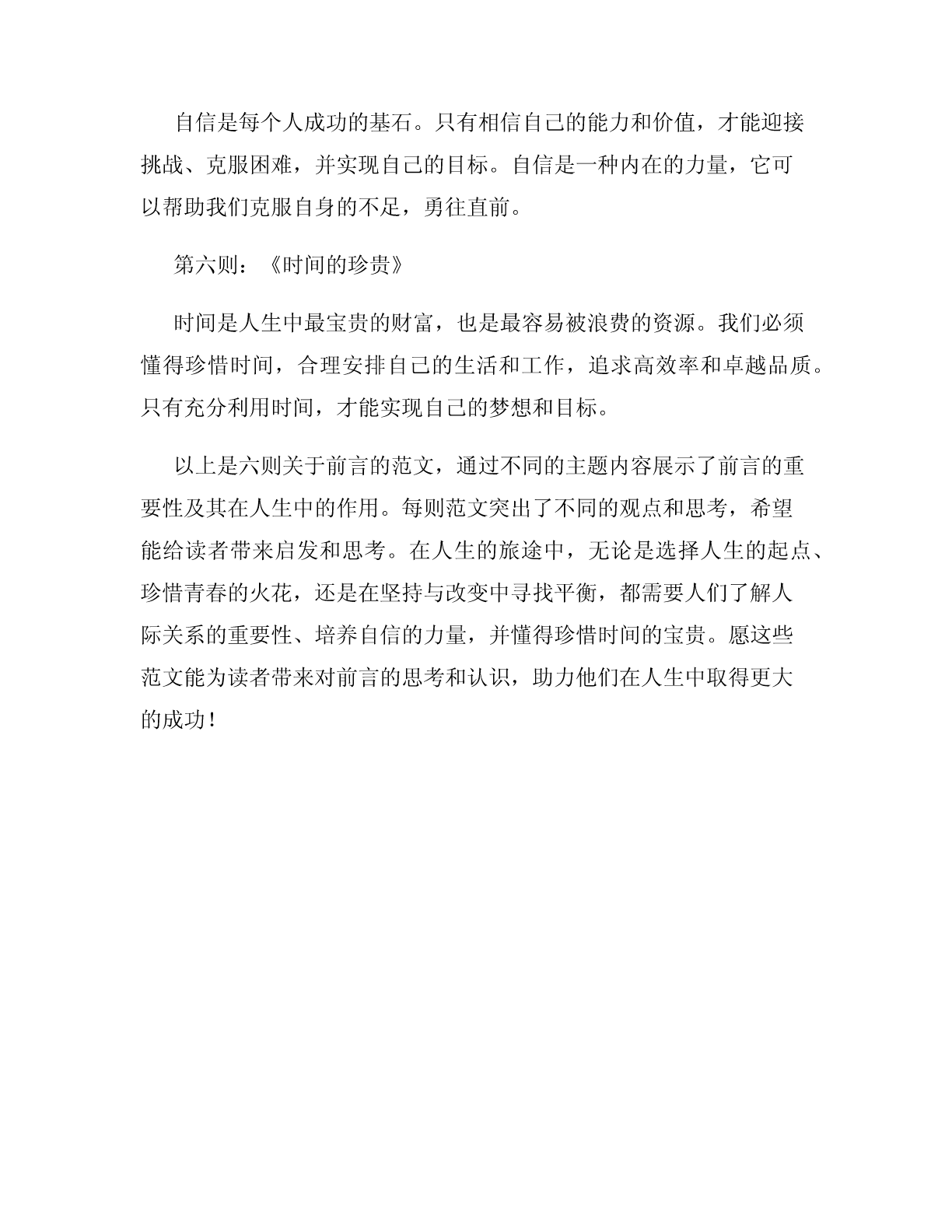 前言范文6则优秀版前言范文(六则)第一则:《人生的起点》人生是一段旅程,每个人都有自己的起点。人生起点的选择和走向将决定一个人的命运。每个人都应该珍惜自己的起点,努力追求自己的梦想和目标,从而开创属于自己的成功之路。第二则:《青春的火花》青春年华是人生中最宝贵的时光,也是拥有最大潜力的阶段。青春是一朵火花,绽放出的光芒将照亮未来的道路。年轻人应该抓住青春的机遇,追逐自己的梦想,发挥自身的才华,为自己的未来奠定坚实的基础。第三则:《坚持与改变》人生中既需要坚持,也需要改变。坚持可以让一个人始终追寻自己的目标,不断超越自己;改变可以让一个人适应环境的变化,不断创新和进步。坚持和改变之间的平衡是人生成功的关键。第四则:《人际关系的重要性》人际关系是社会生活中不可或缺的一部分。良好的人际关系可以带来许多机会和资源,让人生更加丰富多彩。因此,每个人都应该学会与人相处,积极建立和维护自己的社交网络。第五则:《自信的力量》自信是每个人成功的基石。只有相信自己的能力和价值,才能迎接挑战、克服困难,并实现自己的目标。自信是一种内在的力量,它可以帮助我们克服自身的不足,勇往直前。第六则:《时间的珍贵》时间是人生中最宝贵的财富,也是最容易被浪费的资源。我们必须懂得珍惜时间,合理安排自己的生活和工作,追求高效率和卓越品质。只有充分利用时间,才能实现自己的梦想和目标。以上是六则关于前言的范文,通过不同的主题内容展示了前言的重要性及其在人生中的作用。每则范文突出了不同的观点和思考,希望能给读者带来启发和思考。在人生的旅途中,无论是选择人生的起点、珍惜青春的火花,还是在坚持与改变中寻找平衡,都需要人们了解人际关系的重要性、培养自信的力量,并懂得珍惜时间的宝贵。愿这些范文能为读者带来对前言的思考和认识,助力他们在人生中取得更大的成功!