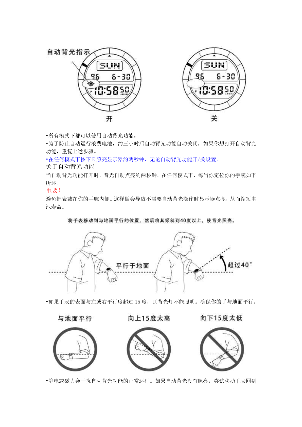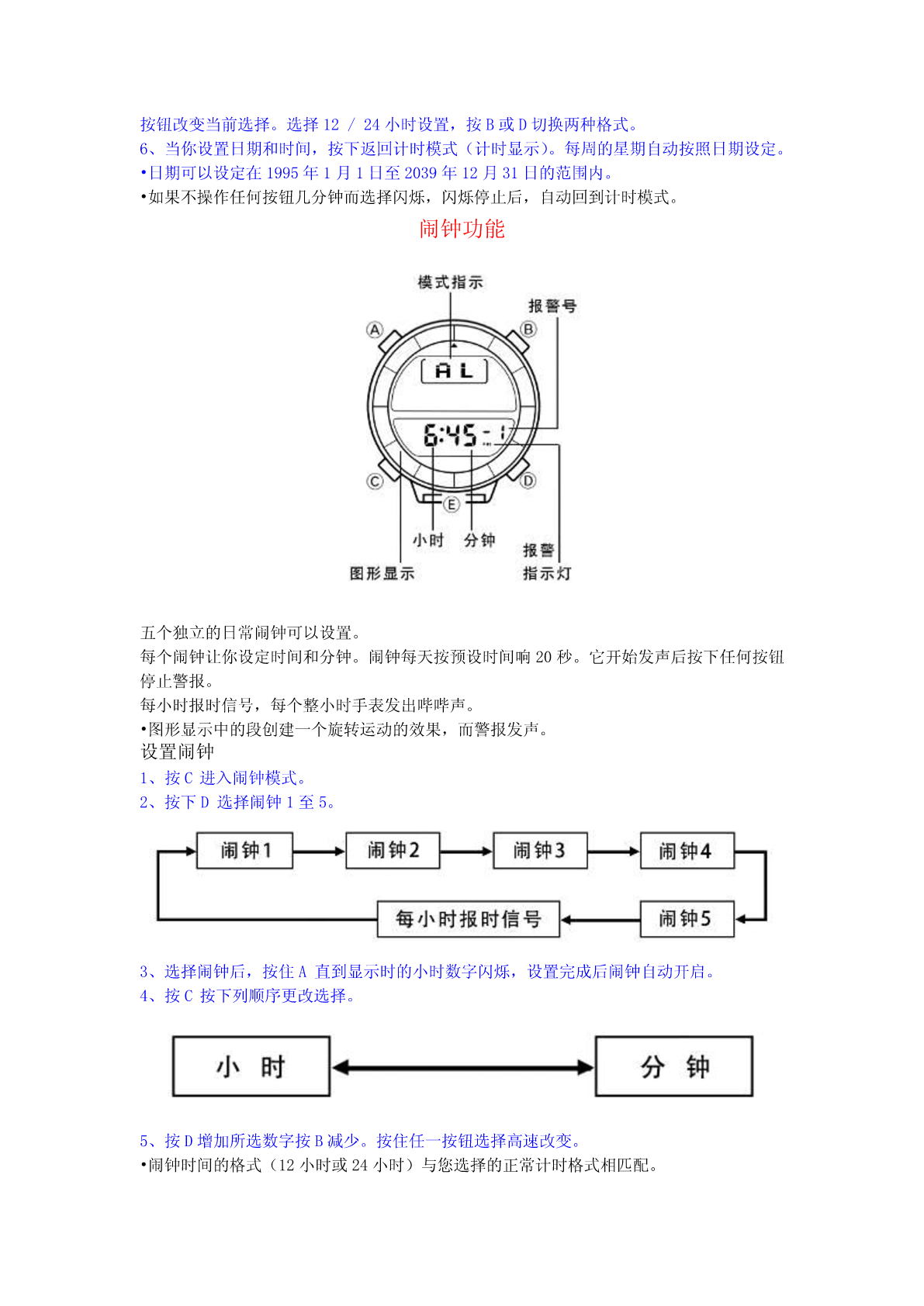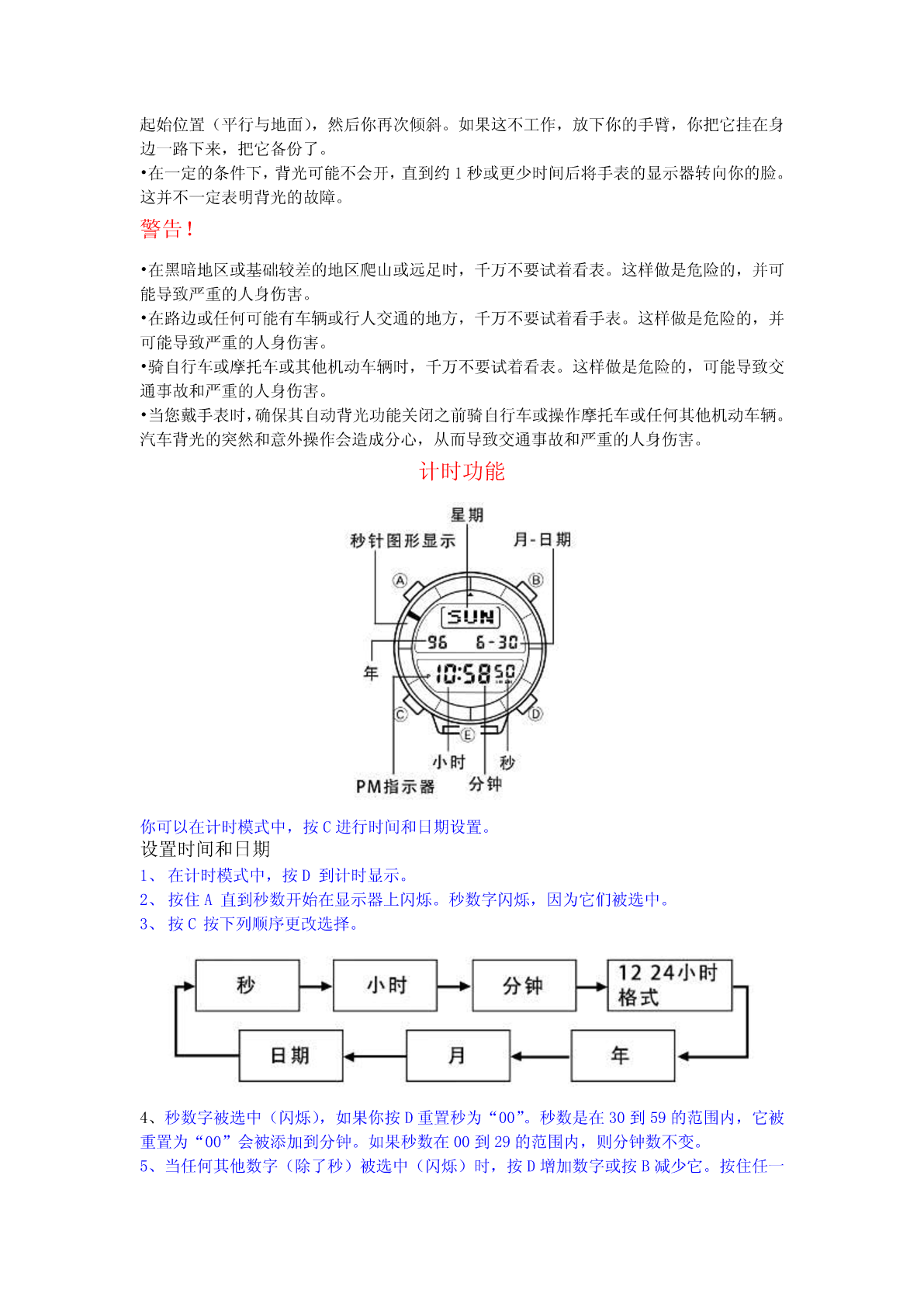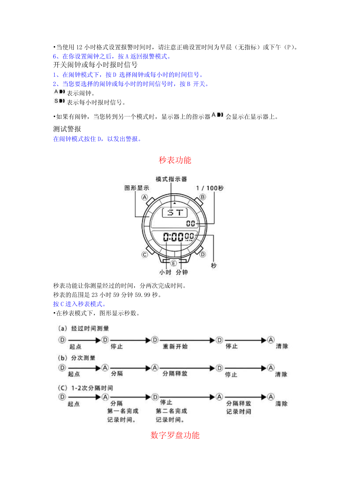 卡西欧登山表PRT-40(1471机芯)通用指南PRT-40(1471机芯)具有自动背光灯功能、计时功能、闹钟功能、秒表功能、数字罗盘功能、高度计功能、气压计功能、温度计功能。•按C更改模式。按住C在任何模式下一两秒切换回计时模式。•除了下面所示的模式,这款手表还配备了数字指南针模式。详情见“数字罗盘功能”。背光灯功能这手表有(EL)背光功能,帮助您轻松阅读显示器,即使在完全黑暗的地方,每当你把你的手腕朝你的脸。它的自动背光功能会自动点亮手表的显示器。注:•手表的背光采用电致发光(EL)的光,经常使用背光会缩短电池寿命。•在直接阳光下观察时背光所提供的照明可能很难看到。•每当显示器亮时,手表就会发出可听见的声音。这是由一个三极管振动时点亮了EL面板灯。它不代表手表故障。•每当警报响起时背光就会自动关闭。手动打开背光在任何模式下,按E照亮显示器约两秒钟。开启和关闭自动背光功能在计时模式中,按住D一两秒打开和关闭自动背光功能。•所有模式下都可以使用自动背光功能。•为了防止自动运行浪费电池,约三小时后自动背光功能自动关闭,如果你想打开自动背光功能,重复上述步骤。•在任何模式下按下E照亮显示器约两秒钟,无论自动背光功能开/关设置。关于自动背光功能当自动背光功能打开时,背光自动点亮约两秒钟,在任何模式下,每当你定位你的手腕如下所述。重要!避免把表戴在你的手腕内侧。这样做会导致不需要自动背光操作时显示器点亮,从而缩短电池寿命。•如果手表的表面与左或右平行度超过15度,则背光灯不能照明。确保你的手与地面平行。•静电或磁力会干扰自动背光功能的正常运行。如果自动背光没有照亮,尝试移动手表回到起始位置(平行与地面),然后你再次倾斜。如果这不工作,放下你的手臂,你把它挂在身边一路下来,把它备份了。•在一定的条件下,背光可能不会开,直到约1秒或更少时间后将手表的显示器转向你的脸。这并不一定表明背光的故障。警告!•在黑暗地区或基础较差的地区爬山或远足时,千万不要试着看表。这样做是危险的,并可能导致严重的人身伤害。•在路边或任何可能有车辆或行人交通的地方,千万不要试着看手表。这样做是危险的,并可能导致严重的人身伤害。•骑自行车或摩托车或其他机动车辆时,千万不要试着看表。这样做是危险的,可能导致交通事故和严重的人身伤害。•当您戴手表时,确保其自动背光功能关闭之前骑自行车或操作摩托车或任何其他机动车辆。汽车背光的突然和意外操作会造成分心,从而导致交通事故和严重的人身伤害。计时功能你可以在计时模式中,按C进行时间和日期设置。设置时间和日期1、在计时模式中,按D到计时显示。2、按住A直到秒数开始在显示器上闪烁。秒数字闪烁,因为它们被选中。3、按C按下列顺序更改选择。4、秒数字被选中(闪烁),如果你按D重置秒为“00”。秒数是在30到59的范围内,它被重置为“00”会被添加到分钟。如果秒数在00到29的范围内,则分钟数不变。5、当任何其他数字(除了秒)被选中(闪烁)时,按D增加数字或按B减少它。按住任一按钮改变当前选择。选择12/24小时设置,按B或D切换两种格式。6、当你设置日期和时间,按下返回计时模式(计时显示)。每周的星期自动按照日期设定。•日期可以设定在1995年1月1日至2039年12月31日的范围内。•如果不操作任何按钮几分钟而选择闪烁,闪烁停止后,自动回到计时模式。闹钟功能五个独立的日常闹钟可以设置。每个闹钟让你设定时间和分钟。闹钟每天按预设时间响20秒。它开始发声后按下任何按钮停止警报。每小时报时信号,每个整小时手表发出哔哔声。•图形显示中的段创建一个旋转运动的效果,而警报发声。设置闹钟1、按C进入闹钟模式。2、按下D选择闹钟1至5。3、选择闹钟后,按住A直到显示时的小时数字闪烁,设置完成后闹钟自动开启。4、按C按下列顺序更改选择。5、按D增加所选数字按B减少。按住任一按钮选择高速改变。•闹钟时间的格式(12小时或24小时)与您选择的正常计时格式相匹配。•当使用12小时格式设置报警时间时,请注意正确设置时间为早晨(无指标)或下午(P)。6、在你设置闹钟之后,按A返回报警模式。开关闹钟或每小时报时信号1、在闹钟模式下,按D选择闹钟或每小时的时间信号。2、当您要选择的闹钟或每小时的时间信号时,按B开关。表示闹钟。表示每小时报时信号。•如果有闹钟,当您转到另一个模式时,显示器上的指示器会显示在显示器上。测试警报在闹钟模式按住D,以发出警报。秒表功能秒表功能让你测量经过的时间,分两次完成时间。秒表的范围是23小时59分钟59.99秒。按C进入秒表模式。•在秒表模式下,图形显示秒数。数字罗盘功能这款手表内置方向传感器显示16个方向的任何一个。多达五组方向读数可以存储到内存中每一组数据包括方向,以及测量的日期和时间。方向读数可以在数字罗盘模式下进行。进入和退出