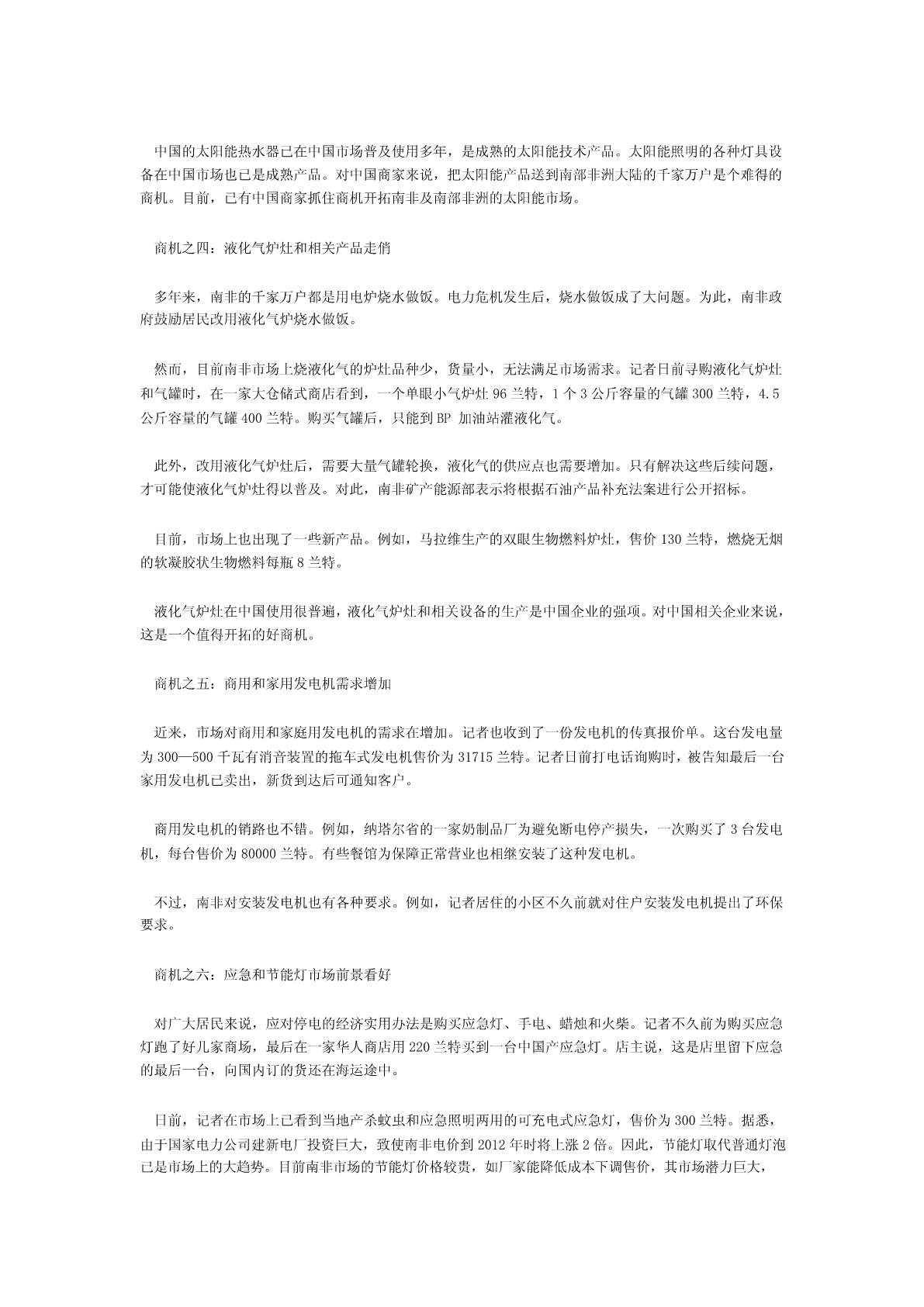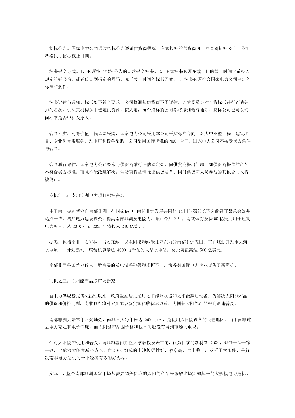 南非电力市场呈现六大商机今年以来,南非电力短缺问题越来越严重。1月份持续3周的一日多次每次数小时的停电使南非举国上下都感受到了电力供应不足带来的各种不便。南非是非洲第一电力大国,发电量占非洲的三分之二,向不少非洲国家输出电力,其电价也是全球最低的。一向电力充足有余的南非在经济持续9年快速增长之后,突然电力供应不足了,而且日趋严重。究其原因是在经济持续增长中忽略了新发电厂的同步建设。在供电自顾不暇的情况下,南非被迫停止了向纳米比亚、博茨瓦纳、津巴布韦等国的输电,导致南部非洲国家也出现了供电短缺局面。目前,南非政府、工商企业和居民已采取各种措施,应对停电给生产、经营和生活造成的问题。商机之一:南非电厂建设进入高峰期南非电力的95%由国家电力公司(Eskom)旗下的26座电厂生产。南非的电价是全球最便宜的,每千瓦小时仅3.56美分。目前,南非的电力总需求约为34000兆瓦,南非电力公司的发电能力约为29000兆瓦,缺口约为5000兆瓦。南非电力危机爆发后,政府相关职能部门、国家电力公司(Eskom)、各市政首长及工商企业代表举行联席会议商讨应对办法。南非财政部宣布在未来5年内为国家电力公司提供600亿兰特(约76亿美元)贷款,用于火力和核能发电建设。根据2月20日公布的南非财政预算,600亿兰特的电力发展预算已占了国家财政预算总支出的40%。实际上,政府的投入并不能满足电力建设的总体计划。国家电力公司的扩建计划总投资预算高达3430亿兰特,其中的四分之三用于扩大发电能力。国家电力公司的电力建设计划,包括重新启用3座发电站,新建两座发电站,建成后新增发电能力总计将超过12700兆瓦。不久前,国家电力公司已开始为核电厂项目实施国际招标,向法国阿海珐(AREVA)核电公司和美国威斯汀豪斯(WESTINGHOUSE)公司发出了招标邀请函。据悉,该核电厂的计划发电能力为3300兆瓦。如何与南非国家电力公司做生意。南非国家电力公司是国有企业,以公开、诚信为原则,遵循国际通行商业规则,从质量、价格、实用以及是否支持南非经济振兴法案四个方面择优选择合作伙伴。公司的标书详细说明了投标方应提供的各项信息。根据经济振兴方案,国家电力公司规定:1,把部分合同预留给本地供货商。2,把部分传统供货商合同中的部分合同,预留给能够提供同样价格产品的本地供货商。3,把部分转包合同预留给本地供货商。供货商如何提交注册申请表。国家电力公司下属的各分公司拥有独立的计算机系统和采购部门。供货商须向计划招标的分公司提交注册申请表。国家电力公司将从安全、健康和环保等方面审核供货商的资质是否符合南非的法定标准。招标公告。国家电力公司通过招标公告邀请供货商投标。有意投标的供货商可上网查阅招标公告。公司严格执行招标截止日期。标书提交方式。1,必须按照招标公告的要求提交标书。2,正式标书必须在截止日的截止时间之前投入规定的标书箱,或者传真到指定的号码。晚于截止时间的标书无效。3,标书必须符合国家电力公司制定的标准和条件。标书评估与通知。标书如不符合要求,公司将通知供货商不予评估。评估委员会对合格标书进行评估并排列名次,供决策机构从中选定供货商。按规定,每个投标的公司都将接到最终通知。投标公司也可以询问标书是否中标及原因。合同种类。对低价值、低风险采购,国家电力公司采用本公司采购标准合同。对大中小型工程、建筑项目、专业和常规服务、发电厂和设备采购,公司采用国际标准的NEC合同。国家电力公司不接受卖方条件与合同。合同履行评估。国家电力公司经常与供货商举行评估鉴定会,向供货商提出问题。如供货商提供的产品不符合买方标准,而且不能改进解决,供货商将被清除出供货名单。同时供货商人员参与的其他合同也将被终止。商机之二:南部非洲电力项目招标在即由于南非被迫暂停向南部非洲一些国家供电,南部非洲发展共同体14国能源部长不久前召开紧急会议并达成一致,增加电力建设投资,提高南部非洲发电能力。预计今后2年,南共体将投资50亿美元用于短期电力项目,从2010年到2025年将投入240亿美元。据悉,包括南非、安哥拉、博茨瓦纳、民主刚果和纳米比亚在内的南部非洲五国,正在规划开发刚果河水电项目,计划建设一座装机容量达4000万千瓦的大型水电站,总投资额高达500亿美元。南部非洲各国差异较大,所需要的发电设备种类和规模不同,为各类国际电力企业提供了新商机。商机之三:太阳能产品成市场新宠自电力供应紧张情况出现以来,政府鼓励居民采用太阳能热水器和太阳能照明设备。为解决太阳能产品的供货和价格问题,南非政府将对太阳能设备实施税收优惠政策,力图使太阳能产品得到迅速普及。南部非洲大陆常年阳光灿烂,南非日照每年长达2500小时,是使用太阳能设备的最佳地区。由于南非过去电力充足和电价低廉,而太阳能产品因价格和技术问题没有得到市场的重视。