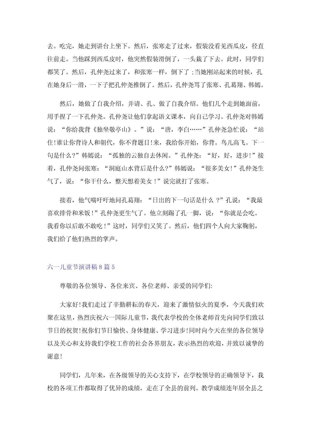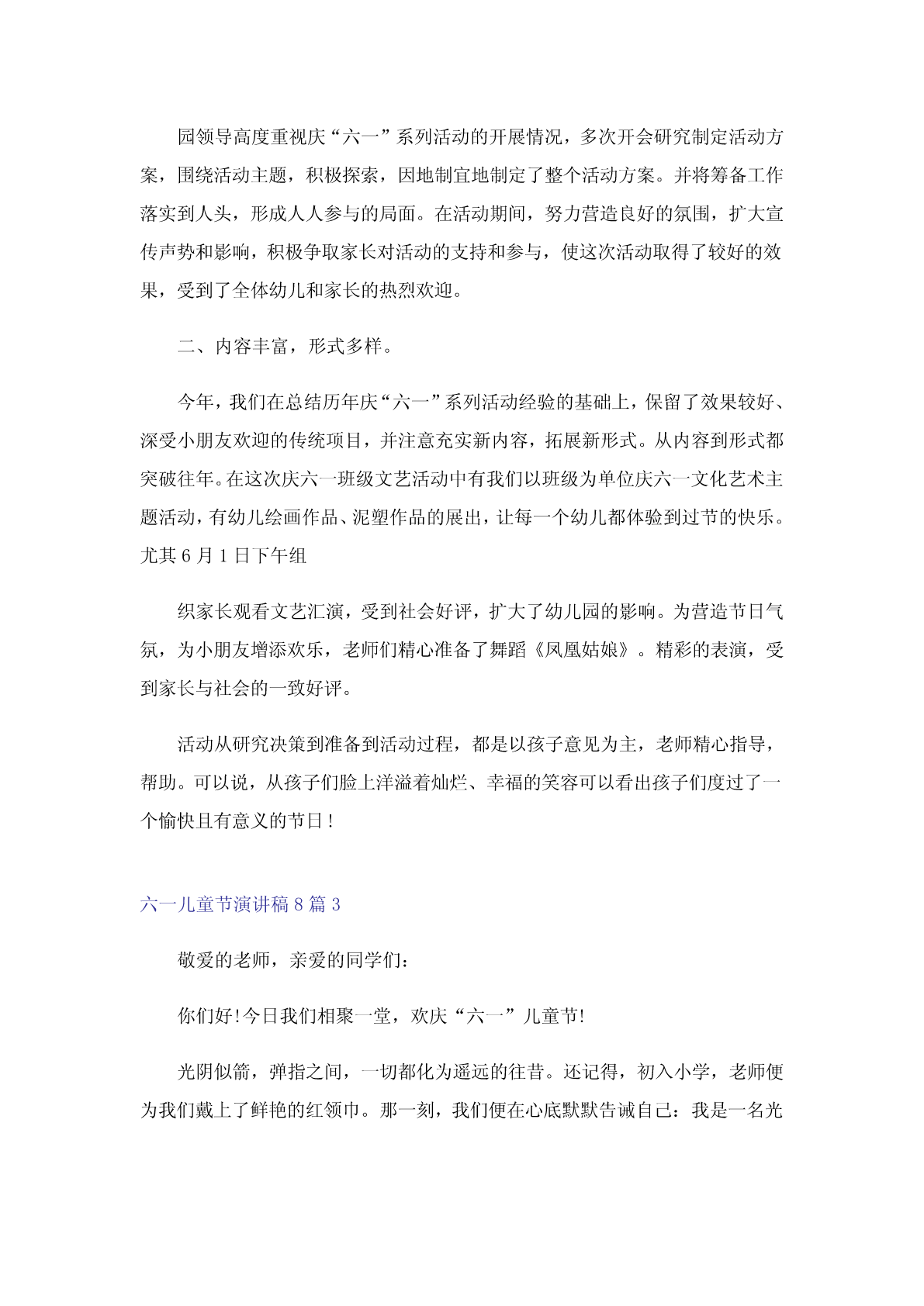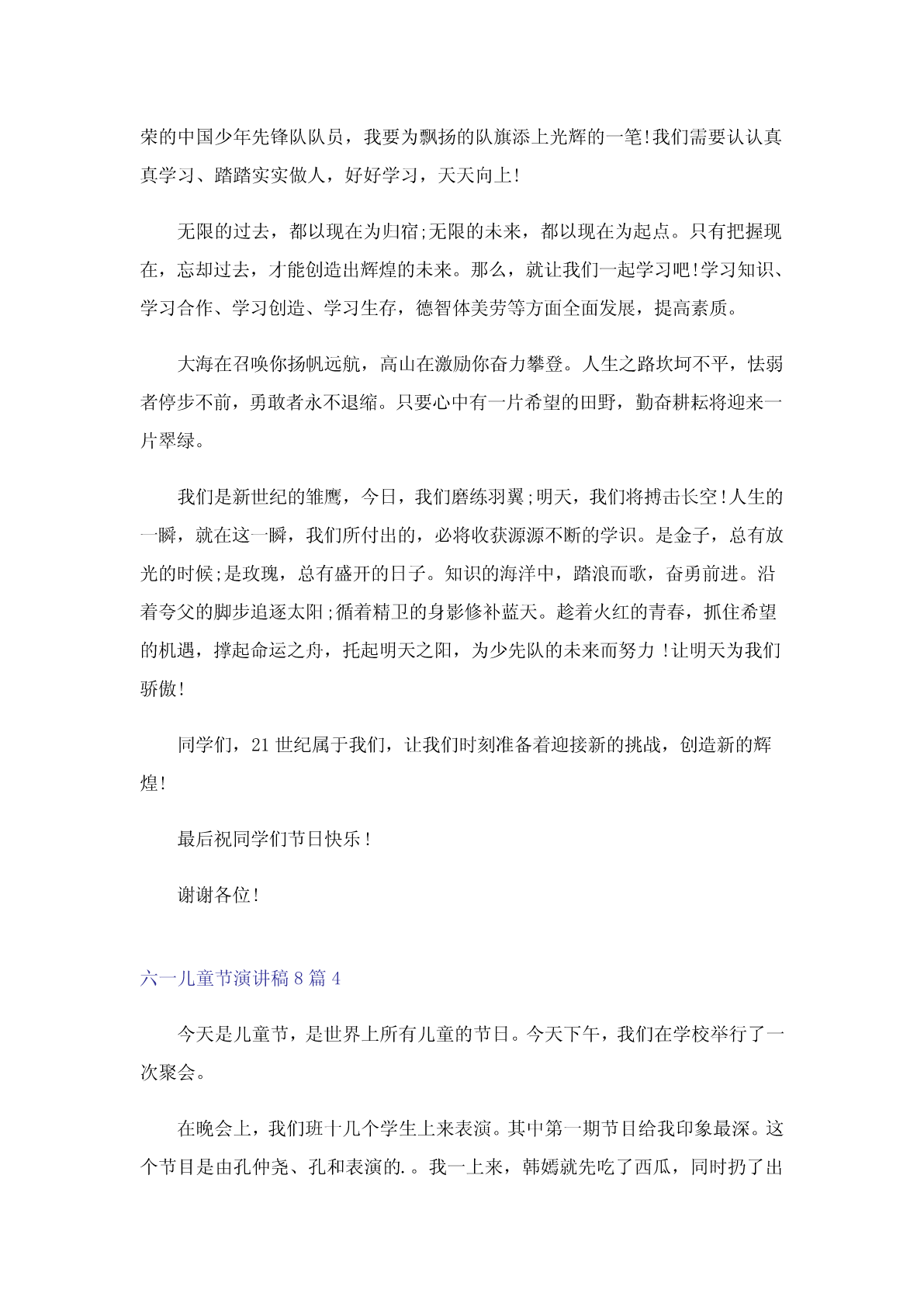 六一儿童节演讲稿8篇六一儿童节演讲稿8篇1六月一日这一天,阳光格外艳,天空格外蓝,花儿格外香,笑声格外甜,歌声洒满整个校园。因为六月一日是我们共同的节日——“六一”国际儿童节!看啊,同学们的文艺演出多精彩;听呀,故事会上的故事讲得多动人;乐吧,游戏节里的节目多得数不清……我们的节日真快乐!你知道吗?在新中国成立前,我国也有儿童节,是每年的四月四号。可那时的儿童节不是劳动人民孩子的节日。漫画家张乐平爷爷在儿童节那天,看到穷人家的孩子流着泪,忍着痛,光着膀子在街头卖艺赚钱。他难过极了,含着泪在漫画《三毛流浪记》中画上了这一幕,以此控诉黑暗的旧社会。今天的我们多么幸福呀!我们在父母的怀抱里一天天长大,享受着亲人们无微不至的关怀;我们在老师慈祥的目光里一天天成长,感受着老师们亲切的谆谆教诲。在爱的海洋里,我们在思索,我们在立志,绝不辜负祖国母亲的培育,要无愧于我们伟大的时代,好好学习,天天向上,做建设祖国的栋梁。伴着花的芳香,踏着歌的节拍,我们庆祝六一儿童节,我们欢度自己的节日。六一儿童节演讲稿8篇2我们幼儿园本着尊重孩子、关爱孩子的理念,真正把“六一”节还给孩子,过一个美好的童年为出发点,组织全体孩子开展了一系列六一庆祝活动。活动形式多样,内容健康,既丰富了孩子们的节日生活,又起到了教育作用,受到了广大家长的一致称赞。现将我园系列活动开展情况总结汇报如下:一、领导重视,精心组织。园领导高度重视庆“六一”系列活动的开展情况,多次开会研究制定活动方案,围绕活动主题,积极探索,因地制宜地制定了整个活动方案。并将筹备工作落实到人头,形成人人参与的局面。在活动期间,努力营造良好的氛围,扩大宣传声势和影响,积极争取家长对活动的支持和参与,使这次活动取得了较好的效果,受到了全体幼儿和家长的热烈欢迎。二、内容丰富,形式多样。今年,我们在总结历年庆“六一”系列活动经验的基础上,保留了效果较好、深受小朋友欢迎的传统项目,并注意充实新内容,拓展新形式。从内容到形式都突破往年。在这次庆六一班级文艺活动中有我们以班级为单位庆六一文化艺术主题活动,有幼儿绘画作品、泥塑作品的展出,让每一个幼儿都体验到过节的快乐。尤其6月1日下午组织家长观看文艺汇演,受到社会好评,扩大了幼儿园的影响。为营造节日气氛,为小朋友增添欢乐,老师们精心准备了舞蹈《凤凰姑娘》。精彩的表演,受到家长与社会的一致好评。活动从研究决策到准备到活动过程,都是以孩子意见为主,老师精心指导,帮助。可以说,从孩子们脸上洋溢着灿烂、幸福的笑容可以看出孩子们度过了一个愉快且有意义的节日!六一儿童节演讲稿8篇3敬爱的老师,亲爱的同学们:你们好!今日我们相聚一堂,欢庆“六一”儿童节!光阴似箭,弹指之间,一切都化为遥远的往昔。还记得,初入小学,老师便为我们戴上了鲜艳的红领巾。那一刻,我们便在心底默默告诫自己:我是一名光荣的中国少年先锋队队员,我要为飘扬的队旗添上光辉的一笔!我们需要认认真真学习、踏踏实实做人,好好学习,天天向上!无限的过去,都以现在为归宿;无限的未来,都以现在为起点。只有把握现在,忘却过去,才能创造出辉煌的未来。那么,就让我们一起学习吧!学习知识、学习合作、学习创造、学习生存,德智体美劳等方面全面发展,提高素质。大海在召唤你扬帆远航,高山在激励你奋力攀登。人生之路坎坷不平,怯弱者停步不前,勇敢者永不退缩。只要心中有一片希望的田野,勤奋耕耘将迎来一片翠绿。我们是新世纪的雏鹰,今日,我们磨练羽翼;明天,我们将搏击长空!人生的一瞬,就在这一瞬,我们所付出的,必将收获源源不断的学识。是金子,总有放光的时候;是玫瑰,总有盛开的日子。知识的海洋中,踏浪而歌,奋勇前进。沿着夸父的脚步追逐太阳;循着精卫的身影修补蓝天。趁着火红的青春,抓住希望的机遇,撑起命运之舟,托起明天之阳,为少先队的未来而努力!让明天为我们骄傲!同学们,21世纪属于我们,让我们时刻准备着迎接新的挑战,创造新的辉煌!最后祝同学们节日快乐!谢谢各位!六一儿童节演讲稿8篇4今天是儿童节,是世界上所有儿童的节日。今天下午,我们在学校举行了一次聚会。在晚会上,我们班十几个学生上来表演。其中第一期节目给我印象最深。这个节目是由孔仲尧、孔和表演的.。我一上来,韩嫣就先吃了西瓜,同时扔了出去。吃完,她走到讲台上坐下。然后,张寒走了过来,假装没看见西瓜皮,径直往前走。当他踩到西瓜皮时,他突然假装滑倒了,一头栽了下去。此时,同学们都笑了。然后,孔仲尧过来了,和张寒一样,倒下了;当她刚站起来的时候,孔在她身后一滑,一下子把孔仲尧推倒了。然后,孔仲尧骂了张寒、孔葛翔、韩嫣。然后,她做了自我介绍,并请、孔、做了自我介绍。他们几个走到她面前,用手捏了一下孔仲尧。孔仲尧让他们拿起语文课本,向自己学习。孔仲尧对韩嫣说:“你给我背《独坐敬亭山》。”说:“唐,李白……”孔仲尧急