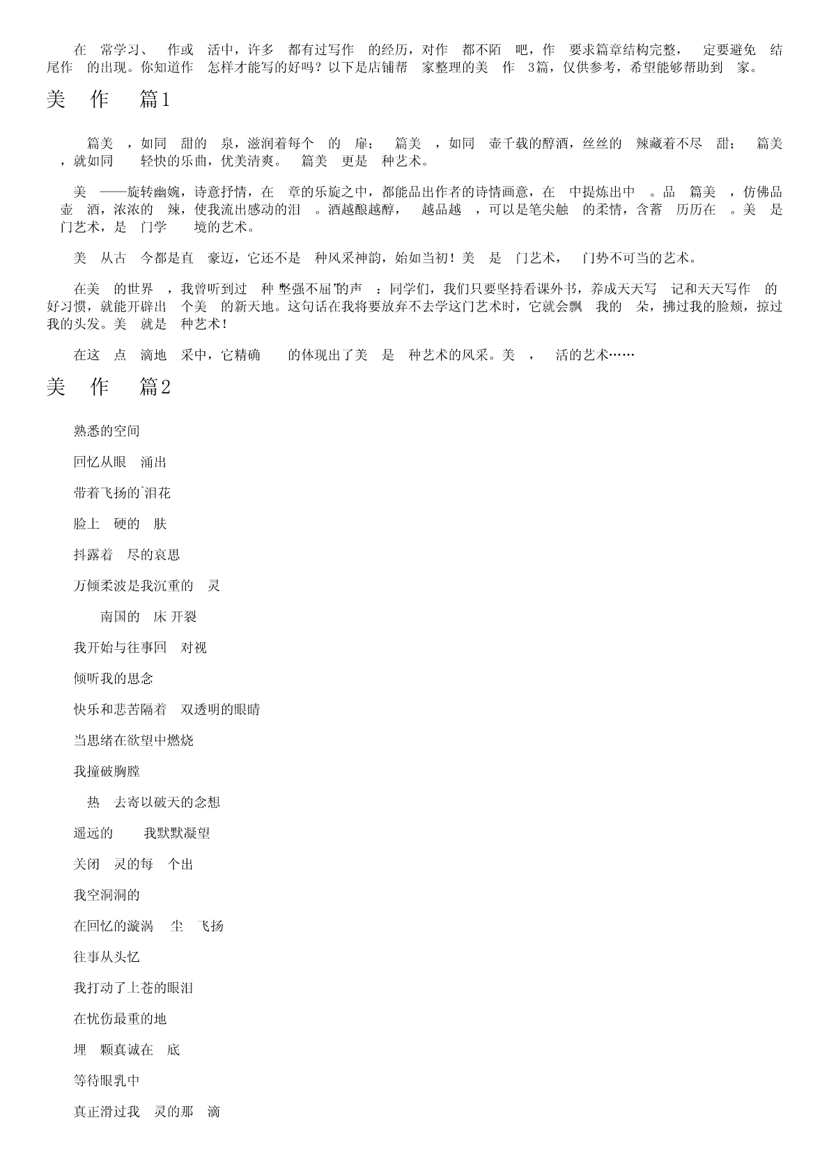 在⽇常学习、⼯作或⽣活中,许多⼈都有过写作⽂的经历,对作⽂都不陌⽣吧,作⽂要求篇章结构完整,⼀定要避免⽆结尾作⽂的出现。你知道作⽂怎样才能写的好吗?以下是店铺帮⼤家整理的美⽂作⽂3篇,仅供参考,希望能够帮助到⼤家。美⽂作⽂篇1⼀篇美⽂,如同⽢甜的⼭泉,滋润着每个⼈的⼼扉;⼀篇美⽂,如同⼀壶千载的醇酒,丝丝的⾟辣藏着不尽⽢甜;⼀篇美⽂,就如同⼀⾸轻快的乐曲,优美清爽。⼀篇美⽂更是⼀种艺术。美⽂——旋转幽婉,诗意抒情,在⽂章的乐旋之中,都能品出作者的诗情画意,在⽂中提炼出中⼼。品⼀篇美⽂,仿佛品⼀壶⽼酒,浓浓的⾟辣,使我流出感动的泪⽔。酒越酿越醇,⽂越品越⾹,可以是笔尖触⽔的柔情,含蓄⼜历历在⽬。美⽂是⼀门艺术,是⼀门学⽆⽌境的艺术。美⽂从古⾄今都是直⽩豪迈,它还不是⼀种风采神韵,始如当初!美⽂是⼀门艺术,⼀门势不可当的艺术。在美⽂的世界⾥,我曾听到过⼀种“坚强不屈”的声⾳:同学们,我们只要坚持看课外书,养成天天写⽇记和天天写作⽂的好习惯,就能开辟出⼀个美⽂的新天地。这句话在我将要放弃不去学这门艺术时,它就会飘⼊我的⽿朵,拂过我的脸颊,掠过我的头发。美⽂就是⼀种艺术!在这⼀点⼀滴地⽂采中,它精确⽆⽐的体现出了美⽂是⼀种艺术的风采。美⽂,⽣活的艺术……美⽂作⽂篇2熟悉的空间回忆从眼⾓涌出带着飞扬的`泪花脸上⽣硬的⽪肤抖露着⽆尽的哀思万倾柔波是我沉重的⼼灵⼀⽅南国的⽔床开裂我开始与往事回⽬对视倾听我的思念快乐和悲苦隔着⼀双透明的眼睛当思绪在欲望中燃烧我撞破胸膛⽤热⾎去寄以破天的念想遥远的⼀⾓我默默凝望关闭⼼灵的每⼀个出⼝我空洞洞的⼼在回忆的漩涡⾥尘⼟飞扬往事从头忆我打动了上苍的眼泪在忧伤最重的地⽅埋⼀颗真诚在⼼底等待眼乳中真正滑过我⼼灵的那⼀滴美⽂作⽂篇37号的下午,我们寻真⽂学社的全体社员们集合在⽼师的家⾥举办拉⼀个美⽂诵读的⼤赛!我们上台诵读的顺序是⽤抽签来决定的。⾸先,⽼师拿出了⼏张⽩纸条,在上⾯各写了⼀个数字,分别是1?7这⼏个数字,然后把纸条洒落在地上,我们都⼀⽤⽽上,希望拿到⼀个好的演讲顺序。⼤家都迫不及待的打开拉纸条,我是第五个诵读的社员。接着,⽼师每⼈各发拉⼀⽀笔和⼀张纸,那是⽤来打分的。我们根据⽂章的内容、声⾳的⾼低、上台的仪表、诵读的正确率、流利,和有感情来评分,最后算出平均分,确定⼤赛的胜利者。⽐赛开始了,第⼀个上台的是我们的副社长-----雷⾬萌。过拉不⼀会⼉,就轮到我上台了,我诵读是⼀篇贝壳的⽂章,那篇⽂章很美,所以我很喜欢。最后,我们把总分交给了⽼师,⽼师把我们的分数加起来,算出了分数,结果我的了⼀个第⼆名,和另⼀个社员并列,还有⼀个第⼀和⼀个第⼆。虽然,今天我没有夺得第⼀名,可是我为我⾃⼰的勇⽓感到⾃豪,同时也很开⼼,有⼀个愉快的假⽇活动。【精选美⽂作⽂3篇】