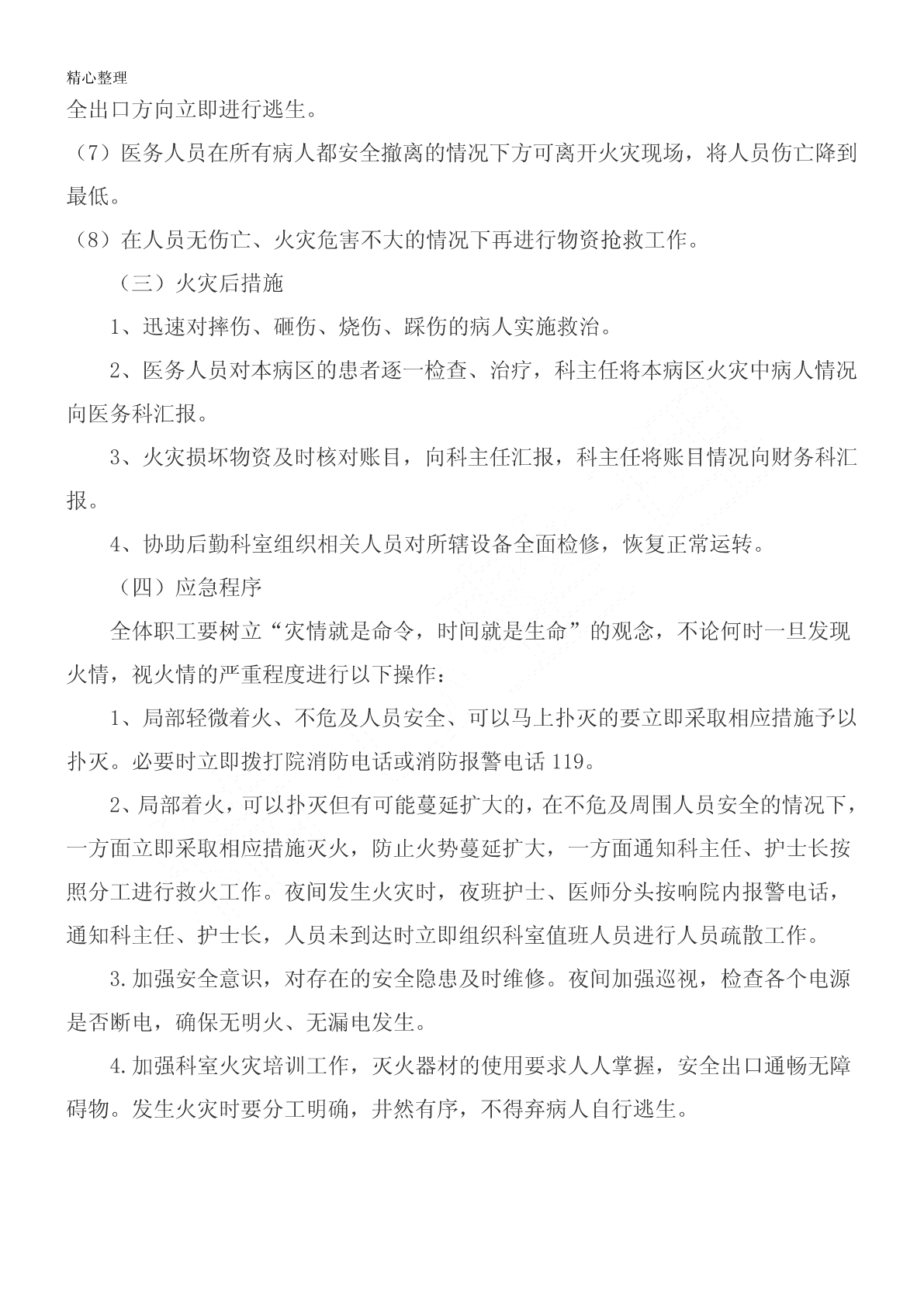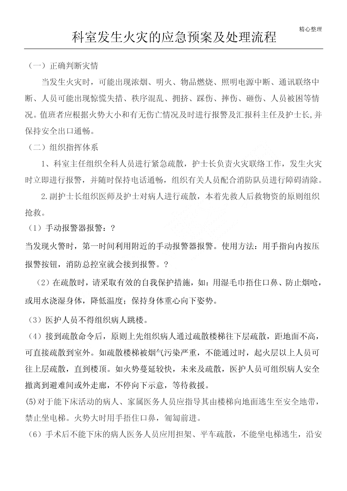 精心整理科室发生火灾的应急预案及处理流程(一)正确判断灾情当发生火灾时,可能出现浓烟、明火、物品燃烧、照明电源中断、通讯联络中断、人员可能出现惊慌失措、秩序混乱、拥挤、踩伤、摔伤、砸伤、人员被困等情况。值班者应根据火势大小和有无伤亡情况及时进行报警及汇报科主任及护士长,并保持安全出口通畅。(二)组织指挥体系1、科室主任组织全科人员进行紧急疏散,护士长负责火灾联络工作,发生火灾时立即进行报警,并随时保持电话通畅,组织有关人员配合消防队员进行障碍清除。2.副护士长组织医师及护士对病人进行疏散,本着先救人后救物资的原则组织抢救。(1)手动报警器报警:?当发现火警时,第一时间利用附近的手动报警器报警。使用方法:用手指向内按压报警按钮,消防总控室就会接到报警。?(2)在疏散时,请采取有效的自我保护措施,如:用湿毛巾捂住口鼻、防止烟呛,或用水浇湿身体,降低温度;保持身体重心向下姿势。(3)医护人员不得组织病人跳楼。(4)接到疏散命令后,原则上先组织病人通过疏散楼梯往下层疏散,距地面不高,可直接疏散到室外。如疏散楼梯被烟气污染严重,不能通过时,起火层以上人员可往上层疏散,直到楼顶。如火势蔓延较快,未来及疏散,医护人员可组织病人安全撤离到避难间或外走廊,不停向下示意,等待救援。(5)对于能下床活动的病人、家属医务人员应指导其由楼梯向地面逃生至安全地带,禁止坐电梯。火势大时用手捂住口鼻,匍匐前进。(6)手术后不能下床的病人医务人员应用担架、平车疏散,不能坐电梯逃生,沿安精心整理全出口方向立即进行逃生。(7)医务人员在所有病人都安全撤离的情况下方可离开火灾现场,将人员伤亡降到最低。(8)在人员无伤亡、火灾危害不大的情况下再进行物资抢救工作。(三)火灾后措施1、迅速对摔伤、砸伤、烧伤、踩伤的病人实施救治。2、医务人员对本病区的患者逐一检查、治疗,科主任将本病区火灾中病人情况向医务科汇报。3、火灾损坏物资及时核对账目,向科主任汇报,科主任将账目情况向财务科汇报。4、协助后勤科室组织相关人员对所辖设备全面检修,恢复正常运转。(四)应急程序全体职工要树立“灾情就是命令,时间就是生命”的观念,不论何时一旦发现火情,视火情的严重程度进行以下操作:1、局部轻微着火、不危及人员安全、可以马上扑灭的要立即采取相应措施予以扑灭。必要时立即拨打院消防电话或消防报警电话119。2、局部着火,可以扑灭但有可能蔓延扩大的,在不危及周围人员安全的情况下,一方面立即采取相应措施灭火,防止火势蔓延扩大,一方面通知科主任、护士长按照分工进行救火工作。夜间发生火灾时,夜班护士、医师分头按响院内报警电话,通知科主任、护士长,人员未到达时立即组织科室值班人员进行人员疏散工作。3.加强安全意识,对存在的安全隐患及时维修。夜间加强巡视,检查各个电源是否断电,确保无明火、无漏电发生。4.加强科室火灾培训工作,灭火器材的使用要求人人掌握,安全出口通畅无障碍物。发生火灾时要分工明确,井然有序,不得弃病人自行逃生。