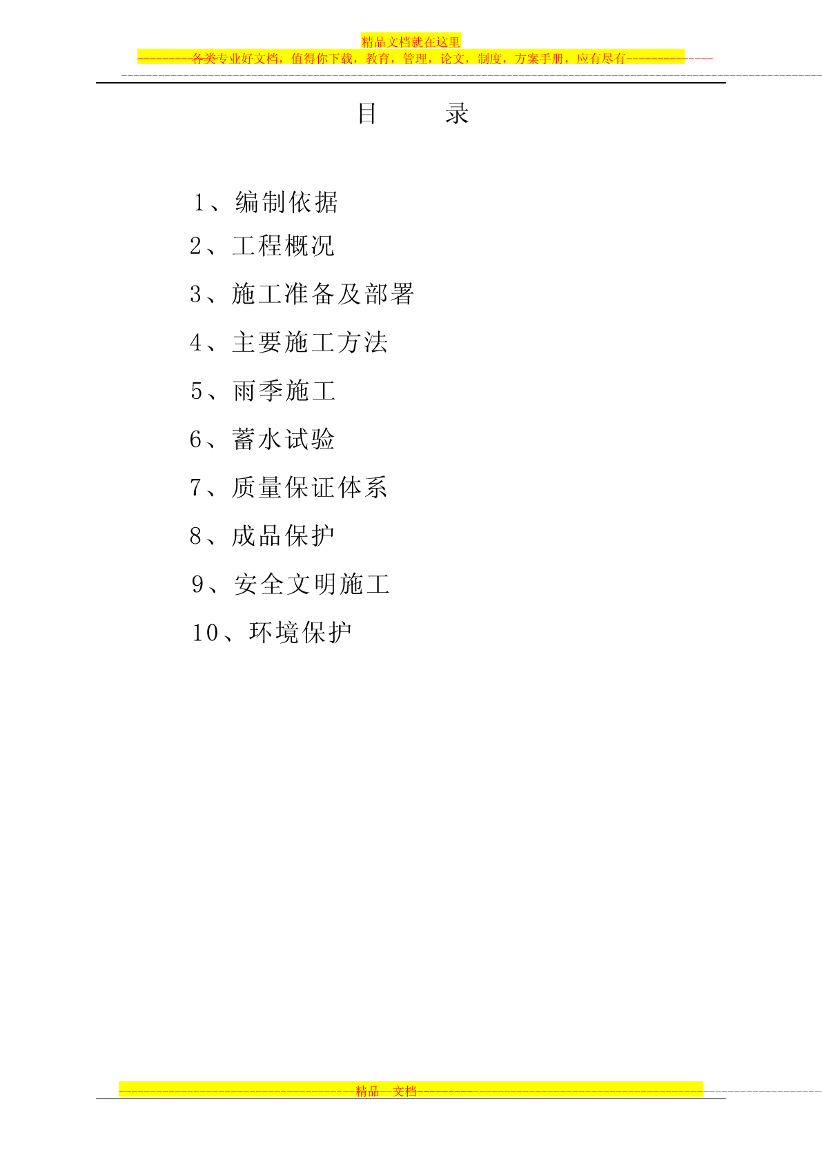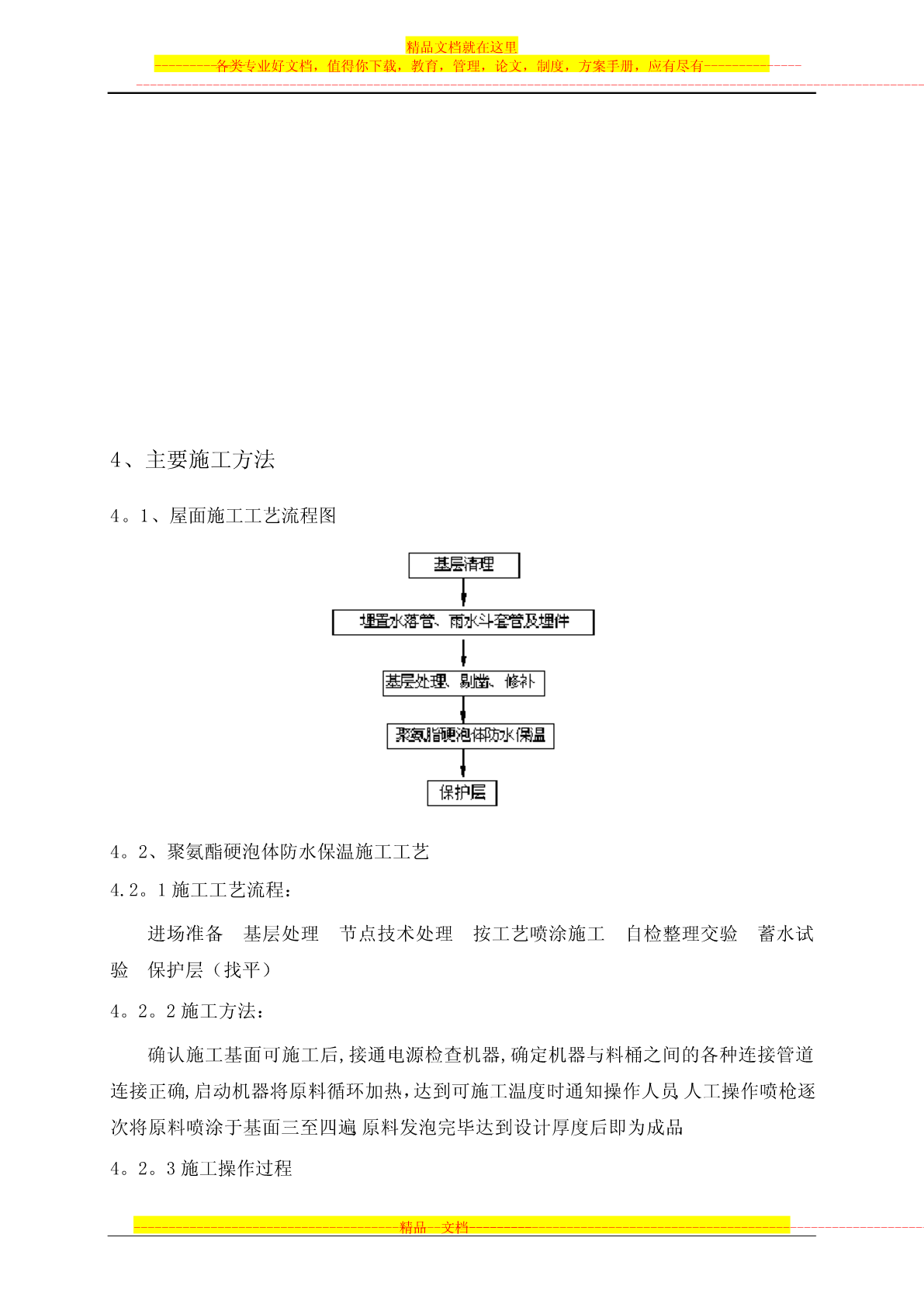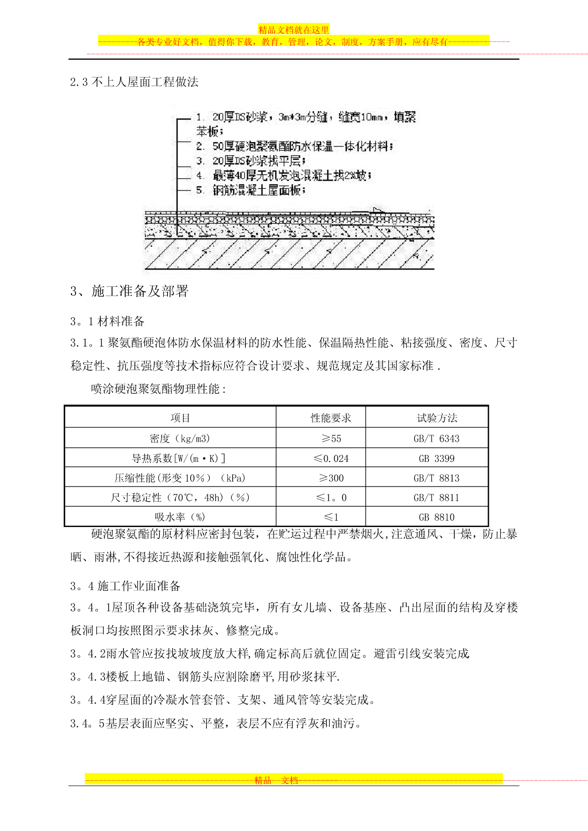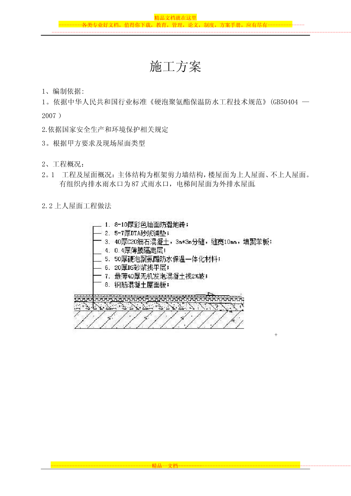 屋面防水工程施工方案2012年07月精品文档就在这里-------------各类专业好文档,值得你下载,教育,管理,论文,制度,方案手册,应有尽有----------------------------------------------------------------------------------------------------------------------------------------------------------目录1、编制依据2、工程概况3、施工准备及部署4、主要施工方法5、雨季施工6、蓄水试验7、质量保证体系8、成品保护9、安全文明施工10、环境保护---------------------------------------------------------精品文档---------------------------------------------------------------------精品文档就在这里-------------各类专业好文档,值得你下载,教育,管理,论文,制度,方案手册,应有尽有----------------------------------------------------------------------------------------------------------------------------------------------------------施工方案1、编制依据:1。依据中华人民共和国行业标准《硬泡聚氨酯保温防水工程技术规范》(GB50404—2007)2.依据国家安全生产和环境保护相关规定3。根据甲方要求及现场屋面类型2、工程概况:2。1工程及屋面概况:主体结构为框架剪力墙结构,楼屋面为上人屋面、不上人屋面。有组织内排水雨水口为87式雨水口,电梯间屋面为外排水屋面.2.2上人屋面工程做法+---------------------------------------------------------精品文档---------------------------------------------------------------------精品文档就在这里-------------各类专业好文档,值得你下载,教育,管理,论文,制度,方案手册,应有尽有----------------------------------------------------------------------------------------------------------------------------------------------------------2.3不上人屋面工程做法3、施工准备及部署3。1材料准备3.1。1聚氨酯硬泡体防水保温材料的防水性能、保温隔热性能、粘接强度、密度、尺寸稳定性、抗压强度等技术指标应符合设计要求、规范规定及其国家标准.喷涂硬泡聚氨酯物理性能:项目性能要求试验方法密度(kg/m3)≥55GB/T6343导热系数[W/(m·K)]≤0.024GB3399压缩性能(形变10%)(kPa)≥300GB/T8813尺寸稳定性(70℃,48h)(%)≤1。0GB/T8811吸水率(%)≤1GB8810硬泡聚氨酯的原材料应密封包装,在贮运过程中严禁烟火,注意通风、干燥,防止暴晒、雨淋,不得接近热源和接触强氧化、腐蚀性化学品。3。4施工作业面准备3。4。1屋顶各种设备基础浇筑完毕,所有女儿墙、设备基座、凸出屋面的结构及穿楼板洞口均按照图示要求抹灰、修整完成。3。4.2雨水管应按找坡坡度放大样,确定标高后就位固定。避雷引线安装完成.3。4.3楼板上地锚、钢筋头应割除磨平,用砂浆抹平.3。4.4穿屋面的冷凝水管套管、支架、通风管等安装完成。3.4。5基层表面应坚实、平整,表层不应有浮灰和油污。---------------------------------------------------------精品文档---------------------------------------------------------------------精品文档就在这里-------------各类专业好文档,值得你下载,教育,管理,论文,制度,方案手册,应有尽有----------------------------------------------------------------------------------------------------------------------------------------------------------4、主要施工方法4。1、屋面施工工