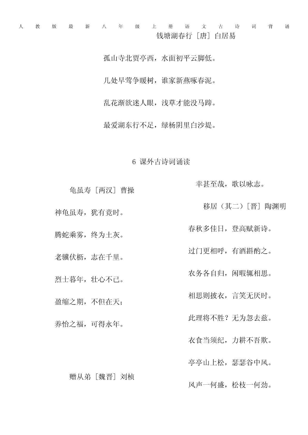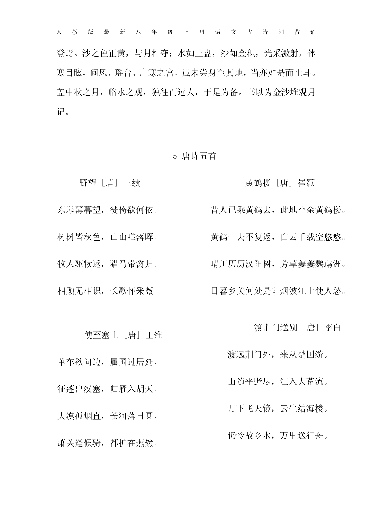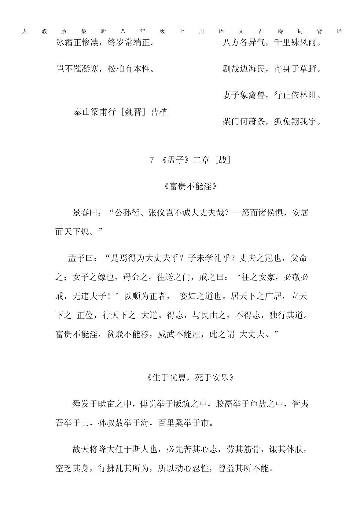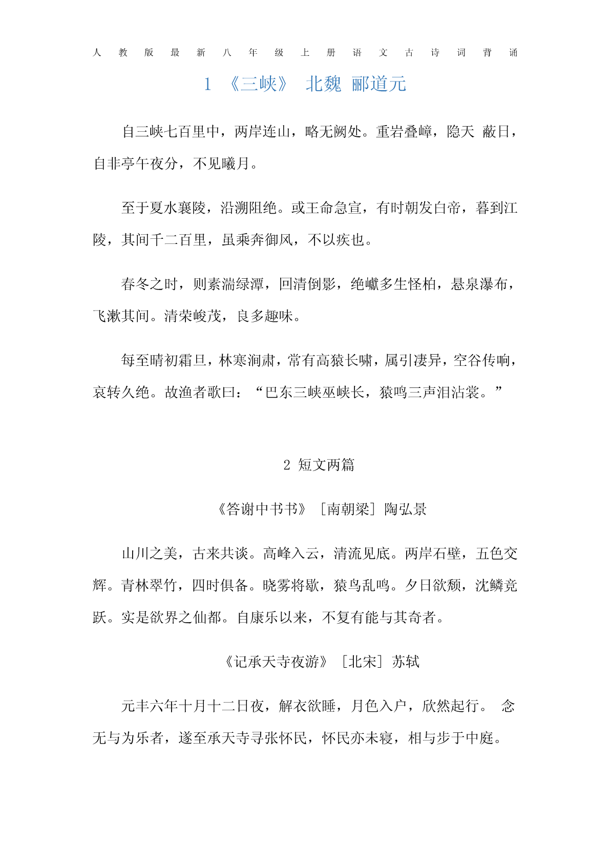 人教版最新八年级上册语文古诗词背诵1《三峡》北魏郦道元自三峡七百里中,两岸连山,略无阙处。重岩叠嶂,隐天蔽日,自非亭午夜分,不见曦月。至于夏水襄陵,沿溯阻绝。或王命急宣,有时朝发白帝,暮到江陵,其间千二百里,虽乘奔御风,不以疾也。春冬之时,则素湍绿潭,回清倒影,绝巘多生怪柏,悬泉瀑布,飞漱其间。清荣峻茂,良多趣味。每至晴初霜旦,林寒涧肃,常有高猿长啸,属引凄异,空谷传响,哀转久绝。故渔者歌曰:“巴东三峡巫峡长,猿鸣三声泪沾裳。”2短文两篇《答谢中书书》[南朝梁]陶弘景山川之美,古来共谈。高峰入云,清流见底。两岸石壁,五色交辉。青林翠竹,四时俱备。晓雾将歇,猿鸟乱鸣。夕日欲颓,沈鳞竞跃。实是欲界之仙都。自康乐以来,不复有能与其奇者。《记承天寺夜游》[北宋]苏轼元丰六年十月十二日夜,解衣欲睡,月色入户,欣然起行。念无与为乐者,遂至承天寺寻张怀民,怀民亦未寝,相与步于中庭。人教版最新八年级上册语文古诗词背诵庭下如积水空明,水中藻、荇交横,盖竹柏影也。何夜无月?何处无竹柏?但少闲人如吾两人耳。3《与朱元思书》[南朝梁]吴均风烟俱净,天山共色。从流飘荡,任意东西。自富阳至桐庐,一百许里,奇山异水,天下独绝。水皆缥(piǎo)碧,千丈见底。游鱼细石,直视无碍。急湍甚箭,猛浪若奔。夹岸高山,皆生寒树。负势竞上,互相轩邈(miǎo),争高直指,千百成峰。泉水激石,泠泠(líng)作响;好鸟相鸣,嘤嘤成韵。蝉则千转不穷,猿则百叫无绝。鸢飞戾(lì)天者,望峰息心;经纶世务者,窥谷忘反。横柯上蔽,在昼犹昏;疏条交映,有时见日。4《观月记》[南宋]张孝祥月极明于中秋,观中秋之月,临水胜;临水之观,宜]独往;独往之地,去人远者又胜也。然中秋多无月,城郭宫室,安得皆临水?盖有之矣,若夫远去人迹,则必空旷幽绝之地。诚有好奇之士,亦安能独行以夜而之空旷幽绝,蕲顷刻之玩也哉?今余之游金沙堆,其具是四美者与?盖余以八月之望过洞庭,天无纤云,月白如昼。沙当洞庭青草之中,其高十仞,四环之水,近者犹数百里。余系船其下,尽却童隶而人教版最新八年级上册语文古诗词背诵登焉。沙之色正黄,与月相夺;水如玉盘,沙如金积,光采激射,体寒目眩,阆风、瑶台、广寒之宫,虽未尝身至其地,当亦如是而止耳。盖中秋之月,临水之观,独往而远人,于是为备。书以为金沙堆观月记。5唐诗五首野望[唐]王绩黄鹤楼[唐]崔颢东皋薄暮望,徙倚欲何依。昔人已乘黄鹤去,此地空余黄鹤楼。树树皆秋色,山山唯落晖。黄鹤一去不复返,白云千载空悠悠。牧人驱犊返,猎马带禽归。晴川历历汉阳树,芳草萋萋鹦鹉洲。相顾无相识,长歌怀采薇。日暮乡关何处是?烟波江上使人愁。渡荆门送别[唐]李白使至塞上[唐]王维渡远荆门外,来从楚国游。单车欲问边,属国过居延。山随平野尽,江入大荒流。征蓬出汉塞,归雁入胡天。月下飞天镜,云生结海楼。大漠孤烟直,长河落日圆。仍怜故乡水,万里送行舟。萧关逢候骑,都护在燕然。人教版最新八年级上册语文古诗词背诵钱塘湖春行[唐]白居易孤山寺北贾亭西,水面初平云脚低。几处早莺争暖树,谁家新燕啄春泥。乱花渐欲迷人眼,浅草才能没马蹄。最爱湖东行不足,绿杨阴里白沙堤。6课外古诗词诵读幸甚至哉,歌以咏志。龟虽寿[两汉]曹操移居(其二)[晋]陶渊明神龟虽寿,犹有竟时。春秋多佳日,登高赋新诗。腾蛇乘雾,终为土灰。过门更相呼,有酒斟酌之。老骥伏枥,志在千里。农务各自归,闲暇辄相思。烈士暮年,壮心不已。相思则披衣,言笑无厌时。盈缩之期,不但在天;此理将不胜?无为忽去兹。养怡之福,可得永年。衣食当须纪,力耕不吾欺。亭亭山上松,瑟瑟谷中风。赠从弟[魏晋]刘桢风声一何盛,松枝一何劲。人教版最新八年级上册语文古诗词背诵冰霜正惨凄,终岁常端正。八方各异气,千里殊风雨。岂不罹凝寒,松柏有本性。剧哉边海民,寄身于草野。妻子象禽兽,行止依林阻。泰山梁甫行[魏晋]曹植柴门何萧条,狐兔翔我宇。7《孟子》二章[战]《富贵不能淫》景春曰:“公孙衍、张仪岂不诚大丈夫哉?一怒而诸侯惧,安居而天下熄。”孟子曰:“是焉得为大丈夫乎?子未学礼乎?丈夫之冠也,父命之;女子之嫁也,母命之,往送之门,戒之曰:‘往之女家,必敬必戒,无违夫子!’以顺为正者,妾妇之道也。居天下之广居,立天下之正位,行天下之大道。得志,与民由之,不得志,独行其道。富贵不能淫,贫贱不能移,威武不能屈,此之谓大丈夫。”《生于忧患,死于安乐》舜发于畎亩之中,傅说举于版筑之中,胶鬲举于鱼盐之中,管夷吾举于士,孙叔敖举于海,百里奚举于市。故天将降大任于斯人也,必先苦其心志,劳其筋骨,饿其体肤,空乏其身,行拂乱其所为,所以动心忍性,曾益其所不能。人教版最新八年级上册语文古诗词背诵人恒过,然后能改;困于心,衡于虑,而后作;征于色,发于声,而后喻。入则无法家拂士,出则无敌国外患者,国恒亡。然后知生于忧患,而死于安