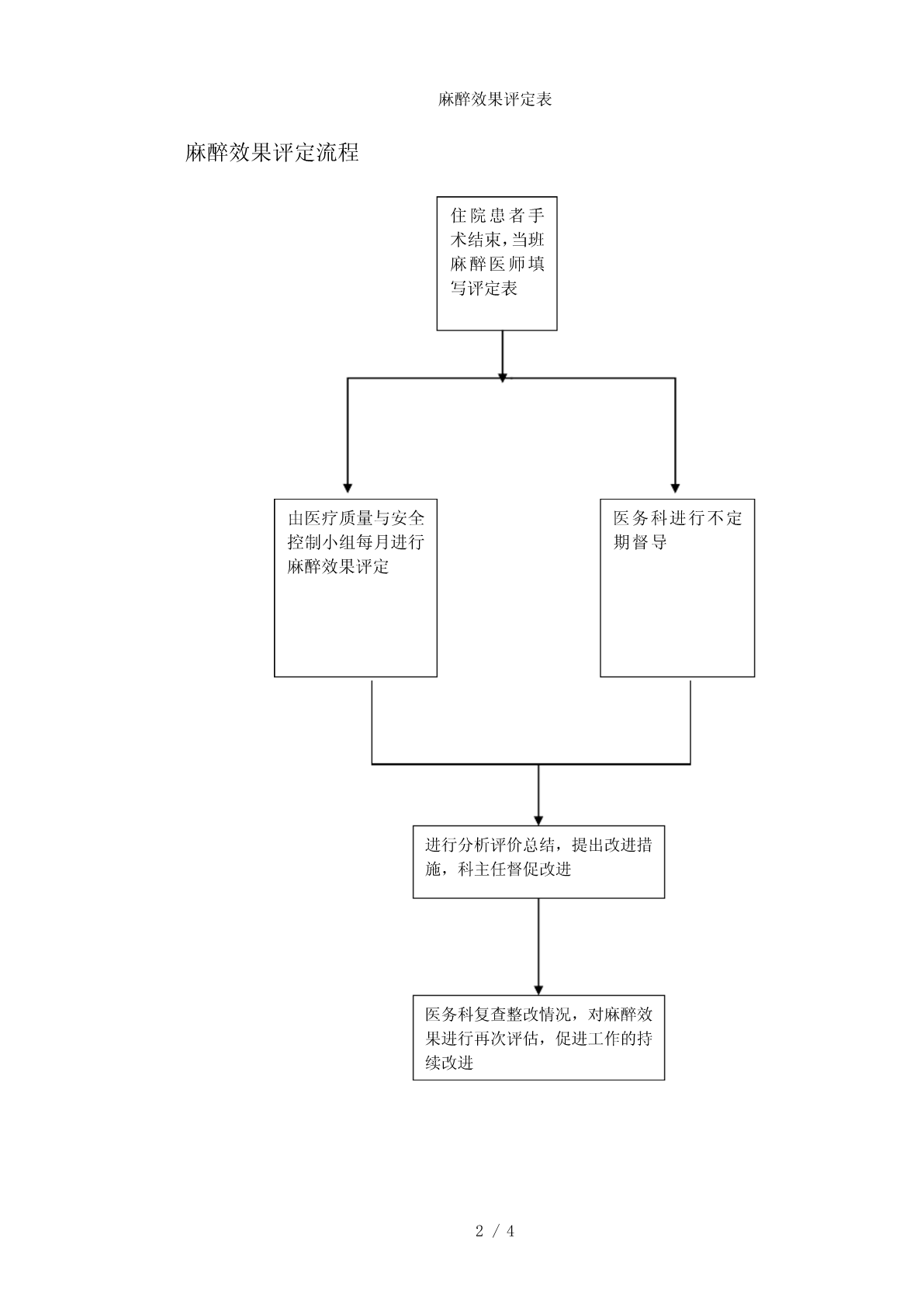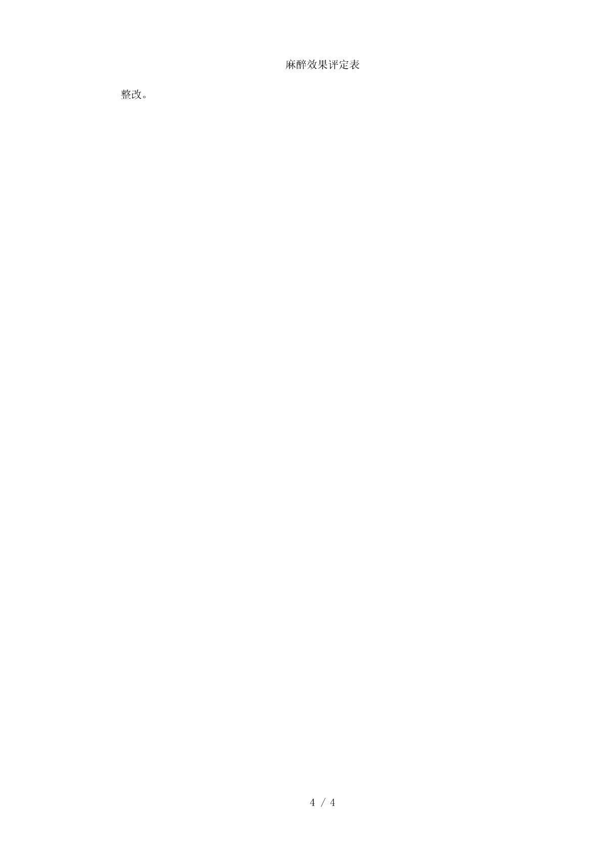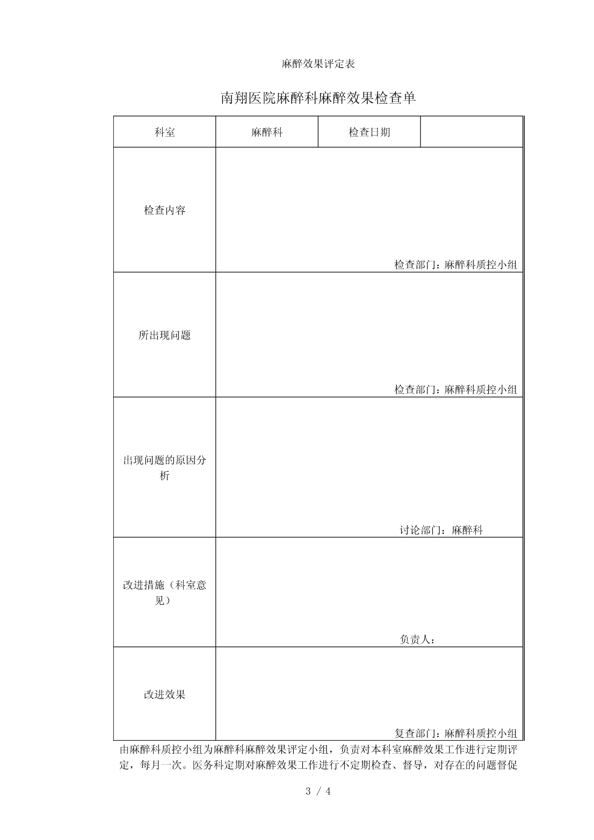 麻醉效果评定表南翔医院麻醉效果评定表(麻醉科科内存档)日期:患者姓名:年龄:住院号:手术名称:效果评级Ⅰ级Ⅱ级Ⅲ级Ⅳ级诱导麻醉诱导平稳、无麻醉诱导时稍有麻醉诱导经过不平稳,期躁动、无呛咳及血呛咳和血流动力插管有呛咳、躁动,血液动力学的变化,学的改变液动力学不稳定,应激插管顺利无损伤反应强烈维持麻醉维持期深浅麻醉维持期深度麻醉维持期深浅掌握全期适度,既无明显的掌握不够熟练,不熟练,致使应激反应身应急反应,又无呼血液动力学有改激烈,呼吸和循环的抑麻吸循环的抑制,肌变,肌松尚可,制或很不稳定,肌松不醉松良好,为手术提配合手术欠理想良,配合手术勉强。供良好的条件麻醉麻醉结束,苏醒期麻醉结束缝皮时麻醉结束,病人苏醒冗结束平稳,既没有过早病人略有躁动,长伴有呼吸抑制或缝或过迟苏醒,呼吸血压和呼吸稍有皮时病人躁动、呛咳;和循环各项监测不平稳被迫进行拔管,正常,肌松恢复良拔管后呼吸恢复欠佳好,拔管恰当,无不良反应椎管内麻麻醉完善、无痛、麻醉欠完善,有麻醉不完善,疼痛明显需改用其醉肌松良好、安静,轻度疼痛表现,或肌松较差,呻吟躁他麻醉方为手术提供良好肌松欠佳,有内动,辅助用药后,情况法,才能完条件,心肺功能和脏牵引痛,需用有改善,但不够理想,成手术血流动力学保持镇静剂,血流动勉强完成手术相对稳定力学有波动。(非病情所致)神经阻滞阻滞范围完善,病阻滞范围欠完阻滞范围不完善,疼痛麻醉失败,人无痛、安静,肌善,肌松效果欠较明显,肌松效果较需改用其松满意,为手术提满意,病人有疼差,病人出现呻吟、躁他麻醉方供良好条件痛表情动,辅助用药后,情况法后才能有所改善,但不够理完成手术想,勉强完成手术有无并发无并发症出现难以防止的产生严重并发症症轻度并发症1/4麻醉效果评定表麻醉效果评定流程住院患者手术结束,当班麻醉医师填写评定表由医疗质量与安全医务科进行不定控制小组每月进行期督导麻醉效果评定进行分析评价总结,提出改进措施,科主任督促改进医务科复查整改情况,对麻醉效果进行再次评估,促进工作的持续改进2/4麻醉效果评定表南翔医院麻醉科麻醉效果检查单科室麻醉科检查日期检查内容检查部门:麻醉科质控小组所出现问题检查部门:麻醉科质控小组出现问题的原因分析讨论部门:麻醉科改进措施(科室意见)负责人:改进效果复查部门:麻醉科质控小组由麻醉科质控小组为麻醉科麻醉效果评定小组,负责对本科室麻醉效果工作进行定期评定,每月一次。医务科定期对麻醉效果工作进行不定期检查、督导,对存在的问题督促3/4麻醉效果评定表整改。4/4