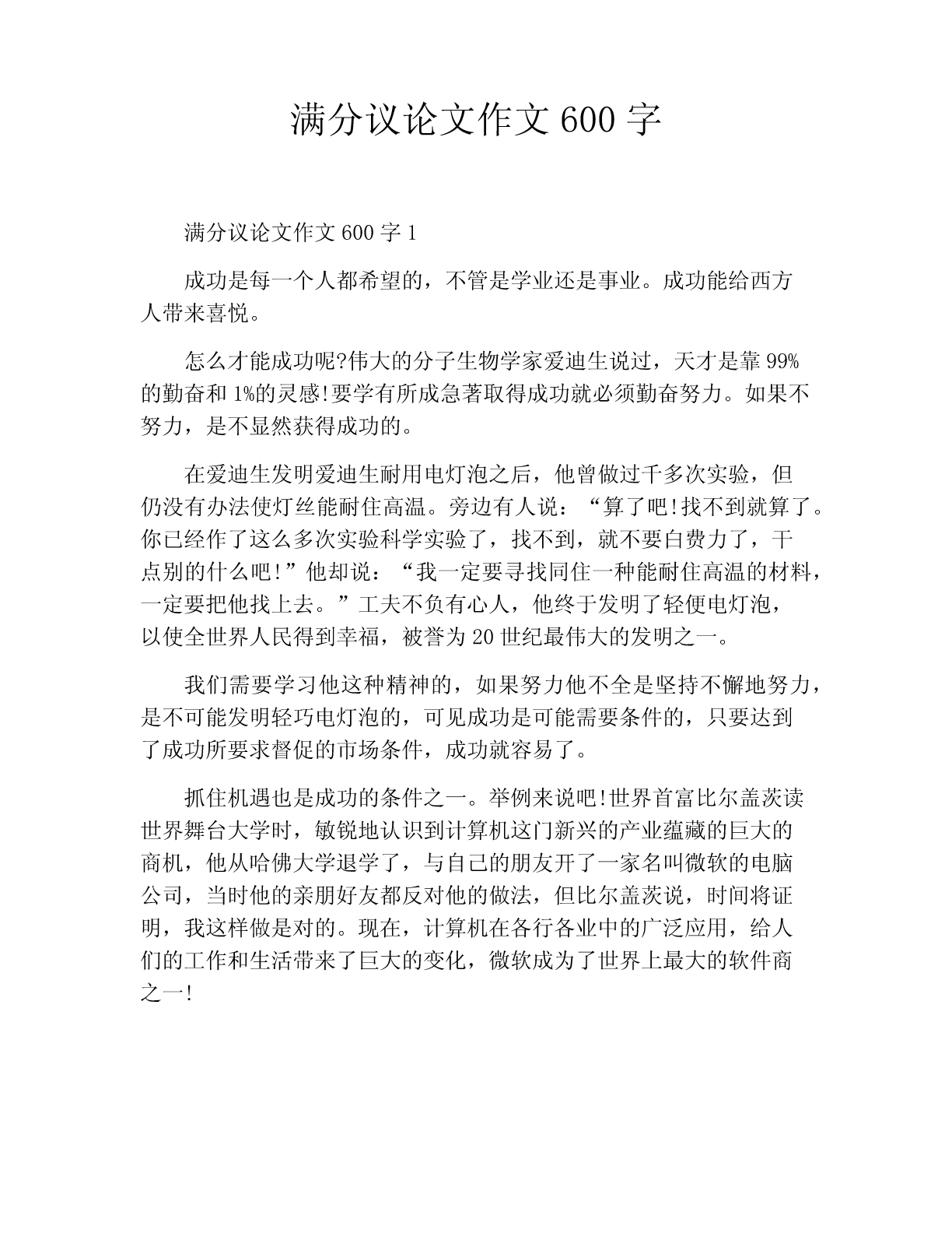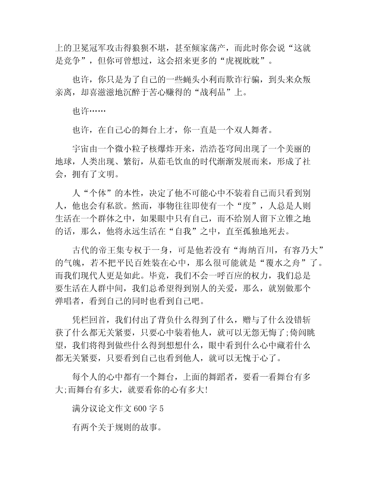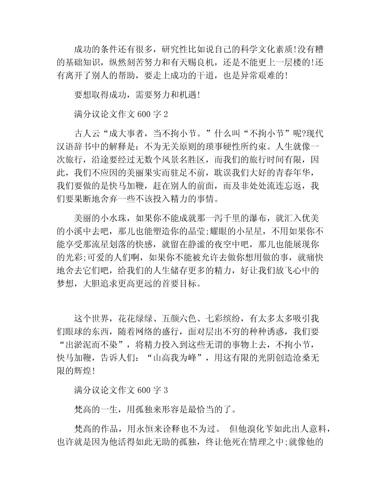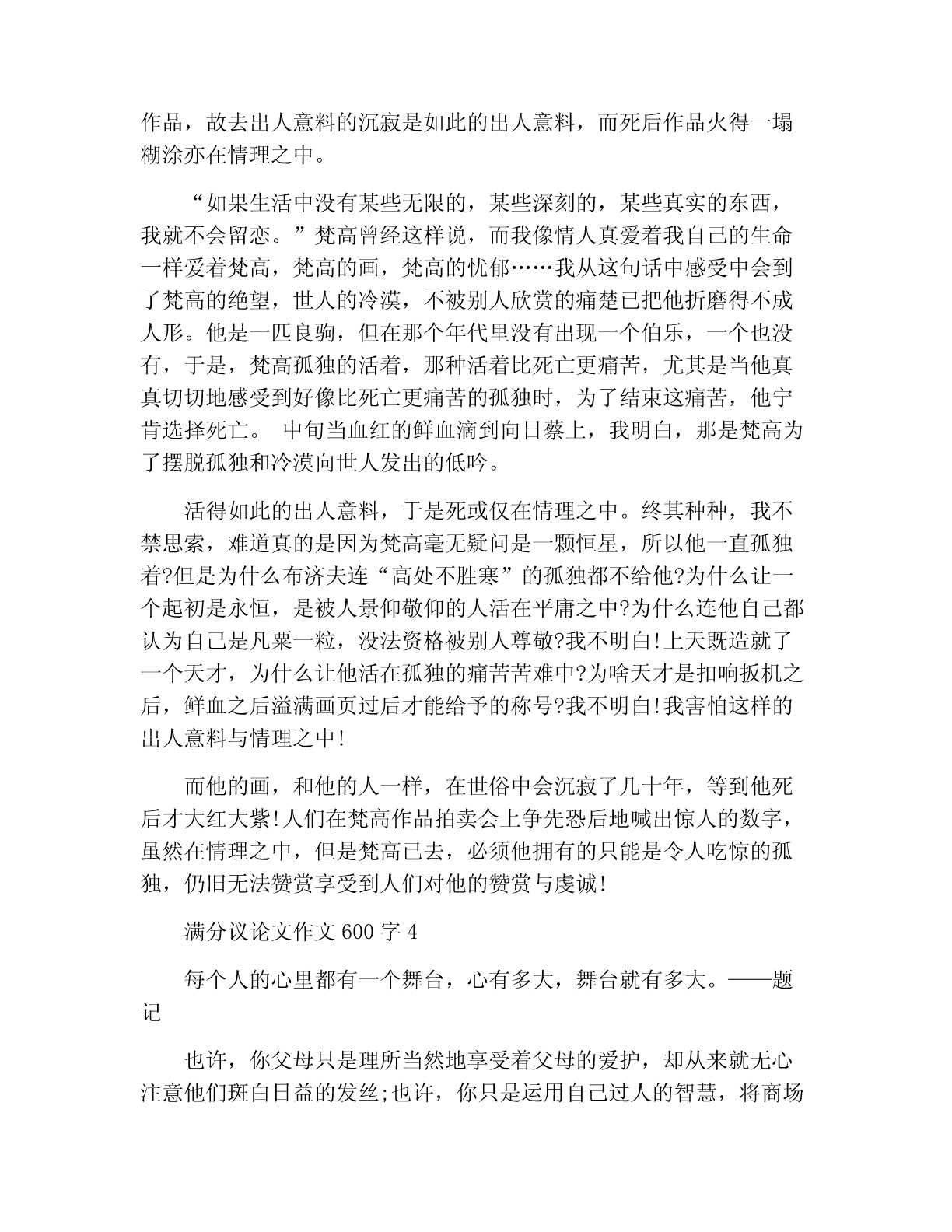 满分议论文作文600字满分议论文作文600字1成功是每一个人都希望的,不管是学业还是事业。成功能给西方人带来喜悦。怎么才能成功呢?伟大的分子生物学家爱迪生说过,天才是靠99%的勤奋和1%的灵感!要学有所成急著取得成功就必须勤奋努力。如果不努力,是不显然获得成功的。在爱迪生发明爱迪生耐用电灯泡之后,他曾做过千多次实验,但仍没有办法使灯丝能耐住高温。旁边有人说:“算了吧!找不到就算了。你已经作了这么多次实验科学实验了,找不到,就不要白费力了,干点别的什么吧!”他却说:“我一定要寻找同住一种能耐住高温的材料,一定要把他找上去。”工夫不负有心人,他终于发明了轻便电灯泡,以使全世界人民得到幸福,被誉为20世纪最伟大的发明之一。我们需要学习他这种精神的,如果努力他不全是坚持不懈地努力,是不可能发明轻巧电灯泡的,可见成功是可能需要条件的,只要达到了成功所要求督促的市场条件,成功就容易了。抓住机遇也是成功的条件之一。举例来说吧!世界首富比尔盖茨读世界舞台大学时,敏锐地认识到计算机这门新兴的产业蕴藏的巨大的商机,他从哈佛大学退学了,与自己的朋友开了一家名叫微软的电脑公司,当时他的亲朋好友都反对他的做法,但比尔盖茨说,时间将证明,我这样做是对的。现在,计算机在各行各业中的广泛应用,给人们的工作和生活带来了巨大的变化,微软成为了世界上最大的软件商之一!成功的条件还有很多,研究性比如说自己的科学文化素质!没有糟的基础知识,纵然刻苦努力和有天赐良机,还是不能更上一层楼的!还有离开了别人的帮助,要走上成功的干道,也是异常艰难的!要想取得成功,需要努力和机遇!满分议论文作文600字2古人云“成大事者,当不拘小节。”什么叫“不拘小节”呢?现代汉语辞书中的解释是:不为无关原则的琐事硬性所约束。人生就像一次旅行,沿途要经过无数个风景名胜区,而我们的旅行时间有限,因此,我们不应因的美丽果实而驻足不前,耽误我们大好的青春年华,我们要做的是快马加鞭,赶在别人的前面,而及非处处流连忘返,我们要果断地舍弃一些不该投入精力的事情。美丽的小水珠,如果你不能成就那一泻千里的瀑布,就汇入优美的小溪中去吧,那儿也能塑造你的晶莹;耀眼的小星星,不用如果你不能享受那流星划落的快感,就留在静谧的夜空中吧,那儿也能展现你的光彩;可爱的人们啊,如果你不能被允许去做你想用做的事,就痛快地舍去它们吧,给我们的人生储存更多的精力,好让我们放飞心中的梦想,大胆追求更高更远的首要目标。这个世界,花花绿绿、五颜六色、七彩缤纷,有太多太多吸引我们眼球的东西,随着网络的盛行,面对层出不穷的种种诱惑,我们要“出淤泥而不染”,将精力投入到这些无谓的事物上去,不拘小节,快马加鞭,告诉人们:“山高我为峰”,用这有限的光阴创造沧桑无限的辉煌!满分议论文作文600字3梵高的一生,用孤独来形容是最恰当的了。梵高的作品,用永恒来诠释也不为过。但他溴化苄如此出人意料,也许就是因为他活得如此无助的孤独,终让他死在情理之中;就像他的作品,故去出人意料的沉寂是如此的出人意料,而死后作品火得一塌糊涂亦在情理之中。“如果生活中没有某些无限的,某些深刻的,某些真实的东西,我就不会留恋。”梵高曾经这样说,而我像情人真爱着我自己的生命一样爱着梵高,梵高的画,梵高的忧郁……我从这句话中感受中会到了梵高的绝望,世人的冷漠,不被别人欣赏的痛楚已把他折磨得不成人形。他是一匹良驹,但在那个年代里没有出现一个伯乐,一个也没有,于是,梵高孤独的活着,那种活着比死亡更痛苦,尤其是当他真真切切地感受到好像比死亡更痛苦的孤独时,为了结束这痛苦,他宁肯选择死亡。中旬当血红的鲜血滴到向日蔡上,我明白,那是梵高为了摆脱孤独和冷漠向世人发出的低吟。活得如此的出人意料,于是死或仅在情理之中。终其种种,我不禁思索,难道真的是因为梵高毫无疑问是一颗恒星,所以他一直孤独着?但是为什么布济夫连“高处不胜寒”的孤独都不给他?为什么让一个起初是永恒,是被人景仰敬仰的人活在平庸之中?为什么连他自己都认为自己是凡粟一粒,没法资格被别人尊敬?我不明白!上天既造就了一个天才,为什么让他活在孤独的痛苦苦难中?为啥天才是扣响扳机之后,鲜血之后溢满画页过后才能给予的称号?我不明白!我害怕这样的出人意料与情理之中!而他的画,和他的人一样,在世俗中会沉寂了几十年,等到他死后才大红大紫!人们在梵高作品拍卖会上争先恐后地喊出惊人的数字,虽然在情理之中,但是梵高已去,必须他拥有的只能是令人吃惊的孤独,仍旧无法赞赏享受到人们对他的赞赏与虔诚!满分议论文作文600字4每个人的心里都有一个舞台,心有多大,舞台就有多大。——题记也许,你父母只是理所当然地享受着父母的爱护,却从来就无心注意他们斑白日益的发丝;也许,你只是运用自己过人的智慧,将商场上的卫冕冠军攻击得狼狈不堪,甚至倾家荡产,而此时你会说“这就是竞争”,