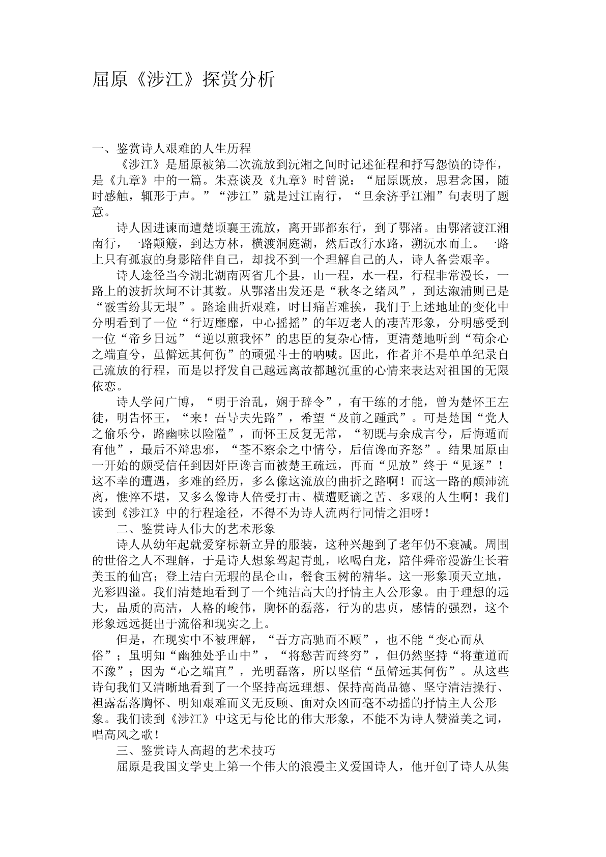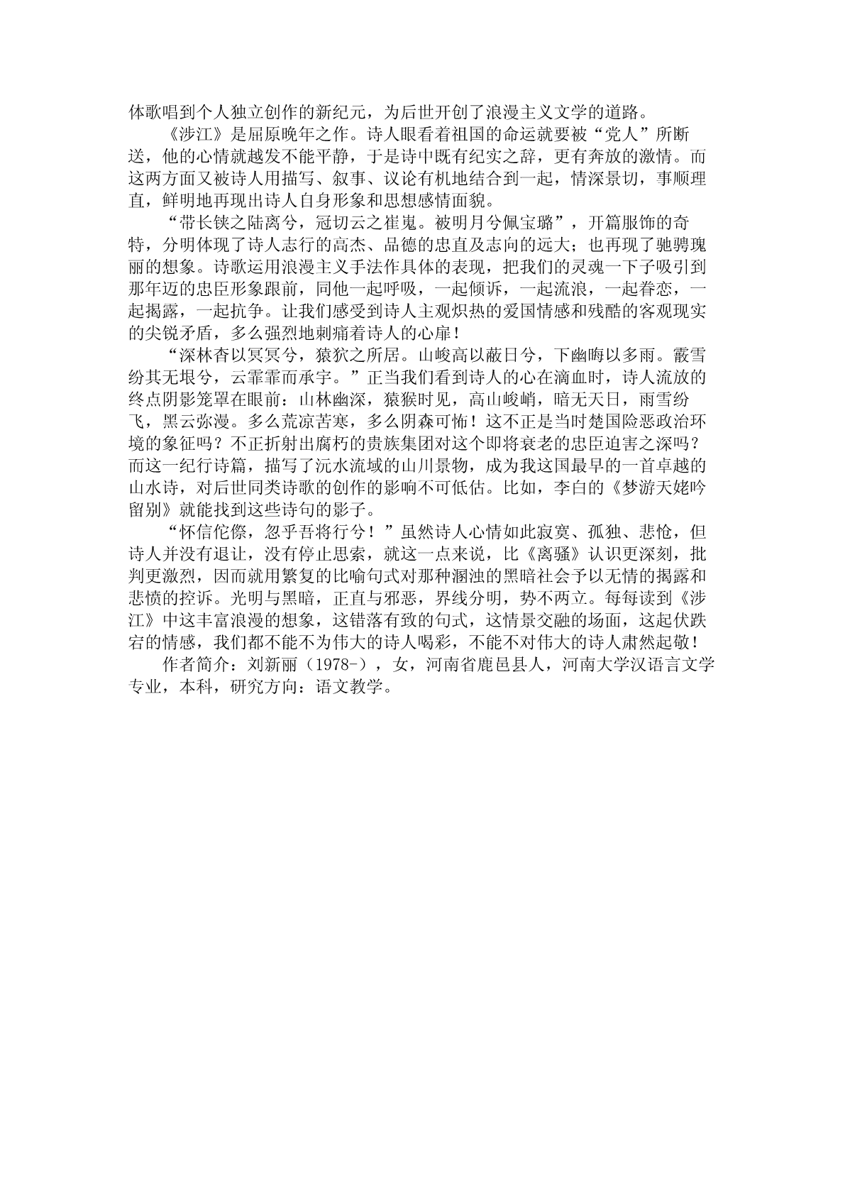 屈原《涉江》探赏分析一、鉴赏诗人艰难的人生历程《涉江》是屈原被第二次流放到沅湘之间时记述征程和抒写怨愤的诗作,是《九章》中的一篇。朱熹谈及《九章》时曾说:“屈原既放,思君念国,随时感触,辄形于声。”“涉江”就是过江南行,“旦余济乎江湘”句表明了题意。诗人因进谏而遭楚顷襄王流放,离开郢都东行,到了鄂渚。由鄂渚渡江湘南行,一路颠簸,到达方林,横渡洞庭湖,然后改行水路,溯沅水而上。一路上只有孤寂的身影陪伴自己,却找不到一个理解自己的人,诗人备尝艰辛。诗人途径当今湖北湖南两省几个县,山一程,水一程,行程非常漫长,一路上的波折坎坷不计其数。从鄂渚出发还是“秋冬之绪风”,到达溆浦则已是“霰雪纷其无垠”。路途曲折艰难,时日痛苦难挨,我们于上述地址的变化中分明看到了一位“行迈靡靡,中心摇摇”的年迈老人的凄苦形象,分明感受到一位“帝乡日远”“逆以煎我怀”的忠臣的复杂心情,更清楚地听到“苟余心之端直兮,虽僻远其何伤”的顽强斗士的呐喊。因此,作者并不是单单纪录自己流放的行程,而是以抒发自己越远离故都越沉重的心情来表达对祖国的无限依恋。诗人学问广博,“明于治乱,娴于辞令”,有干练的才能,曾为楚怀王左徒,明告怀王,“来!吾导夫先路”,希望“及前之踵武”。可是楚国“党人之偷乐兮,路幽味以险隘”,而怀王反复无常,“初既与余成言兮,后悔遁而有他”,最后不辩忠邪,“荃不察余之中情兮,后信谗而齐怒”。结果屈原由一开始的颇受信任到因奸臣谗言而被楚王疏远,再而“见放”终于“见逐”!这不幸的遭遇,多难的经历,多么像这流放的曲折之路啊!而这一路的颠沛流离,憔悴不堪,又多么像诗人倍受打击、横遭贬谪之苦、多艰的人生啊!我们读到《涉江》中的行程途径,不得不为诗人流两行同情之泪呀!二、鉴赏诗人伟大的艺术形象诗人从幼年起就爱穿标新立异的服装,这种兴趣到了老年仍不衰减。周围的世俗之人不理解,于是诗人想象驾起青虬,吆喝白龙,陪伴舜帝漫游生长着美玉的仙宫;登上洁白无瑕的昆仑山,餐食玉树的精华。这一形象顶天立地,光彩四溢。我们清楚地看到了一个纯洁高大的抒情主人公形象。由于理想的远大,品质的高洁,人格的峻伟,胸怀的磊落,行为的忠贞,感情的强烈,这个形象远远挺出于流俗和现实之上。但是,在现实中不被理解,“吾方高驰而不顾”,也不能“变心而从俗”;虽明知“幽独处乎山中”,“将愁苦而终穷”,但仍然坚持“将董道而不豫”;因为“心之端直”,光明磊落,所以坚信“虽僻远其何伤”。从这些诗句我们又清晰地看到了一个坚持高远理想、保持高尚品德、坚守清洁操行、袒露磊落胸怀、明知艰难而义无反顾、面对众凶而毫不动摇的抒情主人公形象。我们读到《涉江》中这无与伦比的伟大形象,不能不为诗人赞溢美之词,唱高风之歌!三、鉴赏诗人高超的艺术技巧屈原是我国文学史上第一个伟大的浪漫主义爱国诗人,他开创了诗人从集体歌唱到个人独立创作的新纪元,为后世开创了浪漫主义文学的道路。《涉江》是屈原晚年之作。诗人眼看着祖国的命运就要被“党人”所断送,他的心情就越发不能平静,于是诗中既有纪实之辞,更有奔放的激情。而这两方面又被诗人用描写、叙事、议论有机地结合到一起,情深景切,事顺理直,鲜明地再现出诗人自身形象和思想感情面貌。“带长铗之陆离兮,冠切云之崔嵬。被明月兮佩宝璐”,开篇服饰的奇特,分明体现了诗人志行的高杰、品德的忠直及志向的远大;也再现了驰骋瑰丽的想象。诗歌运用浪漫主义手法作具体的表现,把我们的灵魂一下子吸引到那年迈的忠臣形象跟前,同他一起呼吸,一起倾诉,一起流浪,一起眷恋,一起揭露,一起抗争。让我们感受到诗人主观炽热的爱国情感和残酷的客观现实的尖锐矛盾,多么强烈地刺痛着诗人的心扉!“深林杳以冥冥兮,猿狖之所居。山峻高以蔽日兮,下幽晦以多雨。霰雪纷其无垠兮,云霏霏而承宇。”正当我们看到诗人的心在滴血时,诗人流放的终点阴影笼罩在眼前:山林幽深,猿猴时见,高山峻峭,暗无天日,雨雪纷飞,黑云弥漫。多么荒凉苦寒,多么阴森可怖!这不正是当时楚国险恶政治环境的象征吗?不正折射出腐朽的贵族集团对这个即将衰老的忠臣迫害之深吗?而这一纪行诗篇,描写了沅水流域的山川景物,成为我这国最早的一首卓越的山水诗,对后世同类诗歌的创作的影响不可低估。比如,李白的《梦游天姥吟留别》就能找到这些诗句的影子。“怀信佗傺,忽乎吾将行兮!”虽然诗人心情如此寂寞、孤独、悲怆,但诗人并没有退让,没有停止思索,就这一点来说,比《离骚》认识更深刻,批判更激烈,因而就用繁复的比喻句式对那种溷浊的黑暗社会予以无情的揭露和悲愤的控诉。光明与黑暗,正直与邪恶,界线分明,势不两立。每每读到《涉江》中这丰富浪漫的想象,这错落有致的句式,这情景交融的场面,这起伏跌宕的情感,我们都不能不为伟大的诗人喝彩,不能不对伟大的诗人肃然起敬!作者简介:刘新丽(1978-),女,河南省鹿邑县人,河南大学汉语言文学专