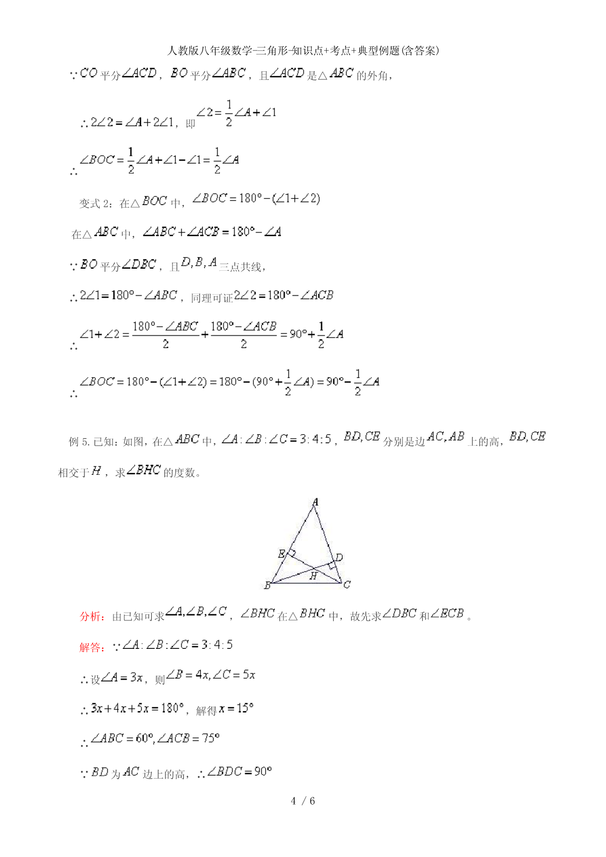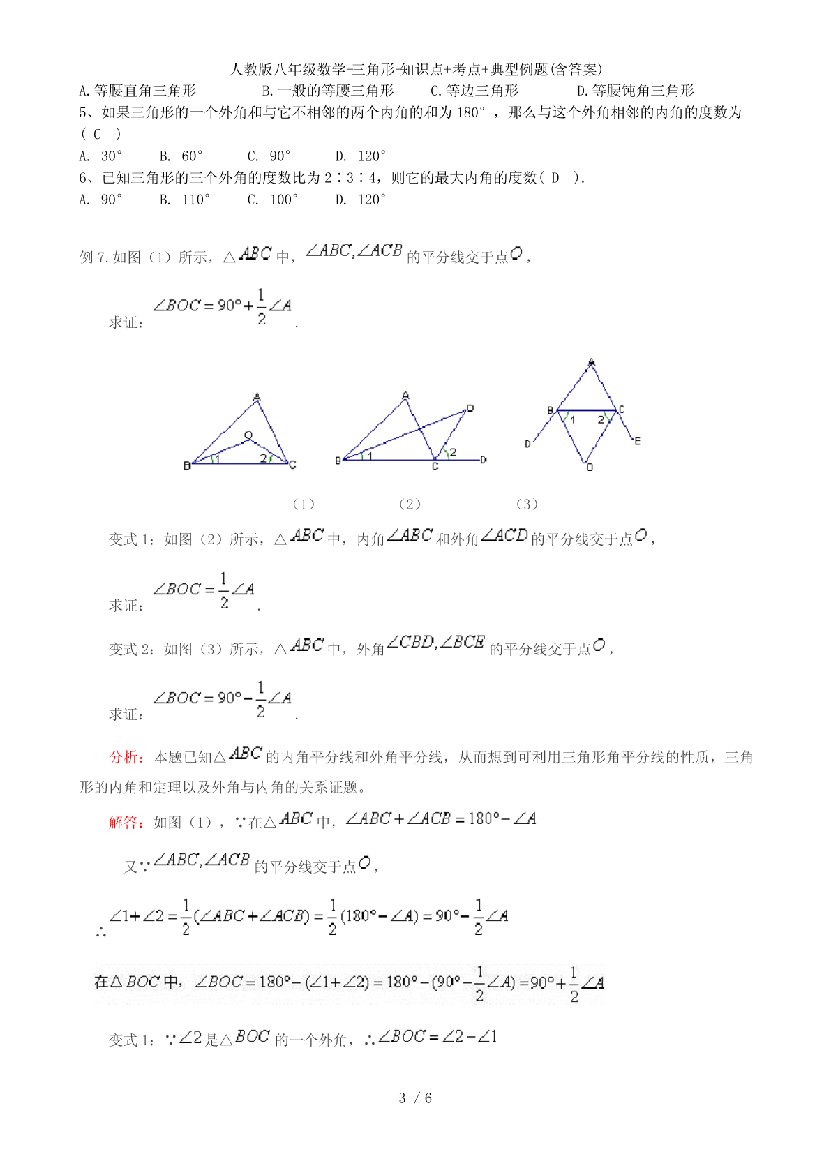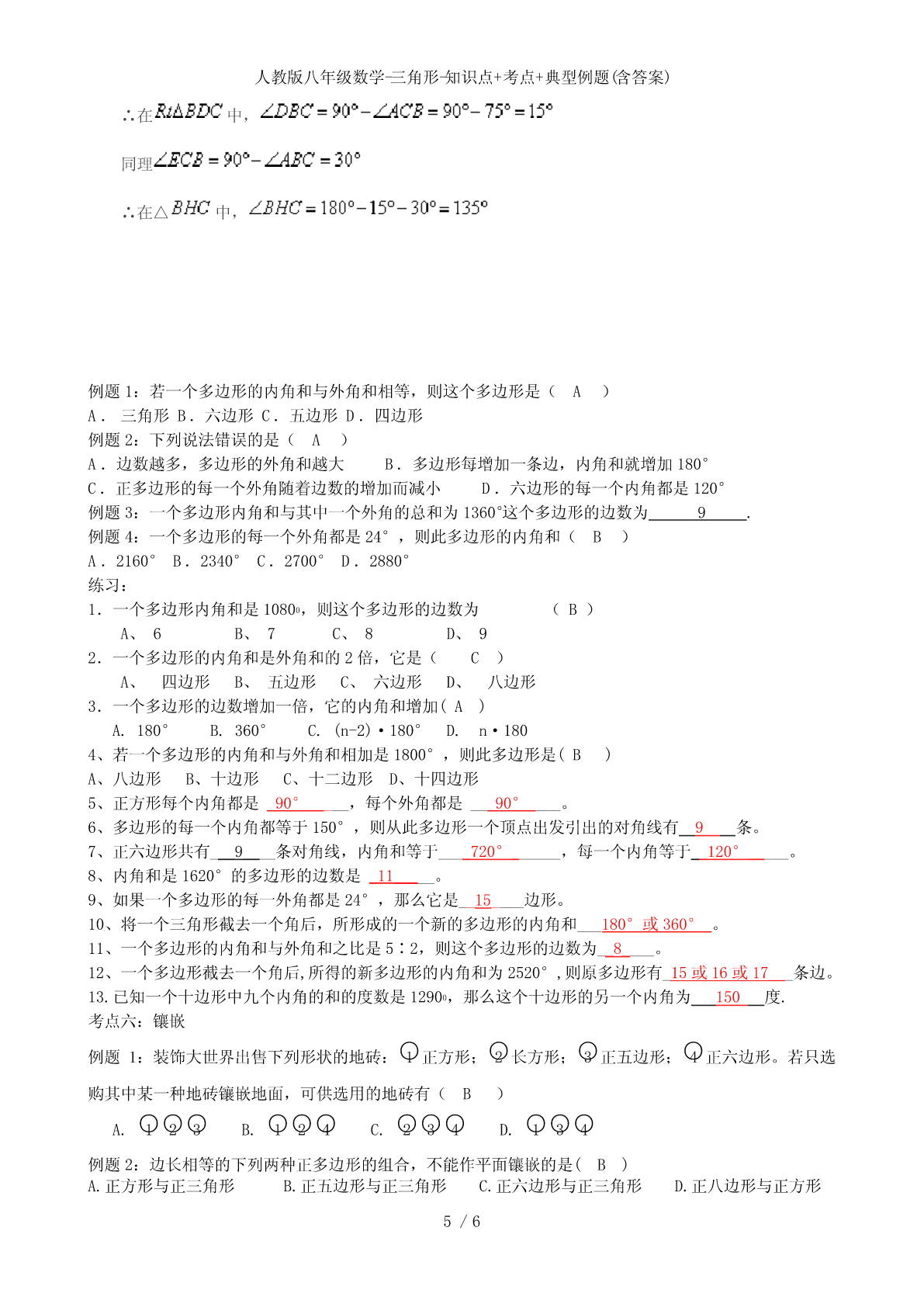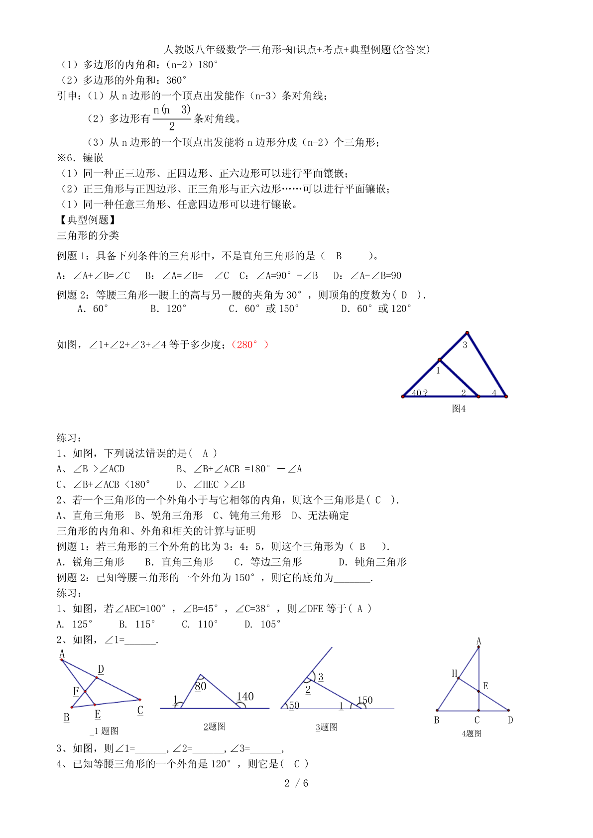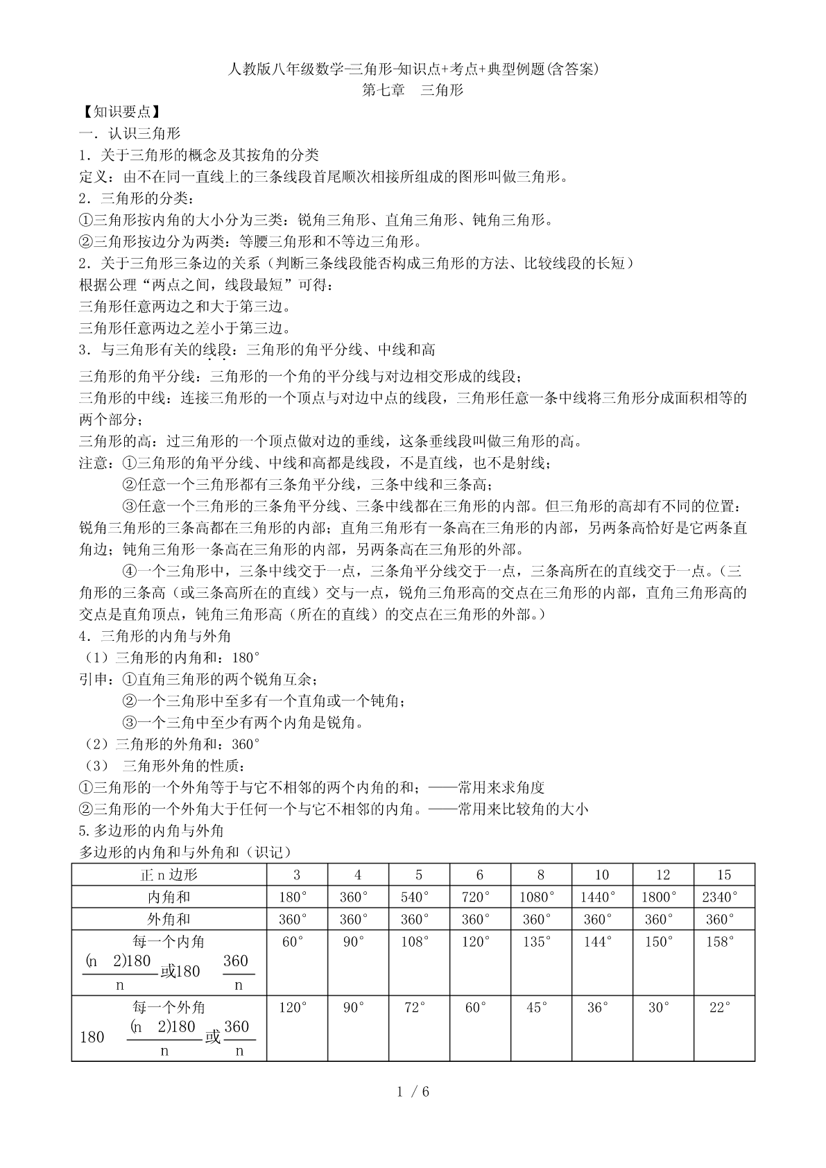 人教版八年级数学-三角形-知识点+考点+典型例题(含答案)第七章三角形【知识要点】一.认识三角形1.关于三角形的概念及其按角的分类定义:由不在同一直线上的三条线段首尾顺次相接所组成的图形叫做三角形。2.三角形的分类:①三角形按内角的大小分为三类:锐角三角形、直角三角形、钝角三角形。②三角形按边分为两类:等腰三角形和不等边三角形。2.关于三角形三条边的关系(判断三条线段能否构成三角形的方法、比较线段的长短)根据公理“两点之间,线段最短”可得:三角形任意两边之和大于第三边。三角形任意两边之差小于第三边。3.与三角形有关的线段..:三角形的角平分线、中线和高三角形的角平分线:三角形的一个角的平分线与对边相交形成的线段;三角形的中线:连接三角形的一个顶点与对边中点的线段,三角形任意一条中线将三角形分成面积相等的两个部分;三角形的高:过三角形的一个顶点做对边的垂线,这条垂线段叫做三角形的高。注意:①三角形的角平分线、中线和高都是线段,不是直线,也不是射线;②任意一个三角形都有三条角平分线,三条中线和三条高;③任意一个三角形的三条角平分线、三条中线都在三角形的内部。但三角形的高却有不同的位置:锐角三角形的三条高都在三角形的内部;直角三角形有一条高在三角形的内部,另两条高恰好是它两条直角边;钝角三角形一条高在三角形的内部,另两条高在三角形的外部。④一个三角形中,三条中线交于一点,三条角平分线交于一点,三条高所在的直线交于一点。(三角形的三条高(或三条高所在的直线)交与一点,锐角三角形高的交点在三角形的内部,直角三角形高的交点是直角顶点,钝角三角形高(所在的直线)的交点在三角形的外部。)4.三角形的内角与外角(1)三角形的内角和:180°引申:①直角三角形的两个锐角互余;②一个三角形中至多有一个直角或一个钝角;③一个三角中至少有两个内角是锐角。(2)三角形的外角和:360°(3)三角形外角的性质:①三角形的一个外角等于与它不相邻的两个内角的和;——常用来求角度②三角形的一个外角大于任何一个与它不相邻的内角。——常用来比较角的大小5.多边形的内角与外角多边形的内角和与外角和(识记)正n边形34568101215内角和180°360°540°720°1080°1440°1800°2340°外角和360°360°360°360°360°360°360°360°每一个内角60°90°108°120°135°144°150°158°(n2)180360或180nn每一个外角120°90°72°60°45°36°30°22°(n2)180360180或nn1/6人教版八年级数学-三角形-知识点+考点+典型例题(含答案)(1)多边形的内角和:(n-2)180°(2)多边形的外角和:360°引申:(1)从n边形的一个顶点出发能作(n-3)条对角线;n(n3)(2)多边形有条对角线。2(3)从n边形的一个顶点出发能将n边形分成(n-2)个三角形;※6.镶嵌(1)同一种正三边形、正四边形、正六边形可以进行平面镶嵌;(2)正三角形与正四边形、正三角形与正六边形……可以进行平面镶嵌;(1)同一种任意三角形、任意四边形可以进行镶嵌。【典型例题】三角形的分类例题1:具备下列条件的三角形中,不是直角三角形的是(B)。A:∠A+∠B=∠CB:∠A=∠B=∠CC:∠A=90°-∠BD:∠A-∠B=90例题2:等腰三角形一腰上的高与另一腰的夹角为30°,则顶角的度数为(D).A.60°B.120°C.60°或150°D.60°或120°如图,∠1+∠2+∠3+∠4等于多少度;(280°)3140?24图4练习:1、如图,下列说法错误的是(A)A、∠B>∠ACDB、∠B+∠ACB=180°-∠AC、∠B+∠ACB<180°D、∠HEC>∠B2、若一个三角形的一个外角小于与它相邻的内角,则这个三角形是(C).A、直角三角形B、锐角三角形C、钝角三角形D、无法确定三角形的内角和、外角和相关的计算与证明例题1:若三角形的三个外角的比为3:4:5,则这个三角形为(B).A.锐角三角形B.直角三角形C.等边三角形D.钝角三角形例题2:已知等腰三角形的一个外角为150°,则它的底角为_______.练习:1、如图,若∠AEC=100°,∠B=45°,∠C=38°,则∠DFE等于(A)A.125°B.115°C.110°D.105°2、如图,∠1=______.A_A_D_3H_80E_F_2_1_140_150_50_1_C_B_EBCD_2题图_3题图_1题图4题图3、如图,则∠1=______,∠2=______,∠3=______,4、已知等腰三角形的一个外角是120°,则它是(C)2/6人教版八年级数学-三角形-知识点+考点+典型例题(含答案)A.等腰直