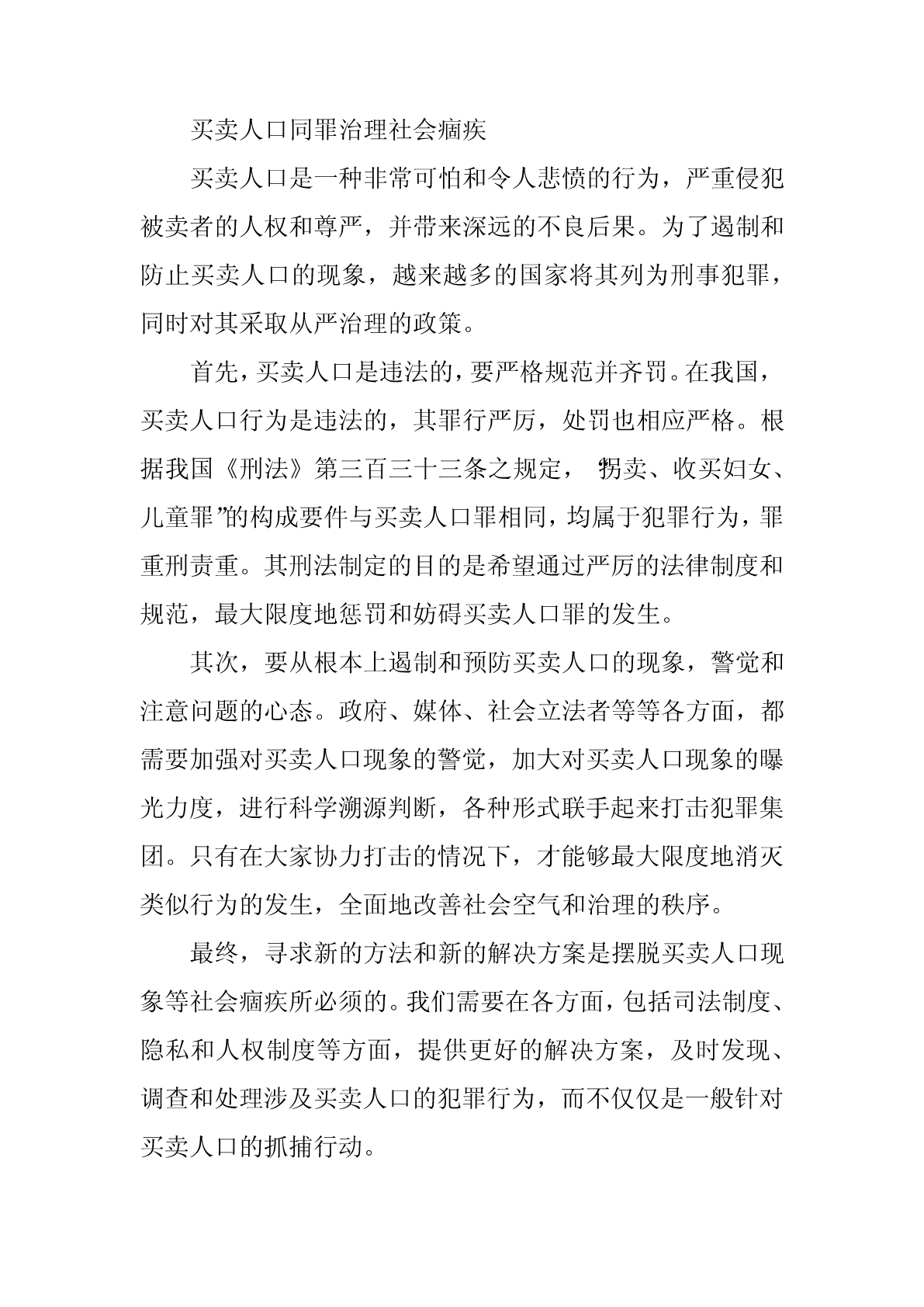 买卖人口同罪治理社会痼疾买卖人口是一种非常可怕和令人悲愤的行为,严重侵犯被卖者的人权和尊严,并带来深远的不良后果。为了遏制和防止买卖人口的现象,越来越多的国家将其列为刑事犯罪,同时对其采取从严治理的政策。首先,买卖人口是违法的,要严格规范并齐罚。在我国,买卖人口行为是违法的,其罪行严厉,处罚也相应严格。根据我国《刑法》第三百三十三条之规定,“拐卖、收买妇女、儿童罪”的构成要件与买卖人口罪相同,均属于犯罪行为,罪重刑责重。其刑法制定的目的是希望通过严厉的法律制度和规范,最大限度地惩罚和妨碍买卖人口罪的发生。其次,要从根本上遏制和预防买卖人口的现象,警觉和注意问题的心态。政府、媒体、社会立法者等等各方面,都需要加强对买卖人口现象的警觉,加大对买卖人口现象的曝光力度,进行科学溯源判断,各种形式联手起来打击犯罪集团。只有在大家协力打击的情况下,才能够最大限度地消灭类似行为的发生,全面地改善社会空气和治理的秩序。最终,寻求新的方法和新的解决方案是摆脱买卖人口现象等社会痼疾所必须的。我们需要在各方面,包括司法制度、隐私和人权制度等方面,提供更好的解决方案,及时发现、调查和处理涉及买卖人口的犯罪行为,而不仅仅是一般针对买卖人口的抓捕行动。总之,买卖人口是一个可怕和令人痛心的社会问题,我们必须坚决打击它,加强法律制度和社会监督以防治买卖人口行为的发生,不断创新解决方案,为社会形态的进步和渐进提升,奠定良好的法治基础。