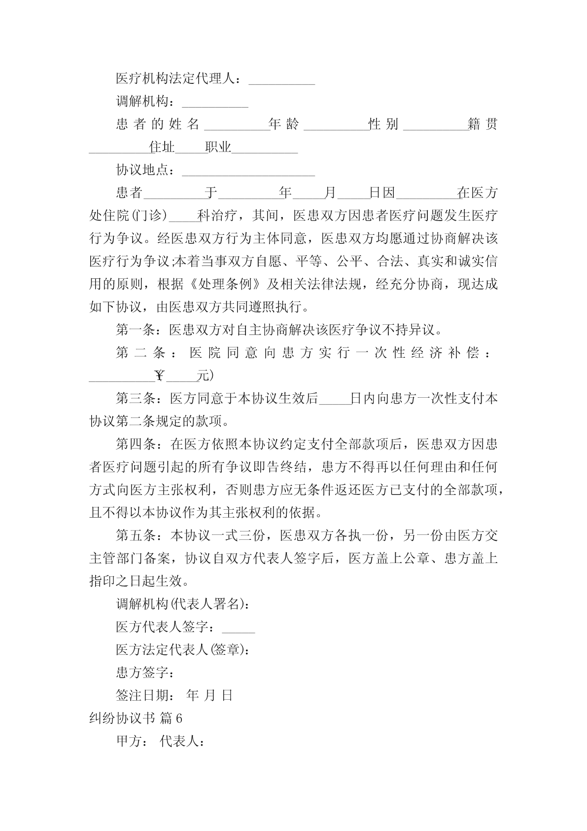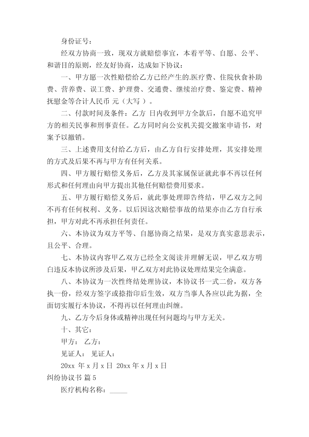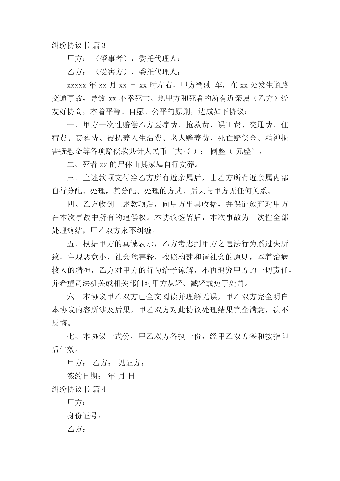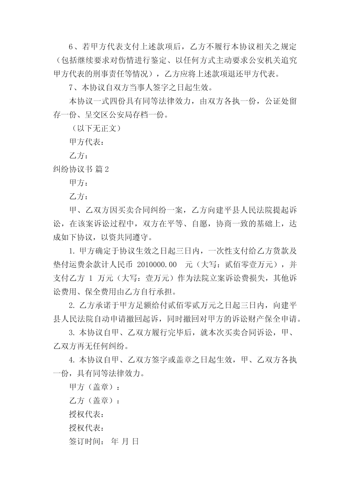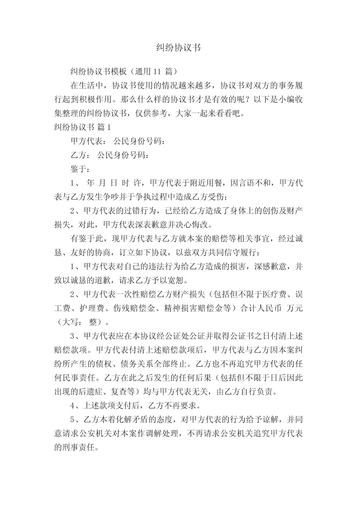 纠纷协议书纠纷协议书模板(通用11篇)在生活中,协议书使用的情况越来越多,协议书对双方的事务履行起到积极作用。那么什么样的协议书才是有效的呢?以下是小编收集整理的纠纷协议书,仅供参考,大家一起来看看吧。纠纷协议书篇1甲方代表:公民身份号码:乙方:公民身份号码:鉴于:1、年月日时许,甲方代表于附近用餐,因言语不和,甲方代表与乙方发生争吵并于争执过程中造成乙方受伤;2、甲方代表的过错行为,已经给乙方造成了身体上的创伤及财产损失,对此,甲方代表深表歉意并决心悔改。有鉴于此,现甲方代表与乙方就本案的赔偿等相关事宜,经过诚恳、友好的协商,订立如下协议,以兹双方共同信守履行:1、甲方代表对自己的违法行为给乙方造成的损害,深感歉意,并致以诚恳的道歉,请求乙方予以宽恕。2、甲方代表一次性赔偿乙方财产损失(包括但不限于医疗费、误工费、护理费、伤残赔偿金、精神损害赔偿金等)合计人民币万元(大写:整)。3、甲方代表应在本协议经公证处公证并取得公证书之日付清上述赔偿款项。甲方代表付清上述赔偿款项后,甲方代表与乙方因本案纠纷所产生的债权、债务关系全部终止。乙方也不再追究甲方代表的任何民事责任。乙方在此之后发生的任何后果(包括但不限于日后因此出现的后遗症、复查等)均与甲方代表无关,由乙方自行负责。4、上述款项支付后,乙方不再要求。5、乙方本着化解矛盾的态度,对甲方代表的行为给予谅解,并同意请求公安机关对本案作调解处理,不再请求公安机关追究甲方代表的刑事责任。6、若甲方代表支付上述款项后,乙方不履行本协议相关之规定(包括继续要求对伤情进行鉴定、以任何方式主动要求公安机关追究甲方代表的刑事责任等情况),乙方应将上述款项退还甲方代表。7、本协议自双方当事人签字之日起生效。本协议一式四份具有同等法律效力,由双方各执一份,公证处留存一份、呈交区公安局存档一份。(以下无正文)甲方代表:乙方:纠纷协议书篇2甲方:乙方:甲、乙双方因买卖合同纠纷一案,乙方向建平县人民法院提起诉讼,在该案诉讼过程中,双方在平等、自愿,协商一致的基础上,达成如下协议,以资共同遵守。1.甲方确定于协议生效之日起三日内,一次性支付给乙方货款及垫付运费余款计人民币2010000.00元(大写:贰佰零壹万元),并支付乙方1万元(大写:壹万元)作为法院立案诉讼费损失,其他诉讼费用、保全费用由乙方自行承担。2.乙方承诺于甲方足额给付贰佰零贰万元之日起三日内,向建平县人民法院自动申请撤回起诉,同时撤回对甲方的诉讼财产保全申请。3.本协议自甲、乙双方履行完毕后,就本次买卖合同诉讼,甲、乙双方再无任何纠纷。4.本协议自甲、乙双方签字或盖章之日起生效,甲、乙双方各执一份,具有同等法律效力。甲方(盖章):乙方(盖章):授权代表:授权代表:签订时间:年月日纠纷协议书篇3甲方:(肇事者),委托代理人:乙方:(受害方),委托代理人:xxxxx年xx月xx日xx时左右,甲方驾驶车,在xx处发生道路交通事故,导致xx不幸死亡。现甲方和死者的所有近亲属(乙方)经友好协商,本着平等、自愿、公平的原则,达成如下协议:一、甲方一次性赔偿乙方医疗费、抢救费、误工费、交通费、住宿费、丧葬费、被抚养人生活费、老人赡养费、死亡赔偿金、精神损害抚慰金等各项赔偿款共计人民币(大写):圆整(元整)。二、死者xx的尸体由其家属自行安葬。三、上述款项支付给乙方所有近亲属后,由乙方所有近亲属内部自行分配、处理,其分配、处理的方式、后果与甲方无任何关系。四、乙方收到上述款项后,向甲方出具收据,并保证放弃对甲方在本次事故中所有的追偿权。本协议签署后,本次事故为一次性全部处理终结,甲乙双方永不纠缠。五、根据甲方的真诚表示,乙方考虑到甲方之违法行为系过失所致,主观恶意小,社会危害轻,按照构建和谐社会的原则,本着治病救人的精神,乙方对甲方的行为给予谅解,不再追究甲方的一切责任,并希望司法机关或相关部门对甲方从轻、减轻或免于处罚。六、本协议甲乙双方已全文阅读并理解无误,甲乙双方完全明白本协议内容所涉及后果,甲乙双方对此协议处理结果完全满意,决不反悔。七、本协议一式份,甲乙双方各执一份,经甲乙双方签和按指印后生效。甲方:乙方:见证方:签约日期:年月日纠纷协议书篇4甲方:身份证号:乙方:身份证号:经双方协商一致,现双方就赔偿事宜,本着平等、自愿、公平、和谐目的原则,经友好协商,达成如下协议:一、甲方愿一次性赔偿给乙方已经产生的.医疗费、住院伙食补助费、营养费、误工费、护理费、交通费、继续治疗费、鉴定费、精神抚慰金等合计人民币元(大写)。二、付款时间及条件:乙方日内收到甲方全款后,自愿不追究甲方的相关民事和刑事责任。乙方同时向公安机关提交撤案申请书,对案予以撤销。三、上述费用支付给乙方后,由乙方自行安排处理,其安排处理的方式及后果不再与甲方有任何关系。四、甲方履行赔偿