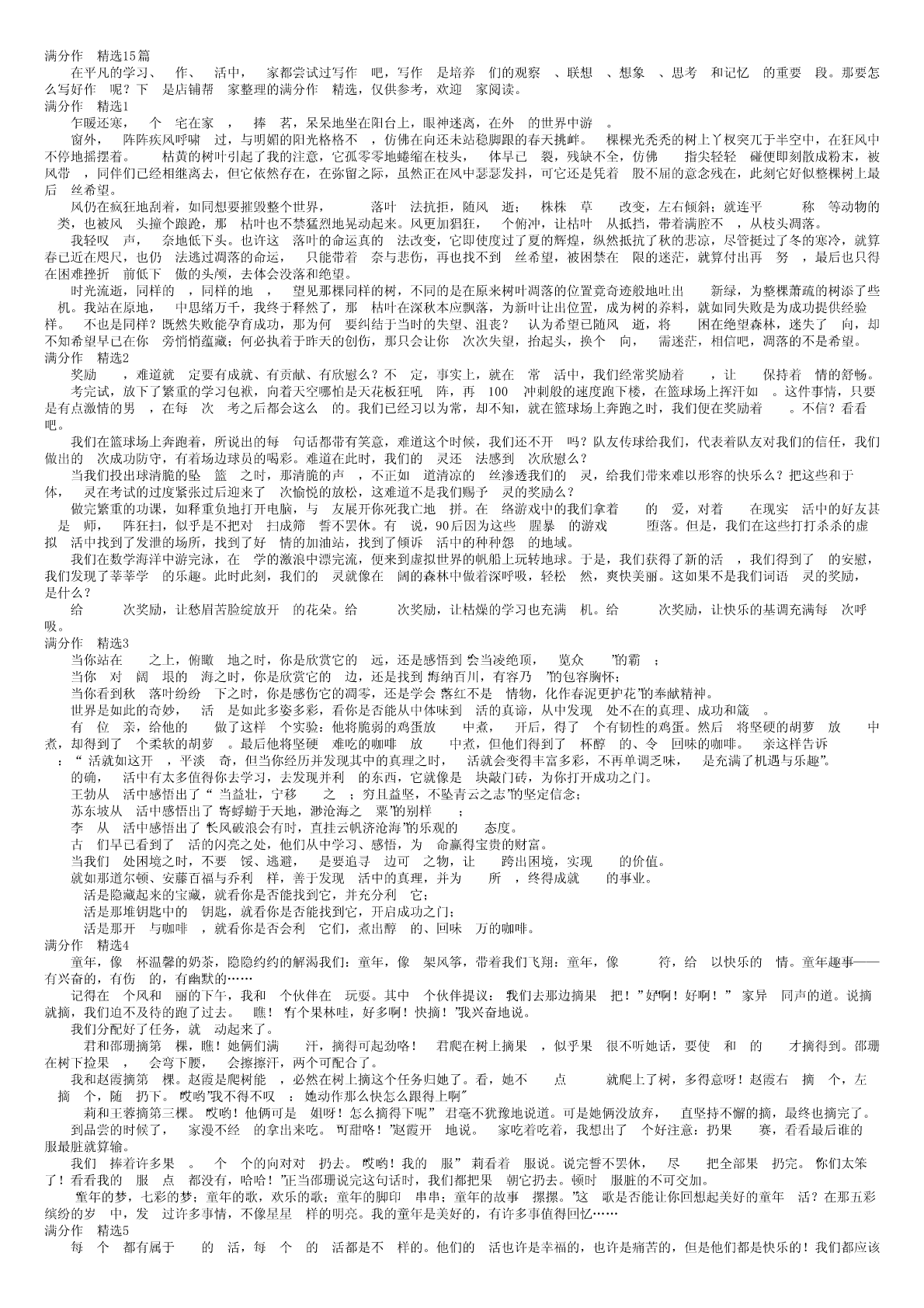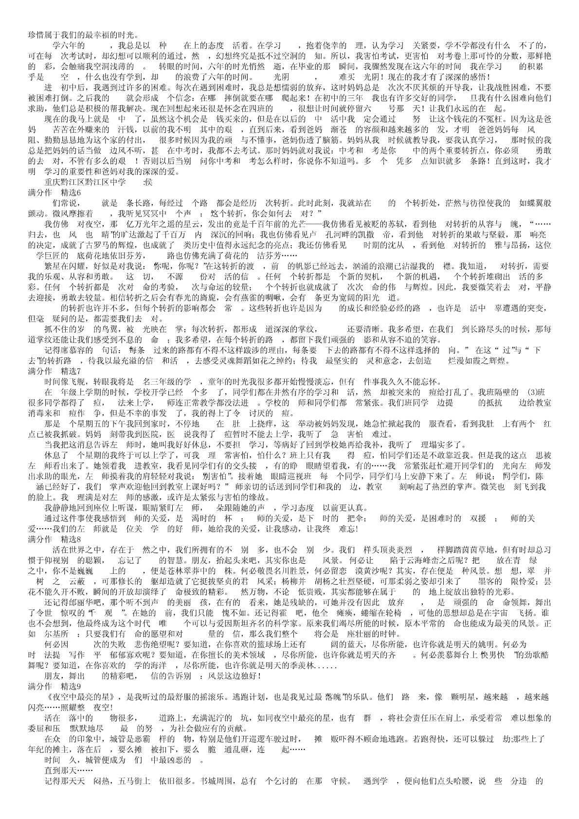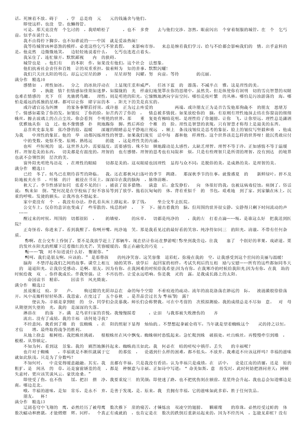 满分作⽂精选15篇在平凡的学习、⼯作、⽣活中,⼤家都尝试过写作⽂吧,写作⽂是培养⼈们的观察⼒、联想⼒、想象⼒、思考⼒和记忆⼒的重要⼿段。那要怎么写好作⽂呢?下⾯是店铺帮⼤家整理的满分作⽂精选,仅供参考,欢迎⼤家阅读。满分作⽂精选1乍暖还寒,⼀个⼈宅在家⾥,⼿捧⾹茗,呆呆地坐在阳台上,眼神迷离,在外⾯的世界中游⾛。窗外,⼀阵阵疾风呼啸⽽过,与明媚的阳光格格不⼊,仿佛在向还未站稳脚跟的春天挑衅。⼀棵棵光秃秃的树上丫杈突兀于半空中,在狂风中不停地摇摆着。⼀⽚枯黄的树叶引起了我的注意,它孤零零地蜷缩在枝头,⾝体早已⼲裂,残缺不全,仿佛⽤⼿指尖轻轻⼀碰便即刻散成粉末,被风带⾛,同伴们已经相继离去,但它依然存在,在弥留之际,虽然正在风中瑟瑟发抖,可它还是凭着⼀股不屈的意念残在,此刻它好似整棵树上最后⼀丝希望。风仍在疯狂地刮着,如同想要摧毁整个世界,⼀⽚⽚落叶⽆法抗拒,随风⽽逝;⼀株株⼩草⽆⼒改变,左右倾斜;就连平⽇⾥⾃称⾼等动物的⼈类,也被风⼀头撞个踉跄,那⽚枯叶也不禁猛烈地晃动起来。风更加猖狂,⼀个俯冲,让枯叶⽆从抵挡,带着满腔不⽢,从枝头凋落。我轻叹⼀声,⽆奈地低下头。也许这⽚落叶的命运真的⽆法改变,它即使度过了夏的辉煌,纵然抵抗了秋的悲凉,尽管挺过了冬的寒冷,就算春已近在咫尺,也仍⽆法逃过凋落的命运,⽽只能带着⽆奈与悲伤,再也找不到⼀丝希望,被困禁在⽆限的迷茫,就算付出再⼤努⼒,最后也只得在困难挫折⾯前低下⾼傲的头颅,去体会没落和绝望。时光流逝,同样的⼈,同样的地⽅,⼜望见那棵同样的树,不同的是在原来树叶凋落的位置竟奇迹般地吐出⼀⽚新绿,为整棵萧疏的树添了些⽣机。我站在原地,⼼中思绪万千,我终于释然了,那⽚枯叶在深秋本应飘落,为新叶让出位置,成为树的养料,就如同失败是为成功提供经验⼀样。⼈不也是同样?既然失败能孕育成功,那为何⾮要纠结于当时的失望、沮丧?⾃认为希望已随风⽽逝,将⾃⼰困在绝望森林,迷失了⽅向,却不知希望早已在你⾝旁悄悄蕴藏;何必执着于昨天的创伤,那只会让你⼀次次失望,抬起头,换个⽅向,⽆需迷茫,相信吧,凋落的不是希望。满分作⽂精选2奖励⾃⼰,难道就⼀定要有成就、有贡献、有欣慰么?不⼀定,事实上,就在⽇常⽣活中,我们经常奖励着⾃⼰,让⾃⼰保持着⼼情的舒畅。考完试,放下了繁重的学习包袱,向着天空哪怕是天花板狂吼⼀阵,再⽤100⽶冲刺般的速度跑下楼,在篮球场上挥汗如⾬。这件事情,只要是有点激情的男⽣,在每⼀次⼩考之后都会这么⼲的。我们已经习以为常,却不知,就在篮球场上奔跑之时,我们便在奖励着⾃⼰。不信?看看吧。我们在篮球场上奔跑着,所说出的每⼀句话都带有笑意,难道这个时候,我们还不开⼼吗?队友传球给我们,代表着队友对我们的信任,我们做出的⼀次成功防守,有着场边球员的喝彩。难道在此时,我们的⼼灵还⽆法感到⼀次欣慰么?当我们投出球清脆的坠⼊篮⽹之时,那清脆的声⾳,不正如⼀道清凉的⾬丝渗透我们的⼼灵,给我们带来难以形容的快乐么?把这些和于⼀体,⼼灵在考试的过度紧张过后迎来了⼀次愉悦的放松,这难道不是我们赐予⼼灵的奖励么?做完繁重的功课,如释重负地打开电脑,与⽹友展开你死我亡地⾎拼。在⽹络游戏中的我们拿着⾃⼰的⼼爱,对着⾃⼰在现实⽣活中的好友甚⾄是⽼师,⼀阵狂扫,似乎是不把对⽅扫成筛⼦誓不罢休。有⼈说,90后因为这些⾎腥暴⼒的游戏⽽⾃⽢堕落。但是,我们在这些打打杀杀的虚拟⽣活中找到了发泄的场所,找到了好⼼情的加油站,找到了倾诉⽣活中的种种怨⾔的地域。我们在数学海洋中游完泳,在⽂学的激浪中漂完流,便来到虚拟世界的帆船上玩转地球。于是,我们获得了新的活⼒,我们得到了⼼的安慰,我们发现了莘莘学⼦的乐趣。此时此刻,我们的⼼灵就像在⼴阔的森林中做着深呼吸,轻松⾃然,爽快美丽。这如果不是我们词语⼼灵的奖励,⼜是什么?给⾃⼰⼀次奖励,让愁眉苦脸绽放开⼼的花朵。给⾃⼰⼀次奖励,让枯燥的学习也充满⽣机。给⾃⼰⼀次奖励,让快乐的基调充满每⼀次呼吸。满分作⽂精选3当你站在⾼⼭之上,俯瞰⼤地之时,你是欣赏它的⾼远,还是感悟到“会当凌绝顶,⼀览众⼭⼩”的霸⽓;当你⾯对⼴阔⽆垠的⼤海之时,你是欣赏它的⽆边,还是找到“海纳百川,有容乃⼤”的包容胸怀;当你看到秋⽇落叶纷纷⽽下之时,你是感伤它的凋零,还是学会“落红不是⽆情物,化作春泥更护花”的奉献精神。世界是如此的奇妙,⽣活⼜是如此多姿多彩,看你是否能从中体味到⽣活的真谛,从中发现⽆处不在的真理、成功和箴⾔。有⼀位⽗亲,给他的⼥⼉做了这样⼀个实验:他将脆弱的鸡蛋放⼊⽔中煮,⽔开后,得了⼀个有韧性的鸡蛋。然后⼜将坚硬的胡萝⼘放⼊⽔中煮,却得到了⼀个柔软的胡萝⼘。最后他将坚硬⼜难吃的咖啡⾖放⼊⽔中煮,但他们得到了⼀杯醇⾹的、令⼈回味的咖啡。⽗亲这样告诉⼥⼉:“⽣活就如这开⽔,平淡⽆奇,但当你经历并发现其中的真理之时,⽣