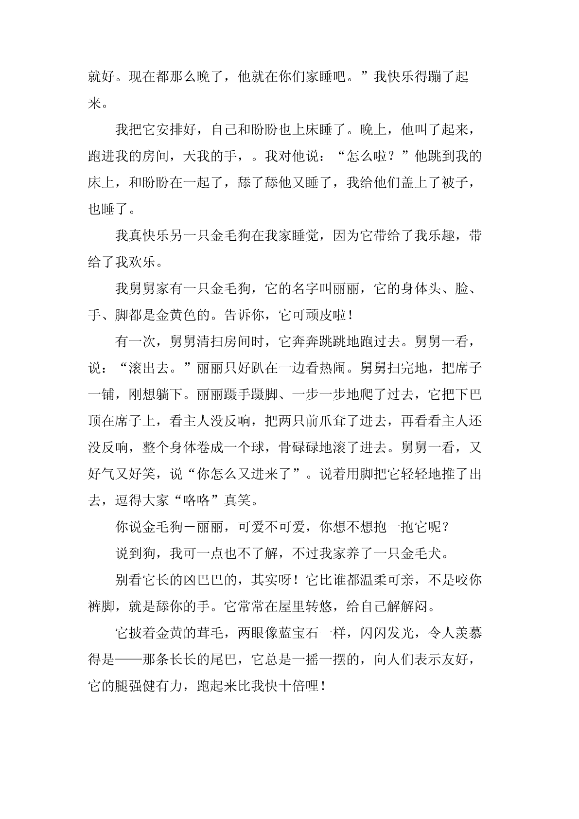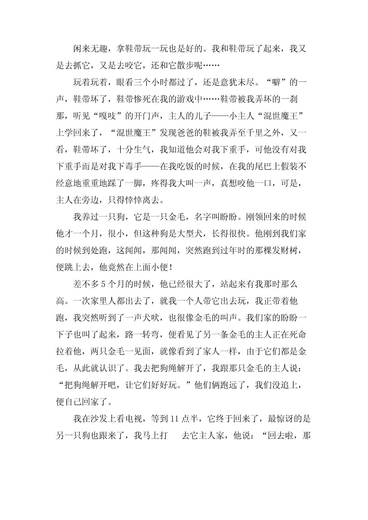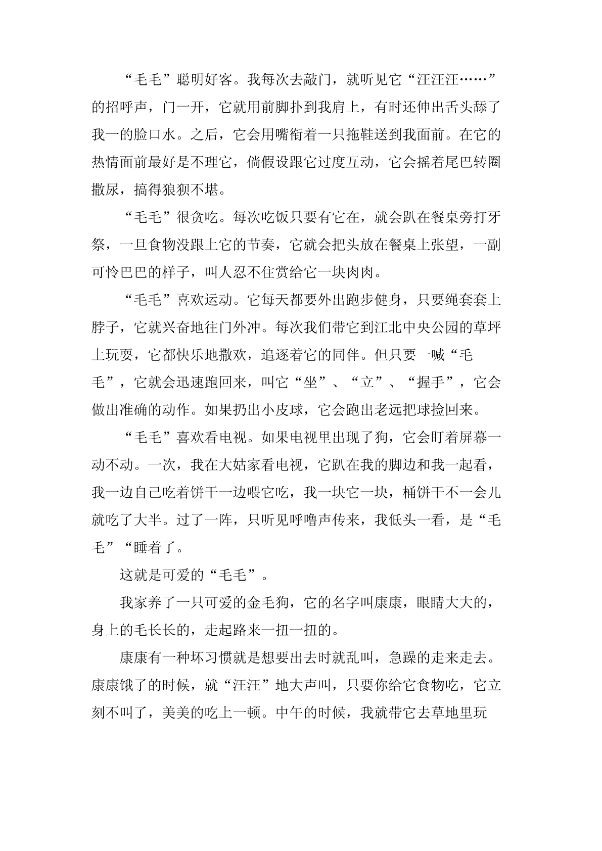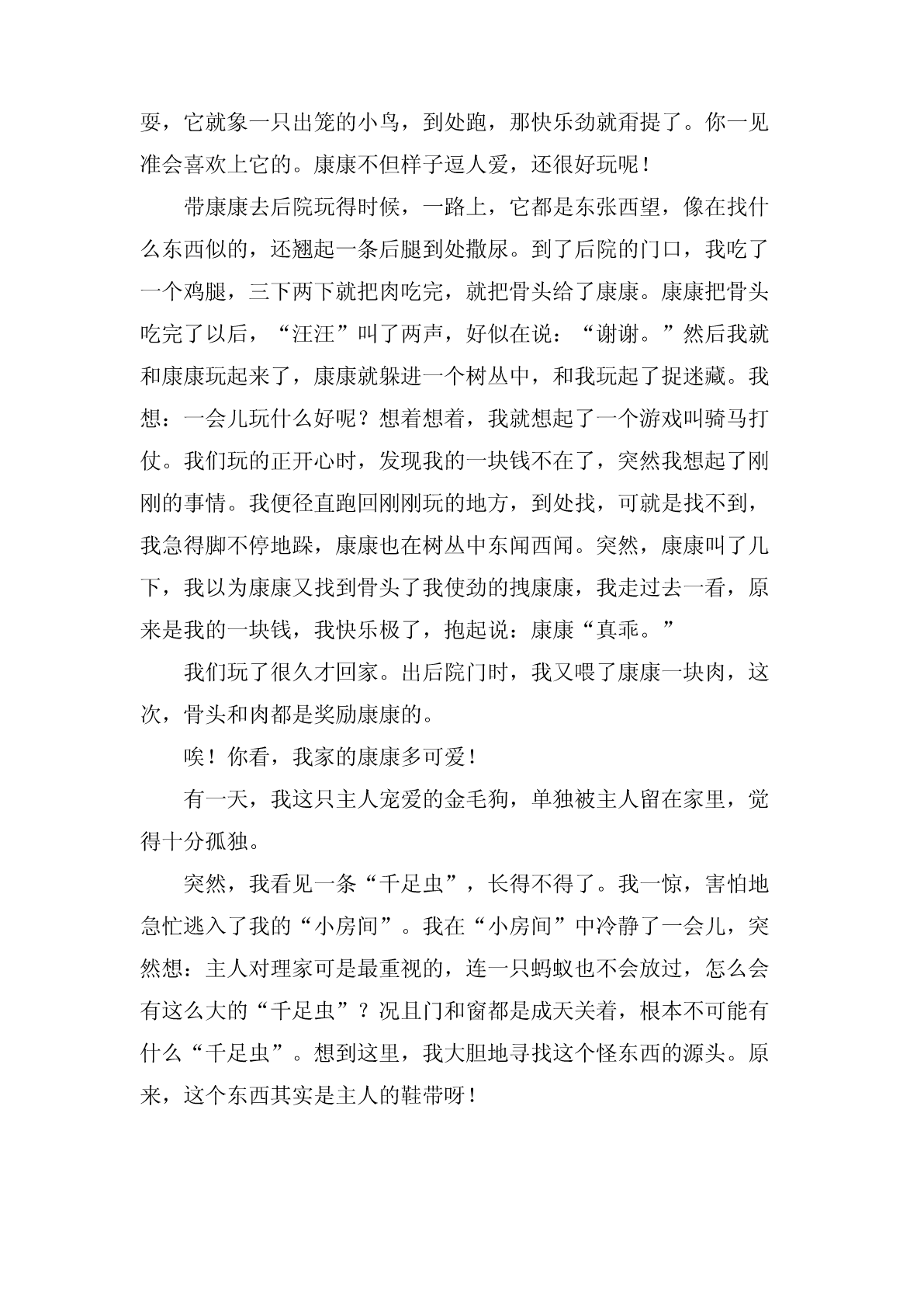 金毛犬作文范文8篇金毛犬作文范文8篇我家的这只金毛犬,可以称得上是狗中之王了。一双乌黑光亮的大眼晴充满灵性地、溜溜地乱转;一队警觉的耳朵直立在额头上;一身不算长的金黄光滑的毛,如绸缎般地一顺到底;一个巨大的身躯组合成了聪明美丽的猎犬—金毛犬。它的步态轻快、傲慢、挺拔、沉着不迫,就像一位高雅的绅士。这只狗很温顺,无论是主人还是陌生人怎么抚摸都行它,既不叫也不咬人,总是低侧着头静静地享受你的爱抚。尽管经过驯化,但有时它猎犬的本性尽显无疑。只要你手上拿有东西,它就会听你的指挥,静静地坐着,等待你的命令,这时你一抬手把东西扔出去,不管是多远,它总能把你丢出的东西完好无缺地捡回来。鞋子、飞碟、球是它的玩具,金毛特别爱玩球,只要你用中握有球它一定跟你抢,抢到球后它是不会轻易给你的,只有爸爸妈妈的命令它才会“松口”。它还会生气,有一次不知谁惹了它,它一天都不动,只是呆呆地坐着,就连给它吃东西它也把头转到另一边,像是在说:“讨厌你,大坏蛋!”直到第二天气才消。这就是我的爱犬—金毛。我大姑家养了条金毛犬,它的名字叫“毛毛”,我和它是好朋友。“毛毛”今年四岁了,是个“男孩”。它有一身金色的毛发,长得很健壮,肥硕的身体足有140斤。“毛毛”长着一双水汪汪的大眼睛,一个如黑宝石般的黑鼻子,一张不时留着口水吐着长舌头的大嘴,一对大耳朵耷拉在脑袋上,长长的尾巴摇来晃去,在家里习惯地踱着方步,就像一位穿着金色圣衣的守护神。“毛毛”聪明好客。我每次去敲门,就听见它“汪汪汪……”的招呼声,门一开,它就用前脚扑到我肩上,有时还伸出舌头舔了我一的脸口水。之后,它会用嘴衔着一只拖鞋送到我面前。在它的热情面前最好是不理它,倘假设跟它过度互动,它会摇着尾巴转圈撒尿,搞得狼狈不堪。“毛毛”很贪吃。每次吃饭只要有它在,就会趴在餐桌旁打牙祭,一旦食物没跟上它的节奏,它就会把头放在餐桌上张望,一副可怜巴巴的样子,叫人忍不住赏给它一块肉肉。“毛毛”喜欢运动。它每天都要外出跑步健身,只要绳套套上脖子,它就兴奋地往门外冲。每次我们带它到江北中央公园的草坪上玩耍,它都快乐地撒欢,追逐着它的同伴。但只要一喊“毛毛”,它就会迅速跑回来,叫它“坐”、“立”、“握手”,它会做出准确的动作。如果扔出小皮球,它会跑出老远把球捡回来。“毛毛”喜欢看电视。如果电视里出现了狗,它会盯着屏幕一动不动。一次,我在大姑家看电视,它趴在我的脚边和我一起看,我一边自己吃着饼干一边喂它吃,我一块它一块,桶饼干不一会儿就吃了大半。过了一阵,只听见呼噜声传来,我低头一看,是“毛毛”“睡着了。这就是可爱的“毛毛”。我家养了一只可爱的金毛狗,它的名字叫康康,眼睛大大的,身上的毛长长的,走起路来一扭一扭的。康康有一种坏习惯就是想要出去时就乱叫,急躁的走来走去。康康饿了的时候,就“汪汪”地大声叫,只要你给它食物吃,它立刻不叫了,美美的吃上一顿。中午的时候,我就带它去草地里玩耍,它就象一只出笼的小鸟,到处跑,那快乐劲就甭提了。你一见准会喜欢上它的。康康不但样子逗人爱,还很好玩呢!带康康去后院玩得时候,一路上,它都是东张西望,像在找什么东西似的,还翘起一条后腿到处撒尿。到了后院的门口,我吃了一个鸡腿,三下两下就把肉吃完,就把骨头给了康康。康康把骨头吃完了以后,“汪汪”叫了两声,好似在说:“谢谢。”然后我就和康康玩起来了,康康就躲进一个树丛中,和我玩起了捉迷藏。我想:一会儿玩什么好呢?想着想着,我就想起了一个游戏叫骑马打仗。我们玩的正开心时,发现我的一块钱不在了,突然我想起了刚刚的事情。我便径直跑回刚刚玩的地方,到处找,可就是找不到,我急得脚不停地跺,康康也在树丛中东闻西闻。突然,康康叫了几下,我以为康康又找到骨头了我使劲的拽康康,我走过去一看,原来是我的一块钱,我快乐极了,抱起说:康康“真乖。”我们玩了很久才回家。出后院门时,我又喂了康康一块肉,这次,骨头和肉都是奖励康康的。唉!你看,我家的康康多可爱!有一天,我这只主人宠爱的金毛狗,单独被主人留在家里,觉得十分孤独。突然,我看见一条“千足虫”,长得不得了。我一惊,害怕地急忙逃入了我的“小房间”。我在“小房间”中冷静了一会儿,突然想:主人对理家可是最重视的,连一只蚂蚁也不会放过,怎么会有这么大的“千足虫”?况且门和窗都是成天关着,根本不可能有什么“千足虫”。想到这里,我大胆地寻找这个怪东西的源头。原来,这个东西其实是主人的鞋带呀!闲来无趣,拿鞋带玩一玩也是好的。我和鞋带玩了起来,我又是去抓它,又是去咬它,还和它散步呢……玩着玩着,眼看三个小时都过了,还是意犹未尽。“噼”的一声,鞋带坏了,鞋带惨死在我的游戏中……鞋带被我弄坏的一刹那,听见“嘎吱”的开门声,主人的儿子——小主人“混世魔王”上学回来了,“混世魔王”发现爸爸的鞋被我弄至千里之外,又一看,鞋带坏了,十分生气,我知道他会对我下
