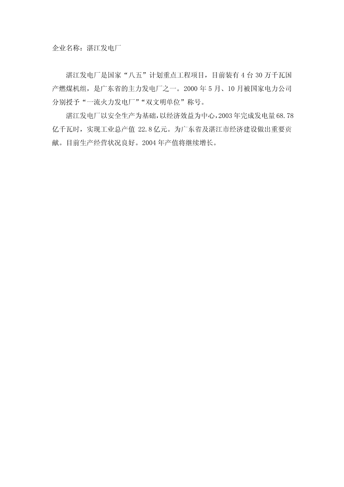 企业名称:湛江发电厂湛江发电厂是国家“八五”计划重点工程项目,目前装有4台30万千瓦国产燃煤机组,是广东省的主力发电厂之一。2000年5月、10月被国家电力公司分别授予“一流火力发电厂”“双文明单位”称号。湛江发电厂以安全生产为基础,以经济效益为中心,2003年完成发电量68.78亿千瓦时,实现工业总产值22.8亿元。为广东省及湛江市经济建设做出重要贡献。目前生产经营状况良好。2004年产值将继续增长。