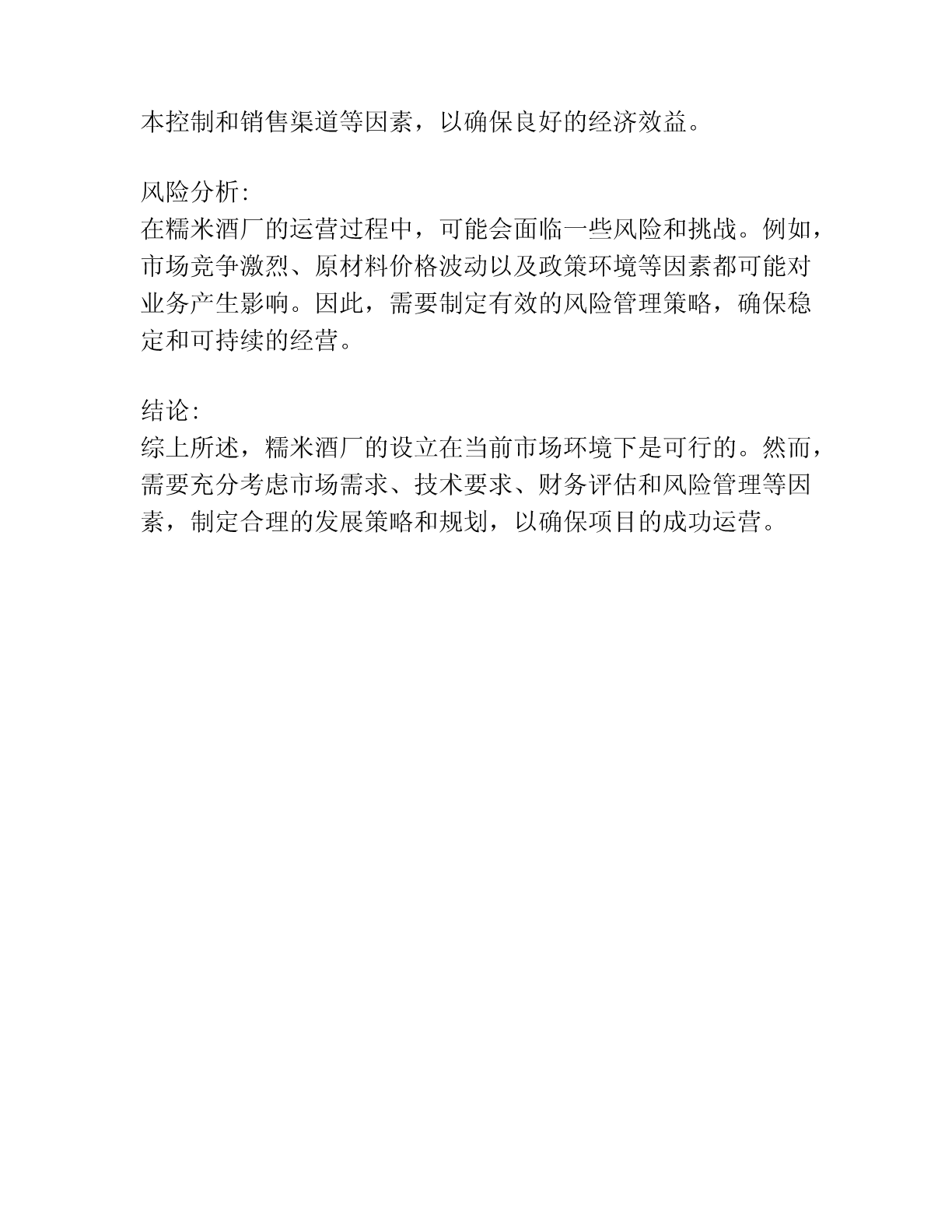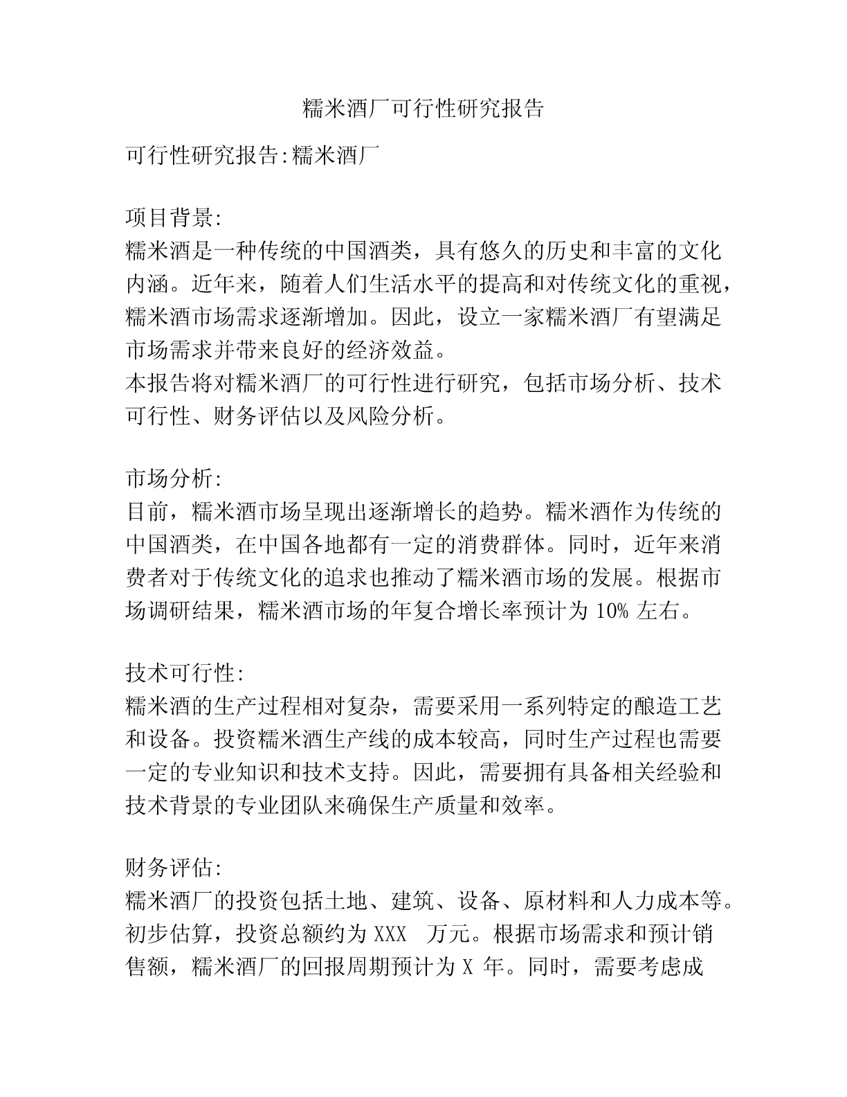 糯米酒厂可行性研究报告可行性研究报告:糯米酒厂项目背景:糯米酒是一种传统的中国酒类,具有悠久的历史和丰富的文化内涵。近年来,随着人们生活水平的提高和对传统文化的重视,糯米酒市场需求逐渐增加。因此,设立一家糯米酒厂有望满足市场需求并带来良好的经济效益。本报告将对糯米酒厂的可行性进行研究,包括市场分析、技术可行性、财务评估以及风险分析。市场分析:目前,糯米酒市场呈现出逐渐增长的趋势。糯米酒作为传统的中国酒类,在中国各地都有一定的消费群体。同时,近年来消费者对于传统文化的追求也推动了糯米酒市场的发展。根据市场调研结果,糯米酒市场的年复合增长率预计为10%左右。技术可行性:糯米酒的生产过程相对复杂,需要采用一系列特定的酿造工艺和设备。投资糯米酒生产线的成本较高,同时生产过程也需要一定的专业知识和技术支持。因此,需要拥有具备相关经验和技术背景的专业团队来确保生产质量和效率。财务评估:糯米酒厂的投资包括土地、建筑、设备、原材料和人力成本等。初步估算,投资总额约为XXX万元。根据市场需求和预计销售额,糯米酒厂的回报周期预计为X年。同时,需要考虑成本控制和销售渠道等因素,以确保良好的经济效益。风险分析:在糯米酒厂的运营过程中,可能会面临一些风险和挑战。例如,市场竞争激烈、原材料价格波动以及政策环境等因素都可能对业务产生影响。因此,需要制定有效的风险管理策略,确保稳定和可持续的经营。结论:综上所述,糯米酒厂的设立在当前市场环境下是可行的。然而,需要充分考虑市场需求、技术要求、财务评估和风险管理等因素,制定合理的发展策略和规划,以确保项目的成功运营。