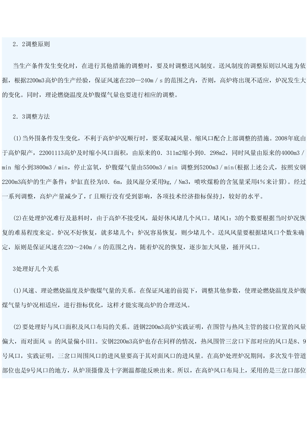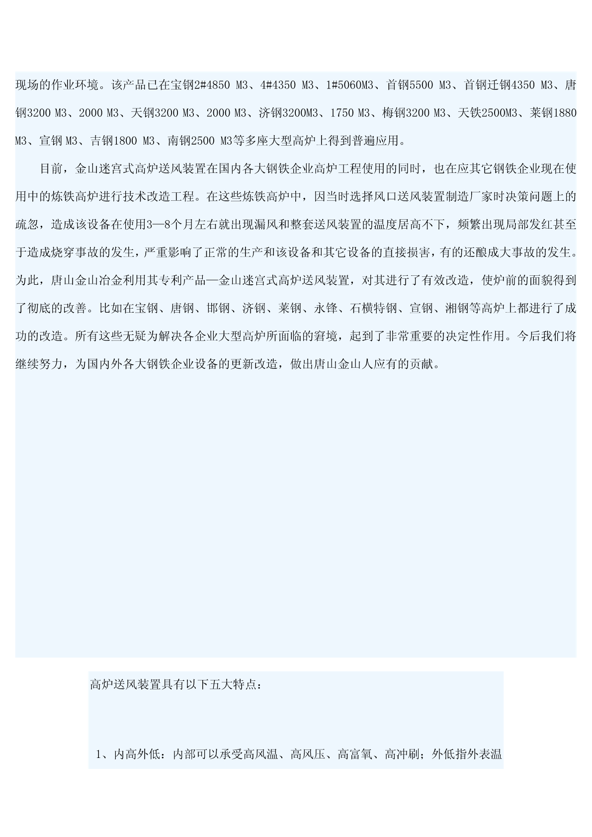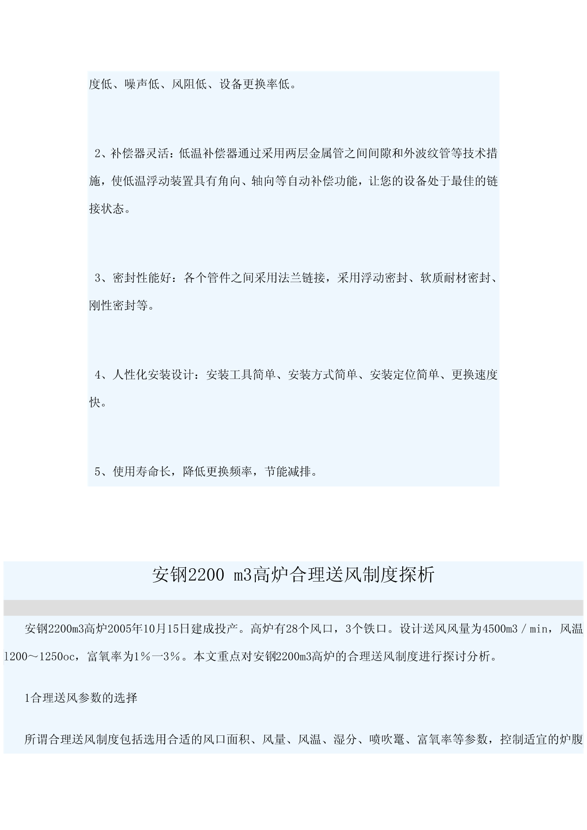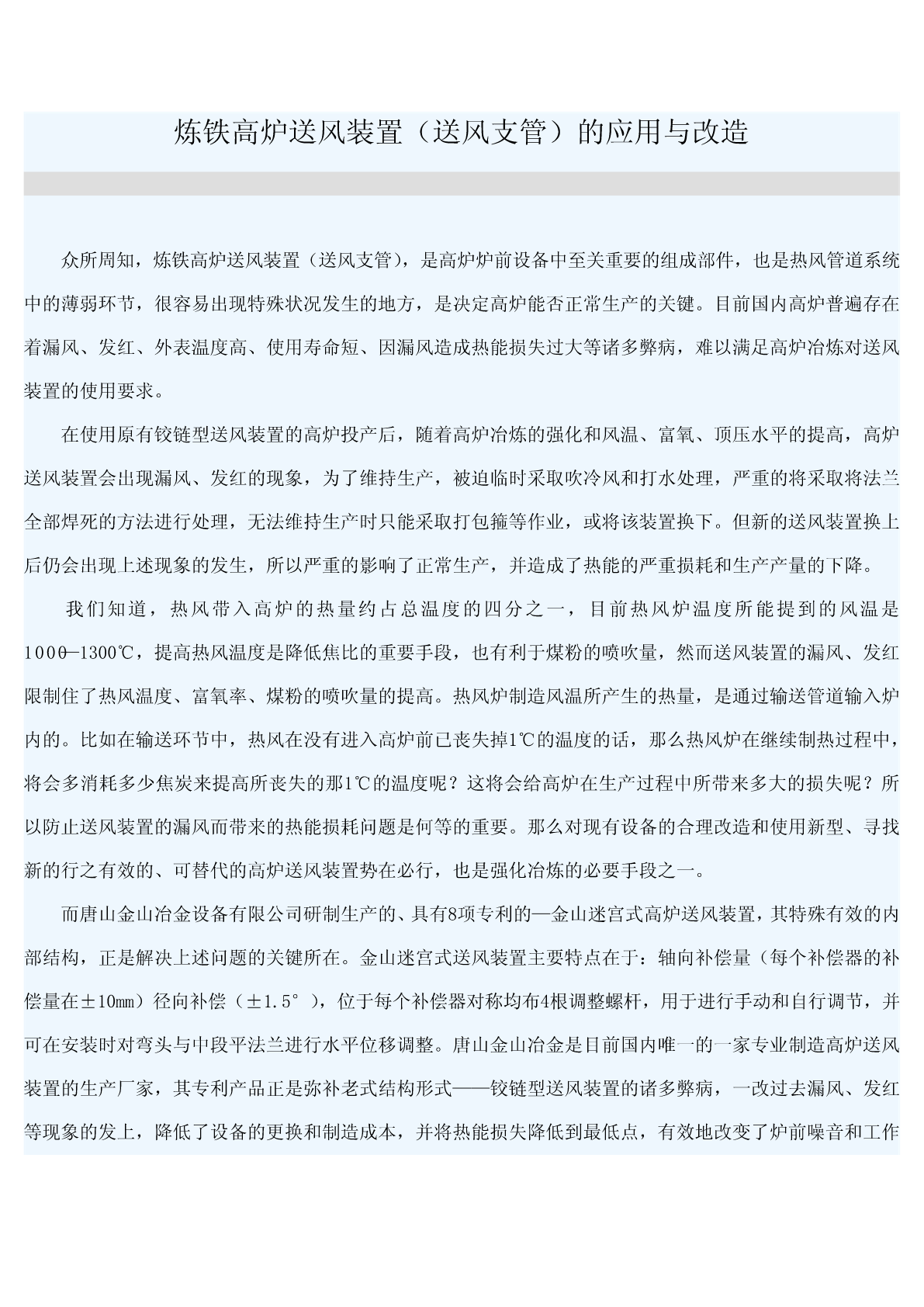 炼铁高炉送风装置(送风支管)的应用与改造众所周知,炼铁高炉送风装置(送风支管),是高炉炉前设备中至关重要的组成部件,也是热风管道系统中的薄弱环节,很容易出现特殊状况发生的地方,是决定高炉能否正常生产的关键。目前国内高炉普遍存在着漏风、发红、外表温度高、使用寿命短、因漏风造成热能损失过大等诸多弊病,难以满足高炉冶炼对送风装置的使用要求。在使用原有铰链型送风装置的高炉投产后,随着高炉冶炼的强化和风温、富氧、顶压水平的提高,高炉送风装置会出现漏风、发红的现象,为了维持生产,被迫临时采取吹冷风和打水处理,严重的将采取将法兰全部焊死的方法进行处理,无法维持生产时只能采取打包箍等作业,或将该装置换下。但新的送风装置换上后仍会出现上述现象的发生,所以严重的影响了正常生产,并造成了热能的严重损耗和生产产量的下降。我们知道,热风带入高炉的热量约占总温度的四分之一,目前热风炉温度所能提到的风温是1000—1300℃,提高热风温度是降低焦比的重要手段,也有利于煤粉的喷吹量,然而送风装置的漏风、发红限制住了热风温度、富氧率、煤粉的喷吹量的提高。热风炉制造风温所产生的热量,是通过输送管道输入炉内的。比如在输送环节中,热风在没有进入高炉前已丧失掉1℃的温度的话,那么热风炉在继续制热过程中,将会多消耗多少焦炭来提高所丧失的那1℃的温度呢?这将会给高炉在生产过程中所带来多大的损失呢?所以防止送风装置的漏风而带来的热能损耗问题是何等的重要。那么对现有设备的合理改造和使用新型、寻找新的行之有效的、可替代的高炉送风装置势在必行,也是强化冶炼的必要手段之一。而唐山金山冶金设备有限公司研制生产的、具有8项专利的—金山迷宫式高炉送风装置,其特殊有效的内部结构,正是解决上述问题的关键所在。金山迷宫式送风装置主要特点在于:轴向补偿量(每个补偿器的补偿量在±10mm)径向补偿(±1.5°),位于每个补偿器对称均布4根调整螺杆,用于进行手动和自行调节,并可在安装时对弯头与中段平法兰进行水平位移调整。唐山金山冶金是目前国内唯一的一家专业制造高炉送风装置的生产厂家,其专利产品正是弥补老式结构形式——铰链型送风装置的诸多弊病,一改过去漏风、发红等现象的发上,降低了设备的更换和制造成本,并将热能损失降低到最低点,有效地改变了炉前噪音和工作现场的作业环境。该产品已在宝钢2#4850M3、4#4350M3、1#5060M3、首钢5500M3、首钢迁钢4350M3、唐钢3200M3、2000M3、天钢3200M3、2000M3、济钢3200M3、1750M3、梅钢3200M3、天铁2500M3、莱钢1880M3、宣钢M3、吉钢1800M3、南钢2500M3等多座大型高炉上得到普遍应用。目前,金山迷宫式高炉送风装置在国内各大钢铁企业高炉工程使用的同时,也在应其它钢铁企业现在使用中的炼铁高炉进行技术改造工程。在这些炼铁高炉中,因当时选择风口送风装置制造厂家时决策问题上的疏忽,造成该设备在使用3—8个月左右就出现漏风和整套送风装置的温度居高不下,频繁出现局部发红甚至于造成烧穿事故的发生,严重影响了正常的生产和该设备和其它设备的直接损害,有的还酿成大事故的发生。为此,唐山金山冶金利用其专利产品—金山迷宫式高炉送风装置,对其进行了有效改造,使炉前的面貌得到了彻底的改善。比如在宝钢、唐钢、邯钢、济钢、莱钢、永锋、石横特钢、宣钢、湘钢等高炉上都进行了成功的改造。所有这些无疑为解决各企业大型高炉所面临的窘境,起到了非常重要的决定性作用。今后我们将继续努力,为国内外各大钢铁企业设备的更新改造,做出唐山金山人应有的贡献。高炉送风装置具有以下五大特点:1、内高外低:内部可以承受高风温、高风压、高富氧、高冲刷;外低指外表温度低、噪声低、风阻低、设备更换率低。2、补偿器灵活:低温补偿器通过采用两层金属管之间间隙和外波纹管等技术措施,使低温浮动装置具有角向、轴向等自动补偿功能,让您的设备处于最佳的链接状态。3、密封性能好:各个管件之间采用法兰链接,采用浮动密封、软质耐材密封、刚性密封等。4、人性化安装设计:安装工具简单、安装方式简单、安装定位简单、更换速度快。5、使用寿命长,降低更换频率,节能减排。安钢2200m3高炉合理送风制度探析安钢2200m3高炉2005年10月15日建成投产。高炉有28个风口,3个铁口。设计送风风量为4500m3/min,风温l200~1250oc,富氧率为1%一3%。本文重点对安钢2200m3高炉的合理送风制度进行探讨分析。1合理送风参数的选择所谓合理送风制度包括选用合适的风口面积、风量、风温、湿分、喷吹鼍、富氧率等参数,控制适宜的炉腹煤气量,并根据炉况变化对这些参数进行调节,以达到稳定炉况和改善煤气利用的目的。要根据外围牛产条件、冶炼条件以及操作水平,来选择适合本高炉的合理送风制度。(1)