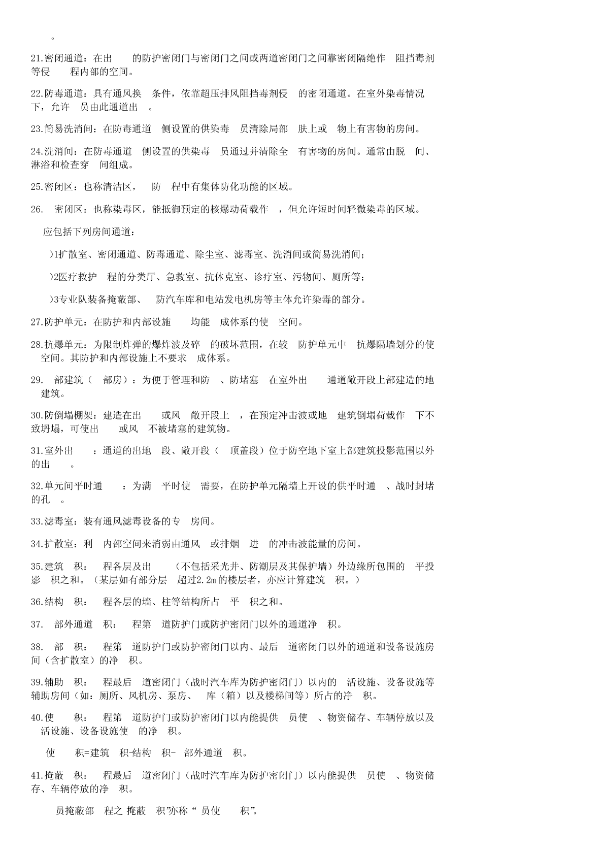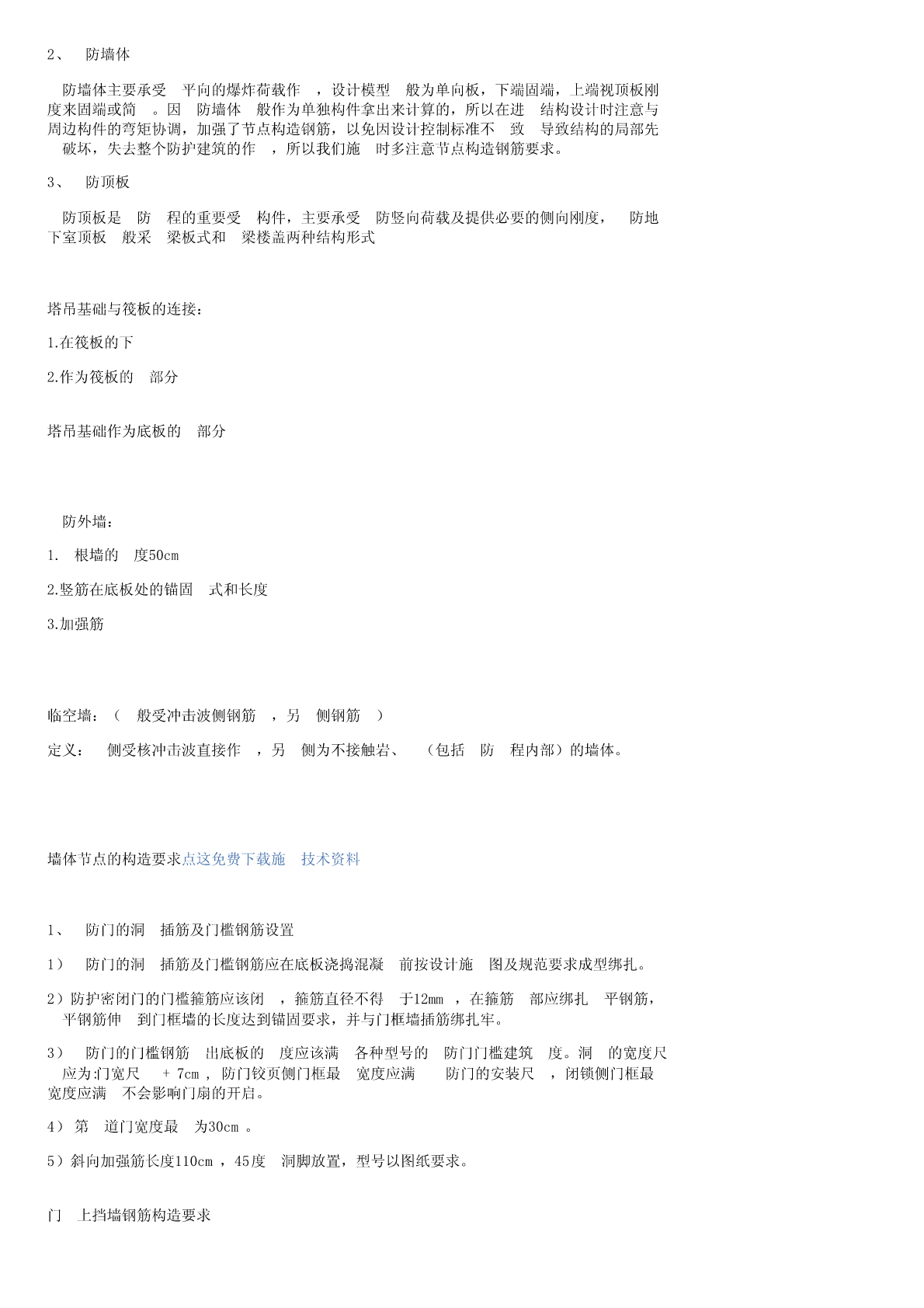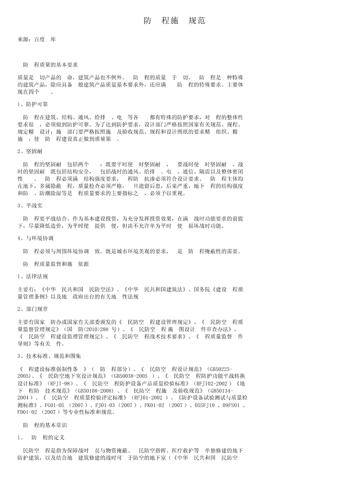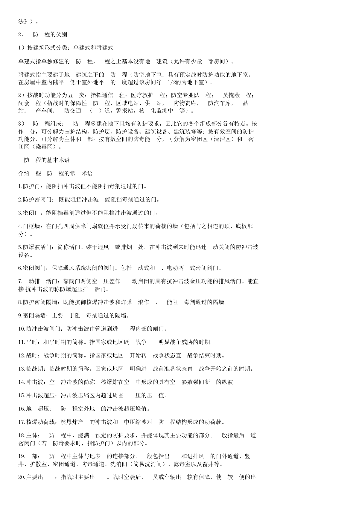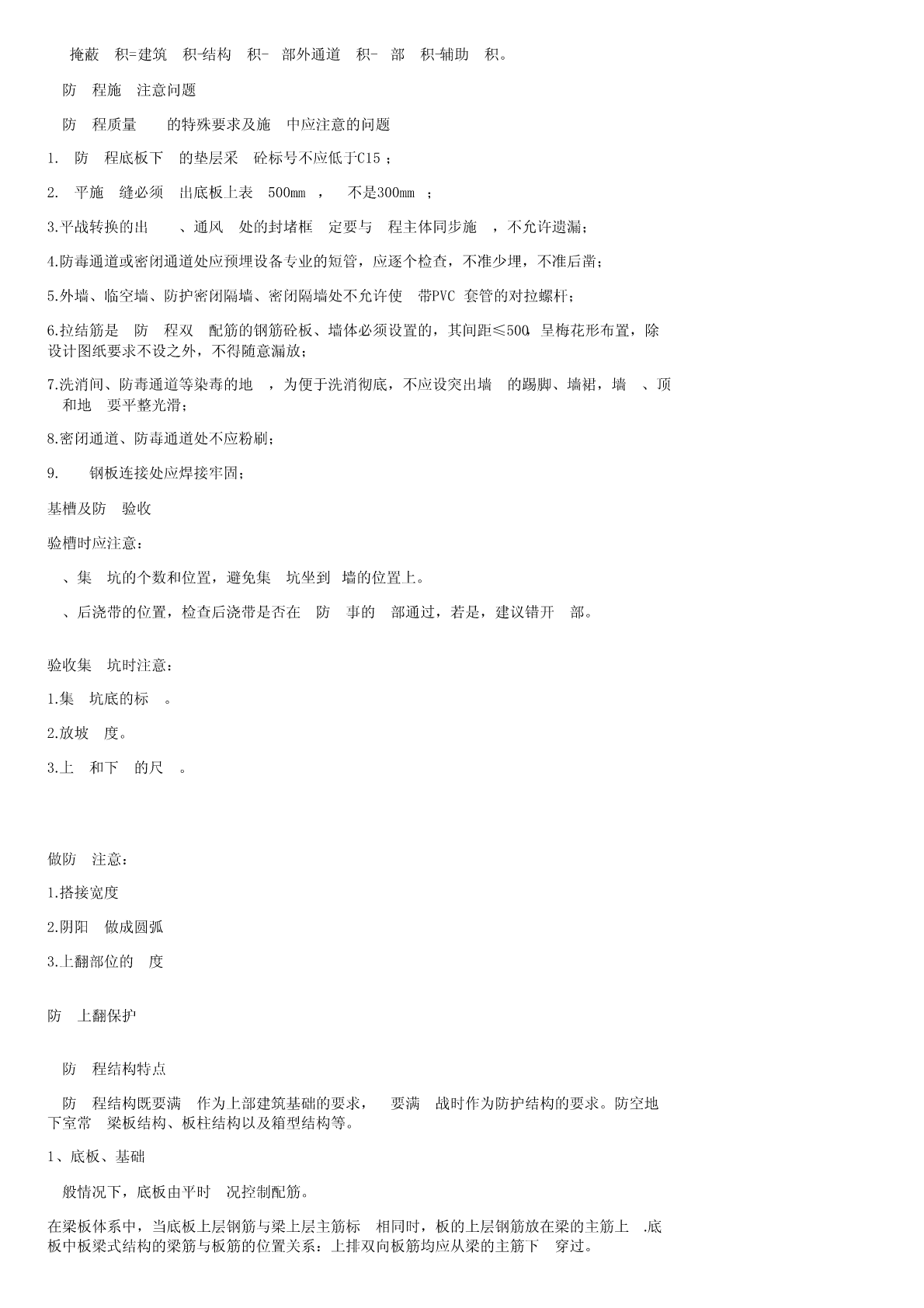 ⼈防⼯程施⼯规范来源:百度⽂库⼈防⼯程质量的基本要求质量是⼀切产品的⽣命,建筑产品也不例外。⼈防⼯程的质量⾼于⼀切。⼈防⼯程是⼀种特殊的建筑产品,除应具备⼀般建筑产品质量基本要求外,还应满⾜⼈防⼯程的特殊要求。主要体现在四个⽅⾯。1、防护可靠⼈防⼯程在建筑、结构、通风、给排⽔、电⽓等各⽅⾯都有特殊的防护要求,对⼯程的整体性要求很⾼,必须做到防护可靠。为了达到防护要求,设计部门严格按照国家有关规范、规程、规定精⼼设计;施⼯部门要严格按照施⼯及验收规范、规程和设计图纸的要求精⼼组织、精⼼施⼯,使⼈防⼯程建设真正做到质量第⼀。2、坚固耐⽤⼈防⼯程的坚固耐⽤包括两个⽅⾯:既要平时使⽤时坚固耐⽤,⼜要战时使⽤时坚固耐⽤。战时的坚固耐⽤既包括结构安全,⼜包括战时的通风、给排⽔、电⽓、通信、隔震以及整体密闭性⽅⾯。⼈防⼯程必须满⾜结构强度要求,⼯程防⽔抗渗必须符合设计要求。⼈防⼯程主体均在地下,多属隐蔽⼯程,质量检查必须严格,⼀旦遗留后患,后果严重,地下⼯程的结构强度和防⽔、防潮除湿等是⼯程质量要求的主要指标之⼀,必须予以重视。3、平战实⽤⼈防⼯程要平战结合。作为基本建设投资,为充分发挥投资效果,在满⾜战时功能要求的前提下,尽量降低造价,为平时使⽤提供⽅便,但决不允许单为平时⽅便⽽损坏战时功能。4、与环境协调⼈防⼯程必须与周围坏境协调⼀致。既是城市环境美观的要求,⼜是⼈防⼯程掩蔽性的需要。⼈防⼯程质量监督和施⼯依据1、法律法规主要有:《中华⼈民共和国⼈民防空法》、《中华⼈民共和国建筑法》、国务院《建设⼯程质量管理条例》以及地⽅政府出台的有关地⽅性法规2、部门规章主要有国家⼈防办或国家有关部委颁发的《⼈民防空⼯程建设管理规定》、《⼈民防空⼯程质量监督管理规定》(国⼈防<2010>288号)、《⼈民防空⼯程施⼯图设计⽂件审查办法》、《⼈民防空⼯程建设监理管理规定》、《⼈民防空⼯程战术技术要求》、《⼯程质量监督⼯作导则》等有关⽂件。3、技术标准、规范和图集《⼯程建设标准强制性条⽂》(⼈防⼯程部分)、《⼈民防空⼯程设计规范》(GB50225-2005)、《⼈民防空地下室设计规范》(GB50038-2005)、《⼈民防空⼯程防护功能平战转换设计标准》(RFJI-98)、《⼈民防空⼯程防护设备产品质量检验标准》(RFJI02-2002)《地下⼯程防⽔技术规范》(GB50108-2008)、《⼈民防空⼯程施⼯及验收规范》(GB50134-2004)、《⼈民防空⼯程质量检验评定标准》(RFJ01-2002)、《防护设备试验测试与质量检测标准》、FG01-05(2007)、FJ01-03(2007)、FK01-02(2007)、05SFJ10、09FS01、FD01-02(2007)等专业性标准和规范。⼈防⼯程的基本常识1、⼈防⼯程的定义⼈民防空⼯程是指为保障战时⼈员与物资掩蔽、⼈民防空指挥、医疗救护等⽽单独修建的地下防护建筑,以及结合地⾯建筑修建的战时可⽤于防空的地下室(《中华⼈民共和国⼈民防空法》)。2、⼈防⼯程的类别1)按建筑形式分类:单建式和附建式单建式指单独修建的⼈防⼯程,⼯程之上基本没有地⾯建筑(允许有少量⼝部房间)。附建式指主要建于地⾯建筑之下的⼈防⼯程(防空地下室:具有预定战时防护功能的地下室。在房屋中室内陆平⾯低于室外地平⾯的⾼度超过该房间净⾼1/2的为地下室)。2)按战时功能分为五⼤类:指挥通信⼯程;医疗救护⼯程;防空专业队⼯程;⼈员掩蔽⼯程;配套⼯程(指战时的保障性⼈防⼯程,区域电站、供⽔站,⼈防物资库,⼈防汽车库,⾷品站;⽣产车间;⼈防交通⼲(⽀)道,警报站,核⽣化监测中⼼等)。3)⼈防⼯程组成:⼈防⼯程多建在地下且均有防护要求,因此它的各个组成部分各有特点。按作⽤分,可分解为围护结构、防护层、防护设备、建筑设备、建筑装修等;按有效空间的防护功能分,可分解为主体和⼝部;按有效空间的防毒能⼒分,可分解为密闭区(清洁区)和⾮密闭区(染毒区)。⼈防⼯程的基本术语介绍⼀些⼈防⼯程的常⽤术语1.防护门:能阻挡冲击波但不能阻挡毒剂通过的门。2.防护密闭门:既能阻挡冲击波⼜能阻挡毒剂通过的门。3.密闭门:能阻挡毒剂通过但不能阻挡冲击波通过的门。4.门框墙:在门孔四周保障门扇就位并承受门扇传来的荷载的墙(包括与之相连的顶、底板部分)。5.防爆波活门:简称活门。装于通风⼝或排烟⼝处,在冲击波到来时能迅速⾃动关闭的防冲击波设备。6.密闭阀门:保障通风系统密闭的阀门。包括⼿动式和⼿、电动两⽤式密闭阀门。7.⾃动排⽓活门:靠阀门两侧空⽓压差作⽤⾃动启闭的具有抗冲击波余压功能的排风活门。能直接抗冲击波的称防爆超压排⽓活门。8.防护密闭隔墙:既能抗御核爆冲击波和炸弹⽓浪作⽤,⼜能阻⽌毒剂通过的隔墙。9.密闭隔墙:主要⽤于阻⽌毒剂通过的隔墙。10.防冲击波闸门:防