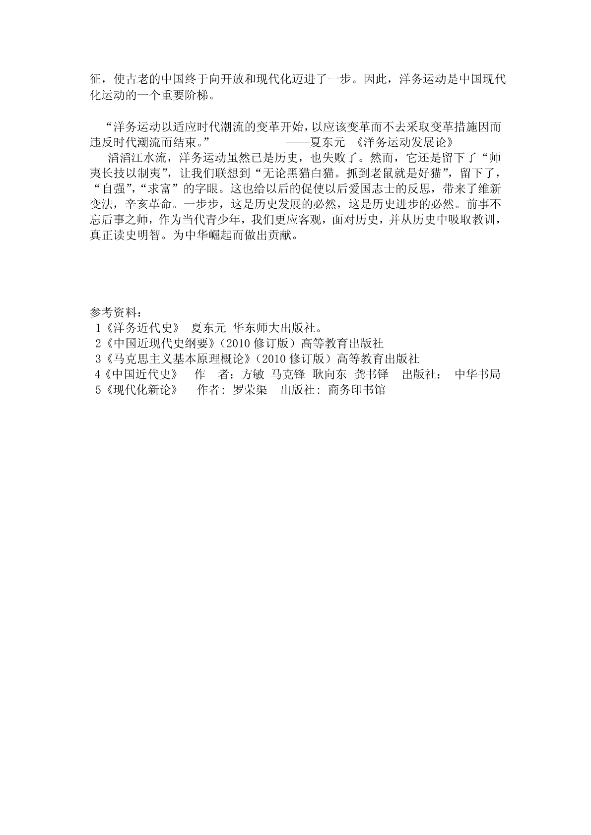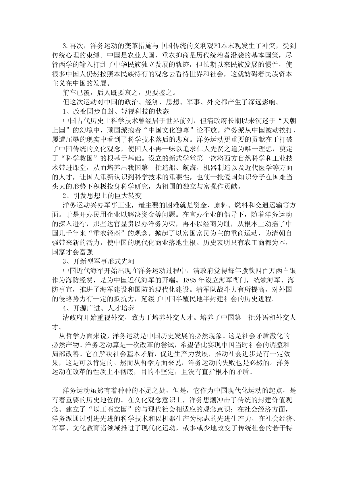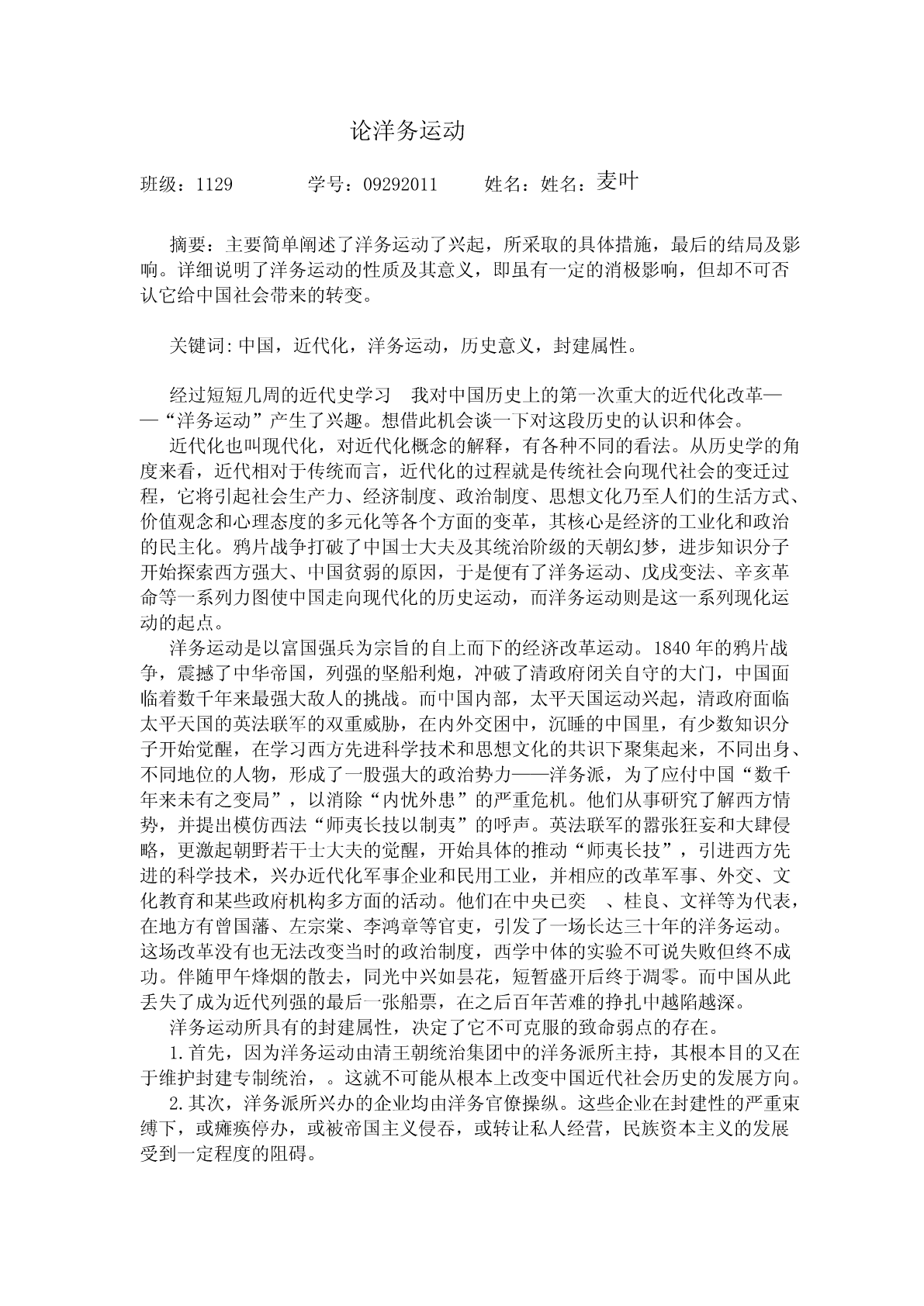 论洋务运动班级:1129学号:09292011姓名:姓名:麦叶摘要:主要简单阐述了洋务运动了兴起,所采取的具体措施,最后的结局及影响。详细说明了洋务运动的性质及其意义,即虽有一定的消极影响,但却不可否认它给中国社会带来的转变。关键词:中国,近代化,洋务运动,历史意义,封建属性。经过短短几周的近代史学习我对中国历史上的第一次重大的近代化改革——“洋务运动”产生了兴趣。想借此机会谈一下对这段历史的认识和体会。近代化也叫现代化,对近代化概念的解释,有各种不同的看法。从历史学的角度来看,近代相对于传统而言,近代化的过程就是传统社会向现代社会的变迁过程,它将引起社会生产力、经济制度、政治制度、思想文化乃至人们的生活方式、价值观念和心理态度的多元化等各个方面的变革,其核心是经济的工业化和政治的民主化。鸦片战争打破了中国士大夫及其统治阶级的天朝幻梦,进步知识分子开始探索西方强大、中国贫弱的原因,于是便有了洋务运动、戊戌变法、辛亥革命等一系列力图使中国走向现代化的历史运动,而洋务运动则是这一系列现化运动的起点。洋务运动是以富国强兵为宗旨的自上而下的经济改革运动。1840年的鸦片战争,震撼了中华帝国,列强的坚船利炮,冲破了清政府闭关自守的大门,中国面临着数千年来最强大敌人的挑战。而中国内部,太平天国运动兴起,清政府面临太平天国的英法联军的双重威胁,在内外交困中,沉睡的中国里,有少数知识分子开始觉醒,在学习西方先进科学技术和思想文化的共识下聚集起来,不同出身、不同地位的人物,形成了一股强大的政治势力——洋务派,为了应付中国“数千年来未有之变局”,以消除“内忧外患”的严重危机。他们从事研究了解西方情势,并提出模仿西法“师夷长技以制夷”的呼声。英法联军的嚣张狂妄和大肆侵略,更激起朝野若干士大夫的觉醒,开始具体的推动“师夷长技”,引进西方先进的科学技术,兴办近代化军事企业和民用工业,并相应的改革军事、外交、文化教育和某些政府机构多方面的活动。他们在中央已奕、桂良、文祥等为代表,在地方有曾国藩、左宗棠、李鸿章等官吏,引发了一场长达三十年的洋务运动。这场改革没有也无法改变当时的政治制度,西学中体的实验不可说失败但终不成功。伴随甲午烽烟的散去,同光中兴如昙花,短暂盛开后终于凋零。而中国从此丢失了成为近代列强的最后一张船票,在之后百年苦难的挣扎中越陷越深。洋务运动所具有的封建属性,决定了它不可克服的致命弱点的存在。1.首先,因为洋务运动由清王朝统治集团中的洋务派所主持,其根本目的又在于维护封建专制统治,。这就不可能从根本上改变中国近代社会历史的发展方向。2.其次,洋务派所兴办的企业均由洋务官僚操纵。这些企业在封建性的严重束缚下,或瘫痪停办,或被帝国主义侵吞,或转让私人经营,民族资本主义的发展受到一定程度的阻碍。3.再次,洋务运动的变革措施与中国传统的义利观和本末观发生了冲突,受到传统心理的束缚。中国是农业大国,重农抑商是历代统治者沿袭的基本国策,尽管西学的输入打乱了中华民族独立发展的轨迹,但长期以来民族发展的惯性,使很多中国人仍然按照本民族特有的观念去看待世界和社会,这就妨碍着民族资本主义在中国的发展。前车已覆,后人既要哀之,更要鉴之。但这次运动对中国的政治、经济、思想、军事、外交都产生了深远影响。1、改变固步自封、轻视科技的状态中国古代历史上科学技术曾经居于世界前列,但清政府长期以来沉迷于“天朝上国”的幻境中,顽固派抱着“中国文化独尊”论不放。洋务派从中国被动挨打、屡遭屈辱的现实中看到了科学技术落后的悲哀。洋务运动更重要的贡献在于打破了中国传统的文化观念,使国人不再一味以追求仁人先贤之道为唯一理想,奠定了“科学救国”的根基于基础。设立的新式学堂第一次将西方自然科学和工业技术带进课堂,从而培养出我国第一批造船、航海,机器制造以及近代医学等方面的人才,让国人重新认识到科学技术的重要性,也使一批爱国知识分子在国难当头大的形势下积极投身科学研究,为祖国的独立与富强作贡献。2、引发思想上的巨大转变洋务运动兴办军事工业,最主要的困难就是资金、原料、燃料和交通运输等方面。于是开办民用企业以解决资金等问题。在官办企业的倡导下,随着洋务运动的深入进行,那些达官显贵以办洋务为荣,再不以经商为耻,从根本上动摇了中国几千年来“重农轻商”的观念。掀起了以富国富民为主的重商运动,为清朝自强带来新的活力,使中国的现代化商业落地生根。历史表明只有农工商都为本,国家才会富强。3、开新型军事形式先河中国近代海军开始出现在洋务运动过程中,清政府觉得每年拨款四百万两白银作为海防经费,是为中国近代海军的开端。1885年设立海军衙门,统领海军、海防事宜,推进了海军建设和国防的现代化建设。清军队战斗力有所提高,对外国的侵略势力有一定的抵抗力,延缓了中国半殖民地半封建社会的历史进程。4、开源广进、人才