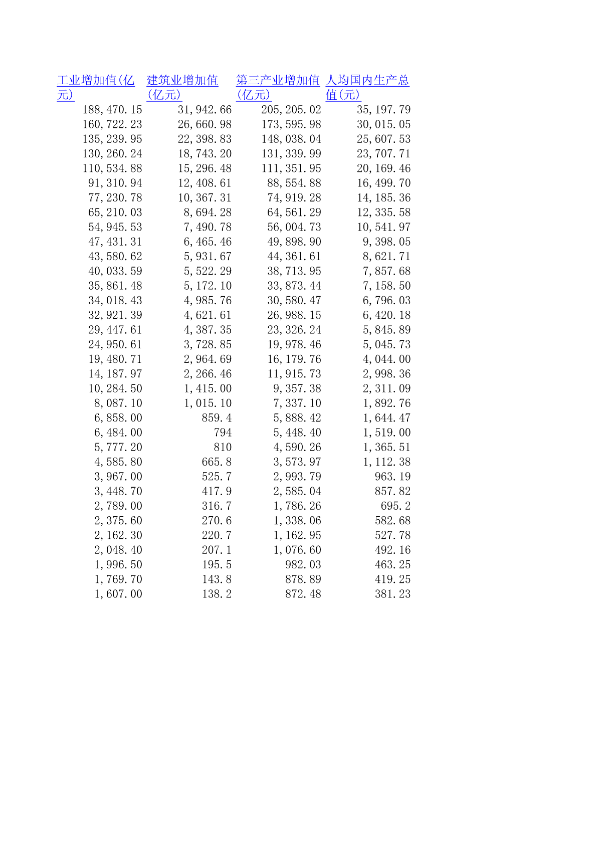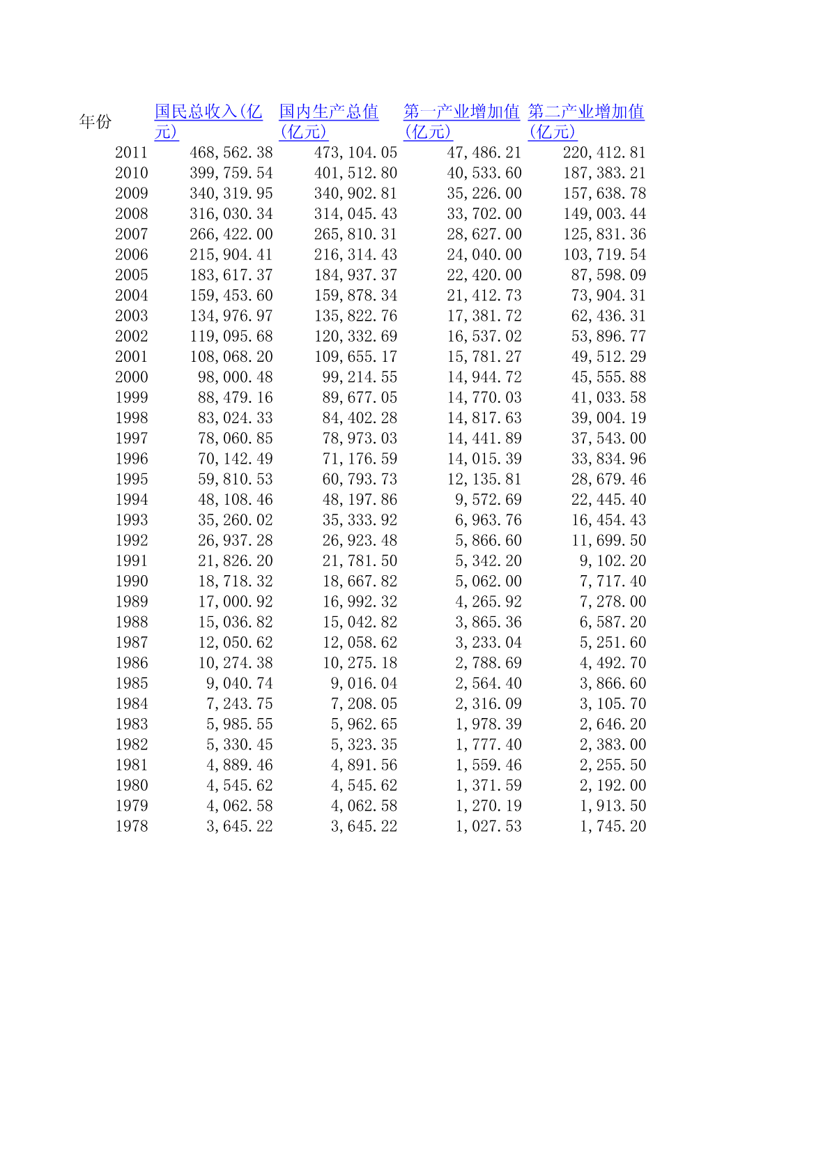 国民总收入(亿国内生产总值第一产业增加值第二产业增加值年份元)(亿元)(亿元)(亿元)2011468,562.38473,104.0547,486.21220,412.812010399,759.54401,512.8040,533.60187,383.212009340,319.95340,902.8135,226.00157,638.782008316,030.34314,045.4333,702.00149,003.442007266,422.00265,810.3128,627.00125,831.362006215,904.41216,314.4324,040.00103,719.542005183,617.37184,937.3722,420.0087,598.092004159,453.60159,878.3421,412.7373,904.312003134,976.97135,822.7617,381.7262,436.312002119,095.68120,332.6916,537.0253,896.772001108,068.20109,655.1715,781.2749,512.29200098,000.4899,214.5514,944.7245,555.88199988,479.1689,677.0514,770.0341,033.58199883,024.3384,402.2814,817.6339,004.19199778,060.8578,973.0314,441.8937,543.00199670,142.4971,176.5914,015.3933,834.96199559,810.5360,793.7312,135.8128,679.46199448,108.4648,197.869,572.6922,445.40199335,260.0235,333.926,963.7616,454.43199226,937.2826,923.485,866.6011,699.50199121,826.2021,781.505,342.209,102.20199018,718.3218,667.825,062.007,717.40198917,000.9216,992.324,265.927,278.00198815,036.8215,042.823,865.366,587.20198712,050.6212,058.623,233.045,251.60198610,274.3810,275.182,788.694,492.7019859,040.749,016.042,564.403,866.6019847,243.757,208.052,316.093,105.7019835,985.555,962.651,978.392,646.2019825,330.455,323.351,777.402,383.0019814,889.464,891.561,559.462,255.5019804,545.624,545.621,371.592,192.0019794,062.584,062.581,270.191,913.5019783,645.223,645.221,027.531,745.20工业增加值(亿建筑业增加值第三产业增加值人均国内生产总元)(亿元)(亿元)值(元)188,470.1531,942.66205,205.0235,197.79160,722.2326,660.98173,595.9830,015.05135,239.9522,398.83148,038.0425,607.53130,260.2418,743.20131,339.9923,707.71110,534.8815,296.48111,351.9520,169.4691,310.9412,408.6188,554.8816,499.7077,230.7810,367.3174,919.2814,185.3665,210.038,694.2864,561.2912,335.5854,945.537,490.7856,004.7310,541.9747,431.316,465.4649,898.909,398.0543,580.625,931.6744,361.618,621.7140,033.595,522.2938,713.957,857.6835,861.485,172.1033,873.447,158.5034,018.434,985.7630,580.476,796.0332,921.394,621.6126,988.156,420.1829,447.614,387.3523,326.245,845.8924,95