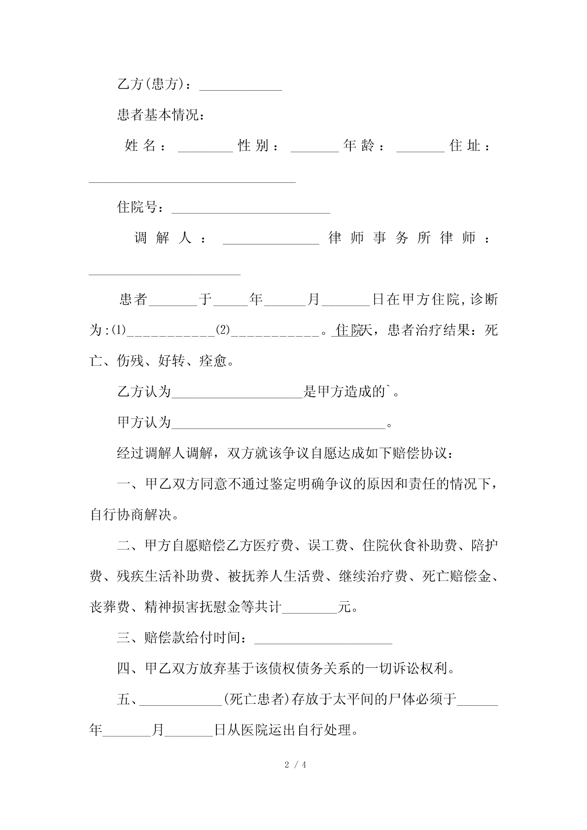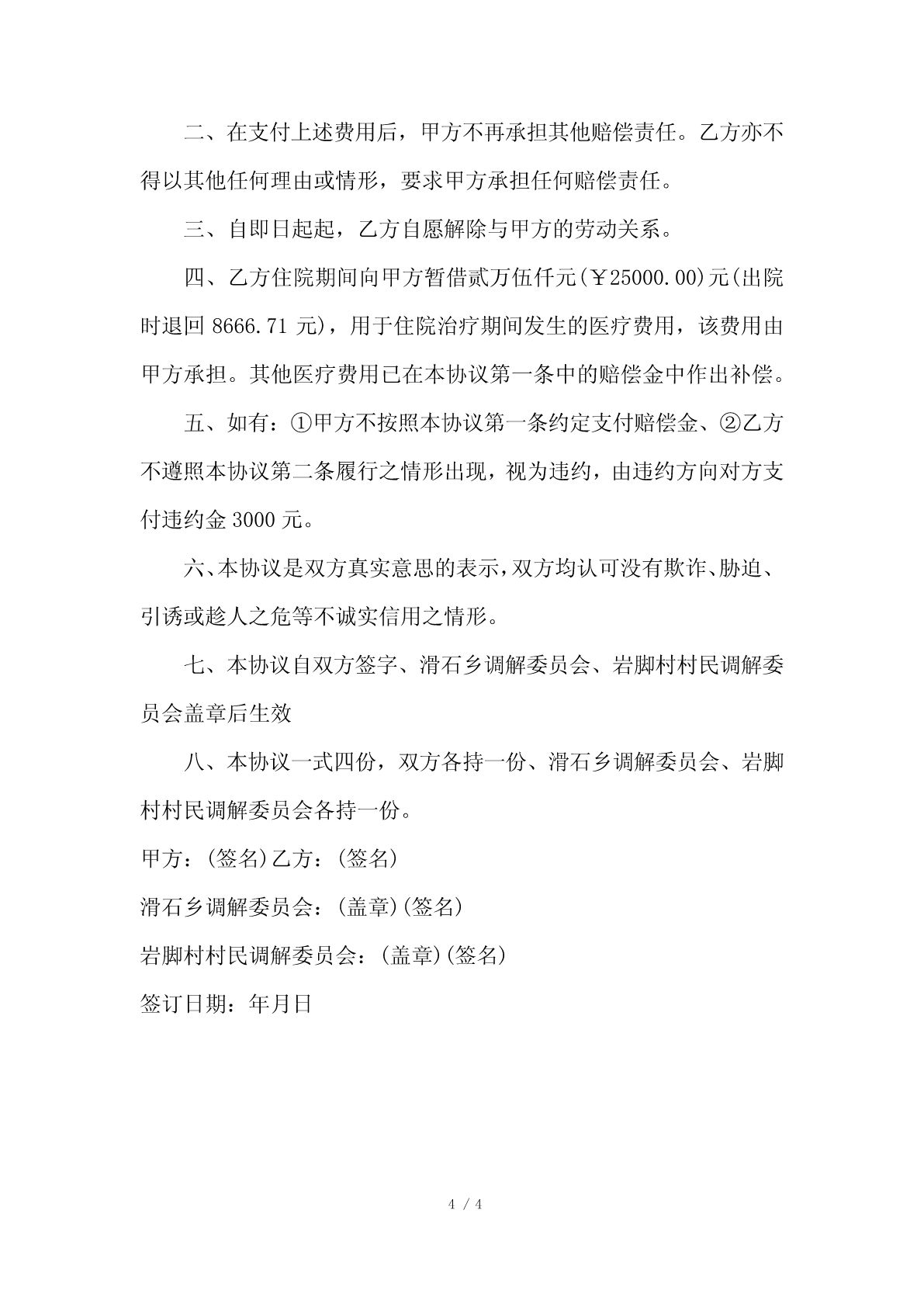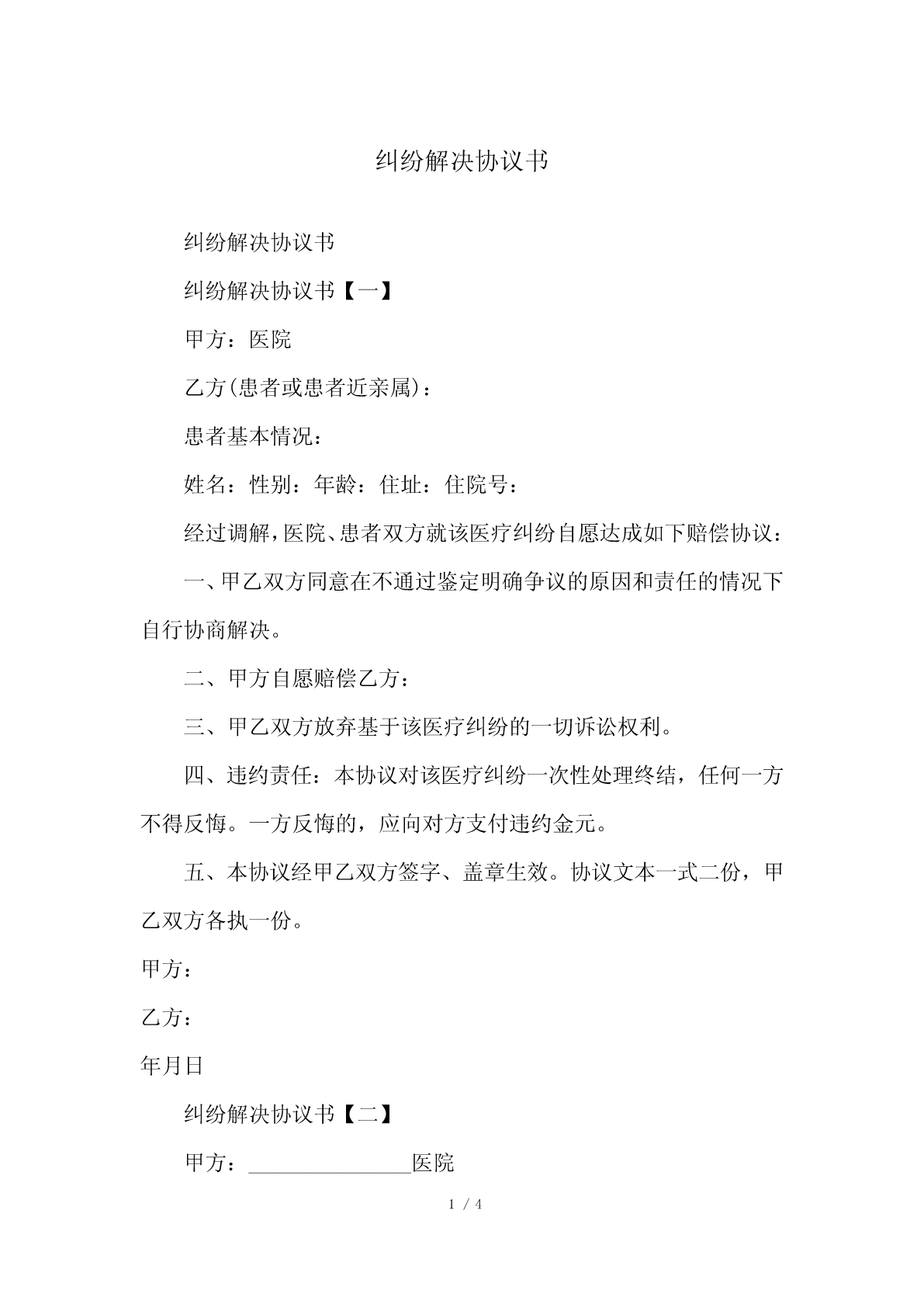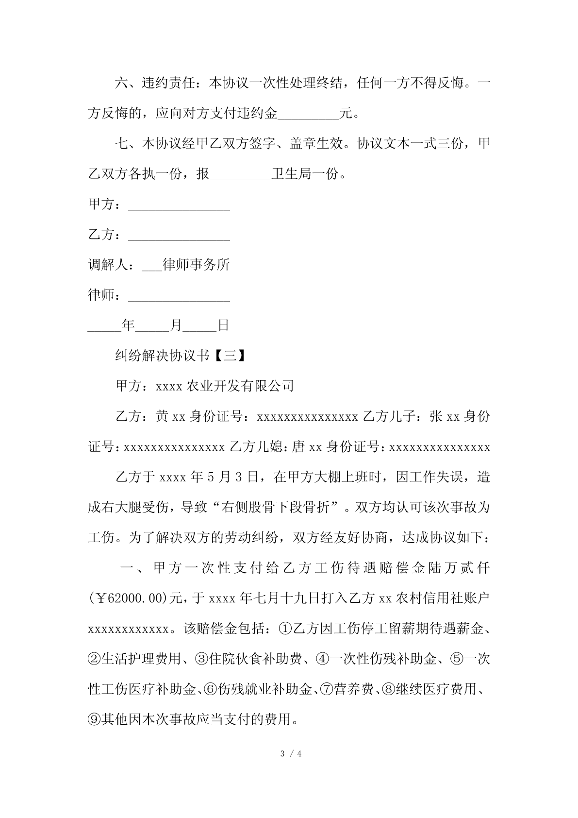 纠纷解决协议书纠纷解决协议书纠纷解决协议书【一】甲方:医院乙方(患者或患者近亲属):患者基本情况:姓名:性别:年龄:住址:住院号:经过调解,医院、患者双方就该医疗纠纷自愿达成如下赔偿协议:一、甲乙双方同意在不通过鉴定明确争议的原因和责任的情况下自行协商解决。二、甲方自愿赔偿乙方:三、甲乙双方放弃基于该医疗纠纷的一切诉讼权利。四、违约责任:本协议对该医疗纠纷一次性处理终结,任何一方不得反悔。一方反悔的,应向对方支付违约金元。五、本协议经甲乙双方签字、盖章生效。协议文本一式二份,甲乙双方各执一份。甲方:乙方:年月日纠纷解决协议书【二】甲方:_______________医院1/4乙方(患方):____________患者基本情况:姓名:________性别:_______年龄:_______住址:______________________________住院号:_______________________调解人:______________律师事务所律师:______________________患者_______于_____年______月_______日在甲方住院,诊断为:⑴___________⑵___________。住院____天,患者治疗结果:死亡、伤残、好转、痊愈。乙方认为___________________是甲方造成的`。甲方认为_______________________________。经过调解人调解,双方就该争议自愿达成如下赔偿协议:一、甲乙双方同意不通过鉴定明确争议的原因和责任的情况下,自行协商解决。二、甲方自愿赔偿乙方医疗费、误工费、住院伙食补助费、陪护费、残疾生活补助费、被抚养人生活费、继续治疗费、死亡赔偿金、丧葬费、精神损害抚慰金等共计________元。三、赔偿款给付时间:____________________四、甲乙双方放弃基于该债权债务关系的一切诉讼权利。五、____________(死亡患者)存放于太平间的尸体必须于______年_______月_______日从医院运出自行处理。2/4六、违约责任:本协议一次性处理终结,任何一方不得反悔。一方反悔的,应向对方支付违约金_________元。七、本协议经甲乙双方签字、盖章生效。协议文本一式三份,甲乙双方各执一份,报_________卫生局一份。甲方:_______________乙方:_______________调解人:___律师事务所律师:____________________年_____月_____日纠纷解决协议书【三】甲方:xxxx农业开发有限公司乙方:黄xx身份证号:xxxxxxxxxxxxxxx乙方儿子:张xx身份证号:xxxxxxxxxxxxxxx乙方儿媳:唐xx身份证号:xxxxxxxxxxxxxxx乙方于xxxx年5月3日,在甲方大棚上班时,因工作失误,造成右大腿受伤,导致“右侧股骨下段骨折”。双方均认可该次事故为工伤。为了解决双方的劳动纠纷,双方经友好协商,达成协议如下:一、甲方一次性支付给乙方工伤待遇赔偿金陆万贰仟(¥62000.00)元,于xxxx年七月十九日打入乙方xx农村信用社账户xxxxxxxxxxxx。该赔偿金包括:①乙方因工伤停工留薪期待遇薪金、②生活护理费用、③住院伙食补助费、④一次性伤残补助金、⑤一次性工伤医疗补助金、⑥伤残就业补助金、⑦营养费、⑧继续医疗费用、⑨其他因本次事故应当支付的费用。3/4二、在支付上述费用后,甲方不再承担其他赔偿责任。乙方亦不得以其他任何理由或情形,要求甲方承担任何赔偿责任。三、自即日起起,乙方自愿解除与甲方的劳动关系。四、乙方住院期间向甲方暂借贰万伍仟元(¥25000.00)元(出院时退回8666.71元),用于住院治疗期间发生的医疗费用,该费用由甲方承担。其他医疗费用已在本协议第一条中的赔偿金中作出补偿。五、如有:①甲方不按照本协议第一条约定支付赔偿金、②乙方不遵照本协议第二条履行之情形出现,视为违约,由违约方向对方支付违约金3000元。六、本协议是双方真实意思的表示,双方均认可没有欺诈、胁迫、引诱或趁人之危等不诚实信用之情形。七、本协议自双方签字、滑石乡调解委员会、岩脚村村民调解委员会盖章后生效八、本协议一式四份,双方各持一份、滑石乡调解委员会、岩脚村村民调解委员会各持一份。甲方:(签名)乙方:(签名)滑石乡调解委员会:(盖章)(签名)岩脚村村民调解委员会:(盖章)(签名)签订日期:年月日4/4