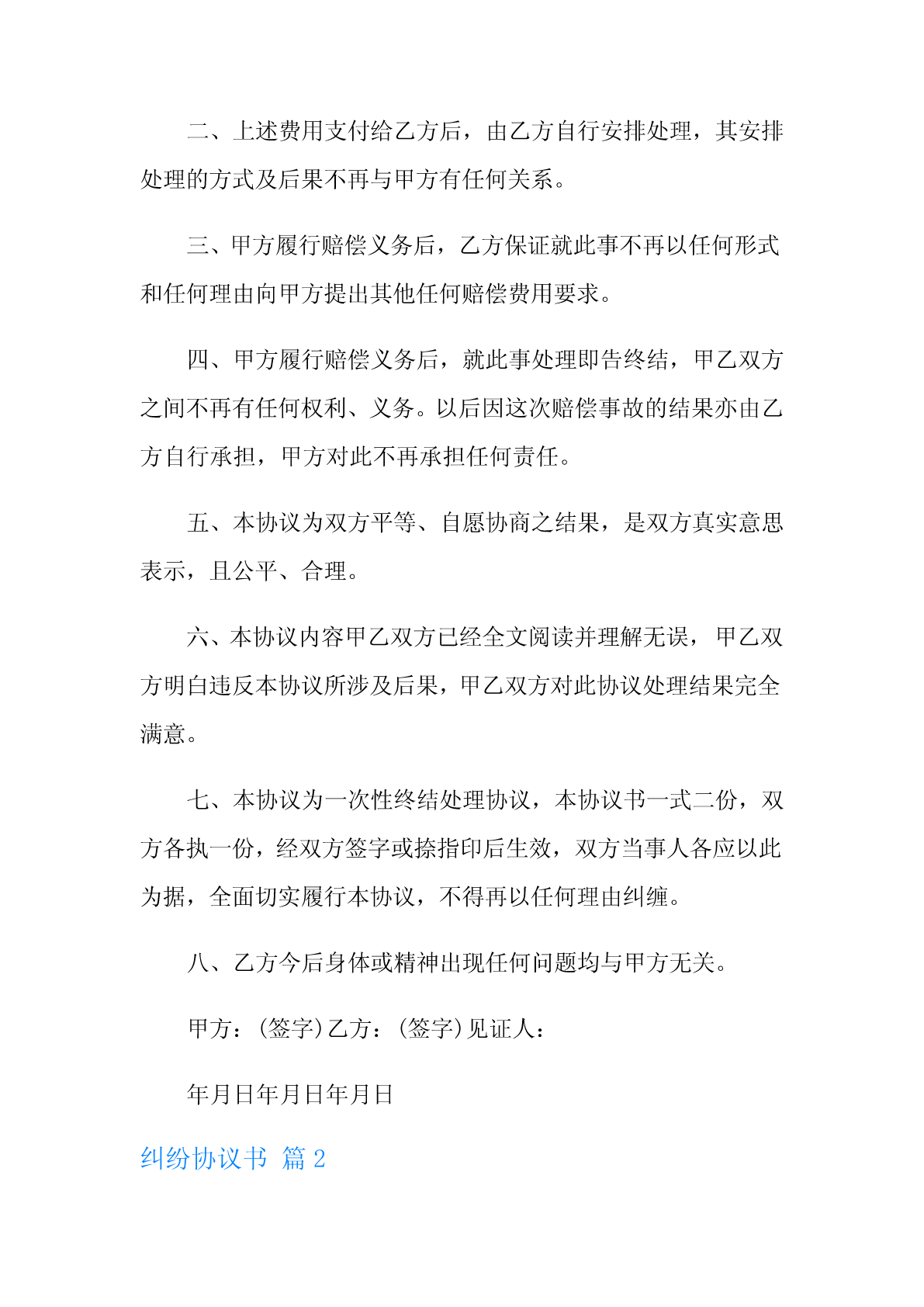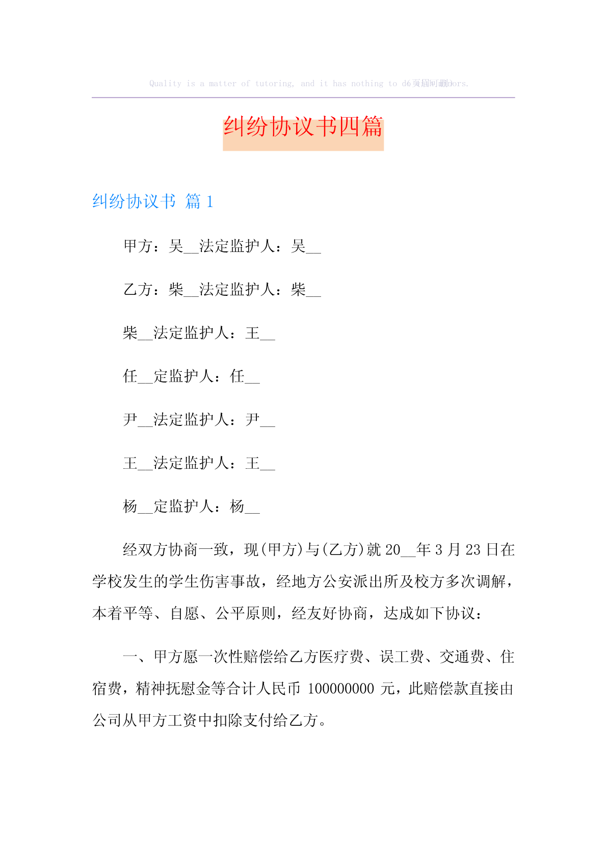 Qualityisamatteroftutoring,andithasnothingtodo(页眉可删)withminors.纠纷协议书四篇纠纷协议书篇1甲方:吴__法定监护人:吴__乙方:柴__法定监护人:柴__柴__法定监护人:王__任__定监护人:任__尹__法定监护人:尹__王__法定监护人:王__杨__定监护人:杨__经双方协商一致,现(甲方)与(乙方)就20__年3月23日在学校发生的学生伤害事故,经地方公安派出所及校方多次调解,本着平等、自愿、公平原则,经友好协商,达成如下协议:一、甲方愿一次性赔偿给乙方医疗费、误工费、交通费、住宿费,精神抚慰金等合计人民币100000000元,此赔偿款直接由公司从甲方工资中扣除支付给乙方。二、上述费用支付给乙方后,由乙方自行安排处理,其安排处理的方式及后果不再与甲方有任何关系。三、甲方履行赔偿义务后,乙方保证就此事不再以任何形式和任何理由向甲方提出其他任何赔偿费用要求。四、甲方履行赔偿义务后,就此事处理即告终结,甲乙双方之间不再有任何权利、义务。以后因这次赔偿事故的结果亦由乙方自行承担,甲方对此不再承担任何责任。五、本协议为双方平等、自愿协商之结果,是双方真实意思表示,且公平、合理。六、本协议内容甲乙双方已经全文阅读并理解无误,甲乙双方明白违反本协议所涉及后果,甲乙双方对此协议处理结果完全满意。七、本协议为一次性终结处理协议,本协议书一式二份,双方各执一份,经双方签字或捺指印后生效,双方当事人各应以此为据,全面切实履行本协议,不得再以任何理由纠缠。八、乙方今后身体或精神出现任何问题均与甲方无关。甲方:(签字)乙方:(签字)见证人:年月日年月日年月日纠纷协议书篇2