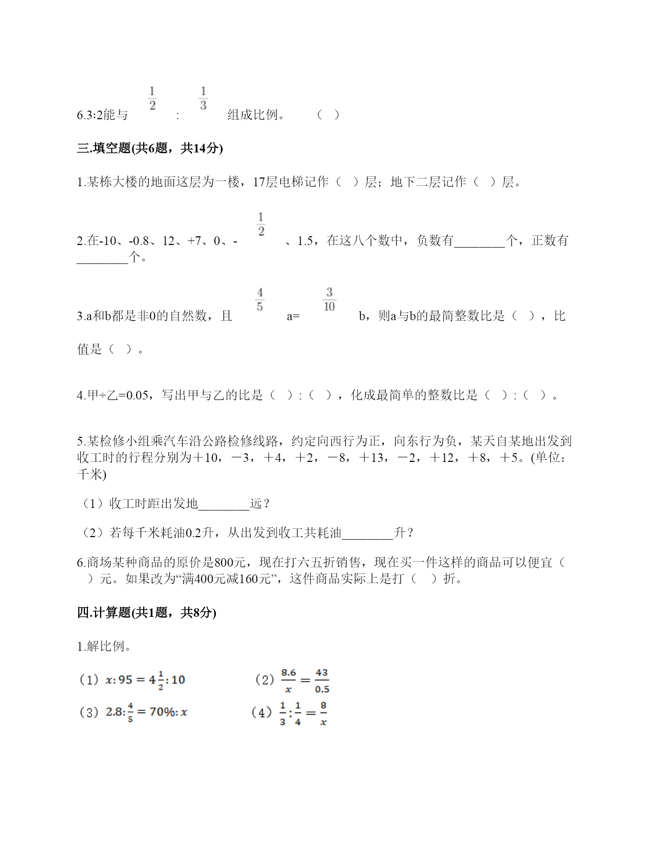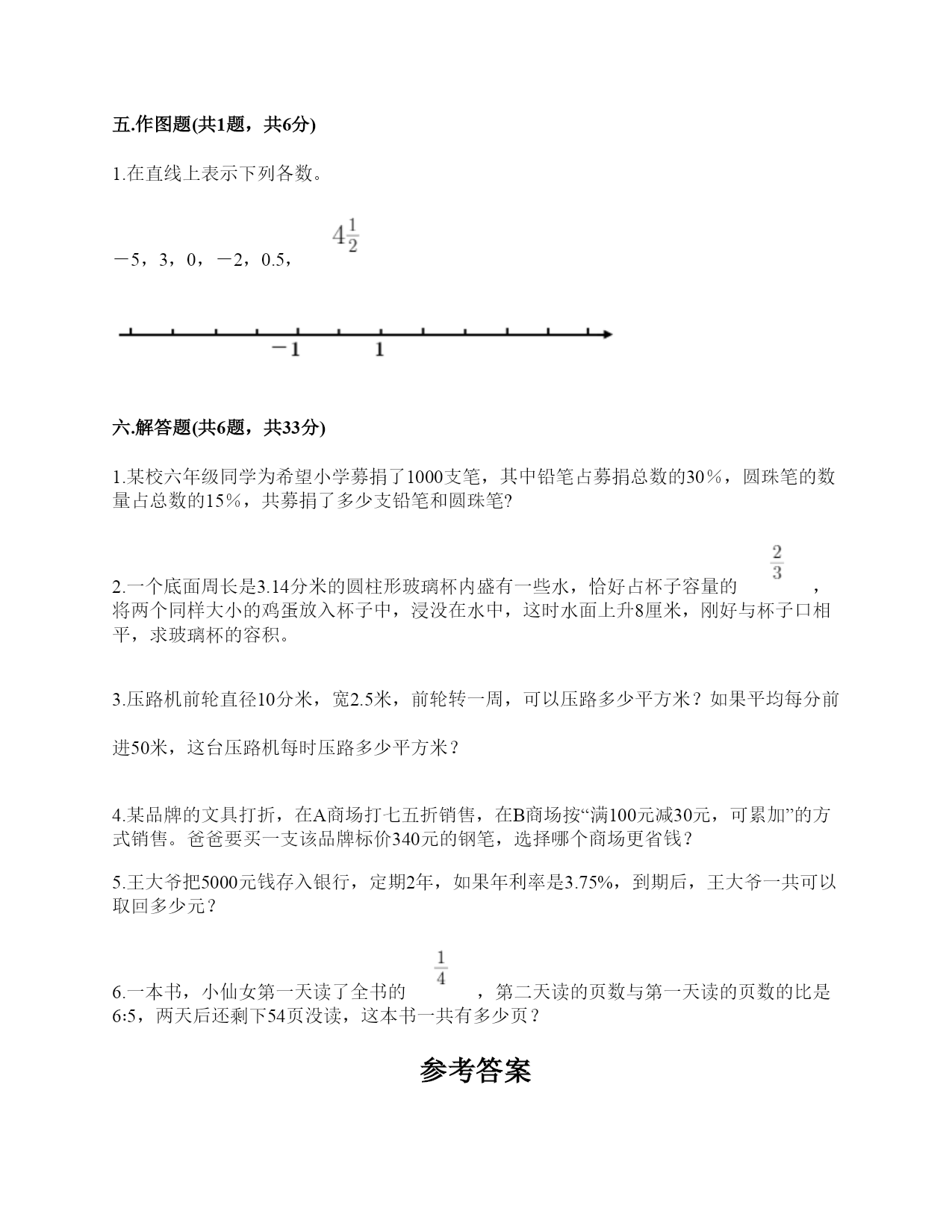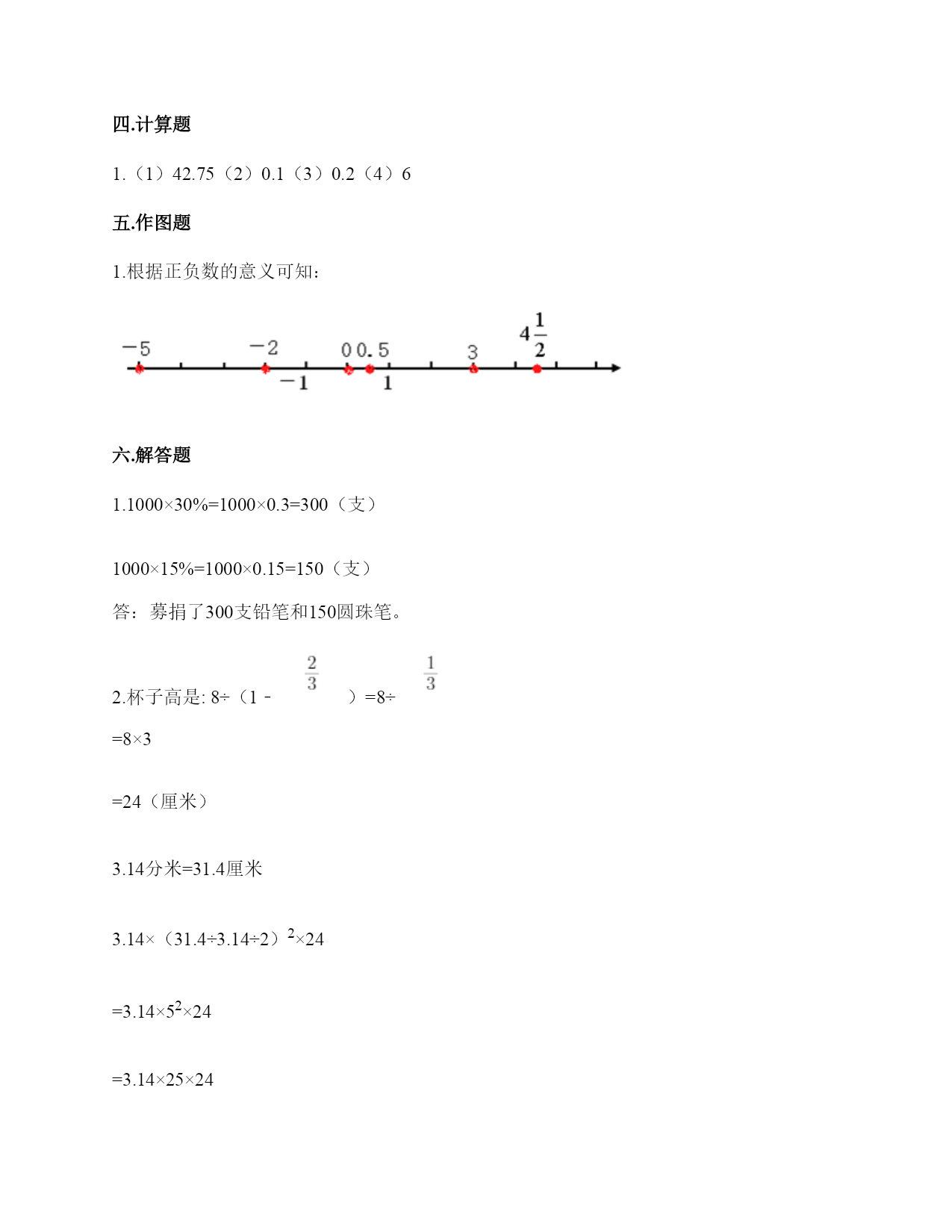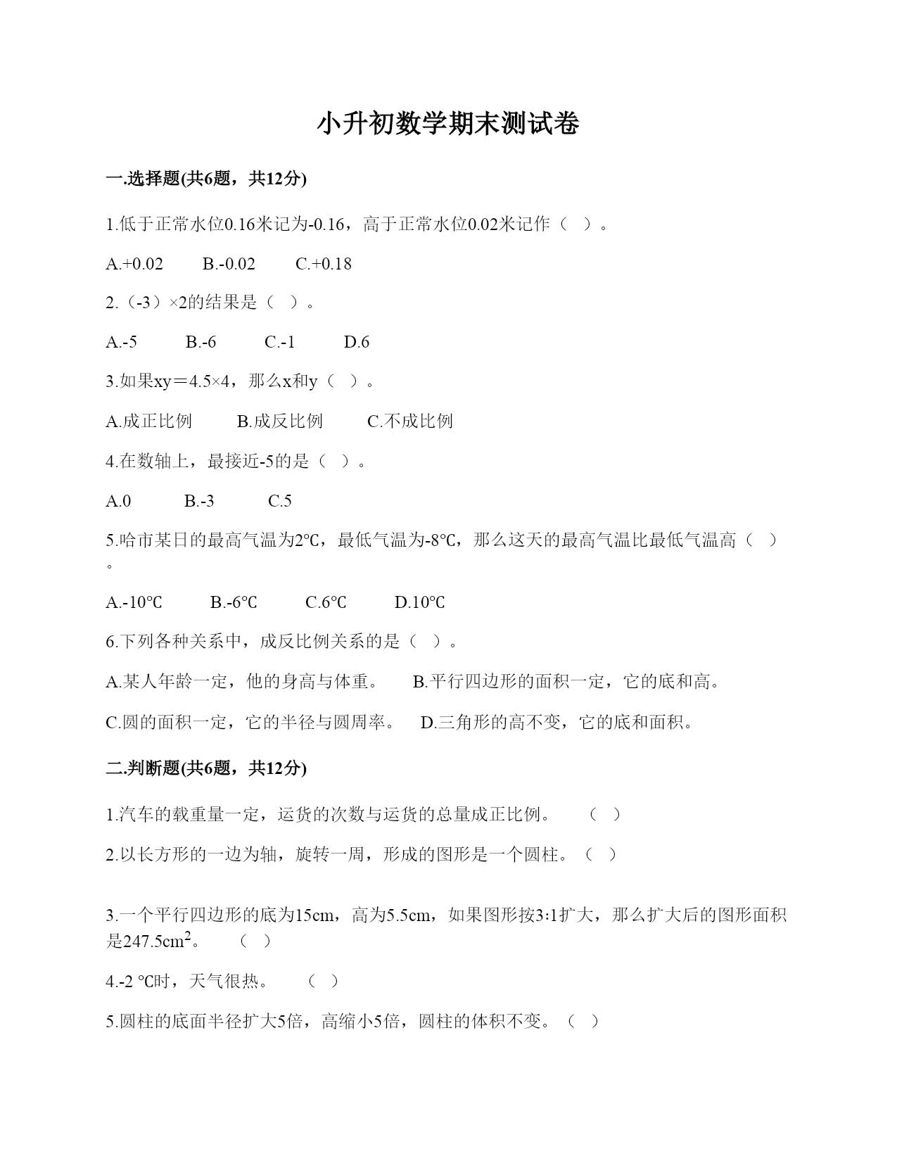 小升初数学期末测试卷一.选择题(共6题,共12分)1.低于正常水位0.16米记为-0.16,高于正常水位0.02米记作()。A.+0.02B.-0.02C.+0.182.(-3)×2的结果是()。A.-5B.-6C.-1D.63.如果xy=4.5×4,那么x和y()。A.成正比例B.成反比例C.不成比例4.在数轴上,最接近-5的是()。A.0B.-3C.55.哈市某日的最高气温为2℃,最低气温为-8℃,那么这天的最高气温比最低气温高()。A.-10℃B.-6℃C.6℃D.10℃6.下列各种关系中,成反比例关系的是()。A.某人年龄一定,他的身高与体重。B.平行四边形的面积一定,它的底和高。C.圆的面积一定,它的半径与圆周率。D.三角形的高不变,它的底和面积。二.判断题(共6题,共12分)1.汽车的载重量一定,运货的次数与运货的总量成正比例。()2.以长方形的一边为轴,旋转一周,形成的图形是一个圆柱。()3.一个平行四边形的底为15cm,高为5.5cm,如果图形按3∶1扩大,那么扩大后的图形面积是247.5cm2。()4.-2℃时,天气很热。()5.圆柱的底面半径扩大5倍,高缩小5倍,圆柱的体积不变。()6.3∶2能与:组成比例。()三.填空题(共6题,共14分)1.某栋大楼的地面这层为一楼,17层电梯记作()层;地下二层记作()层。2.在-10、-0.8、12、+7、0、-、1.5,在这八个数中,负数有________个,正数有________个。3.a和b都是非0的自然数,且a=b,则a与b的最简整数比是(),比值是()。4.甲÷乙=0.05,写出甲与乙的比是():(),化成最简单的整数比是():()。5.某检修小组乘汽车沿公路检修线路,约定向西行为正,向东行为负,某天自某地出发到收工时的行程分别为+10,-3,+4,+2,-8,+13,-2,+12,+8,+5。(单位:千米)(1)收工时距出发地________远?(2)若每千米耗油0.2升,从出发到收工共耗油________升?6.商场某种商品的原价是800元,现在打六五折销售,现在买一件这样的商品可以便宜()元。如果改为“满400元减160元”,这件商品实际上是打()折。四.计算题(共1题,共8分)1.解比例。五.作图题(共1题,共6分)1.在直线上表示下列各数。-5,3,0,-2,0.5,六.解答题(共6题,共33分)1.某校六年级同学为希望小学募捐了1000支笔,其中铅笔占募捐总数的30%,圆珠笔的数量占总数的15%,共募捐了多少支铅笔和圆珠笔?2.一个底面周长是3.14分米的圆柱形玻璃杯内盛有一些水,恰好占杯子容量的,将两个同样大小的鸡蛋放入杯子中,浸没在水中,这时水面上升8厘米,刚好与杯子口相平,求玻璃杯的容积。3.压路机前轮直径10分米,宽2.5米,前轮转一周,可以压路多少平方米?如果平均每分前进50米,这台压路机每时压路多少平方米?4.某品牌的文具打折,在A商场打七五折销售,在B商场按“满100元减30元,可累加”的方式销售。爸爸要买一支该品牌标价340元的钢笔,选择哪个商场更省钱?5.王大爷把5000元钱存入银行,定期2年,如果年利率是3.75%,到期后,王大爷一共可以取回多少元?6.一本书,小仙女第一天读了全书的,第二天读的页数与第一天读的页数的比是6∶5,两天后还剩下54页没读,这本书一共有多少页?参考答案一.选择题1.A2.B3.B4.B5.D6.B二.判断题1.√2.√3.×4.×5.×6.√三.填空题1.+17;-22.3;33.3:8;或0.3754.5;100;1;205.(1)41千米(2)13.46.280;六四.计算题1.(1)42.75(2)0.1(3)0.2(4)6五.作图题1.根据正负数的意义可知:六.解答题1.1000×30%=1000×0.3=300(支)1000×15%=1000×0.15=150(支)答:募捐了300支铅笔和150圆珠笔。2.杯子高是:8÷(1﹣)=8÷=8×3=24(厘米)3.14分米=31.4厘米3.14×(31.4÷3.14÷2)2×24=3.14×52×24=3.14×25×24=1884(立方厘米)答:玻璃杯子的容积是1884立方厘米。3.解:10分米=1米3.14×1×2.5=7.85(平方米)50×2.5×60=7500(平方米)答:前轮转一周,可压路7.85平方米,这台压路机每时压路7500平方米。4.解:在A商场买的实际花费:340×75%=255(元)在B商场买的实际花费:340-30×3=250(元)255元>250元答:在B商场买更省钱。5.解:5000×3.75%×2+5000=375+5000=5375(元)答:王大爷一共可以取回5375元。6.×=54÷(1--)=120(页)