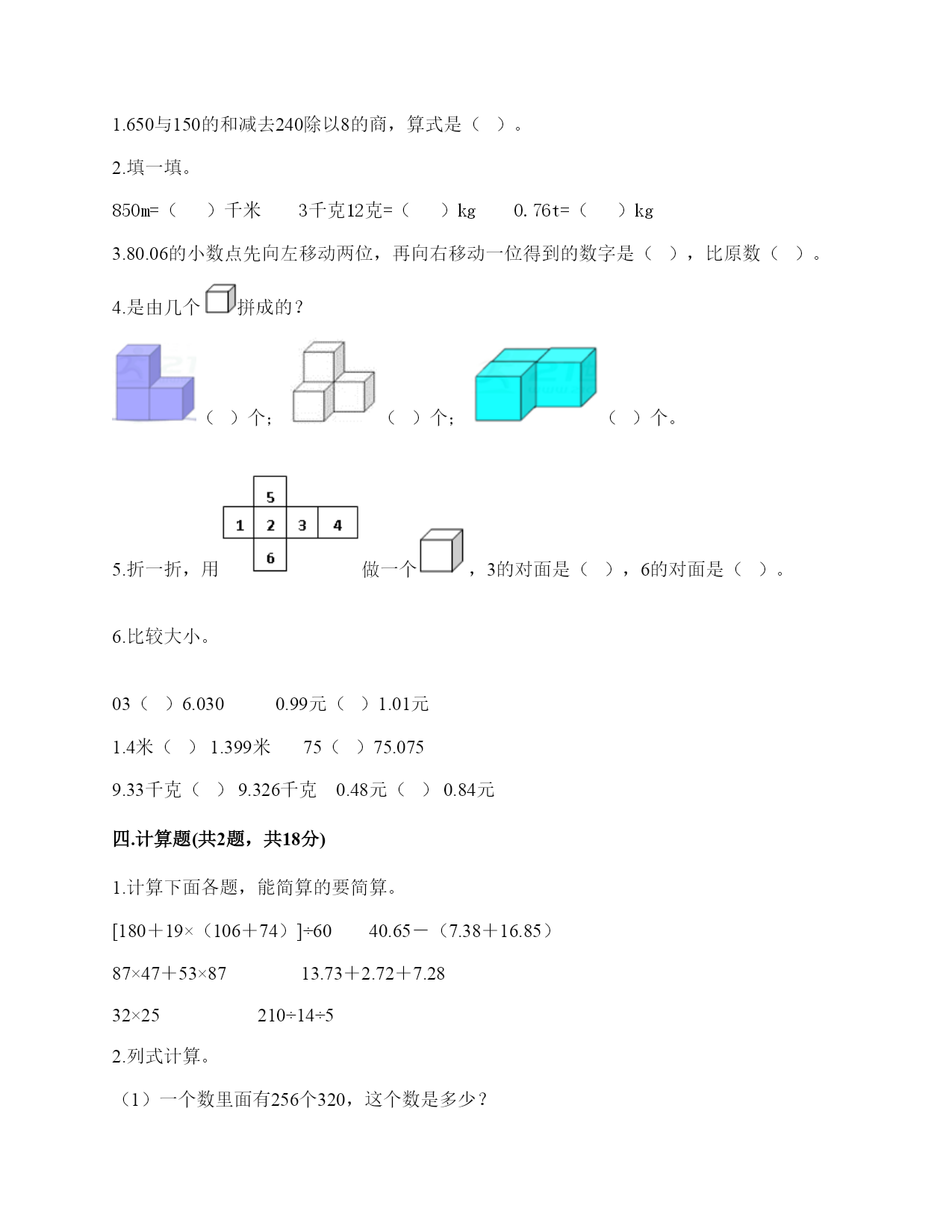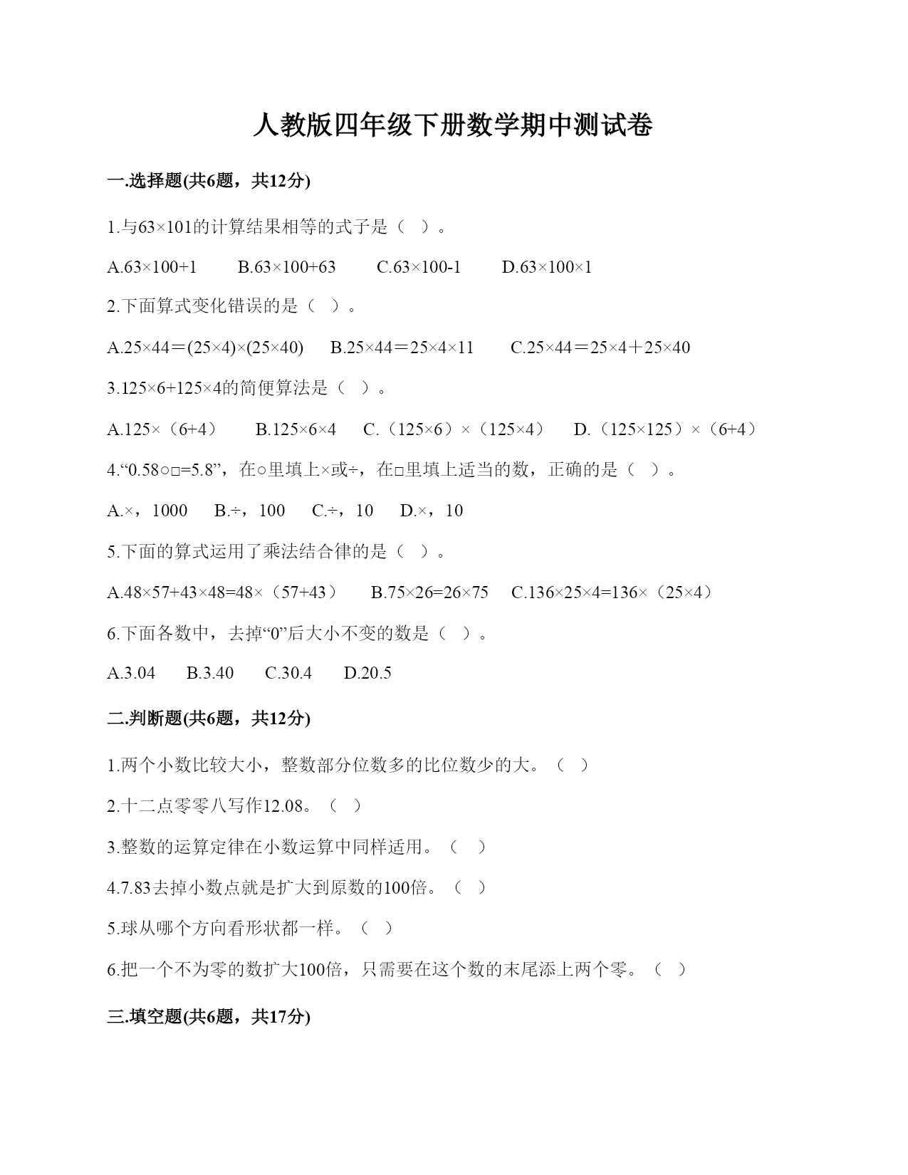 人教版四年级下册数学期中测试卷一.选择题(共6题,共12分)1.与63×101的计算结果相等的式子是()。A.63×100+1B.63×100+63C.63×100-1D.63×100×12.下面算式变化错误的是()。A.25×44=(25×4)×(25×40)B.25×44=25×4×11C.25×44=25×4+25×403.125×6+125×4的简便算法是()。A.125×(6+4)B.125×6×4C.(125×6)×(125×4)D.(125×125)×(6+4)4.“0.58○□=5.8”,在○里填上×或÷,在□里填上适当的数,正确的是()。A.×,1000B.÷,100C.÷,10D.×,105.下面的算式运用了乘法结合律的是()。A.48×57+43×48=48×(57+43)B.75×26=26×75C.136×25×4=136×(25×4)6.下面各数中,去掉“0”后大小不变的数是()。A.3.04B.3.40C.30.4D.20.5二.判断题(共6题,共12分)1.两个小数比较大小,整数部分位数多的比位数少的大。()2.十二点零零八写作12.08。()3.整数的运算定律在小数运算中同样适用。()4.7.83去掉小数点就是扩大到原数的100倍。()5.球从哪个方向看形状都一样。()6.把一个不为零的数扩大100倍,只需要在这个数的末尾添上两个零。()三.填空题(共6题,共17分)1.650与150的和减去240除以8的商,算式是()。2.填一填。850m=()千米3千克12克=()kg0.76t=()kg3.80.06的小数点先向左移动两位,再向右移动一位得到的数字是(),比原数()。4.是由几个拼成的?()个;()个;()个。5.折一折,用做一个,3的对面是(),6的对面是()。6.比较大小。03()6.0300.99元()1.01元1.4米()1.399米75()75.0759.33千克()9.326千克0.48元()0.84元四.计算题(共2题,共18分)1.计算下面各题,能简算的要简算。[180+19×(106+74)]÷6040.65-(7.38+16.85)87×47+53×8713.73+2.72+7.2832×25210÷14÷52.列式计算。(1)一个数里面有256个320,这个数是多少?(2)2250与1200的和除以150,商是多少?五.作图题(共1题,共4分)1.在直线下面的□里填整数或小数,上面的□里填分数。六.解答题(共6题,共30分)1.用数字卡片4,1、9和小数点卡片,按要求摆出小数部分是一位的小数,每个卡片都用上,且只能用一次,写出所有符合条件的数,并按从大到小的顺序排列。2.学校买来45盒彩色粉笔和155盒白粉笔,每盒40枝,一共有多少枝粉笔?3.图书馆有《科普知识》和《童话故事》各25套。其中《科普知识》每套8本,《童话故事》每套12本。这两种书一共有多少本?4.饲养场的4头奶牛25天可以挤牛奶1500千克,平均每头奶牛每天可以产牛奶多少千克?5.21名老师带着645名同学去春游,每辆大车可坐45人,租金900元,每辆小车可坐18人,租金500元,怎样租车最省钱?(先计算再回答)6.商店上午卖出录音磁带49盒,下午卖出55盒.每盒磁带卖8元.这一天一共卖了多少元?参考答案一.选择题1.B2.A3.A4.D5.C6.B二.判断题1.√2.×3.√4.√5.√6.×三.填空题1.650+150-240÷82.0.85;3.012;7603.8.006;缩小十分之一4.3;4;35.1;56.=;<;>;>;>;<四.计算题1.60;15.82;8700;23;73;800;3。2.(1)解:320×256=81920答:这个数是81920。(2)解:(2250+1200)÷150=3450÷150=23答:商是23。五.作图题1.如图所示:六.解答题1.解:94.1>91.4>49.1>41.9>19.4>14.92.45×40+155×40=(45+155)×40=200×40=8000答:一共8000枝粉笔。3.解:25×8+25×12=25×(8+12)=25×20=500(本)答:这两种书一共有500本。4.方法一:1500÷(4×25)=15(千克)方法二:1500÷4÷25=15(千克)答:平均每头奶牛每天可以产牛奶15千克。5.解:大车平均每人的租金:900÷45=20(元);小车平均每人的租金:500÷18≈28(元),所以尽可能坐大车。(21+645)÷45=14(辆)……36(人)36÷18=2(辆)14×900+2×500=12600+1000=13600(元)答:租14辆大车和2辆小车最省钱。6.解法一:8×(49+55)=8×104=832(元)