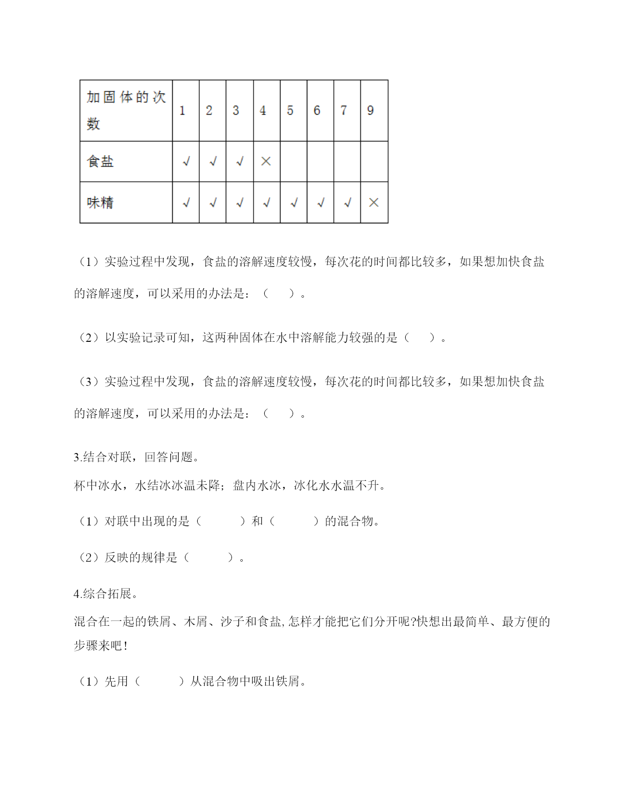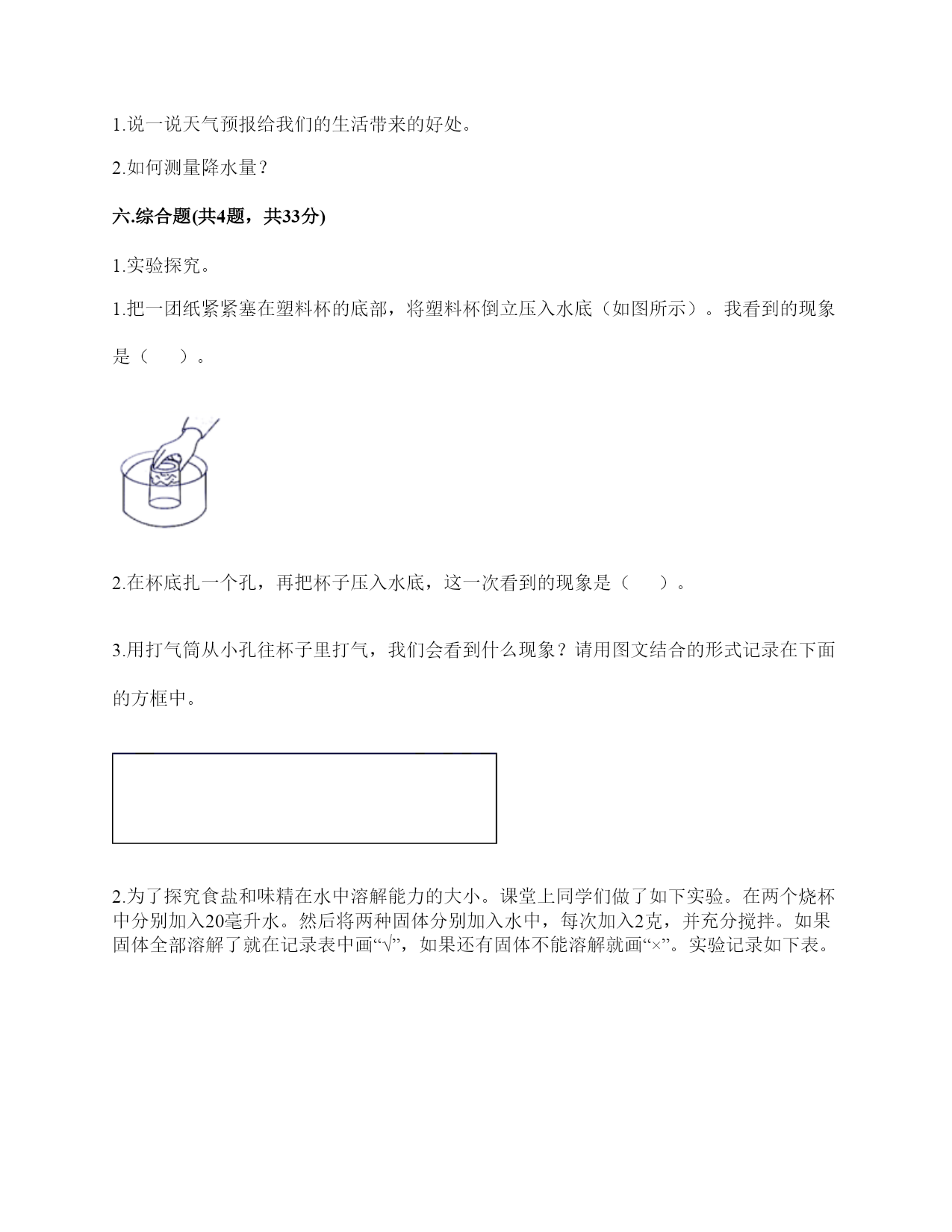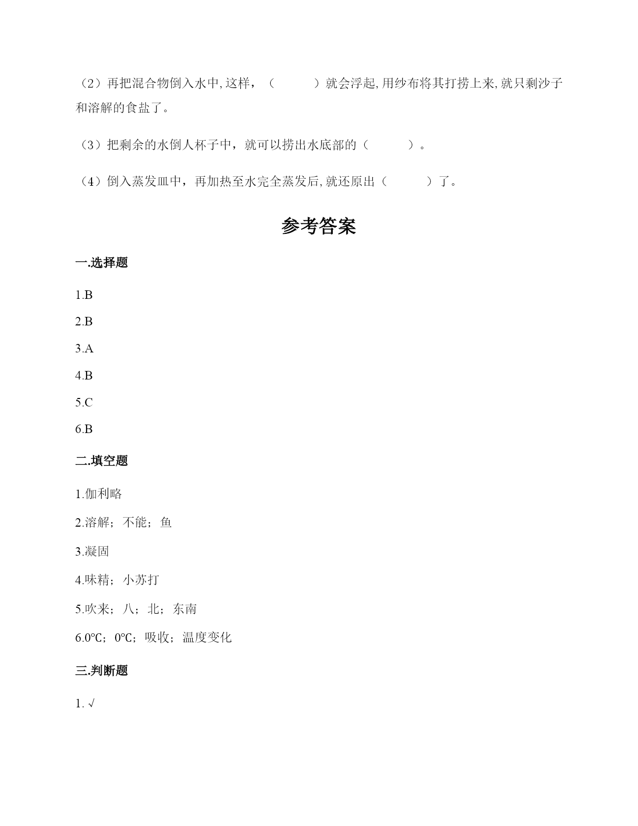 教科版三年级上册科学期末测试卷一.选择题(共6题,共12分)1.在蒸发过程中,有一些操作注意点,下列说法不正确的是()。A.石棉网的作用是让蒸发皿均匀受热B.水完全蒸发后再熄灭酒精灯C.用酒精灯的外焰加热2.下面()不属于空气的特征。A.空气可以被压缩,所以它没有固定的体积B.空气没有重量C.空气能流动,流动的空气就是风D.空气具有无色、无味等特点3.水变成水蒸气后,体积会()。A.变大B.变小C.不确定4.将下面两杯水放置在通风向阳处,一周后观察它们的变化,下面三种说法中正确的是()。A.①号杯的水位比②号杯高B.①号杯的水位比②号杯低C.①号杯的水位比②号杯一样高5.下面选项中,()最容易被压缩。A.冰块B.矿泉水C.空气6.观察云,不必观察云的()。A.形状B.方向C.多少二.填空题(共6题,共30分)1.17世纪时,伟大的科学家()用实验证明空气具有质量。2.空气()在水中,但是人()在水中呼吸,()可以在水中呼吸。3.水结成冰后,就从液体变成了固体,这个过程叫()。4.我们知道,食盐、()、()可以溶解在水中。5.风向是指风()的方向。我们一般用()个方位来描述。如北风是由()面吹过来的风,()风是由东南方向吹过来的风。6.当环境温度高于(),冰的温度升到()时开始融化。冰在融化过程中,要从周围()热量,()是使水的状态发生变化的重要因素。三.判断题(共6题,共12分)1.天空中的云总在不断地变化着。()2.抽出空气的袋子,和原来一样重。()3.在装满空气的袋子底部扎一个小洞,挤圧袋子,会感到空气在流动。()4.在相同条件下,不同物质的溶解能力是不同的。()5.做水结冰的实验时,需要用到的装水的仪器是烧杯。()6.水和石头有质量,空气质量很轻,可以忽略不计。()四.连线题(共1题,共8分)1.找出下列气象仪器的作用,连一连,并完成填空。温度计降雨量单位()雨量器风向共()个方向风速仪气温单位()风向标风速共()级五.简答题(共2题,共10分)1.说一说天气预报给我们的生活带来的好处。2.如何测量降水量?六.综合题(共4题,共33分)1.实验探究。1.把一团纸紧紧塞在塑料杯的底部,将塑料杯倒立压入水底(如图所示)。我看到的现象是()。2.在杯底扎一个孔,再把杯子压入水底,这一次看到的现象是()。3.用打气筒从小孔往杯子里打气,我们会看到什么现象?请用图文结合的形式记录在下面的方框中。2.为了探究食盐和味精在水中溶解能力的大小。课堂上同学们做了如下实验。在两个烧杯中分别加入20毫升水。然后将两种固体分别加入水中,每次加入2克,并充分搅拌。如果固体全部溶解了就在记录表中画“√”,如果还有固体不能溶解就画“×”。实验记录如下表。(1)实验过程中发现,食盐的溶解速度较慢,每次花的时间都比较多,如果想加快食盐的溶解速度,可以采用的办法是:()。(2)以实验记录可知,这两种固体在水中溶解能力较强的是()。(3)实验过程中发现,食盐的溶解速度较慢,每次花的时间都比较多,如果想加快食盐的溶解速度,可以采用的办法是:()。3.结合对联,回答问题。杯中冰水,水结冰冰温未降;盘内水冰,冰化水水温不升。(1)对联中出现的是()和()的混合物。(2)反映的规律是()。4.综合拓展。混合在一起的铁屑、木屑、沙子和食盐,怎样才能把它们分开呢?快想出最简单、最方便的步骤来吧!(1)先用()从混合物中吸出铁屑。(2)再把混合物倒入水中,这样,()就会浮起,用纱布将其打捞上来,就只剩沙子和溶解的食盐了。(3)把剩余的水倒人杯子中,就可以捞出水底部的()。(4)倒入蒸发皿中,再加热至水完全蒸发后,就还原出()了。参考答案一.选择题1.B2.B3.A4.B5.C6.B二.填空题1.伽利略2.溶解;不能;鱼3.凝固4.味精;小苏打5.吹来;八;北;东南6.0℃;0℃;吸收;温度变化三.判断题1.√2.×3.√4.√5.×6.×四.连线题1.如下:五.简答题1.帮助我们预测明天的天气,给我们准备的时间。2.①用喷水壶模拟降水,记录好时间。②把雨量器改在水平桌面,读出刻度。③换算成24小时,核对雨量等级。六.综合题1.1.有少量水进人到杯子里去,纸一直都是干的。2.杯子里水面慢慢升高,杯子里的空间被水占据了,纸团湿了。3.杯子里水面慢慢降低,杯子里的空间又被空气占据了。简图略2.提高水温并搅拌;味精;提高水温并搅拌3.冰;水;冰水混合物的温度保持不变4.磁;木屑;沙子;食盐