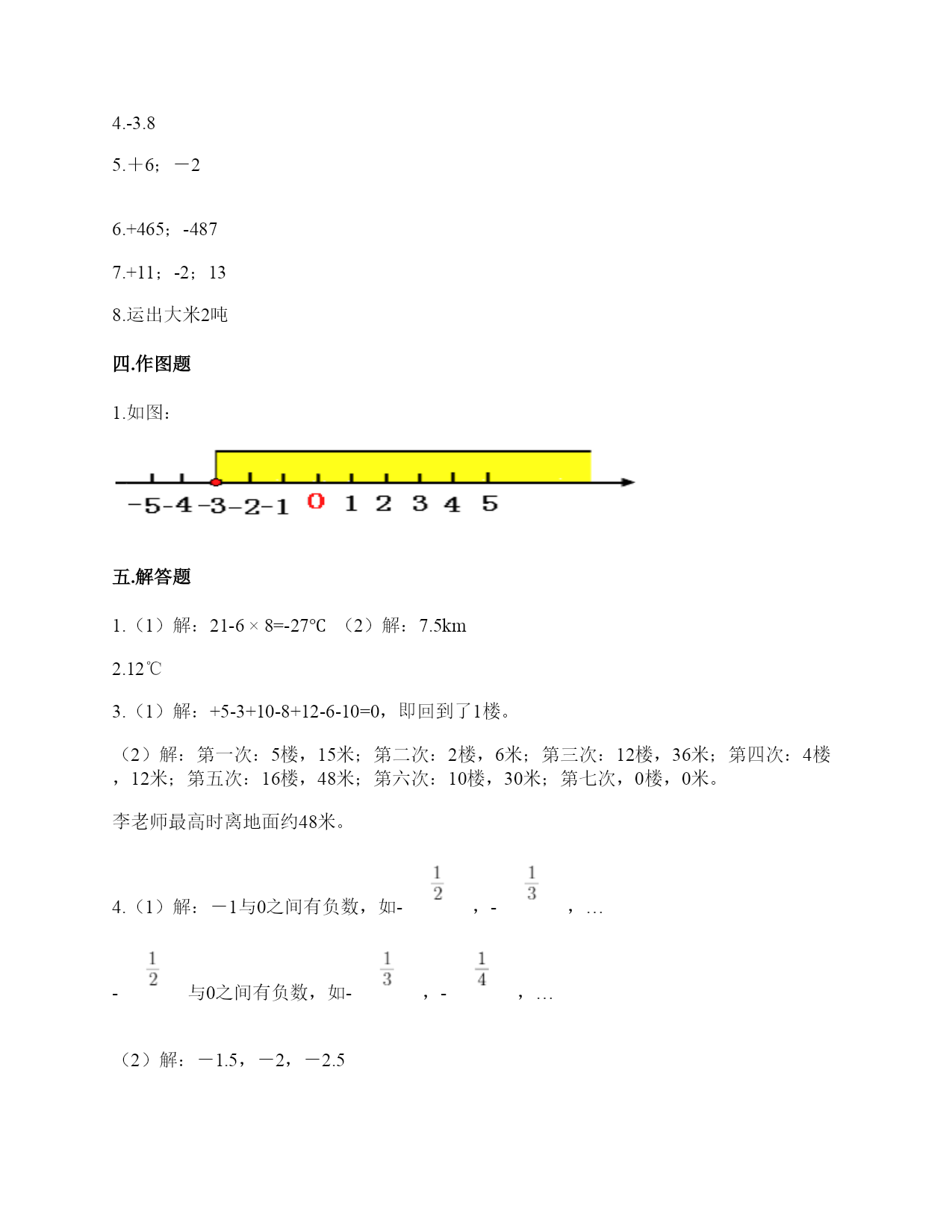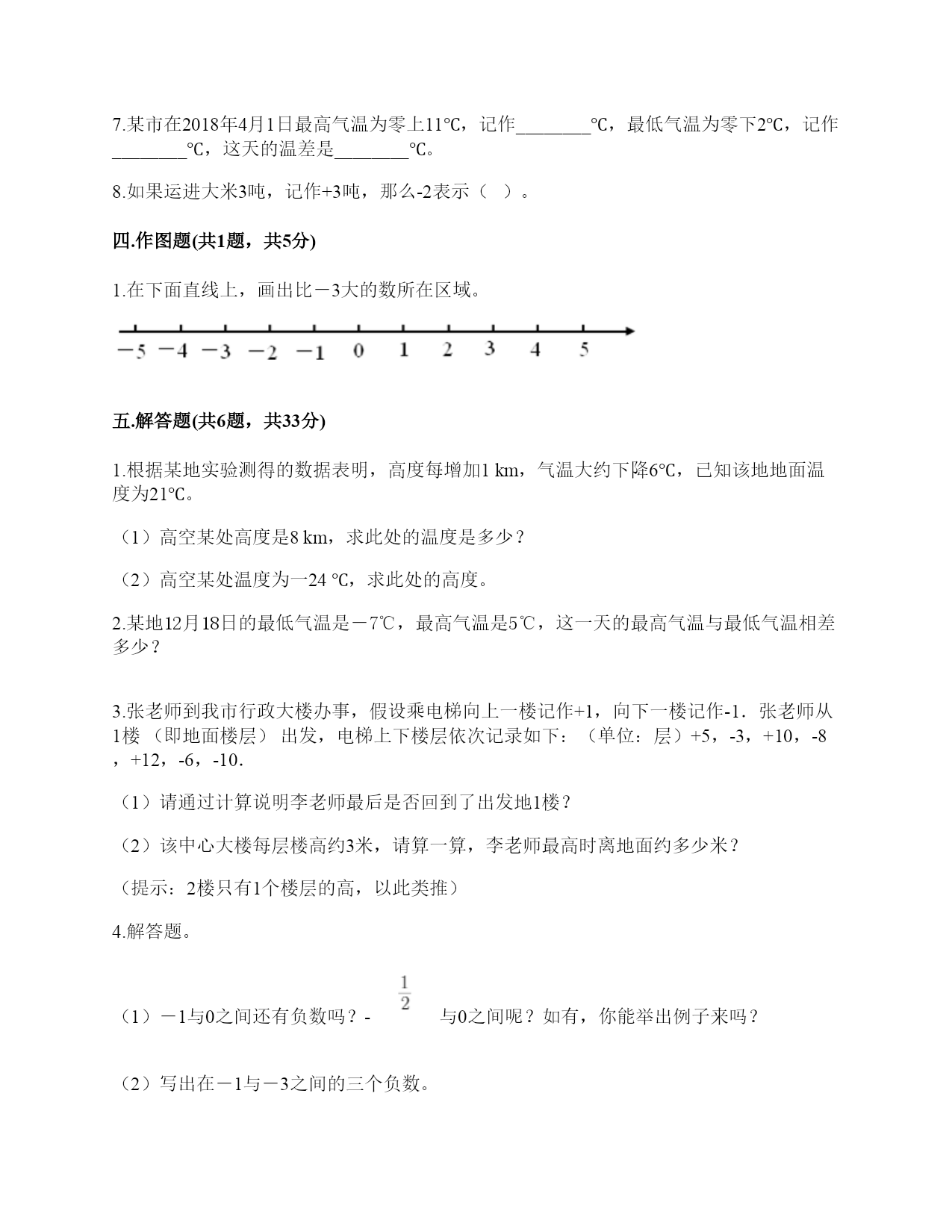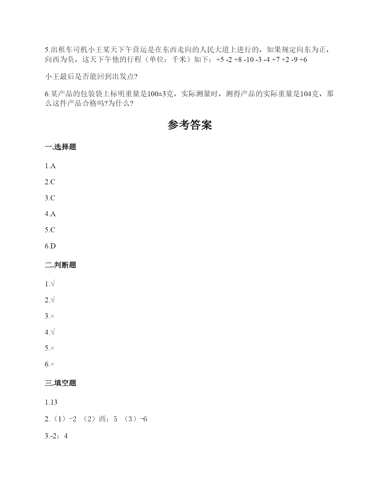 人教版六年级下册数学第一单元《负数》测试卷一.选择题(共6题,共12分)1.如果规定10吨记为0吨,11吨记为+1吨,那么下列说法错误的是()。A.8吨记为-8吨B.15吨记为+5吨C.+3吨表示质量为13吨2.下列每组中的两个量不是具有相反意义的一组量是()。A.收入40元与支出10元B.浪费1吨水与节约1吨水C.向东走4米与向北走4米D.增产12吨与减产12吨3.计算(-3)×|-2|的结果等于()。A.6B.5C.-6D.-54.规定10米记作0米,11米记作+1米,则下列说法错误的是()。A.6米记作-6米。B.15米记作+5米。C.8米记作-2米。D.+2米表示长度为12米。5.如果规定向南走为正,那么-100米表示的意义是()。A.向东走100米B.向西走100米C.向北走100米D.向南走200米6.若ab<0,a+b>0,则下列判断正确的是()。A.a、b都是正数B.a、b都是负数C.a、b异号且负数的绝对值大D.a、b异号且正数的绝对值大二.判断题(共6题,共12分)1.零下3℃比0℃还要低3℃。()2.零上12℃和零下12℃是两种相反意义的量。()3.0可以看成正数,也可以看成负数。()4.零下4℃比4℃还要低8℃。()5.温度计从1℃下降1℃后是-1℃。()6.-20>-12。()三.填空题(共8题,共20分)1.2019年2月20日天气预报显示当天南阳的气温为:-6℃~7C,这一天,西安的气温温差为________℃。2.玩转双面龟。请参照上图完成下列填空。(1)如果双面龟从0点向东爬行2米,记作+2米,那么从0点向西爬行2米,记作________米。(2)如果双面龟现在的位置是-5米,说明它是向________爬行________米。(3)如果双面龟从0点开始,先向东爬行4米,再向西爬行10米,那么它现在的位置记作________米。3.德江县城一月份的某一天的最低气温是零下2℃,记作________℃,最高气温是2℃,这一天的温差________℃。4.六年级一班王小宇同学体重为48.3千克,超出标准体重2.7千克,若标准体重记为0千克,王小宇同学的体重记为+2.7千克,张小刚体重为41.8千克应记为________千克。5.一幢大楼有18层,地面以下有2层,如果地面以上第3层记作+3层,那么地面以上第6层记作()层,地面以下第2层记作()层。6.写出句子中的数。金星表面的最高温度是四百六十五摄氏度:_______℃火星表面的最低温度是零下四百八十七摄氏度:_______℃7.某市在2018年4月1日最高气温为零上11℃,记作________℃,最低气温为零下2℃,记作________℃,这天的温差是________℃。8.如果运进大米3吨,记作+3吨,那么-2表示()。四.作图题(共1题,共5分)1.在下面直线上,画出比-3大的数所在区域。五.解答题(共6题,共33分)1.根据某地实验测得的数据表明,高度每增加1km,气温大约下降6℃,已知该地地面温度为21℃。(1)高空某处高度是8km,求此处的温度是多少?(2)高空某处温度为一24℃,求此处的高度。2.某地12月18日的最低气温是-7℃,最高气温是5℃,这一天的最高气温与最低气温相差多少?3.张老师到我市行政大楼办事,假设乘电梯向上一楼记作+1,向下一楼记作-1.张老师从1楼(即地面楼层)出发,电梯上下楼层依次记录如下:(单位:层)+5,-3,+10,-8,+12,-6,-10.(1)请通过计算说明李老师最后是否回到了出发地1楼?(2)该中心大楼每层楼高约3米,请算一算,李老师最高时离地面约多少米?(提示:2楼只有1个楼层的高,以此类推)4.解答题。(1)-1与0之间还有负数吗?-与0之间呢?如有,你能举出例子来吗?(2)写出在-1与-3之间的三个负数。5.出租车司机小王某天下午营运是在东西走向的人民大道上进行的,如果规定向东为正,向西为负,这天下午他的行程(单位:千米)如下:+5-2+8-10-3-4+7+2-9+6小王最后是否能回到出发点?6.某产品的包装袋上标明重量是100±3克,实际测量时,测得产品的实际重量是104克,那么这件产品合格吗?为什么?参考答案一.选择题1.A2.C3.C4.A5.C6.D二.判断题1.√2.√3.×4.√5.×6.×三.填空题1.132.(1)-2(2)西;5(3)-63.-2;44.-3.85.+6;-26.+465;-4877.+11;-2;138.运出大米2吨四.作图题1.如图:五.解答题1.(1)解:21-6×8=-27℃(2)解:7.5km2.12℃3.(1)解:+5-3+10-8+12-6-10=0,即回到了1楼。(2)解:第一次:5楼,15米;第二次:2楼,6米;第三次:12楼,36米;第四次