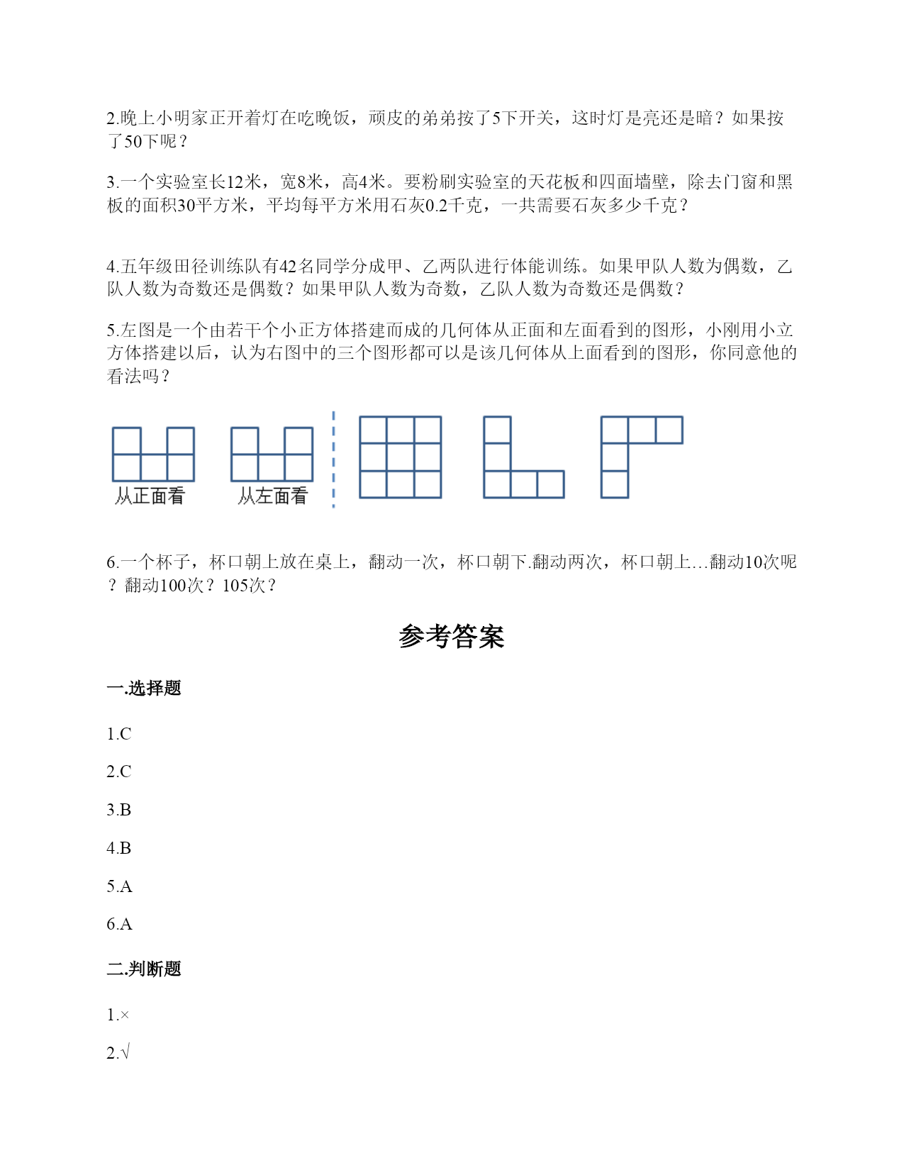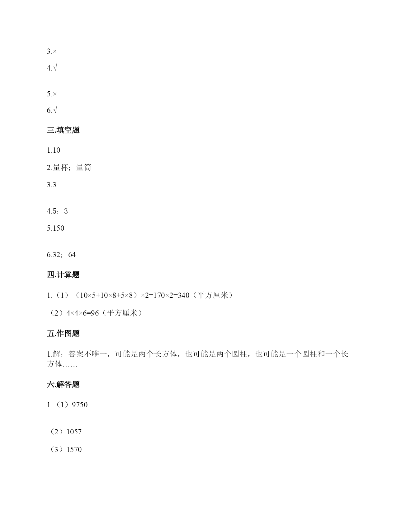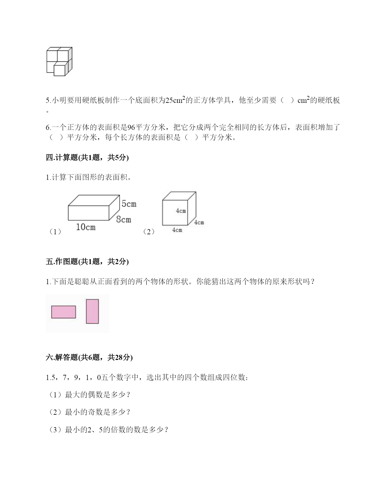 人教版五年级下册数学期中测试卷一.选择题(共6题,共12分)1.下面两个物体的表面积相比()。A.甲的表面积比乙大B.乙的表面积比甲小C.甲、乙的表面积相等D.可能是甲的表面积大,也可能是乙的表面积大2.古希腊数学家认为:如果一个数恰好等于它的所有约数(本身除外)相加的和,那么这个数就是“完全数”。例如:6有四个约数1、2、3、6,除本身6以外,还有1、2、3三个约数,6=1+2+3,恰好是所有约数之和,所以6就是“完全数”。下面数中是“完全数”的是()。A.12B.15C.28D.363.在100以内,能同时是2和5的倍数的最大数是()。A.95B.90C.754.一个数是10的倍数,它()是5的倍数。A.不能确定B.一定C.不可能D.不一定5.从上面看到的是()。A.B.C.6.最小的质数与最小的合数的和是()。A.6B.5C.3二.判断题(共6题,共12分)1.所有的奇数都是质数,所有的偶数都是合数。()2.两个一样大的正方体能拼成一个长方体。()3.2.04立方米就是204立方分米。()4.2、3、4三个数组成的三位数一定是3的倍数。()5.因为0.5×6=3,所以3是0.5的倍数,0.5是3的因数。()6.一个数是6的倍数,这个数一定是2和3的倍数。()三.填空题(共6题,共9分)1.把一个体积是1立方分米的正方体切成棱长是1厘米的小正方体,把这些小正方体排成一排,共长()米。2.我们在准确测量液体的多少可以用()和()做工具。3.一个长方体,上底面是正方形,高是底的2倍,这个长方体的棱长总和是48厘米,这个长方体上底面的边长是()厘米。4.下面这个图形是由()个拼成的,再加()个就可以拼成一个大的正方体。5.小明要用硬纸板制作一个底面积为25cm2的正方体学具,他至少需要()cm2的硬纸板。6.一个正方体的表面积是96平方分米,把它分成两个完全相同的长方体后,表面积增加了()平方分米,每个长方体的表面积是()平方分米。四.计算题(共1题,共5分)1.计算下面图形的表面积。(1)(2)五.作图题(共1题,共2分)1.下面是聪聪从正面看到的两个物体的形状。你能猜出这两个物体的原来形状吗?六.解答题(共6题,共28分)1.5,7,9,1,0五个数字中,选出其中的四个数组成四位数:(1)最大的偶数是多少?(2)最小的奇数是多少?(3)最小的2、5的倍数的数是多少?2.晚上小明家正开着灯在吃晚饭,顽皮的弟弟按了5下开关,这时灯是亮还是暗?如果按了50下呢?3.一个实验室长12米,宽8米,高4米。要粉刷实验室的天花板和四面墙壁,除去门窗和黑板的面积30平方米,平均每平方米用石灰0.2千克,一共需要石灰多少千克?4.五年级田径训练队有42名同学分成甲、乙两队进行体能训练。如果甲队人数为偶数,乙队人数为奇数还是偶数?如果甲队人数为奇数,乙队人数为奇数还是偶数?5.左图是一个由若干个小正方体搭建而成的几何体从正面和左面看到的图形,小刚用小立方体搭建以后,认为右图中的三个图形都可以是该几何体从上面看到的图形,你同意他的看法吗?6.一个杯子,杯口朝上放在桌上,翻动一次,杯口朝下.翻动两次,杯口朝上…翻动10次呢?翻动100次?105次?参考答案一.选择题1.C2.C3.B4.B5.A6.A二.判断题1.×2.√3.×4.√5.×6.√三.填空题1.102.量杯;量筒3.34.5;35.1506.32;64四.计算题1.(1)(10×5+10×8+5×8)×2=170×2=340(平方厘米)(2)4×4×6=96(平方厘米)五.作图题1.解:答案不唯一,可能是两个长方体,也可能是两个圆柱,也可能是一个圆柱和一个长方体……六.解答题1.(1)9750(2)1057(3)15702.解:一开始灯是开着的,按一下是关着的,按两下是开着的,按三下是关,按四下是开,按五下是关.....可以看出奇数次,灯是关着的状态,按偶数次是开着的,所以按第50下的时候,灯是开着的。答:按5下,灯暗,按50下灯是亮着的。3.实验室总面积=(12×8+12×4+8×4)×2=352(平方米)粉刷面积=352-30=322(平方米)石灰总量=322×0.2=64.4(千克)答:一共需要石灰64.4千克。4.42名学生要分成甲,乙两队,因为:奇数+奇数=偶数,偶数+偶数=偶数,如果甲队人数为奇数,乙队人数为奇数;如果甲队人数为偶数,则乙队人数为偶数;答:如果甲队人数为奇数,乙队人数为奇数;如果甲队人数为偶数,则乙队人数为偶数。5.同意小刚的看法。6.解:原来杯口朝上,由于当翻动奇数次时,杯口向下,偶数次时,杯口向上,10与100为偶数,则翻动10次与100次时,杯口都向上,105为奇数,则当翻动105次时,杯口向下.