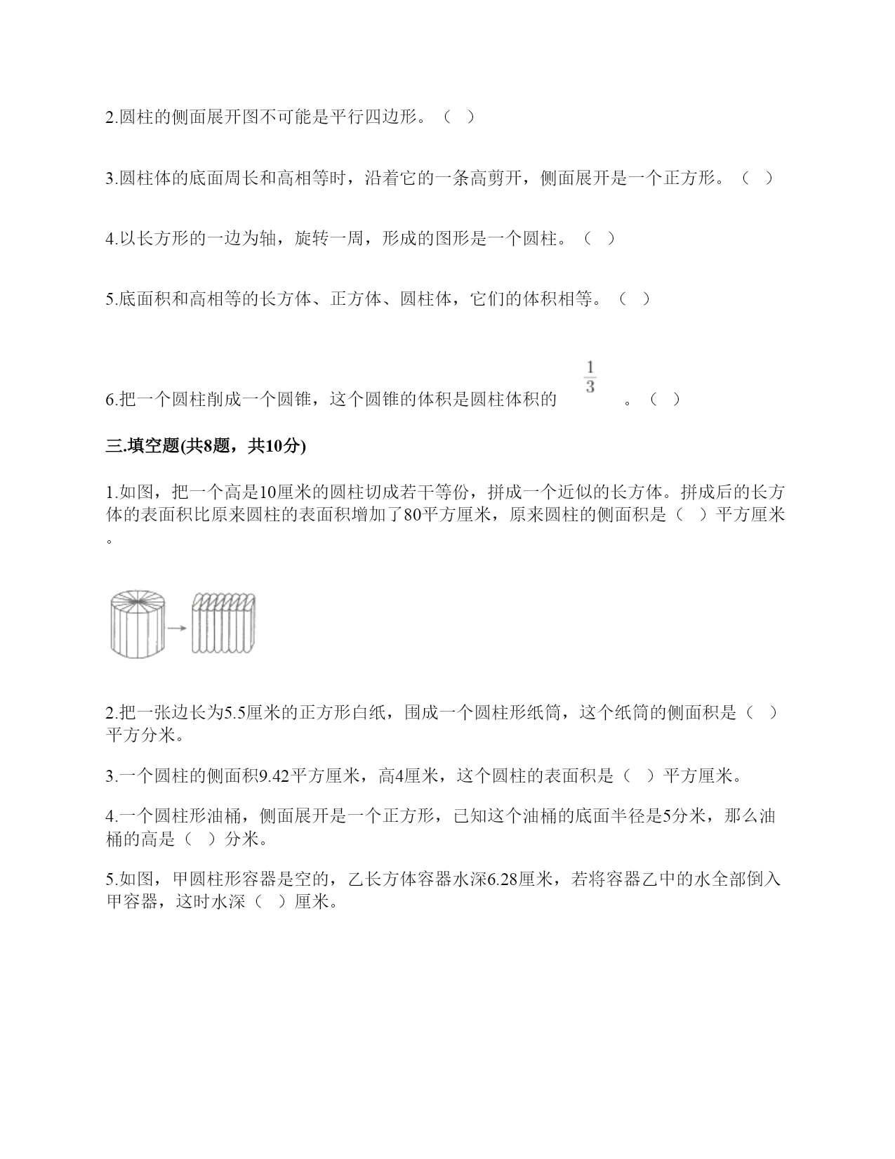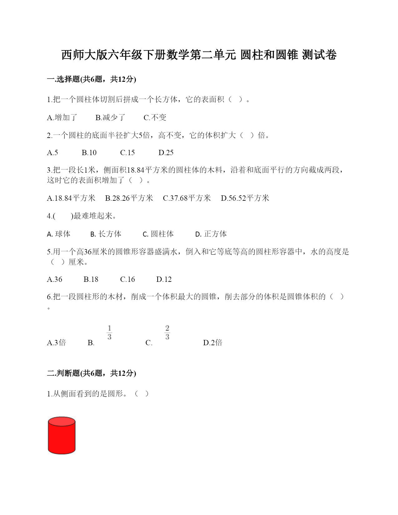 西师大版六年级下册数学第二单元圆柱和圆锥测试卷一.选择题(共6题,共12分)1.把一个圆柱体切割后拼成一个长方体,它的表面积()。A.增加了B.减少了C.不变2.一个圆柱的底面半径扩大5倍,高不变,它的体积扩大()倍。A.5B.10C.15D.253.把一段长1米,侧面积18.84平方米的圆柱体的木料,沿着和底面平行的方向截成两段,这时它的表面积增加了()。A.18.84平方米B.28.26平方米C.37.68平方米D.56.52平方米4.()最难堆起来。A.球体B.长方体C.圆柱体D.正方体5.用一个高36厘米的圆锥形容器盛满水,倒入和它等底等高的圆柱形容器中,水的高度是()厘米。A.36B.18C.16D.126.把一段圆柱形的木材,削成一个体积最大的圆锥,削去部分的体积是圆锥体积的()。A.3倍B.C.D.2倍二.判断题(共6题,共12分)1.从侧面看到的是圆形。()2.圆柱的侧面展开图不可能是平行四边形。()3.圆柱体的底面周长和高相等时,沿着它的一条高剪开,侧面展开是一个正方形。()4.以长方形的一边为轴,旋转一周,形成的图形是一个圆柱。()5.底面积和高相等的长方体、正方体、圆柱体,它们的体积相等。()6.把一个圆柱削成一个圆锥,这个圆锥的体积是圆柱体积的。()三.填空题(共8题,共10分)1.如图,把一个高是10厘米的圆柱切成若干等份,拼成一个近似的长方体。拼成后的长方体的表面积比原来圆柱的表面积增加了80平方厘米,原来圆柱的侧面积是()平方厘米。2.把一张边长为5.5厘米的正方形白纸,围成一个圆柱形纸筒,这个纸筒的侧面积是()平方分米。3.一个圆柱的侧面积9.42平方厘米,高4厘米,这个圆柱的表面积是()平方厘米。4.一个圆柱形油桶,侧面展开是一个正方形,已知这个油桶的底面半径是5分米,那么油桶的高是()分米。5.如图,甲圆柱形容器是空的,乙长方体容器水深6.28厘米,若将容器乙中的水全部倒入甲容器,这时水深()厘米。6.一个圆柱,如果把它的高截短3厘米(如图1),表面积就减少了94.2平方厘米,这个圆柱的半径是()厘米;如果把原圆柱平均分成16份后拼成一个近似的长方体(如图2),表面积就比原来增加了100平方厘米,那么原来圆柱的体积是()立方厘米。7.两个高相等,底面半径之比是1:2的圆柱与圆锥,它们的体积之比是()。8.圆锥有()个侧面,()个底面。四.计算题(共1题,共8分)1.计算下面圆柱的表面积。(1)(2)五.解答题(共7题,共47分)1.一个圆柱形钢材,截去10厘米长的一段后,表面积减少了314平方厘米,体积减少了多少立方厘米?2.一个圆锥形沙堆,底面周长25.12米,高3米。如果每立方米沙重1.7吨,这堆沙重多少吨?(得数保留整数)3.一种圆柱形状的铁皮油桶,量得底面直径8dm,高5dm.做一个这样的铁皮油桶至少需多少平方米铁皮?(铁皮厚度不计,结果保留整数)4.修建一个圆柱形的沼气池,底面直径是3米,深2米.在池子的四壁和下底面抹上水泥,抹水泥的面积是多少平方米?5.某建筑物内有6根圆柱形大柱,高10米,大柱周长25.12分米,要全部涂上油漆,如果按每平方米的油漆费为80元计算,需用多少钱?6.一个圆锥体钢制零件,底面半径是3cm,高是2m,这个零件的体积是多少立方厘米?7.根据已知条件,完成下面各题。(1)已知圆柱底面周长是25.12厘米,高是20厘米,求圆柱的表面积.(2)已知圆锥底面直径是8厘米,高是12厘米,求体积是多少?(3)如图是圆柱中挖去一个圆锥后的剩余部分,请计算它的体积.(单位:厘米)参考答案一.选择题1.A2.D3.D4.A5.D6.D二.判断题1.×2.×3.√4.√5.√6.×三.填空题1.251.22.0.30253.10.3031254.31.45.86.5;7857.3:48.一;一四.计算题1.(1)3.14×10×10=31.4×10=314(cm)3.14×(10÷2)×2=3.14×5×2=3.14×25×2=78.5×2=157(cm)314+157=471(cm)(2)6.28×5=31.4(cm)6.28÷3.14÷2=2÷2=1(cm)3.14×1×2=6.28(cm)31.4+6.28=37.68(cm)五.解答题1.圆柱的底面半径为:314÷10÷3.14÷2=5(厘米)则截去部分的体积是:3.14×52×10=785(立方厘米)答:体积减少了785立方厘米。2.圆锥形沙堆的底面半径:25.12÷3.14÷2=4(米)圆锥形沙堆的体积:3.14×4×3×=50.24(立方米)沙堆的重量:50.24×1.7≈85(吨)答:这堆沙重约85吨。3.8dm=0.8m5dm=0.5m8÷2=0.4(m)14×0.8×0.5+3.14×0.42×2=1.2