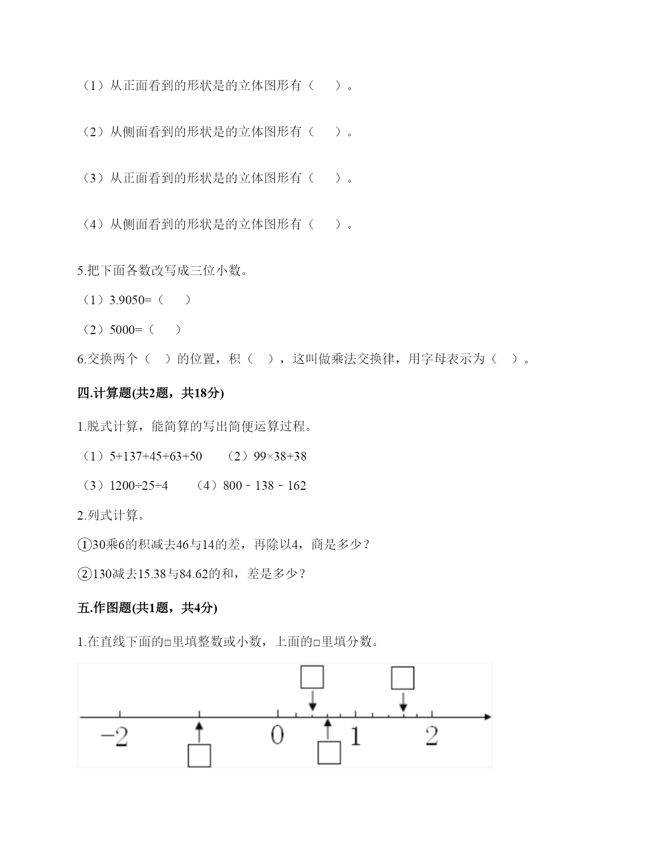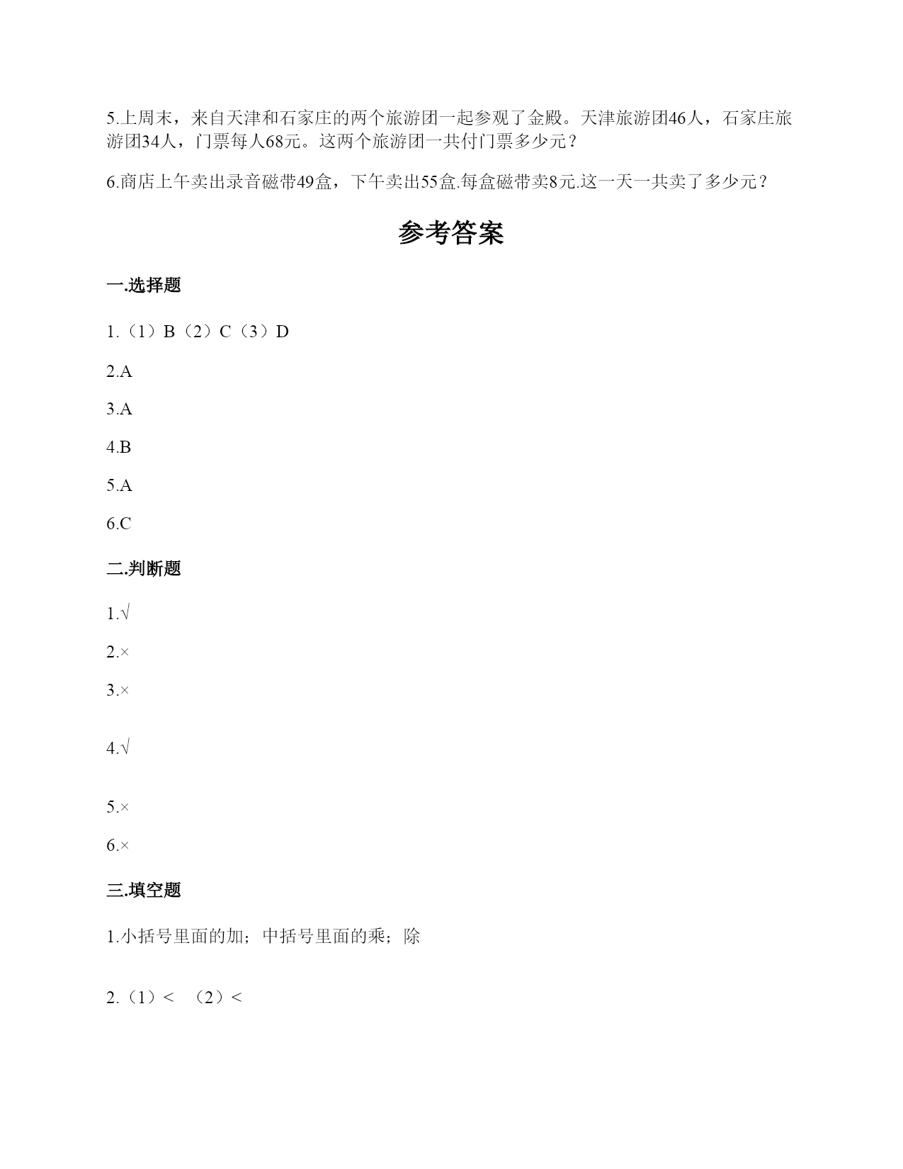 人教版四年级下册数学期中测试卷一.选择题(共6题,共16分)1.找出下面各题错误的原因,把相应的序号填在括号里。(1)3.598保留两位小数是3.6。()A.没有用“四舍五入”法B.精确度不对C.改写后没有写单位名称D.改写成用“亿”作单位的数,当亿位上没有数时,没有添“0”补足(2)把143990改写成用“万”作单位的数(保留一位小数),约是14.4。()A.没有用“四舍五入”法B.精确度不对C.改写后没有写单位名称D.改写成用“亿”作单位的数,当亿位上没有数时,没有添“0”补足(3)把78360010改写成用“亿”作单位的数(保留两位小数),约是.78亿。()A.没有用“四舍五入”法B.精确度不对C.改写后没有写单位名称D.改写成用“亿”作单位的数,当亿位上没有数时,没有添“0”补足2.1.3去掉小数点,扩大()倍。A.10B.100C.1000D.100003.(60×25)×4=60×(25×4)运用了()。A.乘法结合律B.乘法分配律C.乘法交换律4.832×5×2=832×10,计算时运用了乘法()。A.交换律B.结合律C.分配律5.下面各题中,应用了加法结合律的是()。A.(47+146)+154=47+(146+154)B.38+69=69+38C.280+176=165+2916.下面算式应用的运算定律是()24×35+35×46=35×(24+46)A.乘法交换律B.乘法结合律C.乘法分配律D.哪个定律都不符合二.判断题(共6题,共12分)1.0.45和0.450大小相同,计数单位不同。()2.20.04中的“2”和0.25中的“2”的意义相同。()3.把6写成两位小数是0.06。()4.近似数3.7与3.70的大小相等,但是精确的程度不相同。()5.949保留一位小数是6.0。()6.比0.6大比0.8小的小数只有0.7一个。()三.填空题(共6题,共18分)1.计算720÷[(12+24)×20],应先算()法,再算()法,最后算()法。2.比一比.填上“>”、“<”、“=”。(1)7元6角_______10元(2)20分_______3元3.在括号内填“>”“<”“=”。13×27()27×1325×4()24×524时()1日5千米450米()6000米4.小丽用同样大小的正方体搭出了下面的立体图形,根据要求,选择适当的序号填在下面的括号里。(1)从正面看到的形状是的立体图形有()。(2)从侧面看到的形状是的立体图形有()。(3)从正面看到的形状是的立体图形有()。(4)从侧面看到的形状是的立体图形有()。5.把下面各数改写成三位小数。(1)3.9050=()(2)5000=()6.交换两个()的位置,积(),这叫做乘法交换律,用字母表示为()。四.计算题(共2题,共18分)1.脱式计算,能简算的写出简便运算过程。(1)5+137+45+63+50(2)99×38+38(3)1200÷25÷4(4)800﹣138﹣1622.列式计算。①30乘6的积减去46与14的差,再除以4,商是多少?②130减去15.38与84.62的和,差是多少?五.作图题(共1题,共4分)1.在直线下面的□里填整数或小数,上面的□里填分数。六.解答题(共6题,共31分)1.某商场1-4季度分别卖出冰箱279台、73台、321台、267台。该商场全年共售出冰箱多少台?2.上海欢乐谷推出一日游的两种价格方案(如下),现有家长6人,儿童4人去游玩。怎样买票更省钱?两种方案相比相差多少钱?3.饲养场的4头奶牛25天可以挤牛奶1500千克,平均每头奶牛每天可以产牛奶多少千克?4.下表是友朋苗圃几种树苗的情况。(1)每种树苗各接近几千棵?(2)棵数最多的树苗比最少的树苗大约多多少棵?(3)银杏树苗和桂花树苗大约一共有多少棵?5.上周末,来自天津和石家庄的两个旅游团一起参观了金殿。天津旅游团46人,石家庄旅游团34人,门票每人68元。这两个旅游团一共付门票多少元?6.商店上午卖出录音磁带49盒,下午卖出55盒.每盒磁带卖8元.这一天一共卖了多少元?参考答案一.选择题1.(1)B(2)C(3)D2.A3.A4.B5.A6.C二.判断题1.√2.×3.×4.√5.×6.×三.填空题1.小括号里面的加;中括号里面的乘;除2.(1)<(2)<3.略4.(1)①⑤⑥;(2)②③④⑤;(3)②③④;(4)①⑥5.(1)3.905(2)5000.0006.因数;不变;a×b=b×c四.计算题1.(1)解:5+137+45+63+50=(5+45+50)+(137+63)=100+200=300(2)解:99×38+38=(99+1)×38=100×38=3800(3)解:1200÷25÷4=1200÷(25×4)=1200÷100=12(4)解:800