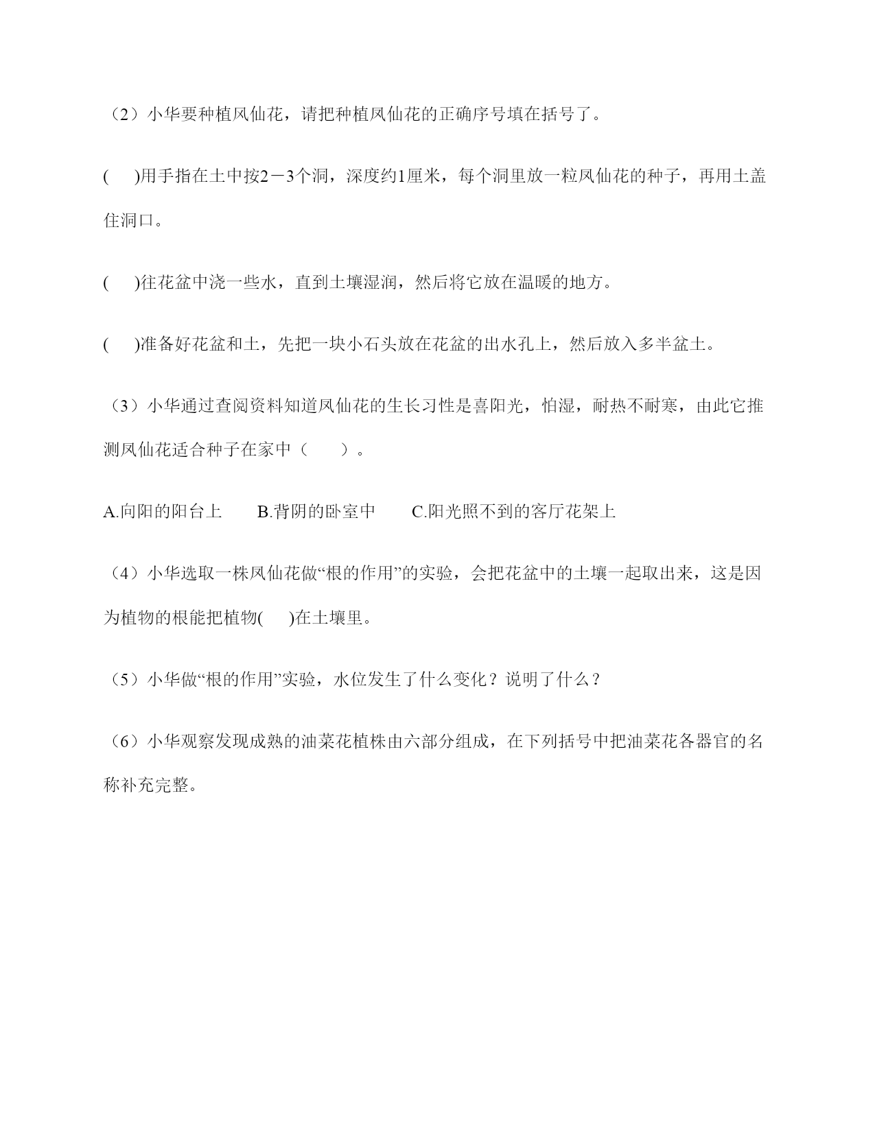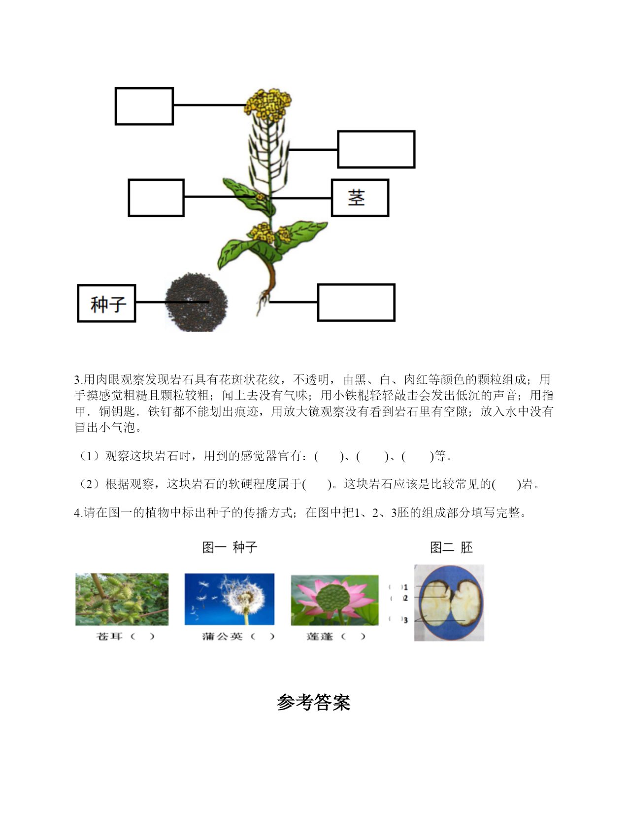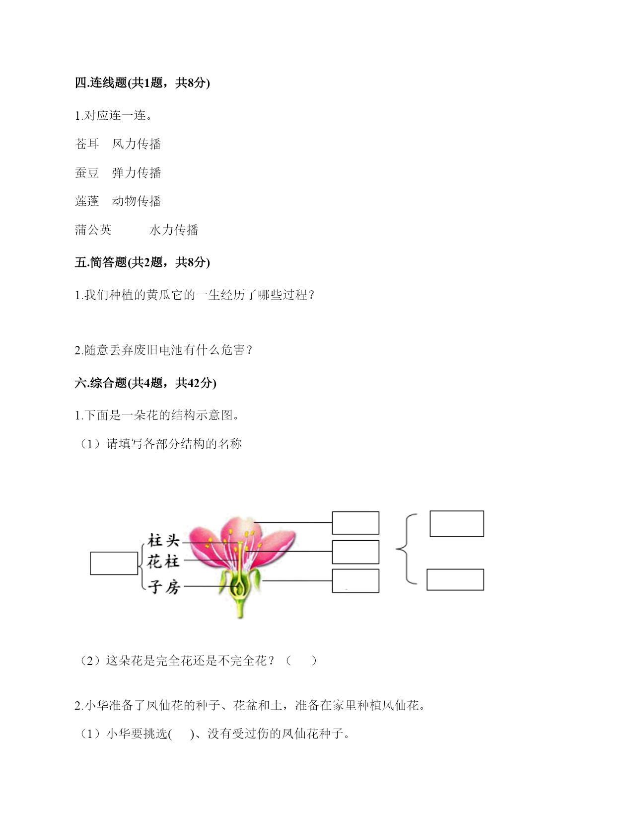 教科版四年级下册科学期末测试卷一.选择题(共6题,共12分)1.闻起来有点腥味,且摸起来手感细腻的物质是()。A.岩石B.黏土C.沙2.()能使电荷从一个物体转移到另一个物体,从而使物体带上静电。A.碰击B.运动C.连接D.摩擦3.下列做法属于安全用电的是()。A.为了保护导线外面包裹塑料B.用湿布清洁正在使用的家用电器C.拔插头时触碰导体部分4.下列电器,一般使用电池做电源的是()。A.电冰箱B.日光灯C.电视遥控器5.把水倒进盛有土壤的玻璃杯里,产生了气泡,说明()。A.土壤中有腐殖质B.土壤中有空气C.水中有空气6.取一块土壤放入水中、搅拌、静置的实验时,下列描述的现象错误的是()。A.把土壤放入水中有气泡产生B.搅拌后轻的、小的颗粒先沉积C.搅拌后有一些植物残体浮在水面二.填空题(共6题,共34分)1.凤仙花的一株幼苗被猫破坏,根连着土壤一并被取出,这是因为凤仙花的根对土壤有()的作用。2.从一粒()成长为一株植物,在这株植物上又结出数粒(),循环往复,延续它们的生命。3.小科又拿了几颗黄豆种子,准备把它们种在花盆里。他首先挑选了一个完好的花盆,在花盆底部的()上放了一块小石头,然后放入()的土。接着用手指在土中按了几个深约()的洞,每个洞里放入()颗黄豆种子,然后再用土盖上洞口。最后再给土壤浇上水,让它保持(),把花盆放在()的地方。爷爷说现在天气冷,可以在花盆上蒙上一层保鲜膜,这样黄豆可以快点发芽。原来盖上保鲜膜可以提高花盆里的()。4.我们给凤仙花浇水时,每次都浇在凤仙花的根部的土壤里,这是因为凤仙花的根能()。5.生活中,我们能安全、方便地使用各种电器,是因为有一个重要的元件控制着电流的通和断,这个元件就是()。我们可以用()、()、()等类似材料制作这个元件。6.植物的果实有()和()两部分组成。三.判断题(共6题,共12分)1.要使2个小灯泡发亮,连接方法只有一种。()2.使用电路检测器检测电路故障时,只需检测一次。()3.电路检测器连接到电路中没有故障的地方,电路中的小灯泡就会亮。()4.解剖凤仙花时,应细心地按照从内到外的顺序进行。()5.只要是土壤,那都适合农作物的生长。()6.矿物的外表颜色和条痕颜色不一致时,观察外表的颜色更可靠些。()四.连线题(共1题,共8分)1.对应连一连。苍耳风力传播蚕豆弹力传播莲蓬动物传播蒲公英水力传播五.简答题(共2题,共8分)1.我们种植的黄瓜它的一生经历了哪些过程?2.随意丢弃废旧电池有什么危害?六.综合题(共4题,共42分)1.下面是一朵花的结构示意图。(1)请填写各部分结构的名称(2)这朵花是完全花还是不完全花?()2.小华准备了凤仙花的种子、花盆和土,准备在家里种植风仙花。(1)小华要挑选()、没有受过伤的凤仙花种子。(2)小华要种植风仙花,请把种植凤仙花的正确序号填在括号了。()用手指在土中按2-3个洞,深度约1厘米,每个洞里放一粒凤仙花的种子,再用土盖住洞口。()往花盆中浇一些水,直到土壤湿润,然后将它放在温暖的地方。()准备好花盆和土,先把一块小石头放在花盆的出水孔上,然后放入多半盆土。(3)小华通过查阅资料知道凤仙花的生长习性是喜阳光,怕湿,耐热不耐寒,由此它推测凤仙花适合种子在家中()。A.向阳的阳台上B.背阴的卧室中C.阳光照不到的客厅花架上(4)小华选取一株凤仙花做“根的作用”的实验,会把花盆中的土壤一起取出来,这是因为植物的根能把植物()在土壤里。(5)小华做“根的作用”实验,水位发生了什么变化?说明了什么?(6)小华观察发现成熟的油菜花植株由六部分组成,在下列括号中把油菜花各器官的名称补充完整。3.用肉眼观察发现岩石具有花斑状花纹,不透明,由黑、白、肉红等颜色的颗粒组成;用手摸感觉粗糙且颗粒较粗;闻上去没有气味;用小铁棍轻轻敲击会发出低沉的声音;用指甲.铜钥匙.铁钉都不能划出痕迹,用放大镜观察没有看到岩石里有空隙;放入水中没有冒出小气泡。(1)观察这块岩石时,用到的感觉器官有:()、()、()等。(2)根据观察,这块岩石的软硬程度属于()。这块岩石应该是比较常见的()岩。4.请在图一的植物中标出种子的传播方式;在图中把1、2、3胚的组成部分填写完整。参考答案一.选择题1.B2.D3.A4.C5.B6.B二.填空题1.固定2.种子;种子3.出水口;半盆多;1厘米;1颗;湿润;温暖;温度4.吸收水分5.开关;木块;回形针;图钉6.果皮;种子三.判断题1.×2.×3.√4.×5.×6.×四.连线题1.五.简答题1.黄瓜的一生经历了从种子萌发成幼苗,再到开花、结出果实和种子的过程。2.废旧电池会污染环境,一节一号电池烂在地里,会使1平方米的土壤永久污染;1粒纽扣电池可使600吨水无法饮用,相当于1个人一生的饮水量。所以废旧电池不可以随意丢弃。六.综合