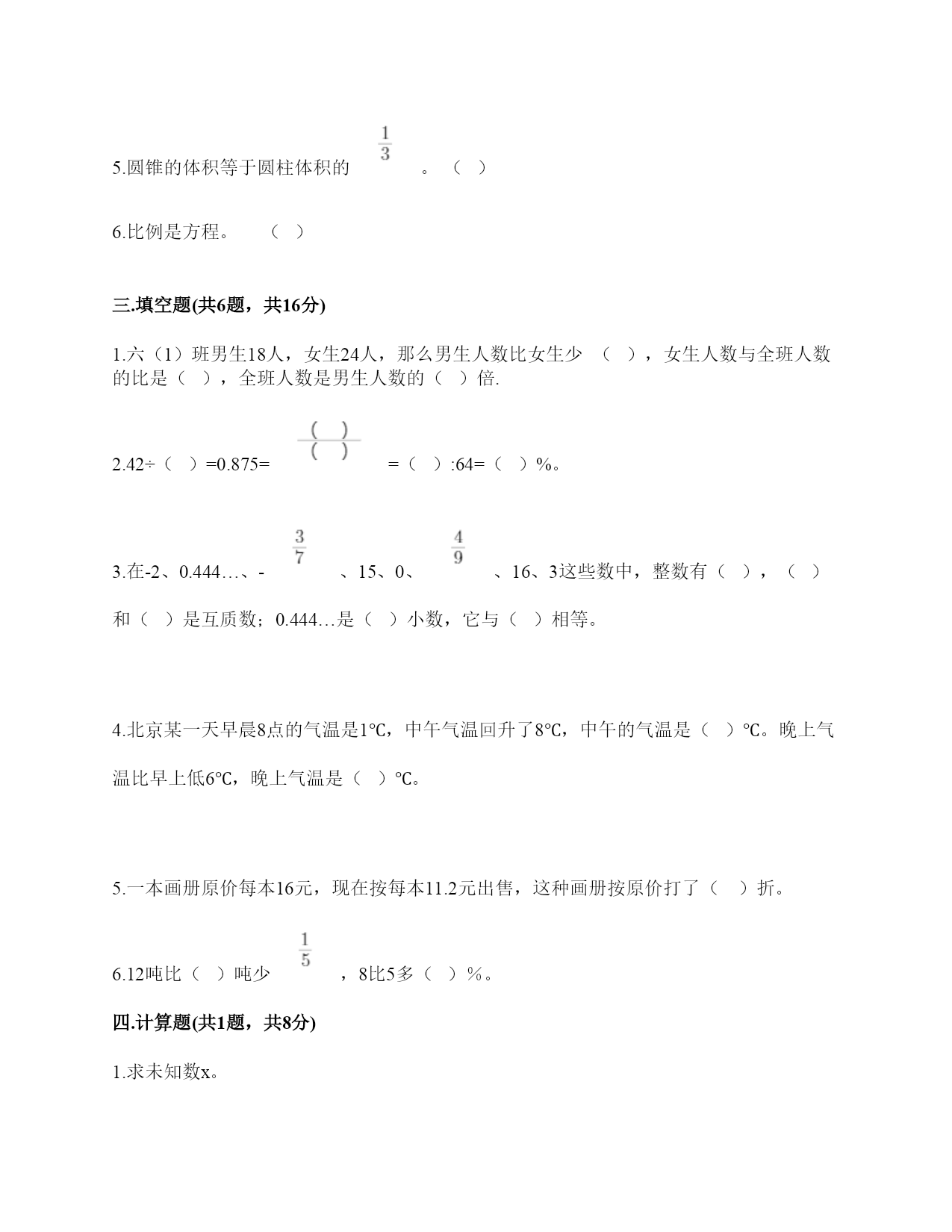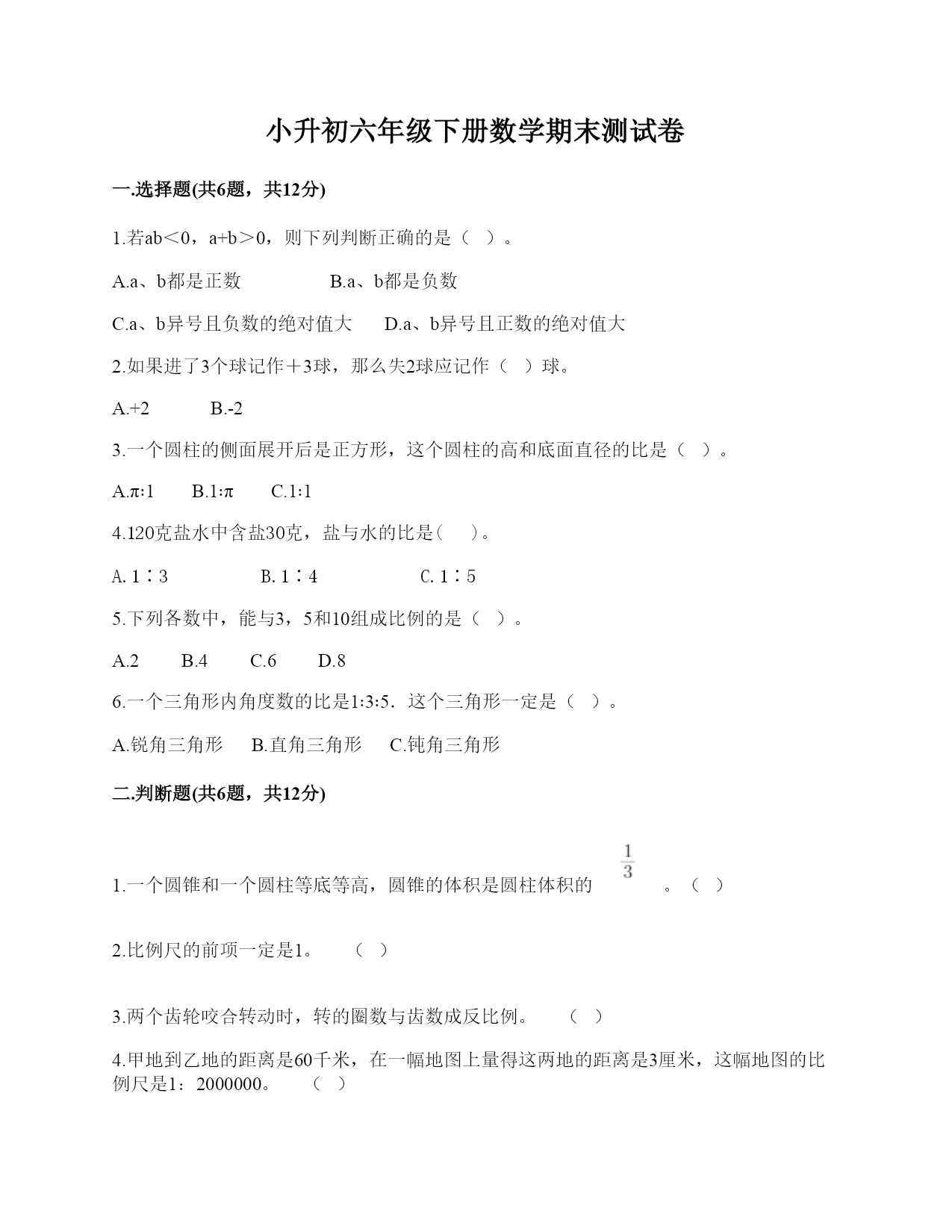 小升初六年级下册数学期末测试卷一.选择题(共6题,共12分)1.若ab<0,a+b>0,则下列判断正确的是()。A.a、b都是正数B.a、b都是负数C.a、b异号且负数的绝对值大D.a、b异号且正数的绝对值大2.如果进了3个球记作+3球,那么失2球应记作()球。A.+2B.-23.一个圆柱的侧面展开后是正方形,这个圆柱的高和底面直径的比是()。A.π∶1B.1∶πC.1∶14.120克盐水中含盐30克,盐与水的比是()。A.1∶3B.1∶4C.1∶55.下列各数中,能与3,5和10组成比例的是()。A.2B.4C.6D.86.一个三角形内角度数的比是1∶3∶5.这个三角形一定是()。A.锐角三角形B.直角三角形C.钝角三角形二.判断题(共6题,共12分)1.一个圆锥和一个圆柱等底等高,圆锥的体积是圆柱体积的。()2.比例尺的前项一定是1。()3.两个齿轮咬合转动时,转的圈数与齿数成反比例。()4.甲地到乙地的距离是60千米,在一幅地图上量得这两地的距离是3厘米,这幅地图的比例尺是1:2000000。()5.圆锥的体积等于圆柱体积的。()6.比例是方程。()三.填空题(共6题,共16分)1.六(1)班男生18人,女生24人,那么男生人数比女生少(),女生人数与全班人数的比是(),全班人数是男生人数的()倍.2.42÷()=0.875==():64=()%。3.在-2、0.444…、-、15、0、、16、3这些数中,整数有(),()和()是互质数;0.444…是()小数,它与()相等。4.北京某一天早晨8点的气温是1℃,中午气温回升了8℃,中午的气温是()℃。晚上气温比早上低6℃,晚上气温是()℃。5.一本画册原价每本16元,现在按每本11.2元出售,这种画册按原价打了()折。6.12吨比()吨少,8比5多()%。四.计算题(共1题,共8分)1.求未知数x。五.作图题(共1题,共4分)1.从左到右在括号里填数。(填整数或小数)六.解答题(共6题,共33分)1.一个圆锥形沙堆,高是6米,底面直径4米。把这些沙子铺在一个长为5米,宽为2米的长方体的沙坑里,铺的厚度是多少厘米?2.一件西服原价180元,现在的价格比原来增加了10%,现在的价格是多少元?3.把下面几个城市的最高气温按从高到低排列起来;把最低气温按从低到高排列起来。北京:-7°C~7°C上海:5°C~10°C成都:8°C~11°C唐山:-5°C~6°C4.某蓄水池的标准水位记为0米,如果用正数表示水面高于标准水位的高度,那么:(1)水面低于标准水位0.1米和高于标准水位0.2米各怎样表示?(2)0.18米和-0.23米各表示什么?5.用96厘米长的铁丝围成一个直角三角形,这个直角三角形三条边的长度比是3∶4∶5,这个三角形的面积是多少?6.修建一个圆柱形的沼气池,底面直径是3米,深2米.在池子的四壁和下底面抹上水泥,抹水泥的面积是多少平方米?参考答案一.选择题1.D2.B3.A4.A5.C6.C二.判断题1.√2.×3.√4.√5.×6.×三.填空题1.;4:7;2.48;;56;87.53.-2、15、0、16、3;15;16;循环;4.9;零下55.76.15;60四.计算题1.(1)0.4(2)5(3)14(4)36五.作图题1.解:这些数字如下:-3,-1.5,-1,+2.5六.解答题1.3.14×(4÷2)×6×÷(5×2)=3.14×8÷10=2.512(米)2.512米=251.2厘米答:铺的厚度是251.2厘米。2.解:180×(1+10%)=198(元)答:现在的价格是198元。3.最高气温:11°C>10°C>7°C>6°C最低气温:-7°C<-5°C<5°C<8°C4.(1)水面低于标准水位0.1米,记作(-0.1米);高于标准水位0.2米,记作(+0.2米或0.2米)(2)0.18米:表示高于标准水位0.18米;-0.23米:表示低于标准水位0.23米5.96×=24(厘米)96×=32(厘米)24×32÷2=384(平方厘米)6.解:3.14×3×2+3.14×(3÷2)2=18.84+3.14×2.25=18.84+7.065=25.905(平方米)答:抹水泥的面积是25.905平方米。