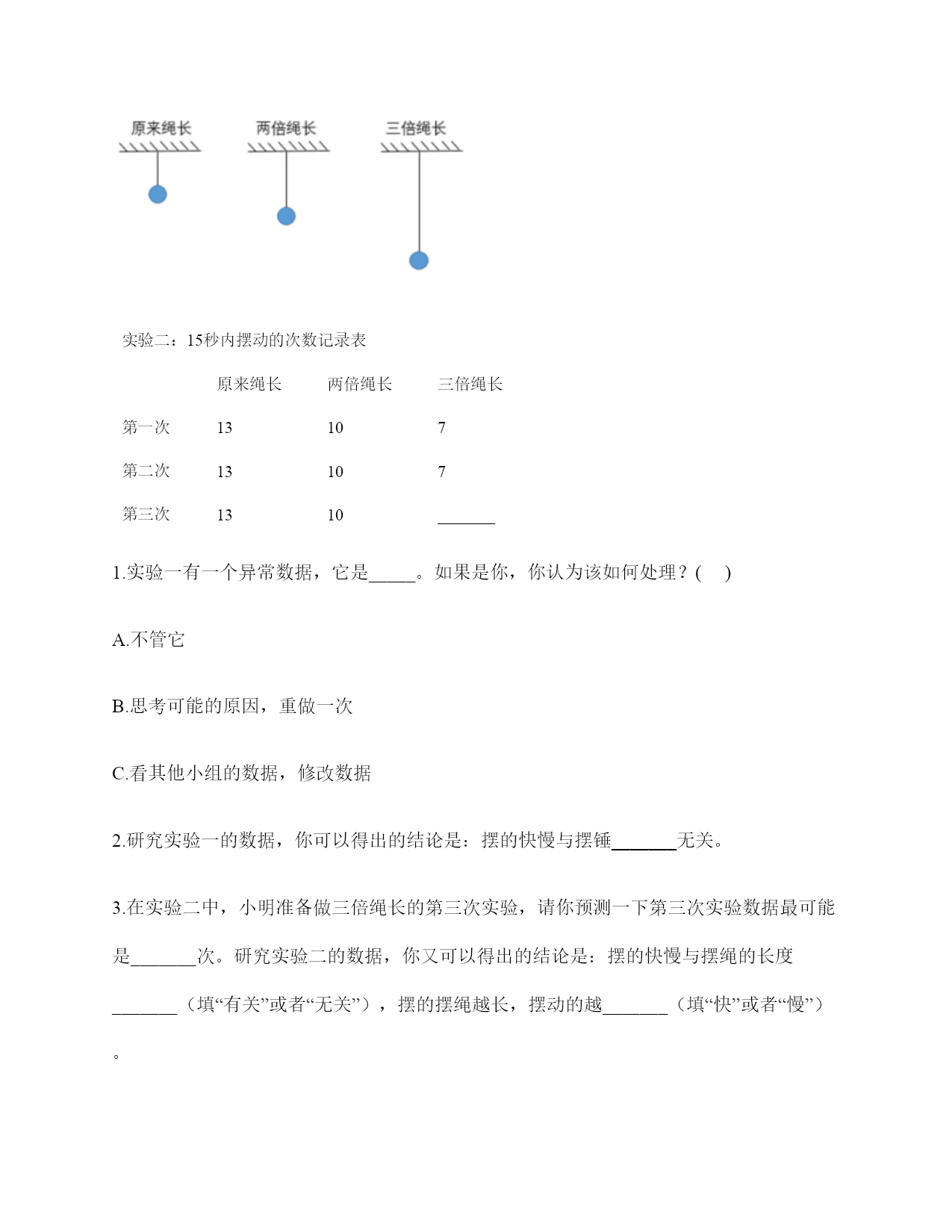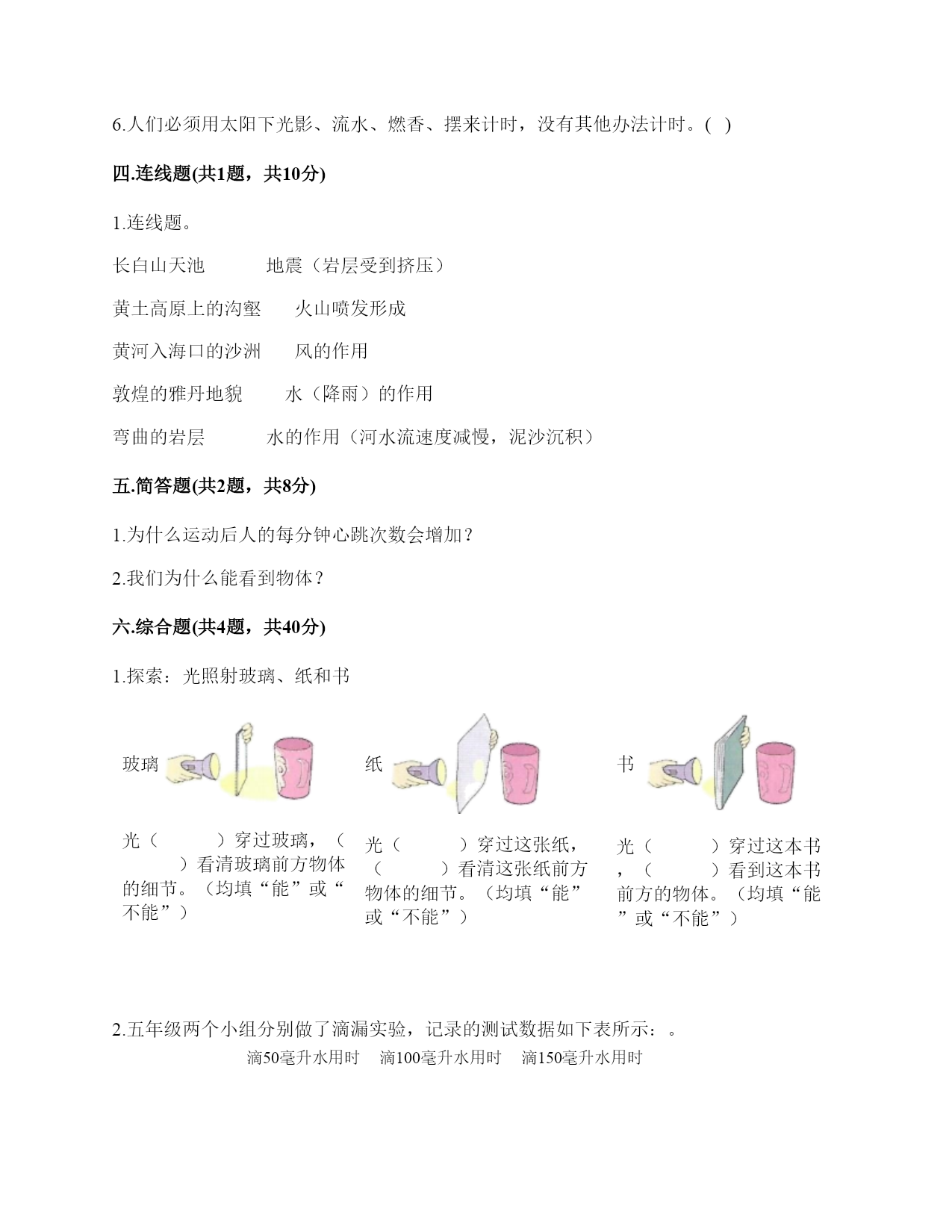 教科版五年级上册科学期末测试卷一.选择题(共6题,共16分)1.身体感受外部环境刺激的器官叫感觉器官,感觉器官包括()等,当感官感受到刺激时,会由传入神经将信号传到(),()做出的指令,并使身体做出反应。2.用红光和绿光混合可以得到()。A.黄光B.蓝光C.白光3.自制水钟时,时间刻度的划分是根据()。A.每分钟流出水的容积B.瓶子的容积C.尺子的长短4.地球从表面到地心可以分为()三个圈层。A.地壳、地核、地幔B.地幔、地壳、地核C.地壳、地幔、地核5.在做一个运动模型的时候,我们用到了筷子(或者木棍)、橡皮筋和细绳。其中橡皮筋模拟的是()。A.骨头B.肌肉C.关节6.下列物体中属于光源的是()。A.月亮B.镜子C.发光鱼D.没点燃的蜡烛二.填空题(共6题,共18分)1.科学合理的计划有助于形成()的生活习惯,而计划只有变成(),才能产生效果。2.做一个摆,观察摆动过程中有哪些现象发生?()①摆动的方向会慢慢偏转②摆线越来越长了③摆幅越摆越小④摆动的速度越来越慢⑤摆锤每次晃到左边和右边的高度基本相同3.潜望镜里的两面镜子的反射面是()的。4.我们看不见屏风后面的人但可以听到他说话的声音,这是因为声音是以()的形式传播的,光是()传播的。5.当今计时最精确的是()。6.门窗上的合页模仿的是我们身体上的(),骨骼能在身体里起到支撑身体和保护()的作用。三.判断题(共6题,共12分)1.土地有植被覆盖、坡度小、降雨量小,被侵蚀的程度就会小。()2.太阳光看起来几乎是白色的,其实它是由红橙黄绿青靛紫七种色光组成的。()3.水钟、沙漏计时,不再受阳光有无的影响,可以昼夜使用。()4.由于地壳的运动,相互挤压会使岩层发生弯曲。()5.像声音一样,光也有自己的传播方式。()6.人们必须用太阳下光影、流水、燃香、摆来计时,没有其他办法计时。()四.连线题(共1题,共10分)1.连线题。长白山天池地震(岩层受到挤压)黄土高原上的沟壑火山喷发形成黄河入海口的沙洲风的作用敦煌的雅丹地貌水(降雨)的作用弯曲的岩层水的作用(河水流速度减慢,泥沙沉积)五.简答题(共2题,共8分)1.为什么运动后人的每分钟心跳次数会增加?2.我们为什么能看到物体?六.综合题(共4题,共40分)1.探索:光照射玻璃、纸和书玻璃光()穿过玻璃,()看清玻璃前方物体的细节。(均填“能”或“不能”)纸光()穿过这张纸,()看清这张纸前方物体的细节。(均填“能”或“不能”)书光()穿过这本书,()看到这本书前方的物体。(均填“能”或“不能”)2.五年级两个小组分别做了滴漏实验,记录的测试数据如下表所示:。滴50毫升水用时滴100毫升水用时滴150毫升水用时推测实测推测实测小组1测试情况17秒34秒37秒51秒61秒小组2测试情况34秒68秒88秒102秒149秒1.两个组滴50毫升水的用时差异较大,这可能是因为:______________________________________________2.根据表格中数据,我们可以发现两个组的水流速度变化情况是()。A.保持不变B.越来越快C.越来越慢3.小组1如果测试滴200毫升水用时,实测的结果最有可能是()。A.60秒B.68秒C.89秒3.小明对“摆的快慢与什么因素有关”进行了两组对比实验。实验一:摆绳长度和摆幅不变,探究摆的快慢与摆锤质量的关系。实验一:15秒内摆动的次数记录表原来质量两倍质量三倍质量第一次131313第二次132113第三次131313实验二:摆锤质量和摆幅不变,探究摆的快慢与摆绳长短的关系。实验二:15秒内摆动的次数记录表原来绳长两倍绳长三倍绳长第一次13107第二次13107第三次1310_______1.实验一有一个异常数据,它是_____。如果是你,你认为该如何处理?()A.不管它B.思考可能的原因,重做一次C.看其他小组的数据,修改数据2.研究实验一的数据,你可以得出的结论是:摆的快慢与摆锤_______无关。3.在实验二中,小明准备做三倍绳长的第三次实验,请你预测一下第三次实验数据最可能是_______次。研究实验二的数据,你又可以得出的结论是:摆的快慢与摆绳的长度_______(填“有关”或者“无关”),摆的摆绳越长,摆动的越_______(填“快”或者“慢”)。4.如果小明想把原来绳长15秒摆动13次的摆改为每分钟摆动60次的“钟摆”,你可以给他的建议是_______(填“增加”或者“减小”)摆绳的长度。4.杯弓蛇影:有人请客吃饭,挂在墙上的弓映在酒杯里,客人以为酒杯里有蛇,回去疑心中了蛇毒,就生病了。比喻疑神疑鬼,妄自惊慌。海市蜃楼:大气中由于光的折射作用而形成的一种自然现象。当空气各层的密度有较大的差异时,远处的光通过密度不同的空气层就会发生折射等光学现象,这时可以看见在空中或地面以