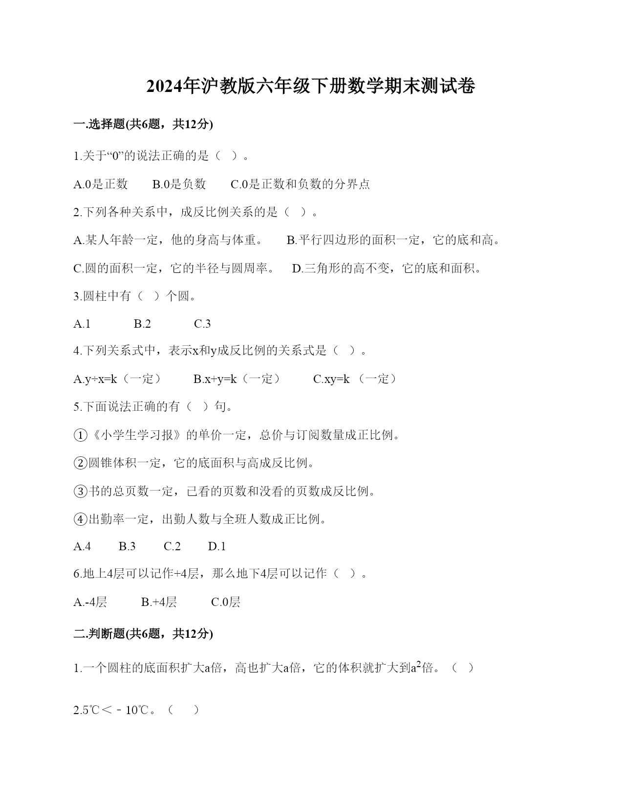 2024年沪教版六年级下册数学期末测试卷一.选择题(共6题,共12分)1.关于“0”的说法正确的是()。A.0是正数B.0是负数C.0是正数和负数的分界点2.下列各种关系中,成反比例关系的是()。A.某人年龄一定,他的身高与体重。B.平行四边形的面积一定,它的底和高。C.圆的面积一定,它的半径与圆周率。D.三角形的高不变,它的底和面积。3.圆柱中有()个圆。A.1B.2C.34.下列关系式中,表示x和y成反比例的关系式是()。A.y÷x=k(一定)B.x+y=k(一定)C.xy=k(一定)5.下面说法正确的有()句。①《小学生学习报》的单价一定,总价与订阅数量成正比例。②圆锥体积一定,它的底面积与高成反比例。③书的总页数一定,已看的页数和没看的页数成反比例。④出勤率一定,出勤人数与全班人数成正比例。A.4B.3C.2D.16.地上4层可以记作+4层,那么地下4层可以记作()。A.-4层B.+4层C.0层二.判断题(共6题,共12分)1.一个圆柱的底面积扩大a倍,高也扩大a倍,它的体积就扩大到a2倍。()2.5℃<﹣10℃。()3.原价50元的商品打九折出售,相当于降价了10元。()4.一个圆柱的底面半径扩大4倍,高不变,它的侧面积就扩大16倍。()5.把圆锥的侧面展开,得到的是一个长方形。()6.(2015邹城市)圆柱体的体积等于圆锥体的体积的3倍。()三.填空题(共6题,共13分)1.如果赢利用正数表示,那么亏损就用________数表示,亏损了30元记作________。2.一个圆锥形的沙堆,底面半径为1米,高为4.5分米,用这堆沙在5米宽的公路上铺2厘米厚的路面,可以铺()米。3.德江县城一月份的某一天的最低气温是零下2℃,记作________℃,最高气温是2℃,这一天的温差________℃。4.甲、乙、丙三人共同植树,甲植了总数的30%,乙与丙植的棵数比是3:4,已知甲植树9棵,丙植了()棵。5.20÷()=()(填小数)===50%=。6.六年级3个班平均每班有52人,(1)班有48人,(2)、(3)班两班人数的比是5:7,(2)班有()人,3班有()人。四.计算题(共1题,共8分)1.解比例。五.作图题(共1题,共4分)1.从左到右在括号里填数。(填整数或小数)六.解答题(共6题,共38分)1.学校阅览室共有图书800本,其中科普书占图书总数的35%,文艺书占图书总数的30%。这两种书一共有多少本?2.某水果店新进一批水果,其中苹果占新进水果总量的30%,香蕉占40%,已知这两种水果共70kg,这批水果的总量是多少?3.某商场在五月份进了甲、乙两种商品共100件,甲商品进货价每件40元,乙商品进货价每件60元。如果两种商品都按20%的利润来定零售价.这样当两种商品全部销售完后,共获利润940元。(利润是指“销价与进货价的差”。)(1)甲、乙两种商品每件可获利润各是多少元?(2)其中甲种商品进了多少件?4.在打谷场上,有一个近似于圆锥的小麦堆,高1.2米,测得底面直径是4米,每立方米小麦约重350千克,这堆小麦大约有多少千克?5.一个圆柱形的金鱼缸,底面半径是40cm,里面有一座假山石全部浸没在水中(水没有溢出),取出假山石后,水面下降了5cm。这座假山的体积是多少?6.张老师到我市行政大楼办事,假设乘电梯向上一楼记作+1,向下一楼记作-1.张老师从1楼(即地面楼层)出发,电梯上下楼层依次记录如下:(单位:层)+5,-3,+10,-8,+12,-6,-10.(1)请通过计算说明李老师最后是否回到了出发地1楼?(2)该中心大楼每层楼高约3米,请算一算,李老师最高时离地面约多少米?(提示:2楼只有1个楼层的高,以此类推)参考答案一.选择题1.C2.B3.B4.C5.B6.A二.判断题1.√2.×3.×4.×5.×6.×三.填空题1.负;-30元2.4.713.-2;44.125.40;0.5;3;8;1006.45;63四.计算题1.(1)42.75(2)0.1(3)0.2(4)6五.作图题1.解:这些数字如下:-3,-1.5,-1,+2.5六.解答题1.800×(35%+30%)=520(本)答:这两种书一共有520本。2.70÷(30%+40%)=70÷70%=100(kg)答:这批水果的总量是100kg。3.(1)解:甲利润:40×20%=8(元)乙利润:60×20%=12(元)答:利润各是8元、12元.(2)解:设甲种商品进了x件,则乙种进了100-x件,8x+12×(100-x)=9408x+1200-12x=9404x=1200-940x=260÷4x=65答:甲种商品进了65件.4.×3.14×(4÷2)2×1.2×350=×3.14×4×1.2×350=5.024×350=1758.4(千克)答:这堆小
