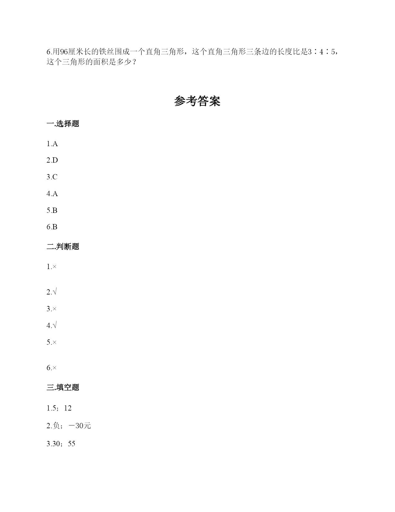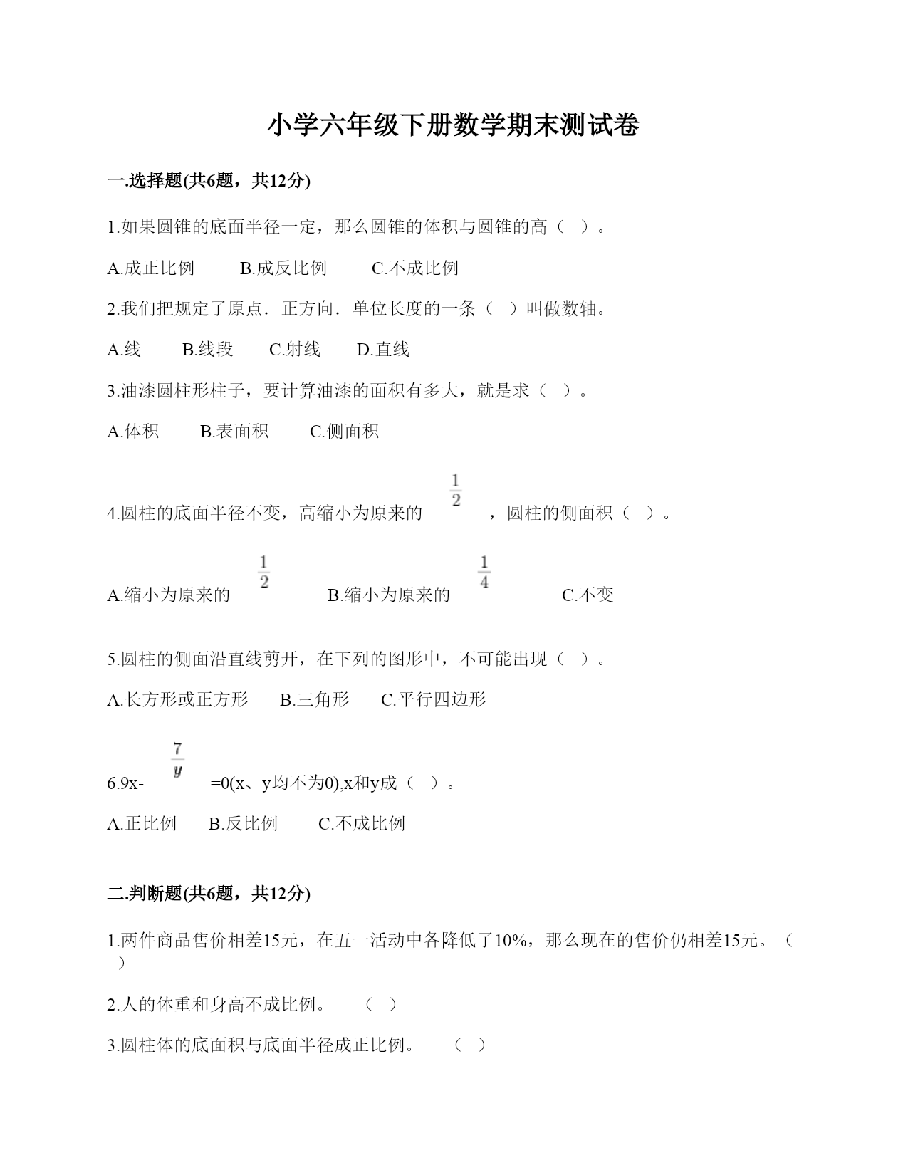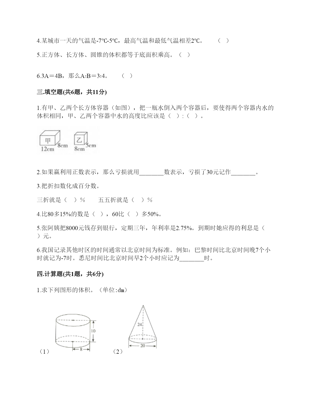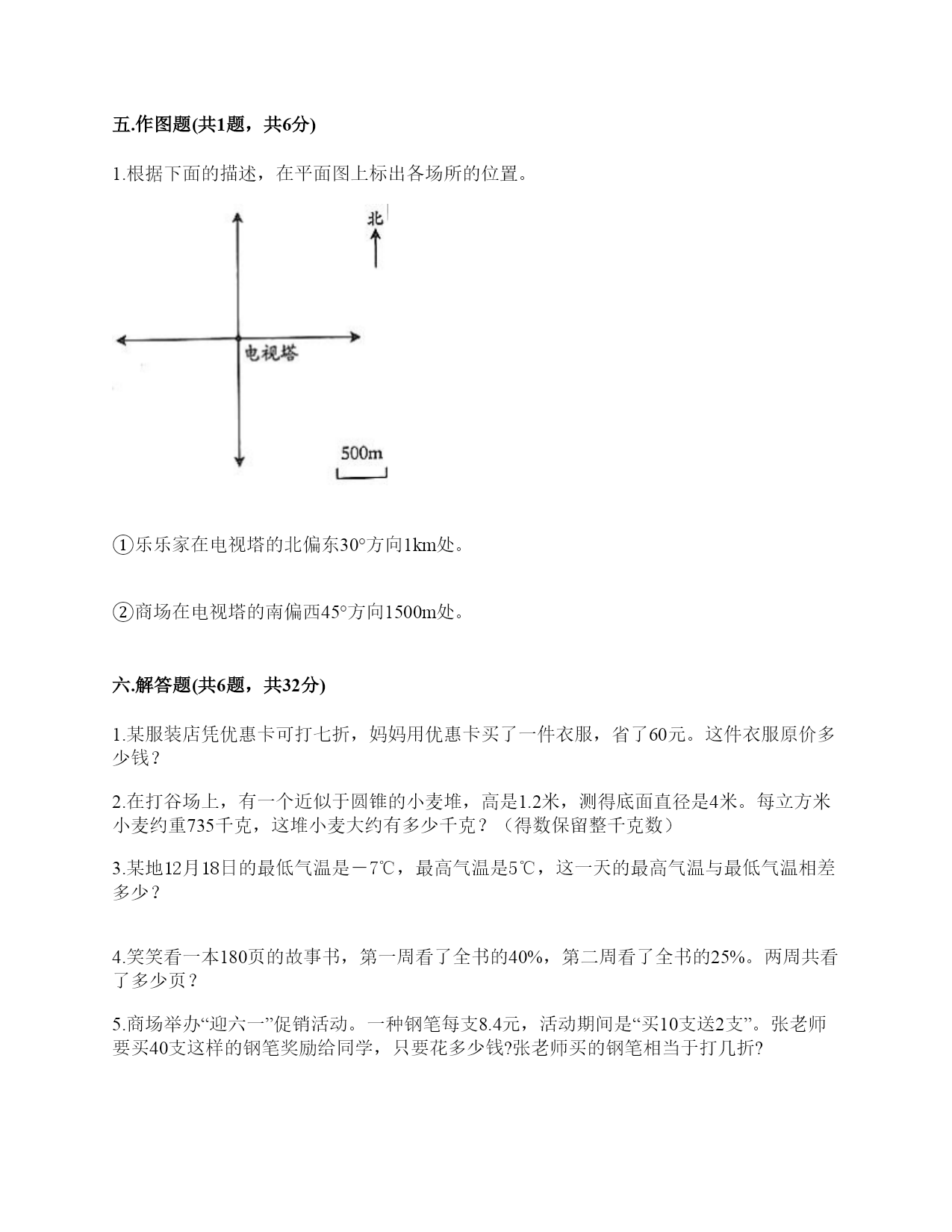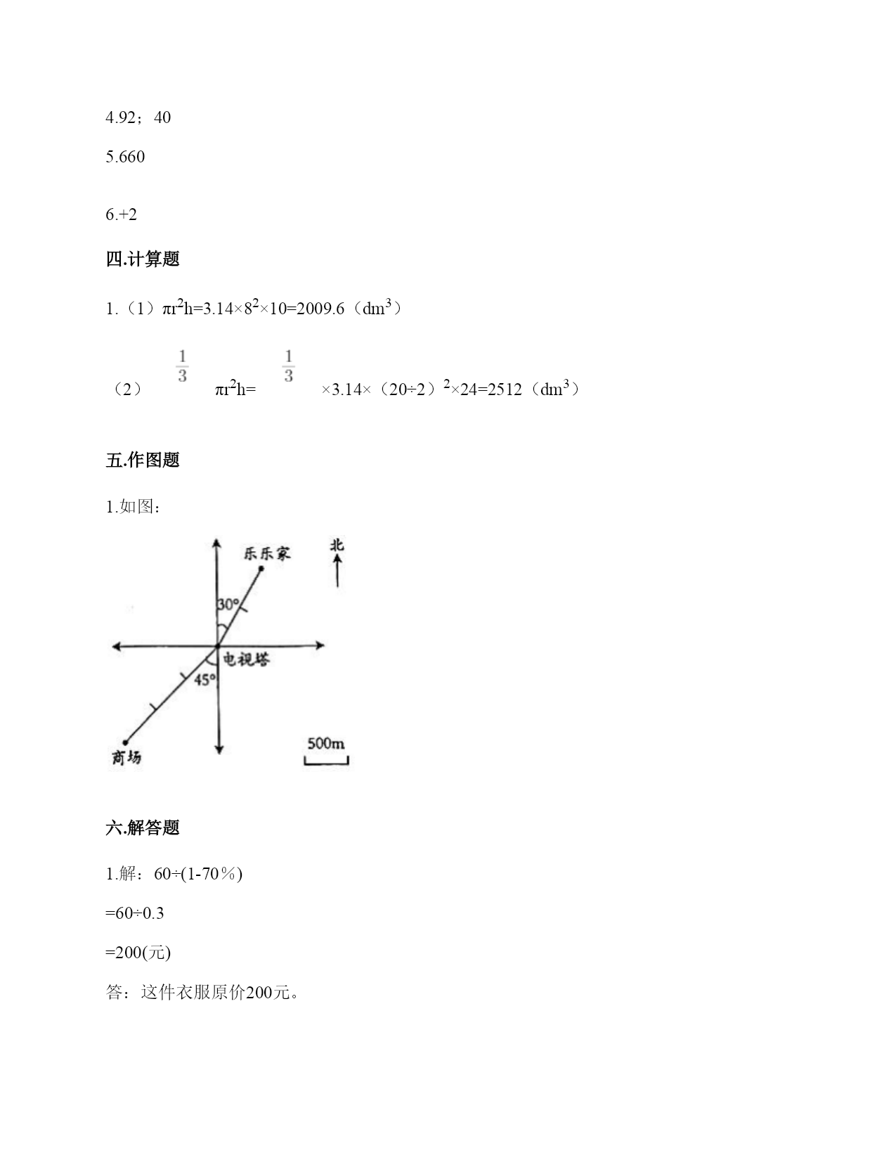 小学六年级下册数学期末测试卷一.选择题(共6题,共12分)1.如果圆锥的底面半径一定,那么圆锥的体积与圆锥的高()。A.成正比例B.成反比例C.不成比例2.我们把规定了原点.正方向.单位长度的一条()叫做数轴。A.线B.线段C.射线D.直线3.油漆圆柱形柱子,要计算油漆的面积有多大,就是求()。A.体积B.表面积C.侧面积4.圆柱的底面半径不变,高缩小为原来的,圆柱的侧面积()。A.缩小为原来的B.缩小为原来的C.不变5.圆柱的侧面沿直线剪开,在下列的图形中,不可能出现()。A.长方形或正方形B.三角形C.平行四边形6.9x-=0(x、y均不为0),x和y成()。A.正比例B.反比例C.不成比例二.判断题(共6题,共12分)1.两件商品售价相差15元,在五一活动中各降低了10%,那么现在的售价仍相差15元。()2.人的体重和身高不成比例。()3.圆柱体的底面积与底面半径成正比例。()4.某城市一天的气温是-7℃-5℃,最高气温和最低气温相差2℃。()5.正方体、长方体、圆锥的体积都等于底面积乘高。()6.3A=4B,那么A∶B=3∶4。()三.填空题(共6题,共11分)1.有甲、乙两个长方体容器(如图),把一瓶水倒入两个容器后,要使得两个容器内水的体积相同,甲、乙两个容器中水的高度比应该是():()。2.如果赢利用正数表示,那么亏损就用________数表示,亏损了30元记作________。3.把折扣数化成百分数。三折就是()%五五折就是()%4.比80多15%的数是(),60比()多50%。5.张阿姨把8000元钱存到银行,定期三年,年利率是2.75%。到期时她应得的利息是()元。6.我国记录其他时区的时间通常以北京时间为标准。例如:巴黎时间比北京时间晚7个小时就记为-7时。悉尼时间比北京时间早2个小时应记为________时。四.计算题(共1题,共6分)1.求下列图形的体积。(单位:dm)(1)(2)五.作图题(共1题,共6分)1.根据下面的描述,在平面图上标出各场所的位置。①乐乐家在电视塔的北偏东30°方向1km处。②商场在电视塔的南偏西45°方向1500m处。六.解答题(共6题,共32分)1.某服装店凭优惠卡可打七折,妈妈用优惠卡买了一件衣服,省了60元。这件衣服原价多少钱?2.在打谷场上,有一个近似于圆锥的小麦堆,高是1.2米,测得底面直径是4米。每立方米小麦约重735千克,这堆小麦大约有多少千克?(得数保留整千克数)3.某地12月18日的最低气温是-7℃,最高气温是5℃,这一天的最高气温与最低气温相差多少?4.笑笑看一本180页的故事书,第一周看了全书的40%,第二周看了全书的25%。两周共看了多少页?5.商场举办“迎六一”促销活动。一种钢笔每支8.4元,活动期间是“买10支送2支”。张老师要买40支这样的钢笔奖励给同学,只要花多少钱?张老师买的钢笔相当于打几折?6.用96厘米长的铁丝围成一个直角三角形,这个直角三角形三条边的长度比是3∶4∶5,这个三角形的面积是多少?参考答案一.选择题1.A2.D3.C4.A5.B6.B二.判断题1.×2.√3.×4.√5.×6.×三.填空题1.5;122.负;-30元3.30;554.92;405.6606.+2四.计算题1.(1)πr2h=3.14×82×10=2009.6(dm3)(2)πr2h=×3.14×(20÷2)2×24=2512(dm3)五.作图题1.如图:六.解答题1.解:60÷(1-70%)=60÷0.3=200(元)答:这件衣服原价200元。2.×3.14×(4÷2)×1.2=5.024(立方米)5.024×735≈3693(千克)答:这堆麦子大约重量是3693千克。3.12℃4.180×40%+180×25%=180×(40%+25%)=180×65%=117(页)答:两周共看了117页。5.解:买30支送6支.再买4支,8.4×(30+4)=8.4×34=285.6(元)285.6÷(8.4×40)=285.6÷336=85%答;只要花285.6元;相当于打八五折。6.96×=24(厘米)96×=32(厘米)24×32÷2=384(平方厘米)