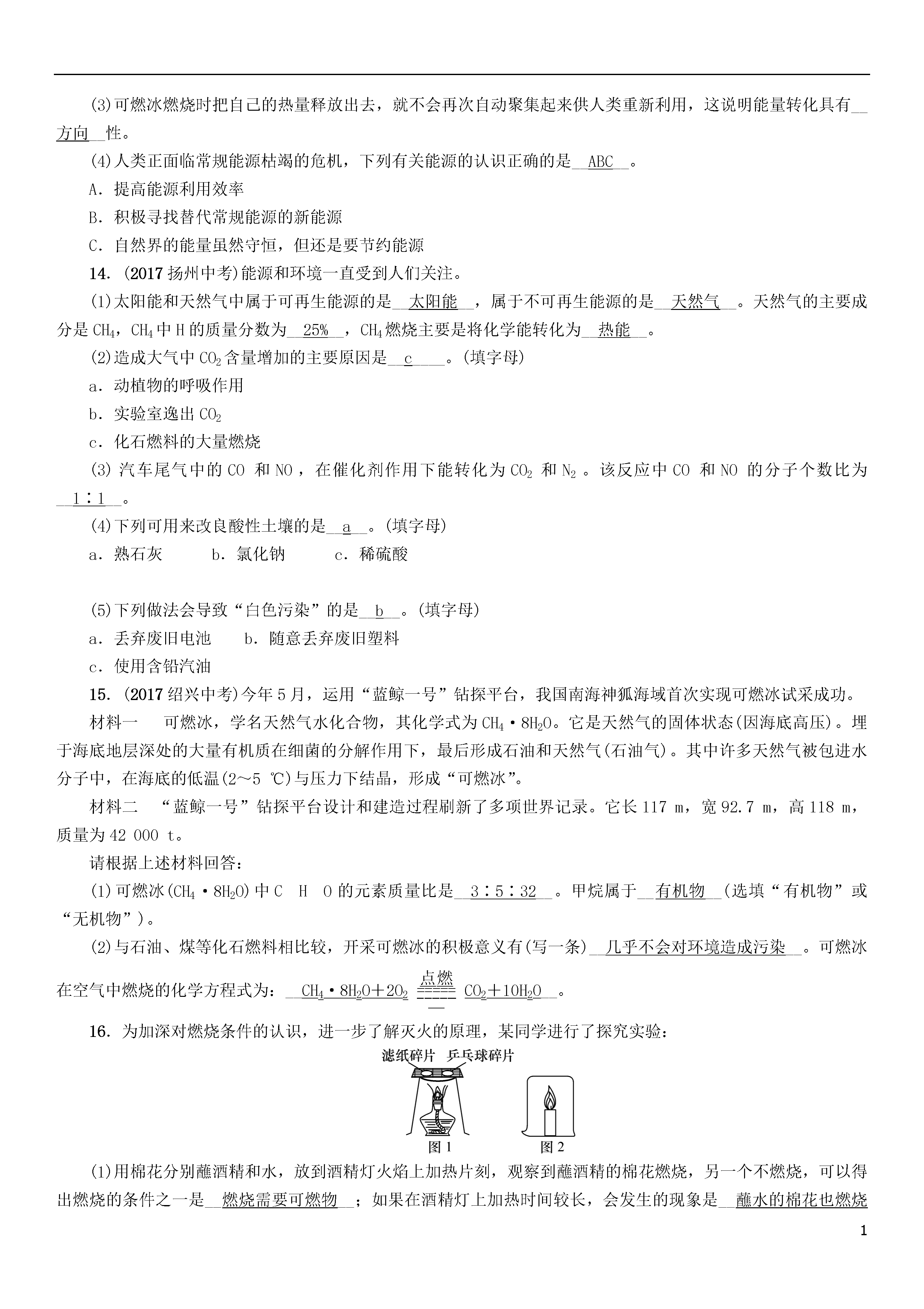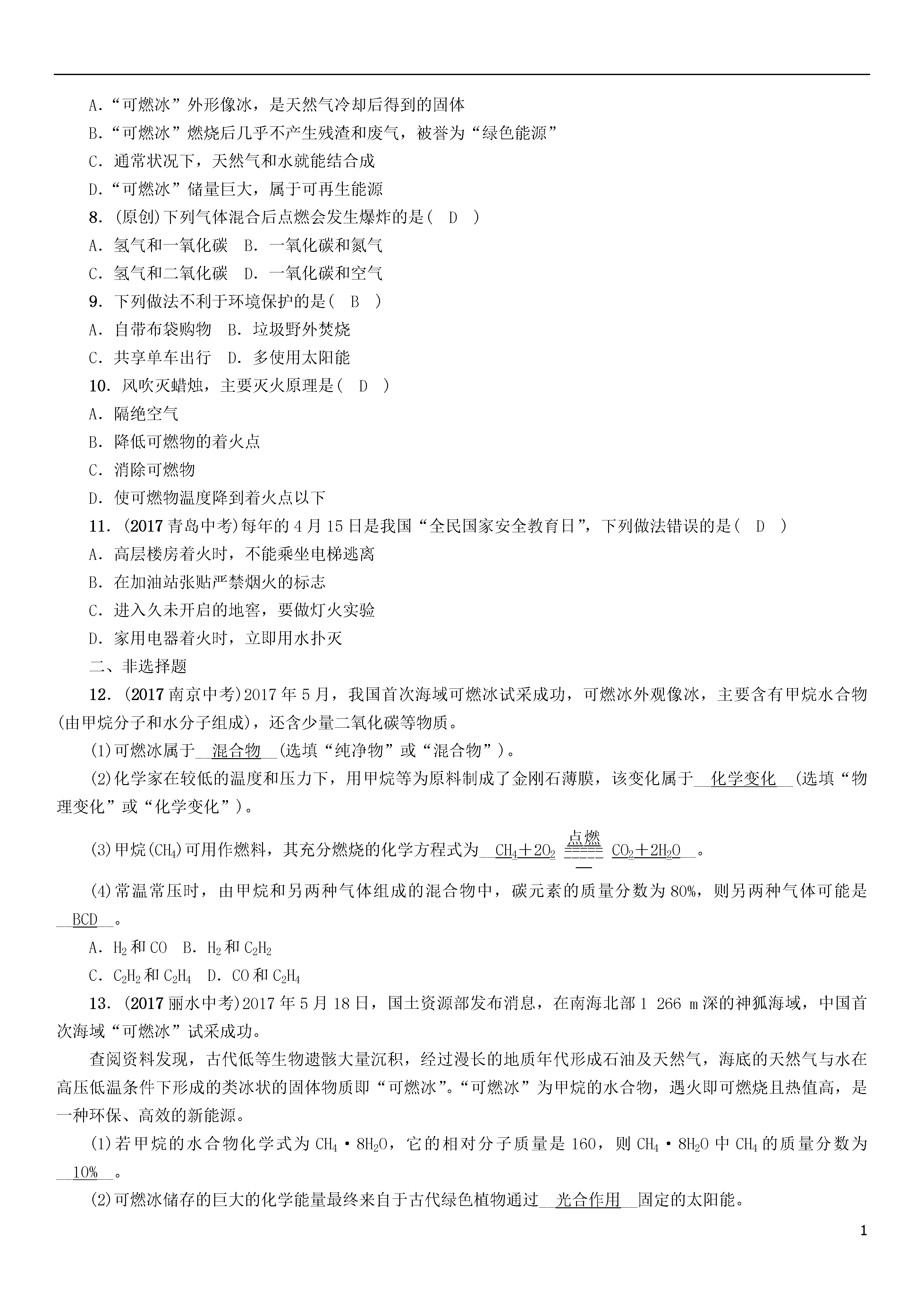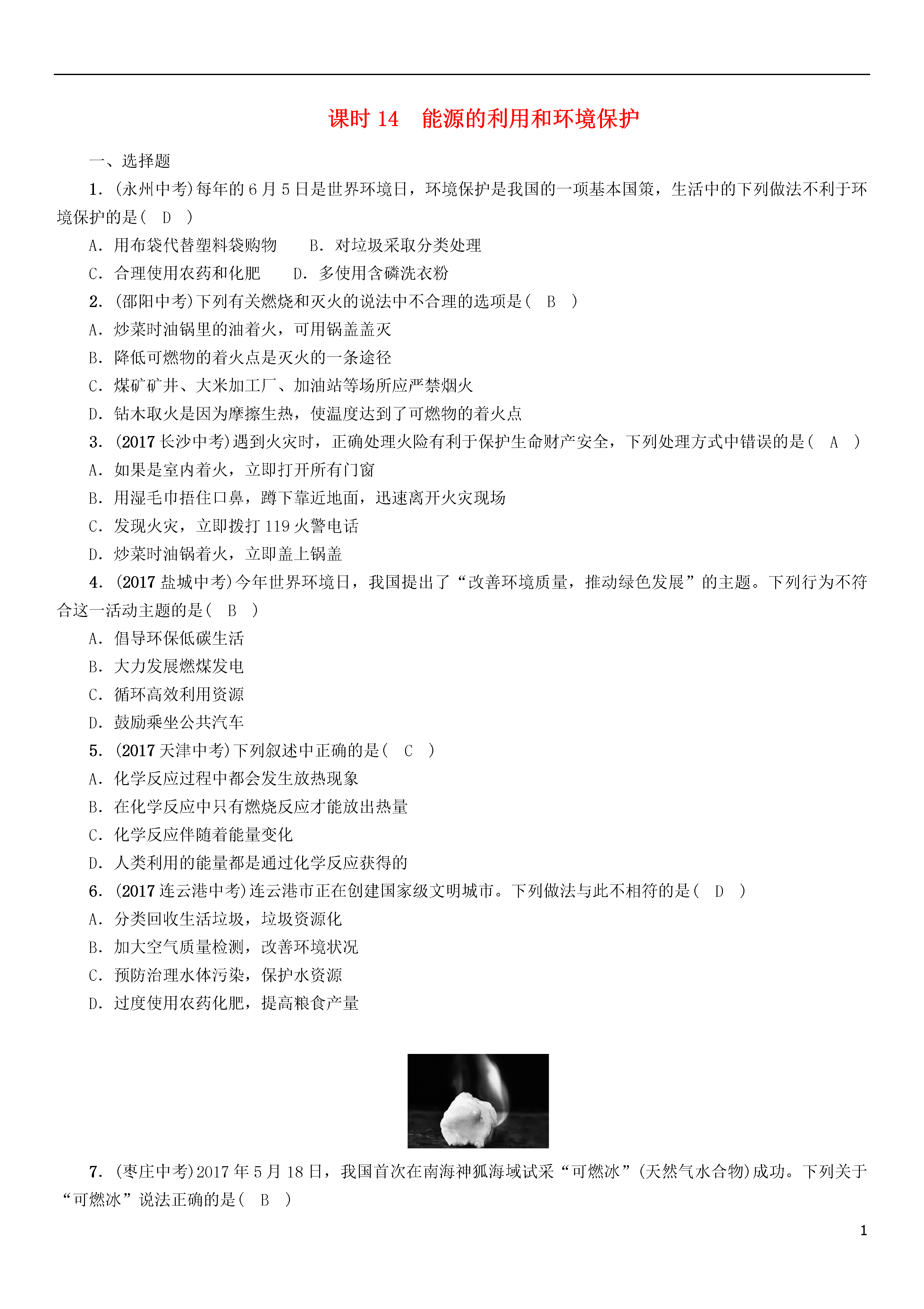 1课时14能源的利用和环境保护一、选择题1.(永州中考)每年的6月5日是世界环境日,环境保护是我国的一项基本国策,生活中的下列做法不利于环境保护的是(D)A.用布袋代替塑料袋购物B.对垃圾采取分类处理C.合理使用农药和化肥D.多使用含磷洗衣粉2.(邵阳中考)下列有关燃烧和灭火的说法中不合理的选项是(B)A.炒菜时油锅里的油着火,可用锅盖盖灭B.降低可燃物的着火点是灭火的一条途径C.煤矿矿井、大米加工厂、加油站等场所应严禁烟火D.钻木取火是因为摩擦生热,使温度达到了可燃物的着火点3.(2017长沙中考)遇到火灾时,正确处理火险有利于保护生命财产安全,下列处理方式中错误的是(A)A.如果是室内着火,立即打开所有门窗B.用湿毛巾捂住口鼻,蹲下靠近地面,迅速离开火灾现场C.发现火灾,立即拨打119火警电话D.炒菜时油锅着火,立即盖上锅盖4.(2017盐城中考)今年世界环境日,我国提出了“改善环境质量,推动绿色发展”的主题。下列行为不符合这一活动主题的是(B)A.倡导环保低碳生活B.大力发展燃煤发电C.循环高效利用资源D.鼓励乘坐公共汽车5.(2017天津中考)下列叙述中正确的是(C)A.化学反应过程中都会发生放热现象B.在化学反应中只有燃烧反应才能放出热量C.化学反应伴随着能量变化D.人类利用的能量都是通过化学反应获得的6.(2017连云港中考)连云港市正在创建国家级文明城市。下列做法与此不相符的是(D)A.分类回收生活垃圾,垃圾资源化B.加大空气质量检测,改善环境状况C.预防治理水体污染,保护水资源D.过度使用农药化肥,提高粮食产量7.(枣庄中考)2017年5月18日,我国首次在南海神狐海域试采“可燃冰”(天然气水合物)成功。下列关于“可燃冰”说法正确的是(B)A.“可燃冰”外形像冰,是天然气冷却后得到的固体B.“可燃冰”燃烧后几乎不产生残渣和废气,被誉为“绿色能源”C.通常状况下,天然气和水就能结合成D.“可燃冰”储量巨大,属于可再生能源8.(原创)下列气体混合后点燃会发生爆炸的是(D)A.氢气和一氧化碳B.一氧化碳和氮气C.氢气和二氧化碳D.一氧化碳和空气9.下列做法不利于环境保护的是(B)A.自带布袋购物B.垃圾野外焚烧C.共享单车出行D.多使用太阳能10.风吹灭蜡烛,主要灭火原理是(D)A.隔绝空气B.降低可燃物的着火点C.消除可燃物D.使可燃物温度降到着火点以下11.(2017青岛中考)每年的4月15日是我国“全民国家安全教育日”,下列做法错误的是(D)A.高层楼房着火时,不能乘坐电梯逃离B.在加油站张贴严禁烟火的标志C.进入久未开启的地窖,要做灯火实验D.家用电器着火时,立即用水扑灭二、非选择题12.(2017南京中考)2017年5月,我国首次海域可燃冰试采成功,可燃冰外观像冰,主要含有甲烷水合物(由甲烷分子和水分子组成),还含少量二氧化碳等物质。(1)可燃冰属于__混合物__(选填“纯净物”或“混合物”)。(2)化学家在较低的温度和压力下,用甲烷等为原料制成了金刚石薄膜,该变化属于__化学变化__(选填“物理变化”或“化学变化”)。(3)甲烷(CH4)可用作燃料,其充分燃烧的化学方程式为__CH4+2O2eq\o(=====,\s\up7(点燃))CO2+2H2O__。(4)常温常压时,由甲烷和另两种气体组成的混合物中,碳元素的质量分数为80%,则另两种气体可能是__BCD__。A.H2和COB.H2和C2H2C.C2H2和C2H4D.CO和C2H413.(2017丽水中考)2017年5月18日,国土资源部发布消息,在南海北部1266m深的神狐海域,中国首次海域“可燃冰”试采成功。查阅资料发现,古代低等生物遗骸大量沉积,经过漫长的地质年代形成石油及天然气,海底的天然气与水在高压低温条件下形成的类冰状的固体物质即“可燃冰”。“可燃冰”为甲烷的水合物,遇火即可燃烧且热值高,是一种环保、高效的新能源。(1)若甲烷的水合物化学式为CH4·8H2O,它的相对分子质量是160,则CH4·8H2O中CH4的质量分数为__10%__。(2)可燃冰储存的巨大的化学能量最终来自于古代绿色植物通过__光合作用__固定的太阳能。(3)可燃冰燃烧时把自己的热量释放出去,就不会再次自动聚集起来供人类重新利用,这说明能量转化具有__方向__性。(4)人类正面临常规能源枯竭的危机,下列有关能源的认识正确的是__ABC__。A.提高能源利用效率B.积极寻找替代常规能源的新能源C.自然界的能量虽然守恒,但还是要节约能源14.(2017扬州中考)能源和环境一直受到人们关注。(1)太阳能和天然气中
