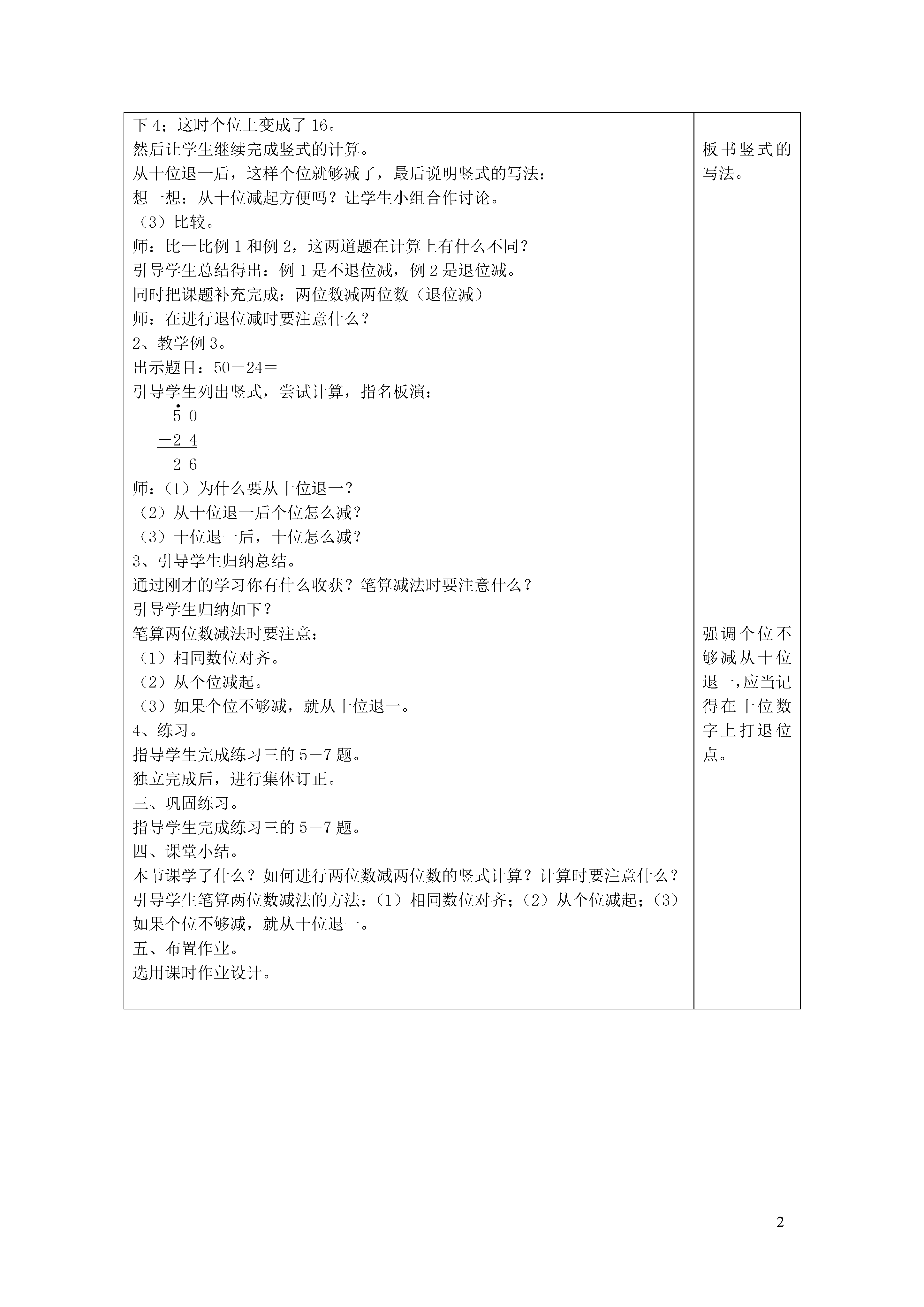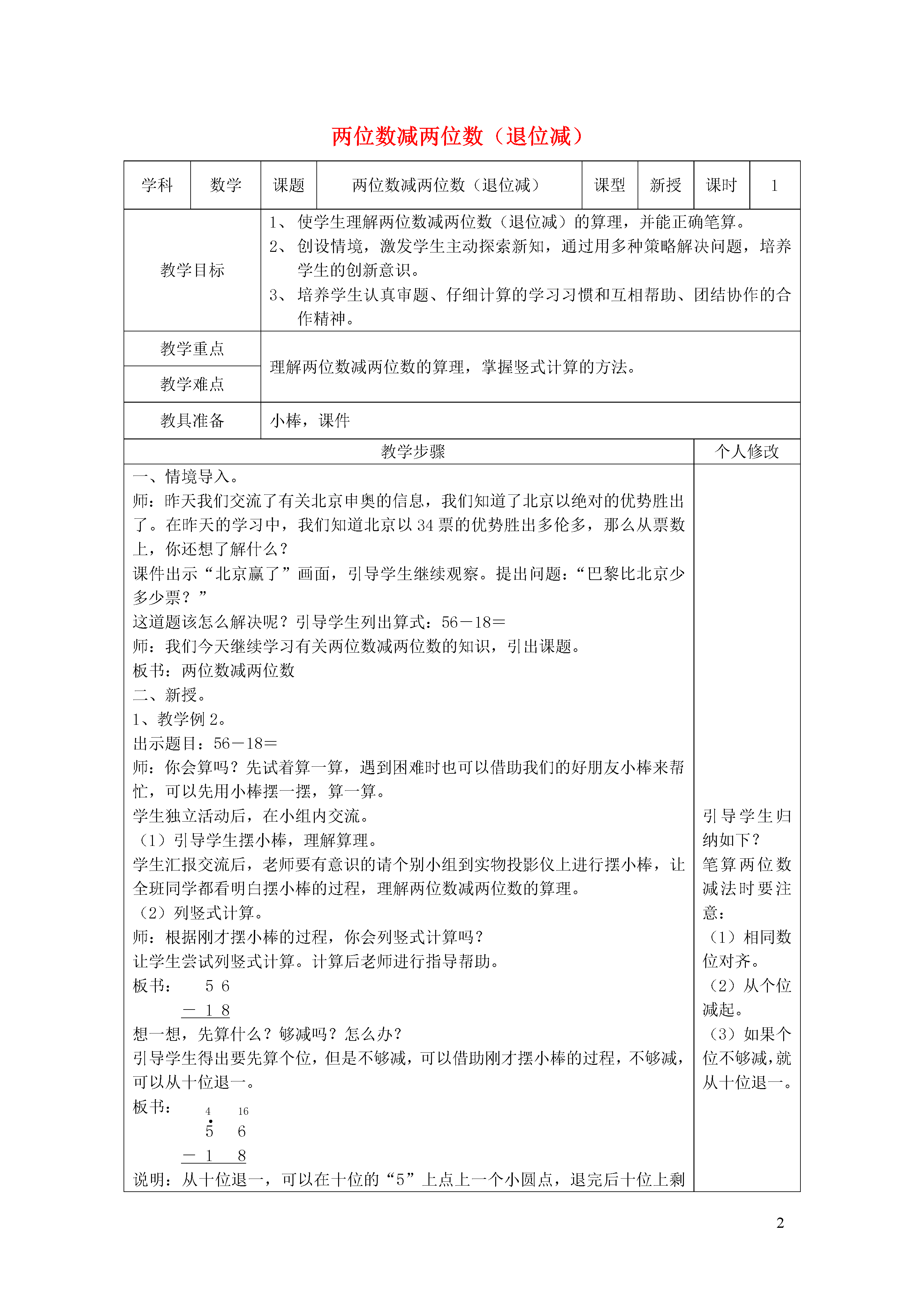 2两位数减两位数(退位减)学科数学课题两位数减两位数(退位减)课型新授课时1教学目标使学生理解两位数减两位数(退位减)的算理,并能正确笔算。创设情境,激发学生主动探索新知,通过用多种策略解决问题,培养学生的创新意识。培养学生认真审题、仔细计算的学习习惯和互相帮助、团结协作的合作精神。教学重点理解两位数减两位数的算理,掌握竖式计算的方法。教学难点教具准备小棒,课件教学步骤个人修改一、情境导入。师:昨天我们交流了有关北京申奥的信息,我们知道了北京以绝对的优势胜出了。在昨天的学习中,我们知道北京以34票的优势胜出多伦多,那么从票数上,你还想了解什么?课件出示“北京赢了”画面,引导学生继续观察。提出问题:“巴黎比北京少多少票?”这道题该怎么解决呢?引导学生列出算式:56-18=师:我们今天继续学习有关两位数减两位数的知识,引出课题。板书:两位数减两位数二、新授。1、教学例2。出示题目:56-18=师:你会算吗?先试着算一算,遇到困难时也可以借助我们的好朋友小棒来帮忙,可以先用小棒摆一摆,算一算。学生独立活动后,在小组内交流。(1)引导学生摆小棒,理解算理。学生汇报交流后,老师要有意识的请个别小组到实物投影仪上进行摆小棒,让全班同学都看明白摆小棒的过程,理解两位数减两位数的算理。(2)列竖式计算。师:根据刚才摆小棒的过程,你会列竖式计算吗?让学生尝试列竖式计算。计算后老师进行指导帮助。板书:56-18想一想,先算什么?够减吗?怎么办?引导学生得出要先算个位,但是不够减,可以借助刚才摆小棒的过程,不够减,可以从十位退一。板书:41656-18说明:从十位退一,可以在十位的“5”上点上一个小圆点,退完后十位上剩下4;这时个位上变成了16。然后让学生继续完成竖式的计算。从十位退一后,这样个位就够减了,最后说明竖式的写法:想一想:从十位减起方便吗?让学生小组合作讨论。(3)比较。师:比一比例1和例2,这两道题在计算上有什么不同?引导学生总结得出:例1是不退位减,例2是退位减。同时把课题补充完成:两位数减两位数(退位减)师:在进行退位减时要注意什么?2、教学例3。出示题目:50-24=引导学生列出竖式,尝试计算,指名板演:50-2426师:(1)为什么要从十位退一?(2)从十位退一后个位怎么减?(3)十位退一后,十位怎么减?3、引导学生归纳总结。通过刚才的学习你有什么收获?笔算减法时要注意什么?引导学生归纳如下?笔算两位数减法时要注意:(1)相同数位对齐。(2)从个位减起。(3)如果个位不够减,就从十位退一。4、练习。指导学生完成练习三的5-7题。独立完成后,进行集体订正。三、巩固练习。指导学生完成练习三的5-7题。四、课堂小结。本节课学了什么?如何进行两位数减两位数的竖式计算?计算时要注意什么?引导学生笔算两位数减法的方法:(1)相同数位对齐;(2)从个位减起;(3)如果个位不够减,就从十位退一。五、布置作业。选用课时作业设计。引导学生归纳如下?笔算两位数减法时要注意:(1)相同数位对齐。(2)从个位减起。(3)如果个位不够减,就从十位退一。板书竖式的写法。强调个位不够减从十位退一,应当记得在十位数字上打退位点。
