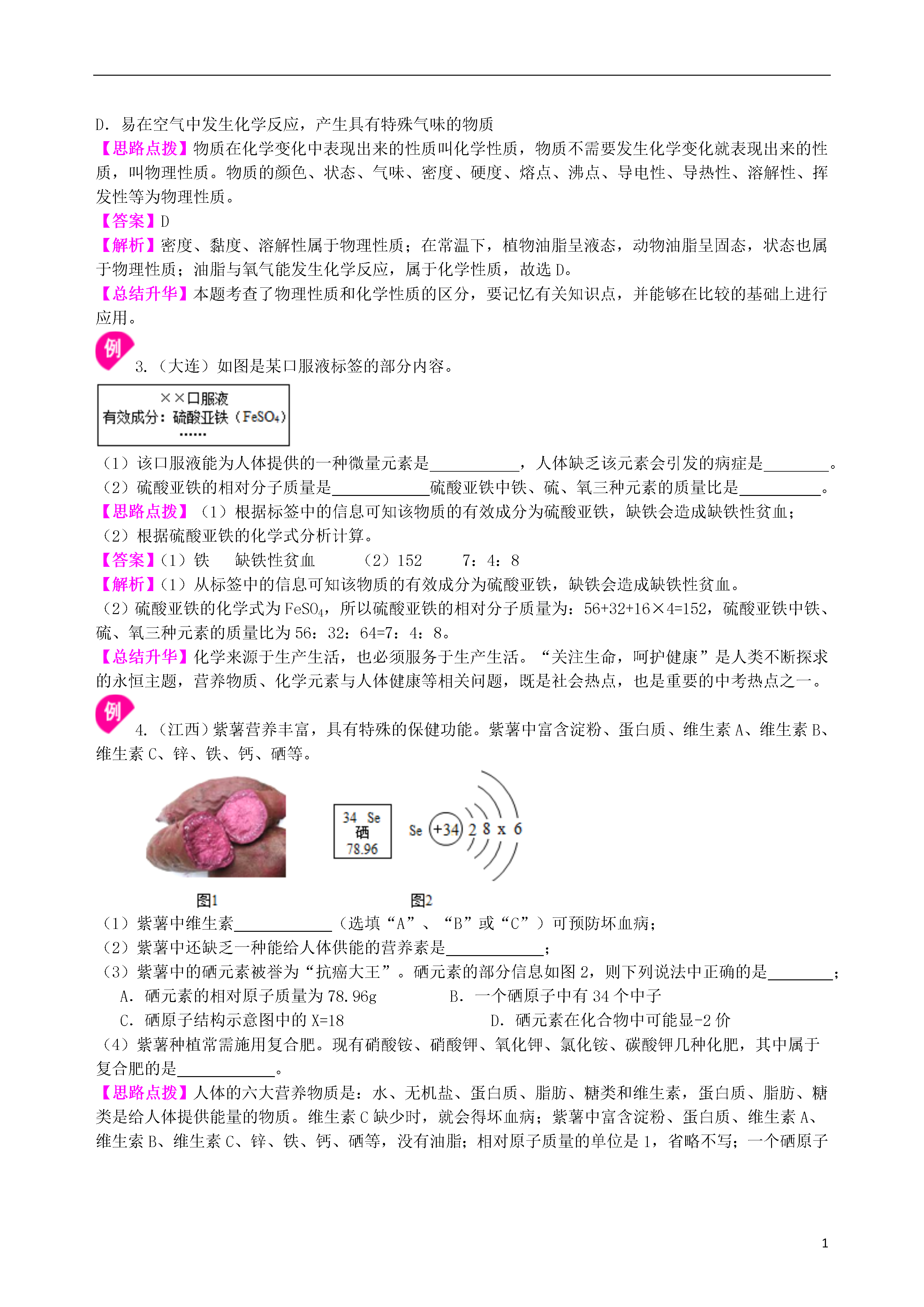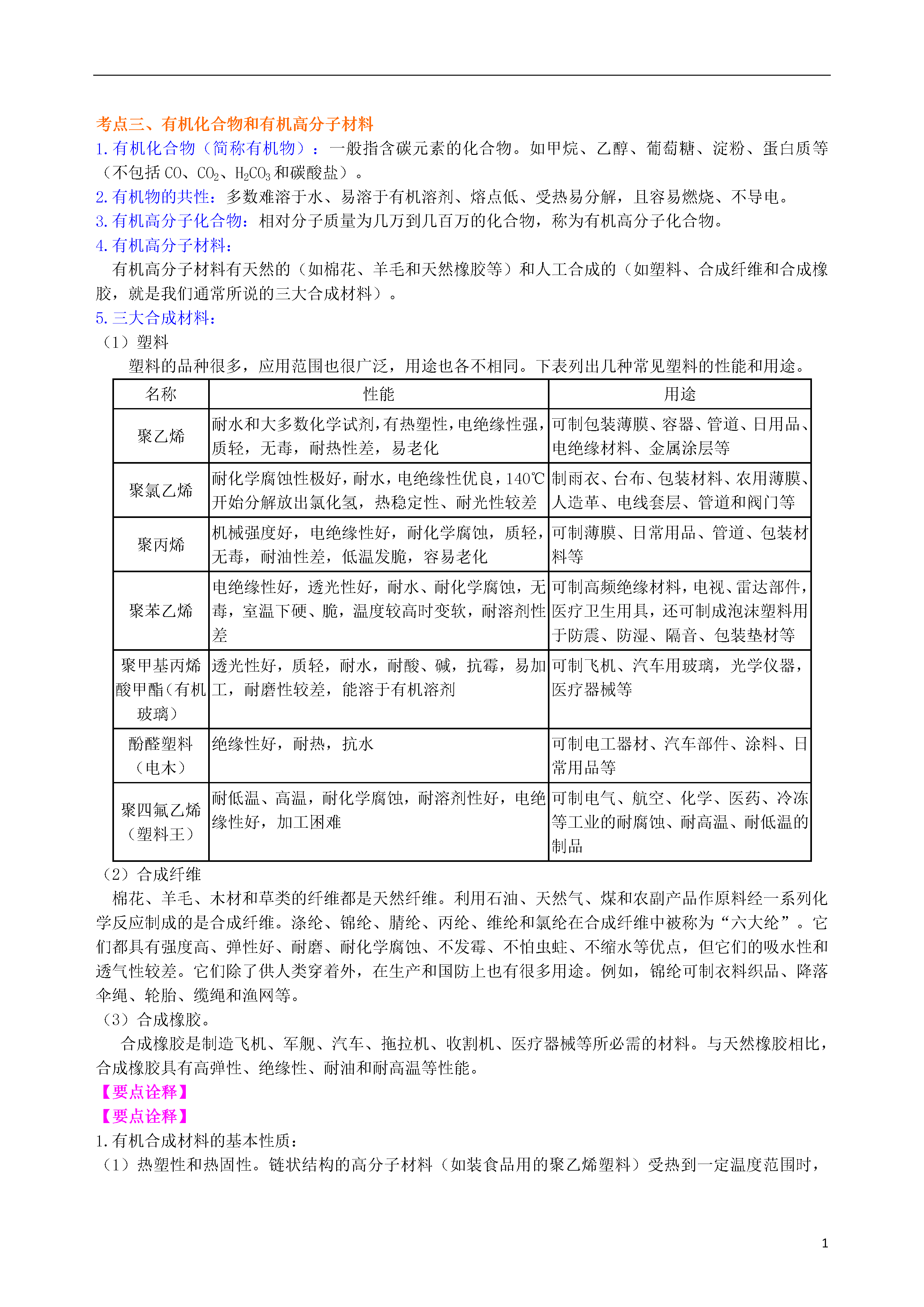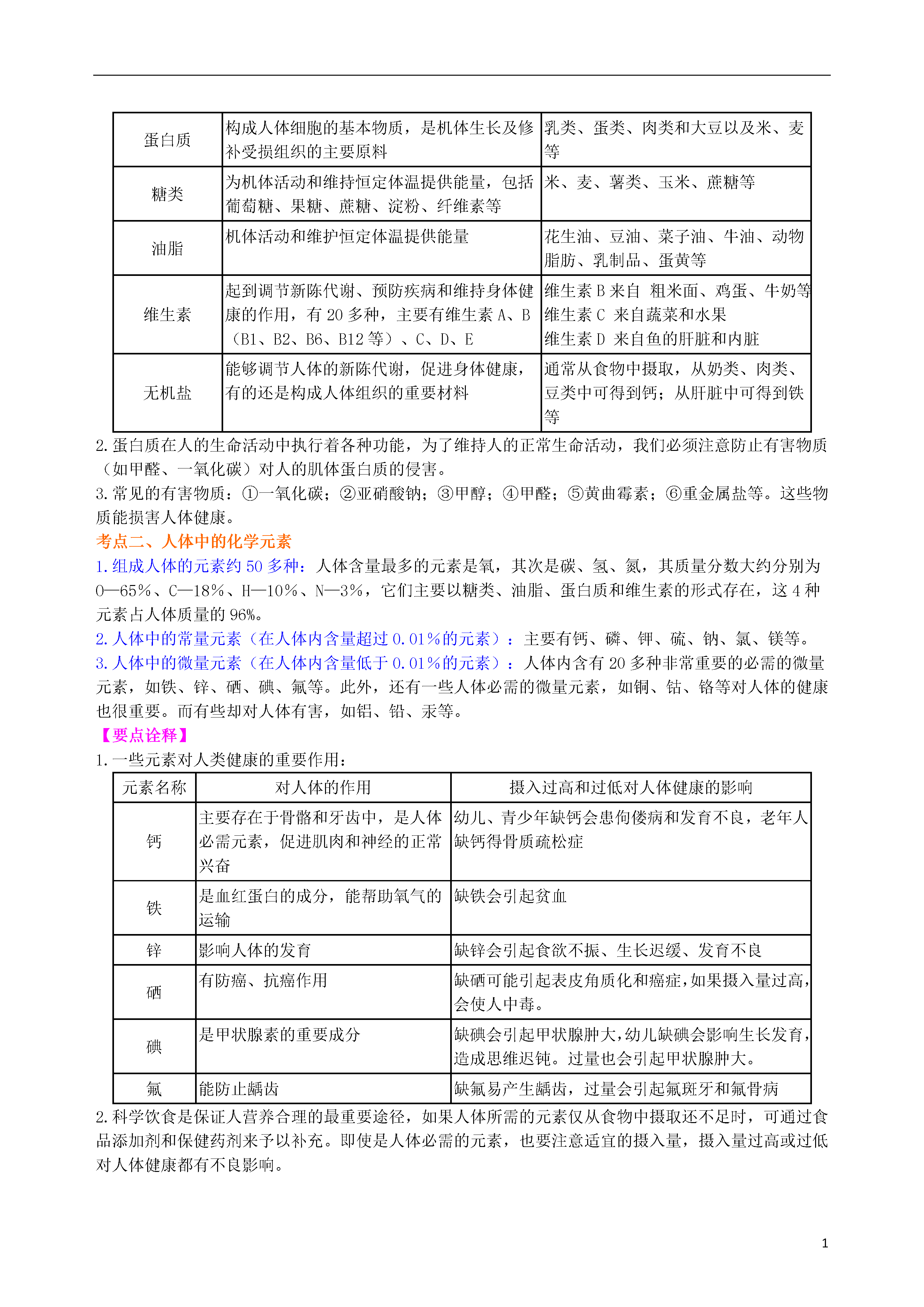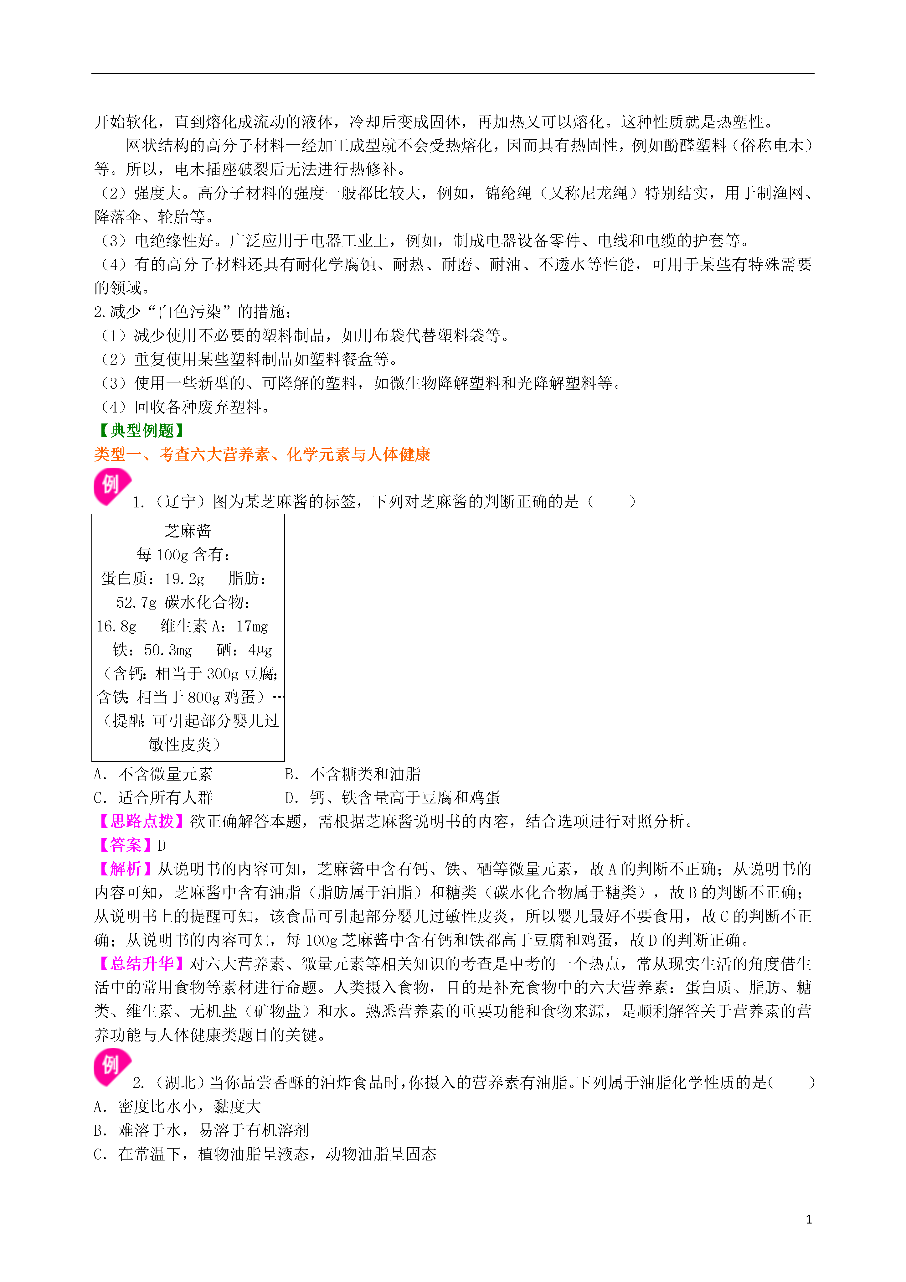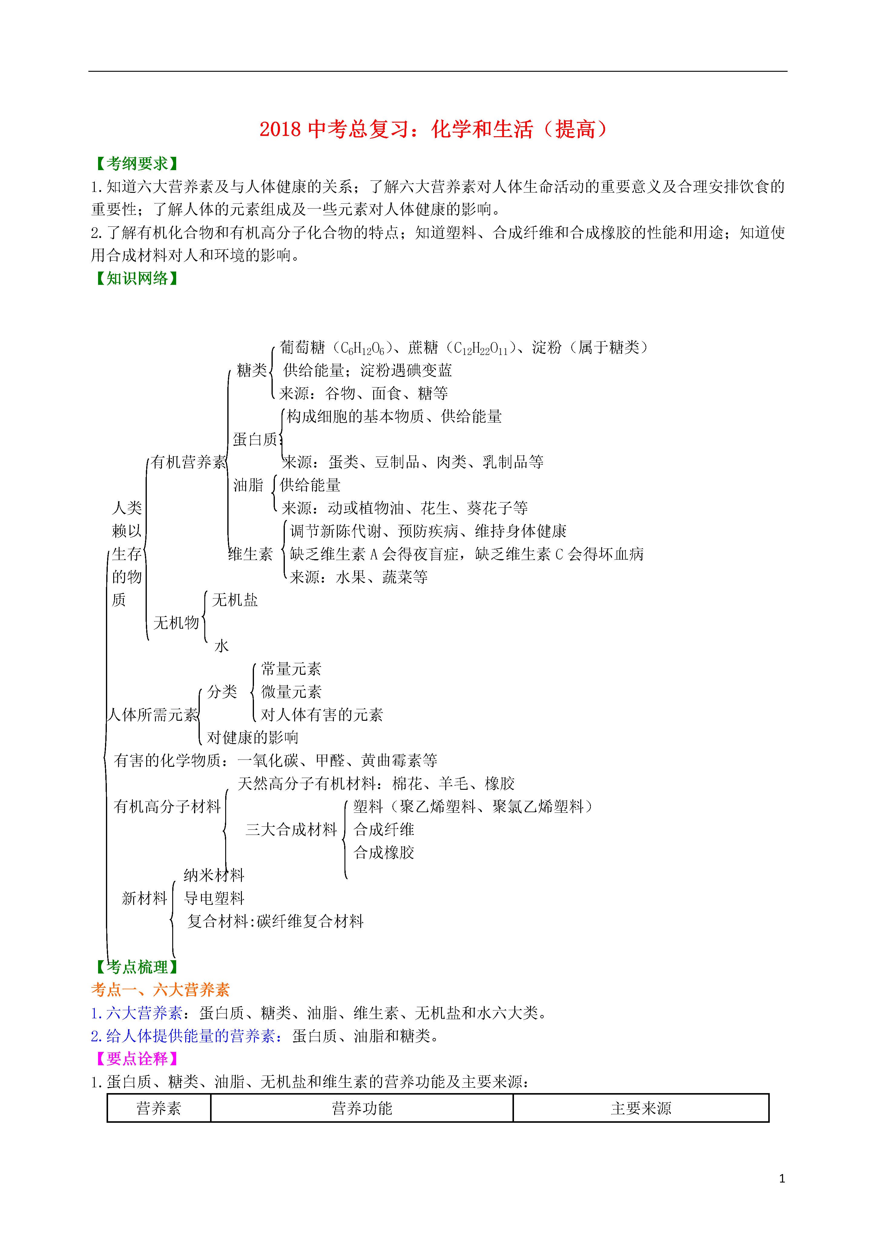 12018中考总复习:化学和生活(提高)【考纲要求】1.知道六大营养素及与人体健康的关系;了解六大营养素对人体生命活动的重要意义及合理安排饮食的重要性;了解人体的元素组成及一些元素对人体健康的影响。2.了解有机化合物和有机高分子化合物的特点;知道塑料、合成纤维和合成橡胶的性能和用途;知道使用合成材料对人和环境的影响。【知识网络】葡萄糖(C6H12O6)、蔗糖(C12H22O11)、淀粉(属于糖类)糖类供给能量;淀粉遇碘变蓝来源:谷物、面食、糖等构成细胞的基本物质、供给能量蛋白质:有机营养素来源:蛋类、豆制品、肉类、乳制品等油脂供给能量人类来源:动或植物油、花生、葵花子等赖以调节新陈代谢、预防疾病、维持身体健康生存维生素缺乏维生素A会得夜盲症,缺乏维生素C会得坏血病的物来源:水果、蔬菜等质无机盐无机物水常量元素分类微量元素人体所需元素对人体有害的元素对健康的影响有害的化学物质:一氧化碳、甲醛、黄曲霉素等天然高分子有机材料:棉花、羊毛、橡胶有机高分子材料塑料(聚乙烯塑料、聚氯乙烯塑料)三大合成材料合成纤维合成橡胶纳米材料新材料导电塑料复合材料:碳纤维复合材料【考点梳理】考点一、六大营养素1.六大营养素:蛋白质、糖类、油脂、维生素、无机盐和水六大类。2.给人体提供能量的营养素:蛋白质、油脂和糖类。【要点诠释】1.蛋白质、糖类、油脂、无机盐和维生素的营养功能及主要来源:营养素营养功能主要来源蛋白质构成人体细胞的基本物质,是机体生长及修补受损组织的主要原料乳类、蛋类、肉类和大豆以及米、麦等糖类为机体活动和维持恒定体温提供能量,包括葡萄糖、果糖、蔗糖、淀粉、纤维素等米、麦、薯类、玉米、蔗糖等油脂机体活动和维护恒定体温提供能量花生油、豆油、菜子油、牛油、动物脂肪、乳制品、蛋黄等维生素起到调节新陈代谢、预防疾病和维持身体健康的作用,有20多种,主要有维生素A、B(B1、B2、B6、B12等)、C、D、E维生素B来自粗米面、鸡蛋、牛奶等维生素C来自蔬菜和水果维生素D来自鱼的肝脏和内脏无机盐能够调节人体的新陈代谢,促进身体健康,有的还是构成人体组织的重要材料通常从食物中摄取,从奶类、肉类、豆类中可得到钙;从肝脏中可得到铁等2.蛋白质在人的生命活动中执行着各种功能,为了维持人的正常生命活动,我们必须注意防止有害物质(如甲醛、一氧化碳)对人的肌体蛋白质的侵害。3.常见的有害物质:①一氧化碳;②亚硝酸钠;③甲醇;④甲醛;⑤黄曲霉素;⑥重金属盐等。这些物质能损害人体健康。考点二、人体中的化学元素1.组成人体的元素约50多种:人体含量最多的元素是氧,其次是碳、氢、氮,其质量分数大约分别为O—65%、C—18%、H—10%、N—3%,它们主要以糖类、油脂、蛋白质和维生素的形式存在,这4种元素占人体质量的96%。2.人体中的常量元素(在人体内含量超过0.01%的元素):主要有钙、磷、钾、硫、钠、氯、镁等。3.人体中的微量元素(在人体内含量低于0.01%的元素):人体内含有20多种非常重要的必需的微量元素,如铁、锌、硒、碘、氟等。此外,还有一些人体必需的微量元素,如铜、钴、铬等对人体的健康也很重要。而有些却对人体有害,如铝、铅、汞等。【要点诠释】1.一些元素对人类健康的重要作用:元素名称对人体的作用摄入过高和过低对人体健康的影响钙主要存在于骨骼和牙齿中,是人体必需元素,促进肌肉和神经的正常兴奋幼儿、青少年缺钙会患佝偻病和发育不良,老年人缺钙得骨质疏松症铁是血红蛋白的成分,能帮助氧气的运输缺铁会引起贫血锌影响人体的发育缺锌会引起食欲不振、生长迟缓、发育不良硒有防癌、抗癌作用缺硒可能引起表皮角质化和癌症,如果摄入量过高,会使人中毒。碘是甲状腺素的重要成分缺碘会引起甲状腺肿大,幼儿缺碘会影响生长发育,造成思维迟钝。过量也会引起甲状腺肿大。氟能防止龋齿缺氟易产生龋齿,过量会引起氟斑牙和氟骨病2.科学饮食是保证人营养合理的最重要途径,如果人体所需的元素仅从食物中摄取还不足时,可通过食品添加剂和保健药剂来予以补充。即使是人体必需的元素,也要注意适宜的摄入量,摄入量过高或过低对人体健康都有不良影响。考点三、有机化合物和有机高分子材料1.有机化合物(简称有机物):一般指含碳元素的化合物。如甲烷、乙醇、葡萄糖、淀粉、蛋白质等(不包括CO、CO2、H2CO3和碳酸盐)。2.有机物的共性:多数难溶于水、易溶于有机溶剂、熔点低、受热易分解,且容易燃烧、不导电。3.有机高分子化合物:相对分子质量为几万到几百万的化合物,称为有机高分子化合物。4.有机高分子材料:有机高分子材料有天然的(如棉花、羊毛和天然橡胶等)和人工合成的(如塑料、合成纤维和合成橡胶,就是我们通常所说的三大合成材料)。5.