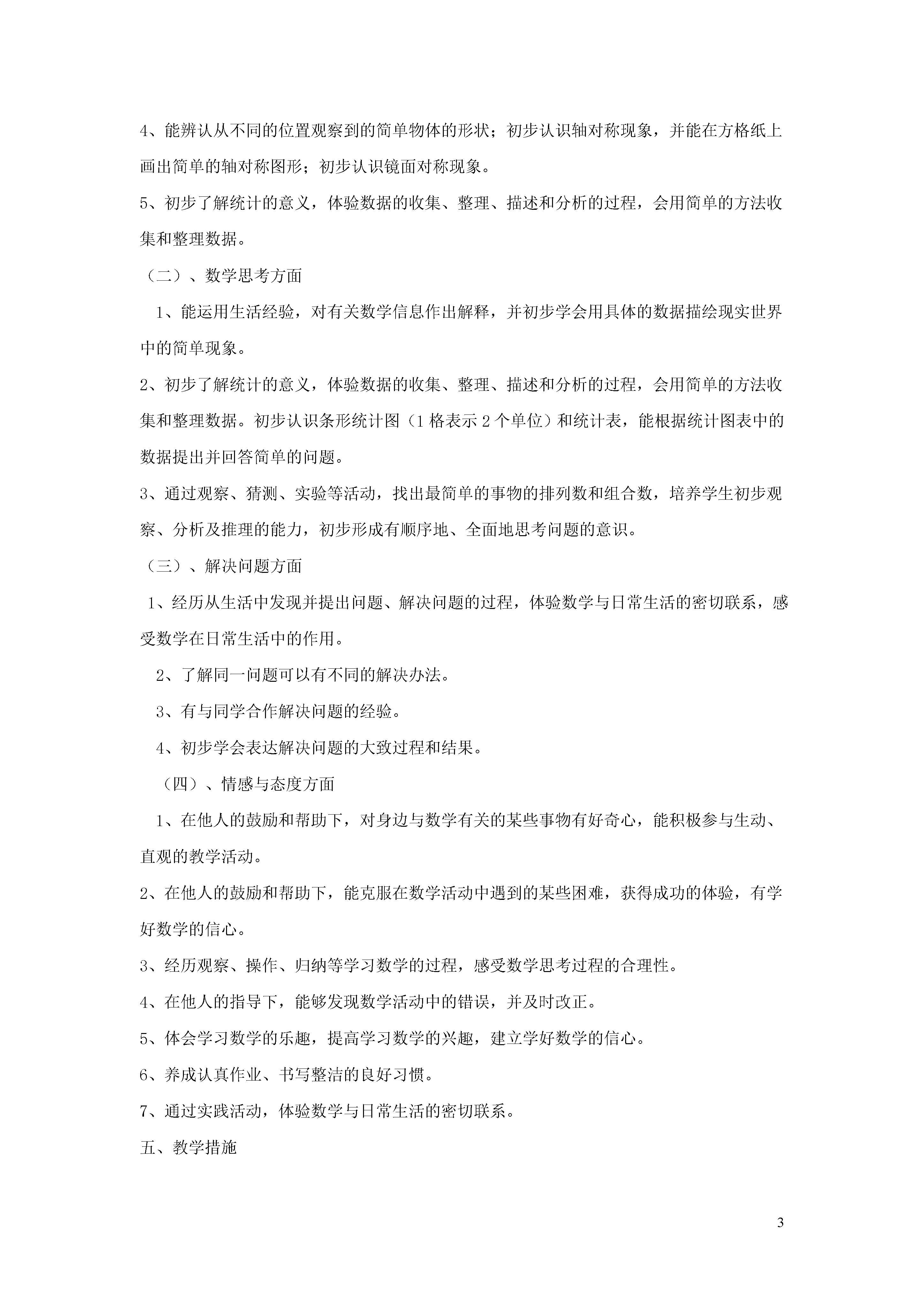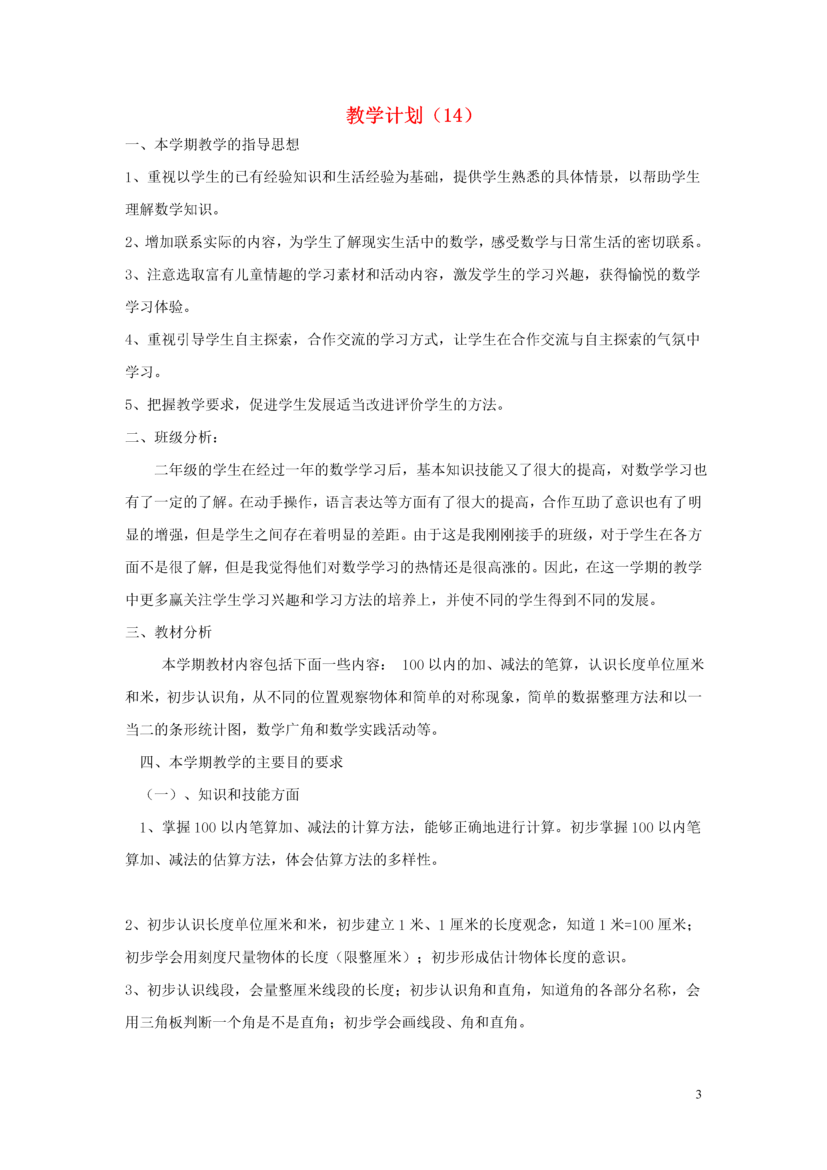 3教学计划(14)一、本学期教学的指导思想1、重视以学生的已有经验知识和生活经验为基础,提供学生熟悉的具体情景,以帮助学生理解数学知识。2、增加联系实际的内容,为学生了解现实生活中的数学,感受数学与日常生活的密切联系。3、注意选取富有儿童情趣的学习素材和活动内容,激发学生的学习兴趣,获得愉悦的数学学习体验。4、重视引导学生自主探索,合作交流的学习方式,让学生在合作交流与自主探索的气氛中学习。5、把握教学要求,促进学生发展适当改进评价学生的方法。二、班级分析:二年级的学生在经过一年的数学学习后,基本知识技能又了很大的提高,对数学学习也有了一定的了解。在动手操作,语言表达等方面有了很大的提高,合作互助了意识也有了明显的增强,但是学生之间存在着明显的差距。由于这是我刚刚接手的班级,对于学生在各方面不是很了解,但是我觉得他们对数学学习的热情还是很高涨的。因此,在这一学期的教学中更多赢关注学生学习兴趣和学习方法的培养上,并使不同的学生得到不同的发展。三、教材分析本学期教材内容包括下面一些内容:100以内的加、减法的笔算,认识长度单位厘米和米,初步认识角,从不同的位置观察物体和简单的对称现象,简单的数据整理方法和以一当二的条形统计图,数学广角和数学实践活动等。四、本学期教学的主要目的要求(一)、知识和技能方面1、掌握100以内笔算加、减法的计算方法,能够正确地进行计算。初步掌握100以内笔算加、减法的估算方法,体会估算方法的多样性。2、初步认识长度单位厘米和米,初步建立1米、1厘米的长度观念,知道1米=100厘米;初步学会用刻度尺量物体的长度(限整厘米);初步形成估计物体长度的意识。3、初步认识线段,会量整厘米线段的长度;初步认识角和直角,知道角的各部分名称,会用三角板判断一个角是不是直角;初步学会画线段、角和直角。4、能辨认从不同的位置观察到的简单物体的形状;初步认识轴对称现象,并能在方格纸上画出简单的轴对称图形;初步认识镜面对称现象。5、初步了解统计的意义,体验数据的收集、整理、描述和分析的过程,会用简单的方法收集和整理数据。(二)、数学思考方面1、能运用生活经验,对有关数学信息作出解释,并初步学会用具体的数据描绘现实世界中的简单现象。2、初步了解统计的意义,体验数据的收集、整理、描述和分析的过程,会用简单的方法收集和整理数据。初步认识条形统计图(1格表示2个单位)和统计表,能根据统计图表中的数据提出并回答简单的问题。3、通过观察、猜测、实验等活动,找出最简单的事物的排列数和组合数,培养学生初步观察、分析及推理的能力,初步形成有顺序地、全面地思考问题的意识。(三)、解决问题方面1、经历从生活中发现并提出问题、解决问题的过程,体验数学与日常生活的密切联系,感受数学在日常生活中的作用。2、了解同一问题可以有不同的解决办法。3、有与同学合作解决问题的经验。4、初步学会表达解决问题的大致过程和结果。(四)、情感与态度方面1、在他人的鼓励和帮助下,对身边与数学有关的某些事物有好奇心,能积极参与生动、直观的教学活动。2、在他人的鼓励和帮助下,能克服在数学活动中遇到的某些困难,获得成功的体验,有学好数学的信心。3、经历观察、操作、归纳等学习数学的过程,感受数学思考过程的合理性。4、在他人的指导下,能够发现数学活动中的错误,并及时改正。5、体会学习数学的乐趣,提高学习数学的兴趣,建立学好数学的信心。6、养成认真作业、书写整洁的良好习惯。7、通过实践活动,体验数学与日常生活的密切联系。五、教学措施1、要从整体上把握教学目标。不光凭经验,过去怎样提,现在也怎样提;也不能搬课本,凡是课本上的有的内容,都作统一的教学要求,而应该根据教学指导纲要,结合教学进行适当的调整。要防止加重学生的学习负担。2、要尊重学生,注重学法渗透。在学习中,教师不要包办代替和以讲代学,要把课堂中更多的时间留给学生探索、交流和练习。3、要注意培养学生的数学概括能力和逻辑思维能力。要重视学生获取知识的思维过程。4、要注重培养学生的计算能力和解答应用题的能力,还诮鼓励学生动用所学的知识解答日常生活和学习中的简单实际问题。激发学生的兴趣,培养学以致用的意识。5、要注意适当渗透一些数学思想和方法,有利于学生对某些数学内容的理解。6、要注意教学的开放性,培养学生的创新意识和实践能力。课本中的一些例题和习题的编排,突出了思考过程,教师在教学时,要引导学生暴露思维过程,鼓励学生多角度思考问题。7、要精心设计教案,注重多媒体的应用,使学生学得愉快,学得轻松,觉得扎实。8、要渗透德育,注重培养学生良好的学习习惯和独立思考、克服困难的精神。