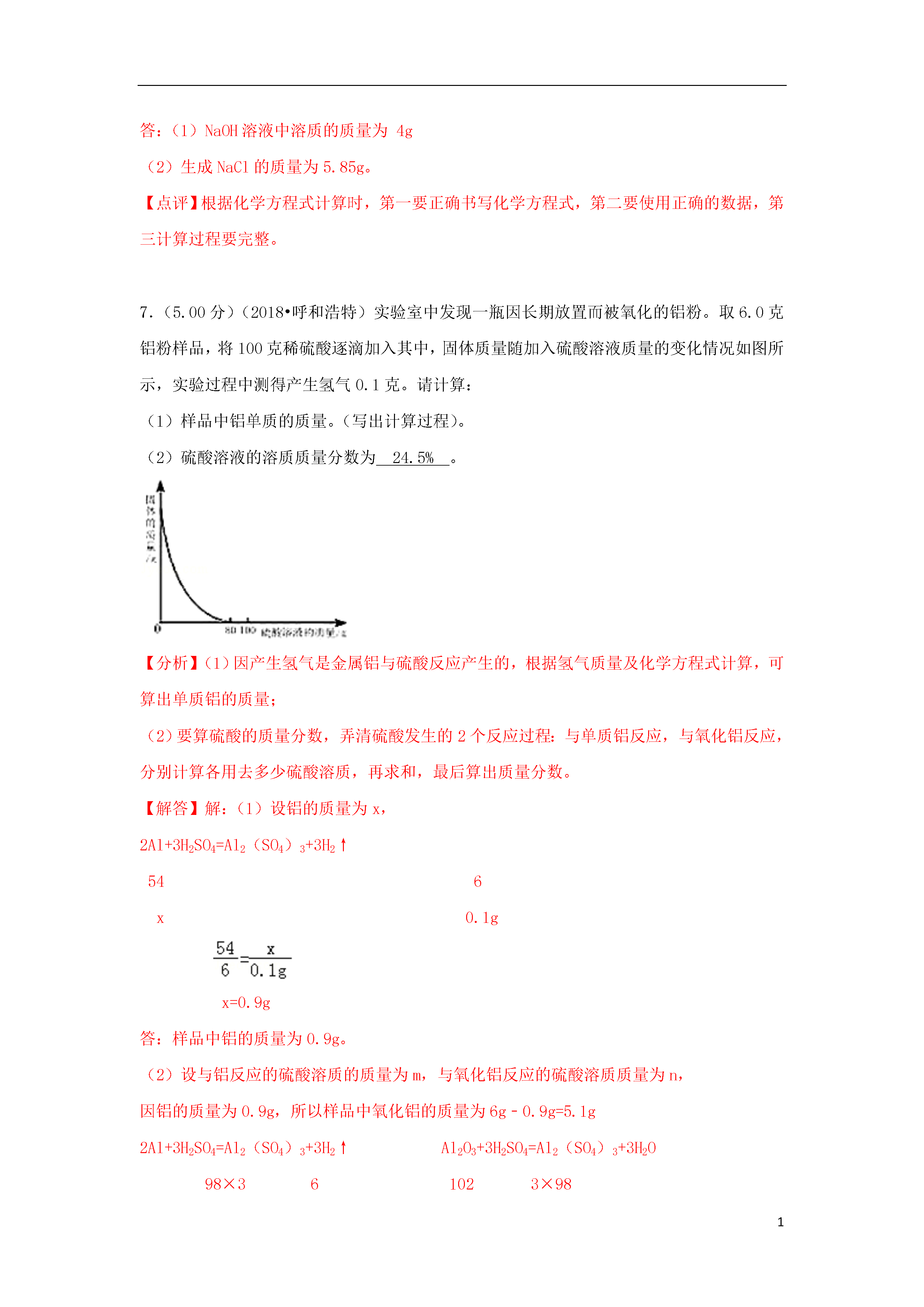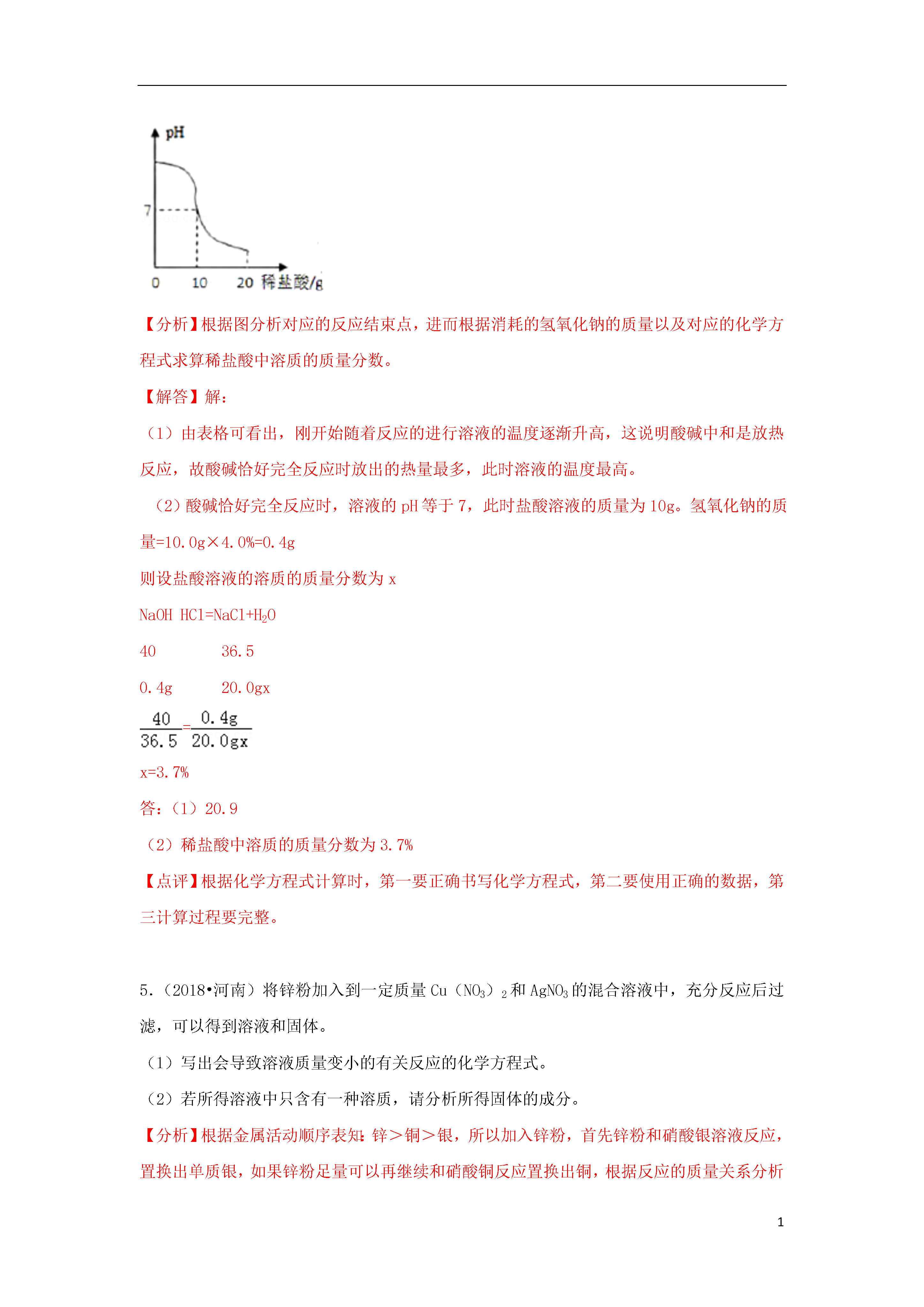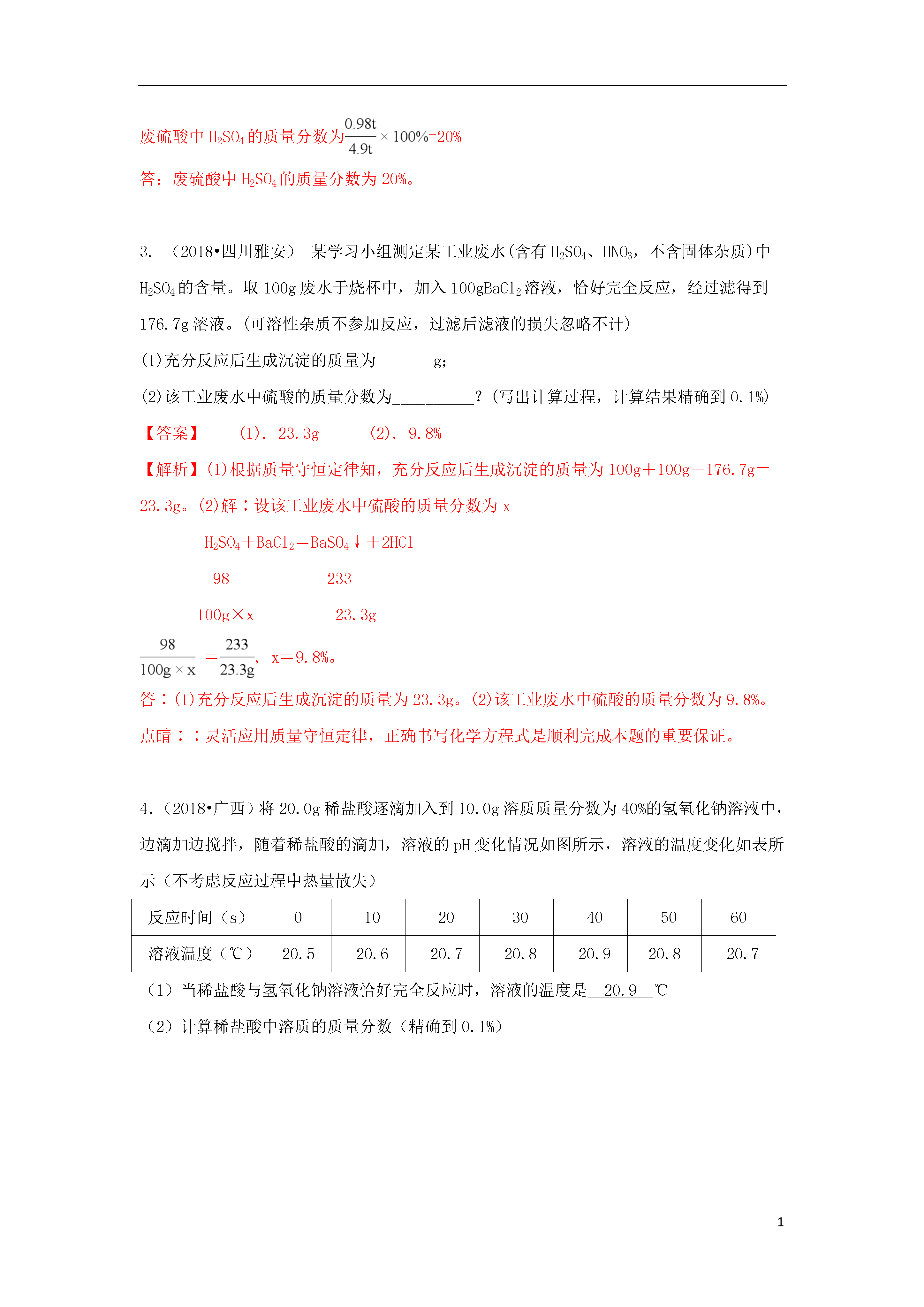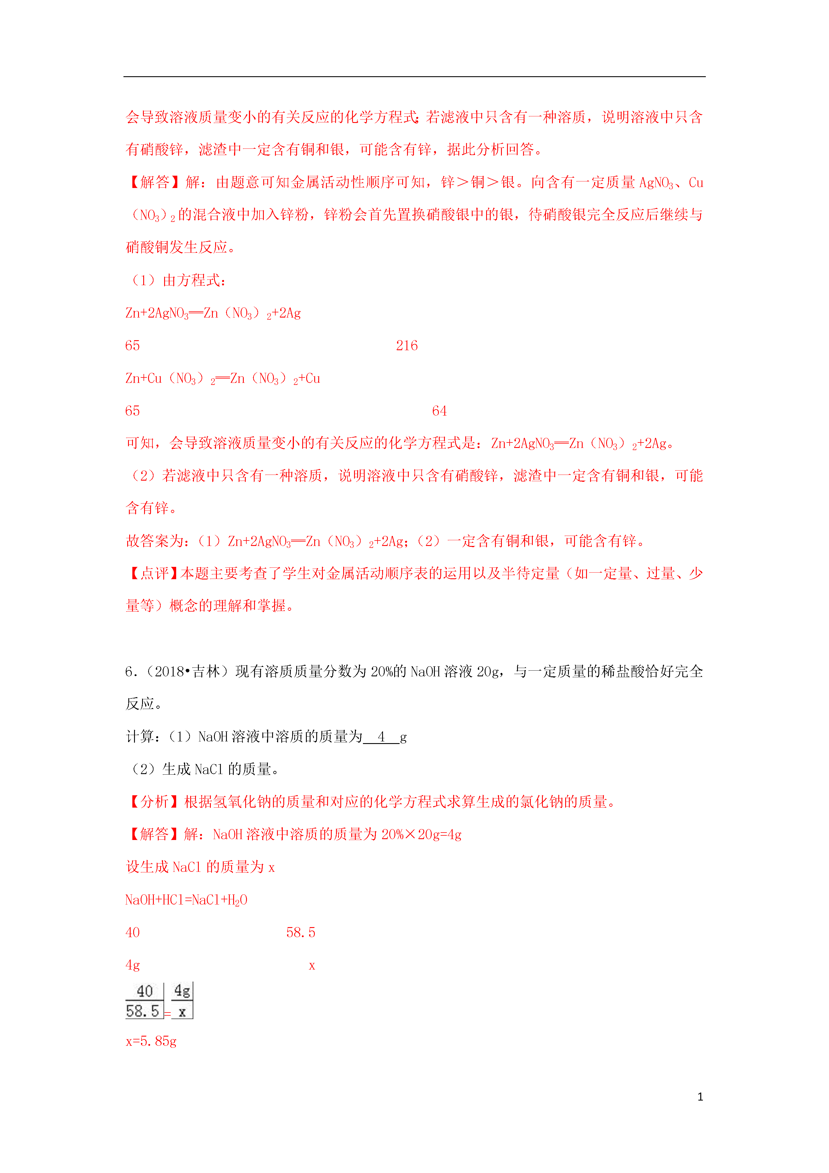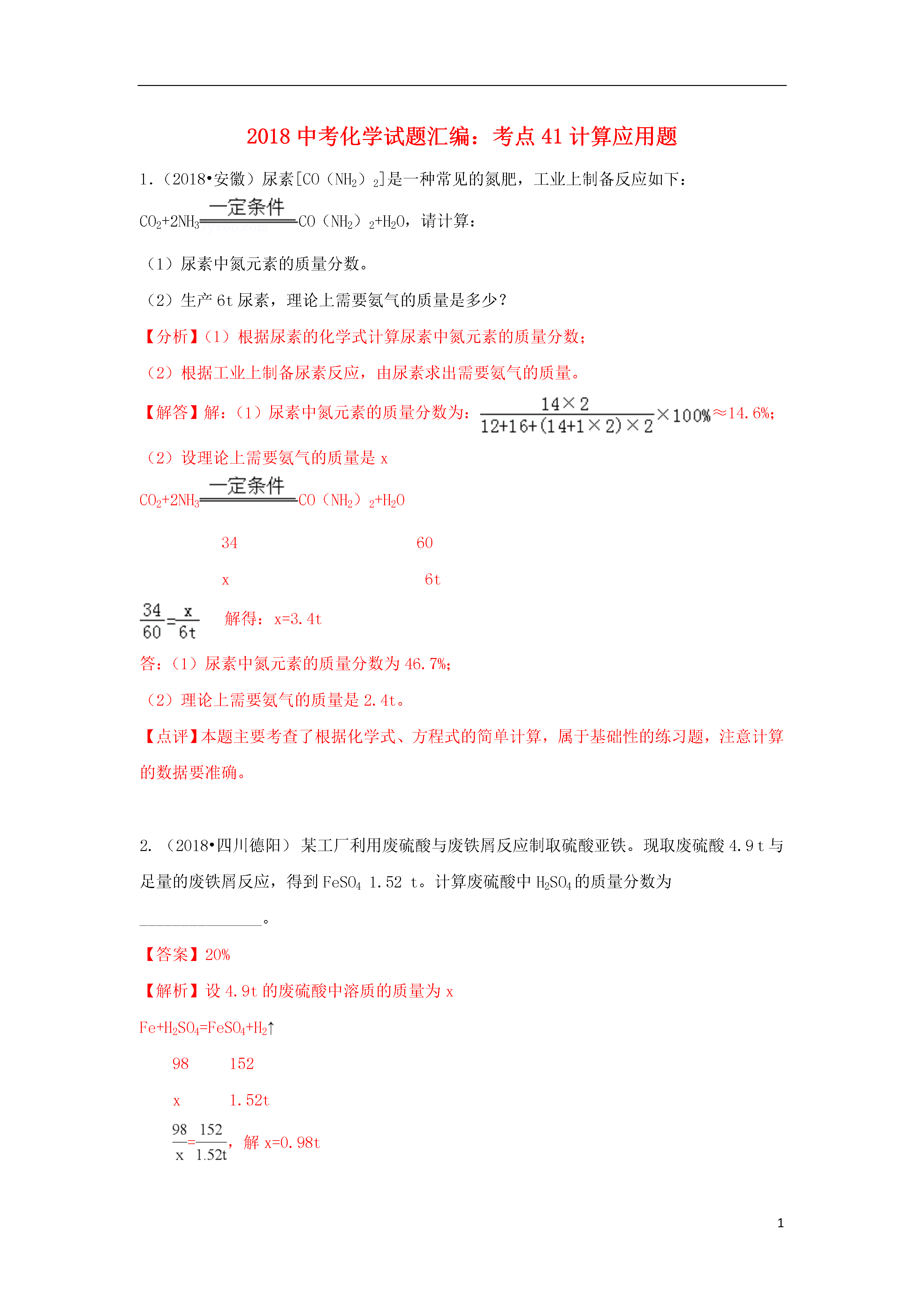 12018中考化学试题汇编:考点41计算应用题1.(2018•安徽)尿素[CO(NH2)2]是一种常见的氮肥,工业上制备反应如下:CO2+2NH3CO(NH2)2+H2O,请计算:(1)尿素中氮元素的质量分数。(2)生产6t尿素,理论上需要氨气的质量是多少?【分析】(1)根据尿素的化学式计算尿素中氮元素的质量分数;(2)根据工业上制备尿素反应,由尿素求出需要氨气的质量。【解答】解:(1)尿素中氮元素的质量分数为:≈14.6%;(2)设理论上需要氨气的质量是xCO2+2NH3CO(NH2)2+H2O3460x6t解得:x=3.4t答:(1)尿素中氮元素的质量分数为46.7%;(2)理论上需要氨气的质量是2.4t。【点评】本题主要考查了根据化学式、方程式的简单计算,属于基础性的练习题,注意计算的数据要准确。2.(2018•四川德阳)某工厂利用废硫酸与废铁屑反应制取硫酸亚铁。现取废硫酸4.9t与足量的废铁屑反应,得到FeSO41.52t。计算废硫酸中H2SO4的质量分数为_______________。【答案】20%【解析】设4.9t的废硫酸中溶质的质量为xFe+H2SO4=FeSO4+H298152x1.52t=,解x=0.98t废硫酸中H2SO4的质量分数为=20%答:废硫酸中H2SO4的质量分数为20%。3.(2018•四川雅安)某学习小组测定某工业废水(含有H2SO4、HNO3,不含固体杂质)中H2SO4的含量。取100g废水于烧杯中,加入100gBaCl2溶液,恰好完全反应,经过滤得到176.7g溶液。(可溶性杂质不参加反应,过滤后滤液的损失忽略不计)(1)充分反应后生成沉淀的质量为_______g;(2)该工业废水中硫酸的质量分数为__________?(写出计算过程,计算结果精确到0.1%)【答案】(1).23.3g(2).9.8%【解析】(1)根据质量守恒定律知,充分反应后生成沉淀的质量为100g+100g-176.7g=23.3g。(2)解∶设该工业废水中硫酸的质量分数为xH2SO4+BaCl2=BaSO4↓+2HCl98233100g×x23.3g=,x=9.8%。答∶(1)充分反应后生成沉淀的质量为23.3g。(2)该工业废水中硫酸的质量分数为9.8%。点睛∶∶灵活应用质量守恒定律,正确书写化学方程式是顺利完成本题的重要保证。4.(2018•广西)将20.0g稀盐酸逐滴加入到10.0g溶质质量分数为40%的氢氧化钠溶液中,边滴加边搅拌,随着稀盐酸的滴加,溶液的pH变化情况如图所示,溶液的温度变化如表所示(不考虑反应过程中热量散失)反应时间(s)0102030405060溶液温度(℃)20.520.620.720.820.920.820.7(1)当稀盐酸与氢氧化钠溶液恰好完全反应时,溶液的温度是20.9℃(2)计算稀盐酸中溶质的质量分数(精确到0.1%)【分析】根据图分析对应的反应结束点,进而根据消耗的氢氧化钠的质量以及对应的化学方程式求算稀盐酸中溶质的质量分数。【解答】解:(1)由表格可看出,刚开始随着反应的进行溶液的温度逐渐升高,这说明酸碱中和是放热反应,故酸碱恰好完全反应时放出的热量最多,此时溶液的温度最高。(2)酸碱恰好完全反应时,溶液的pH等于7,此时盐酸溶液的质量为10g。氢氧化钠的质量=10.0g×4.0%=0.4g则设盐酸溶液的溶质的质量分数为xNaOHHCl=NaCl+H2O4036.50.4g20.0gx=x=3.7%答:(1)20.9(2)稀盐酸中溶质的质量分数为3.7%【点评】根据化学方程式计算时,第一要正确书写化学方程式,第二要使用正确的数据,第三计算过程要完整。5.(2018•河南)将锌粉加入到一定质量Cu(NO3)2和AgNO3的混合溶液中,充分反应后过滤,可以得到溶液和固体。(1)写出会导致溶液质量变小的有关反应的化学方程式。(2)若所得溶液中只含有一种溶质,请分析所得固体的成分。【分析】根据金属活动顺序表知:锌>铜>银,所以加入锌粉,首先锌粉和硝酸银溶液反应,置换出单质银,如果锌粉足量可以再继续和硝酸铜反应置换出铜,根据反应的质量关系分析会导致溶液质量变小的有关反应的化学方程式;若滤液中只含有一种溶质,说明溶液中只含有硝酸锌,滤渣中一定含有铜和银,可能含有锌,据此分析回答。【解答】解:由题意可知金属活动性顺序可知,锌>铜>银。向含有一定质量AgNO3、Cu(NO3)2的混合液中加入锌粉,锌粉会首先置换硝酸银中的银,待硝酸银完全反应后继续与硝酸铜发生反应。(1)由方程式:Zn+2AgNO3═Zn(NO3)2+2Ag65216Zn+Cu(N