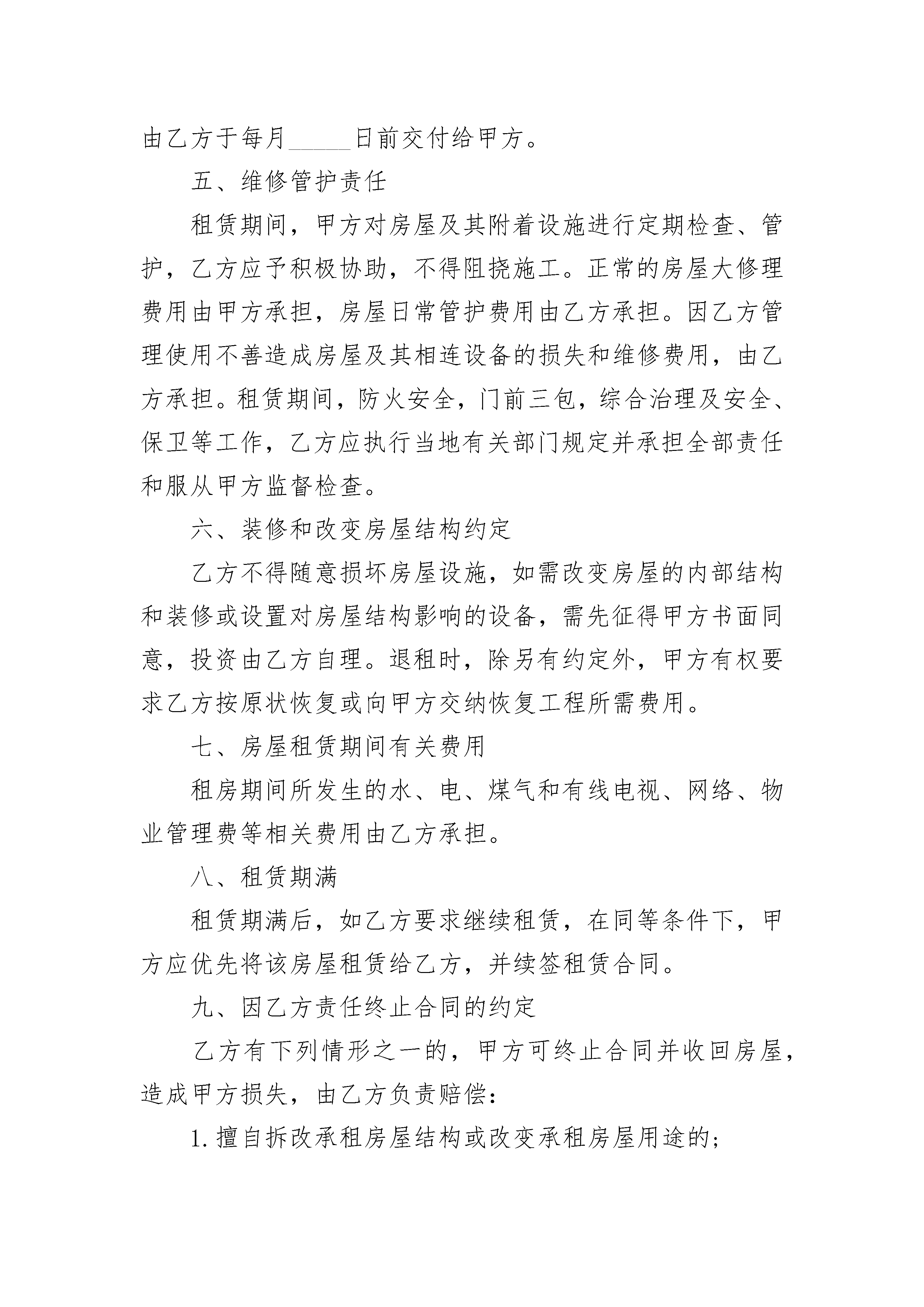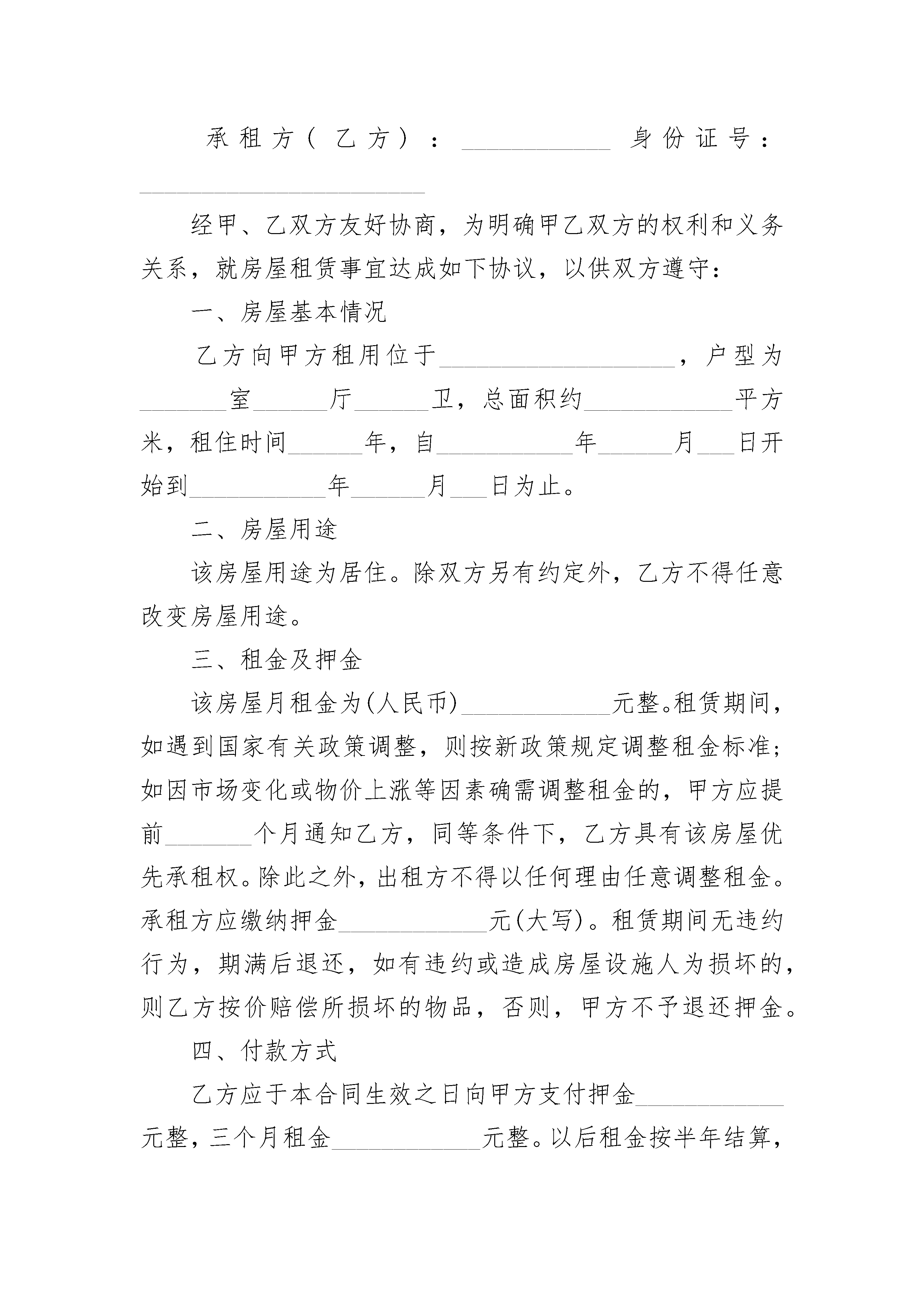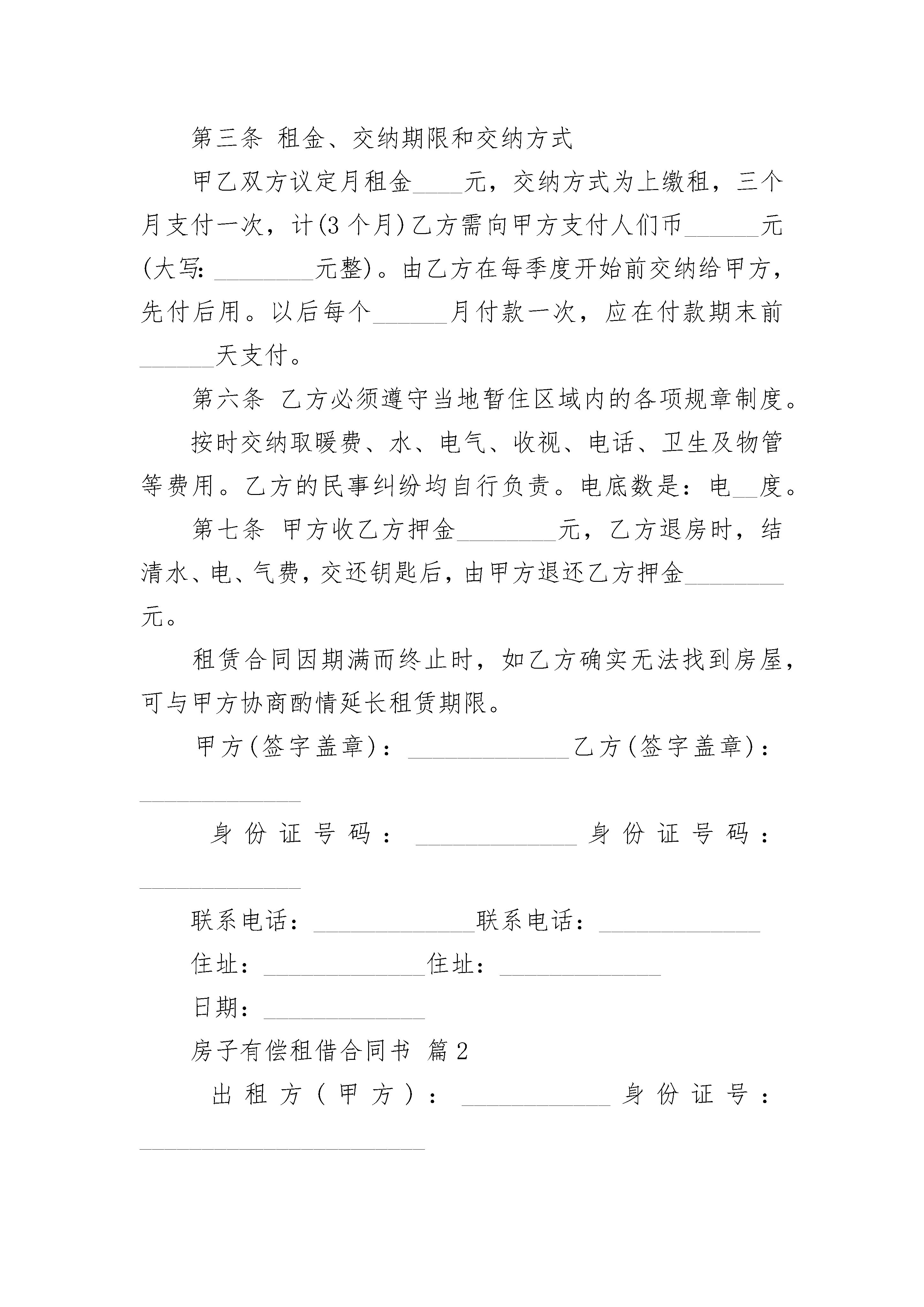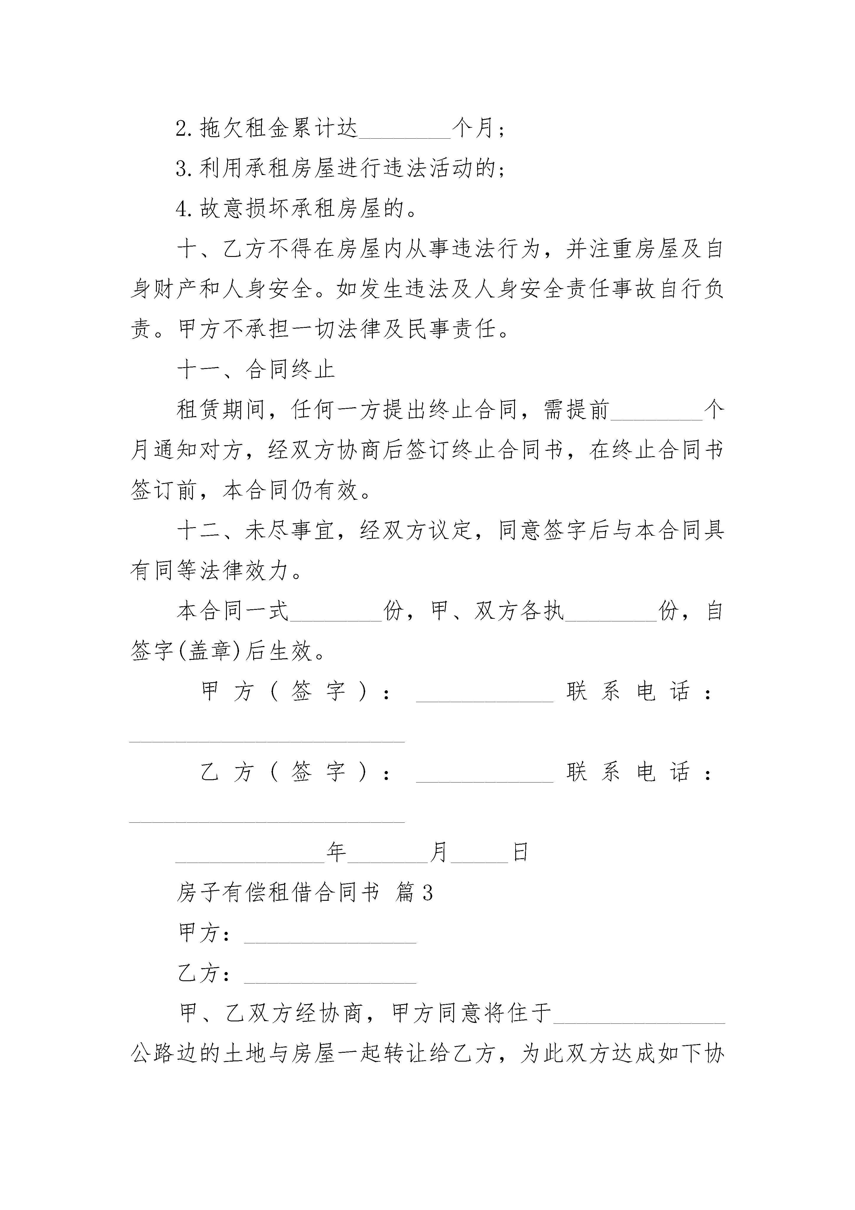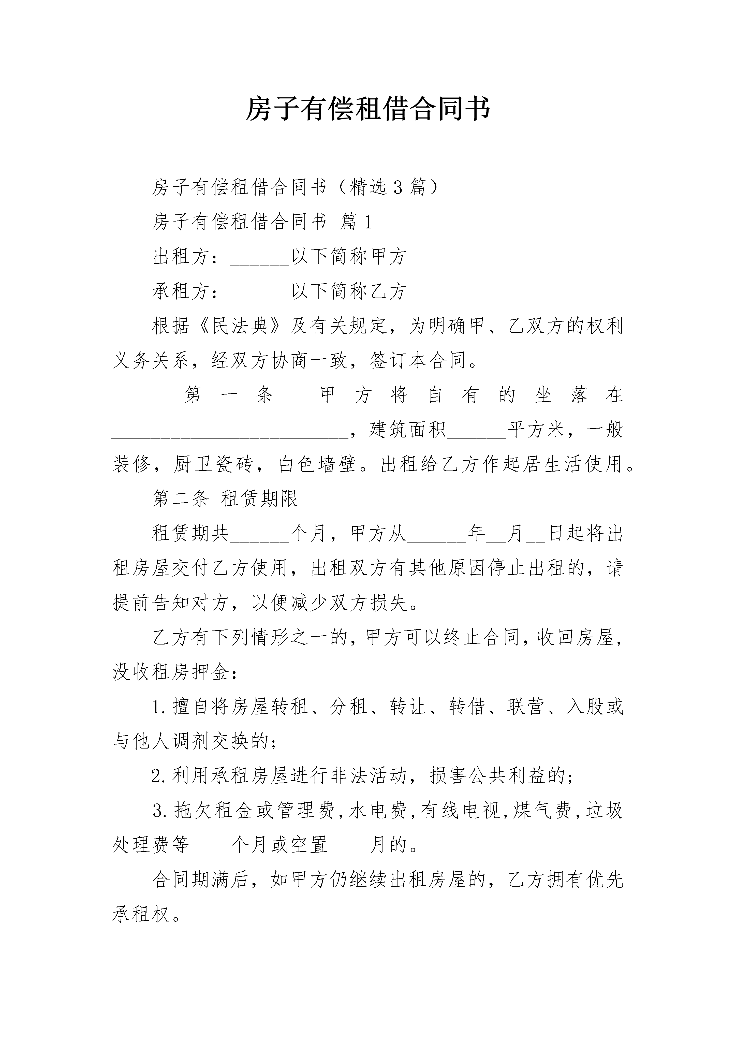 房子有偿租借合同书房子有偿租借合同书(精选3篇)房子有偿租借合同书篇1出租方:______以下简称甲方承租方:______以下简称乙方根据《民法典》及有关规定,为明确甲、乙双方的权利义务关系,经双方协商一致,签订本合同。第一条甲方将自有的坐落在________________________,建筑面积______平方米,一般装修,厨卫瓷砖,白色墙壁。出租给乙方作起居生活使用。第二条租赁期限租赁期共______个月,甲方从______年__月__日起将出租房屋交付乙方使用,出租双方有其他原因停止出租的,请提前告知对方,以便减少双方损失。乙方有下列情形之一的,甲方可以终止合同,收回房屋,没收租房押金:1.擅自将房屋转租、分租、转让、转借、联营、入股或与他人调剂交换的;2.利用承租房屋进行非法活动,损害公共利益的;3.拖欠租金或管理费,水电费,有线电视,煤气费,垃圾处理费等____个月或空置____月的。合同期满后,如甲方仍继续出租房屋的,乙方拥有优先承租权。第三条租金、交纳期限和交纳方式甲乙双方议定月租金____元,交纳方式为上缴租,三个月支付一次,计(3个月)乙方需向甲方支付人们币______元(大写:________元整)。由乙方在每季度开始前交纳给甲方,先付后用。以后每个______月付款一次,应在付款期末前______天支付。第六条乙方必须遵守当地暂住区域内的各项规章制度。按时交纳取暖费、水、电气、收视、电话、卫生及物管等费用。乙方的民事纠纷均自行负责。电底数是:电__度。第七条甲方收乙方押金________元,乙方退房时,结清水、电、气费,交还钥匙后,由甲方退还乙方押金________元。租赁合同因期满而终止时,如乙方确实无法找到房屋,可与甲方协商酌情延长租赁期限。甲方(签字盖章):_____________乙方(签字盖章):_____________身份证号码:_____________身份证号码:_____________联系电话:_____________联系电话:_____________住址:_____________住址:_____________日期:_____________房子有偿租借合同书篇2出租方(甲方):____________身份证号:_______________________承租方(乙方):____________身份证号:_______________________经甲、乙双方友好协商,为明确甲乙双方的权利和义务关系,就房屋租赁事宜达成如下协议,以供双方遵守:一、房屋基本情况乙方向甲方租用位于___________________,户型为_______室______厅______卫,总面积约____________平方米,租住时间______年,自___________年______月___日开始到___________年______月___日为止。二、房屋用途该房屋用途为居住。除双方另有约定外,乙方不得任意改变房屋用途。三、租金及押金该房屋月租金为(人民币)____________元整。租赁期间,如遇到国家有关政策调整,则按新政策规定调整租金标准;如因市场变化或物价上涨等因素确需调整租金的,甲方应提前_______个月通知乙方,同等条件下,乙方具有该房屋优先承租权。除此之外,出租方不得以任何理由任意调整租金。承租方应缴纳押金____________元(大写)。租赁期间无违约行为,期满后退还,如有违约或造成房屋设施人为损坏的,则乙方按价赔偿所损坏的物品,否则,甲方不予退还押金。四、付款方式乙方应于本合同生效之日向甲方支付押金____________元整,三个月租金____________元整。以后租金按半年结算,由乙方于每月_____日前交付给甲方。五、维修管护责任租赁期间,甲方对房屋及其附着设施进行定期检查、管护,乙方应予积极协助,不得阻挠施工。正常的房屋大修理费用由甲方承担,房屋日常管护费用由乙方承担。因乙方管理使用不善造成房屋及其相连设备的损失和维修费用,由乙方承担。租赁期间,防火安全,门前三包,综合治理及安全、保卫等工作,乙方应执行当地有关部门规定并承担全部责任和服从甲方监督检查。六、装修和改变房屋结构约定乙方不得随意损坏房屋设施,如需改变房屋的内部结构和装修或设置对房屋结构影响的设备,需先征得甲方书面同意,投资由乙方自理。退租时,除另有约定外,甲方有权要求乙方按原状恢复或向甲方交纳恢复工程所需费用。七、房屋租赁期间有关费用租房期间所发生的水、电、煤气和有线电视、网络、物业管理费等相关费用由乙方承担。八、租赁期满租赁期满后,如乙方要求继续租赁,在同等条件下,甲方应优先将该房屋租赁给乙方,并续签租赁合同。九、因乙方责任终止合同的约定乙方有下列情形之一的,甲方可终止合同并收回房