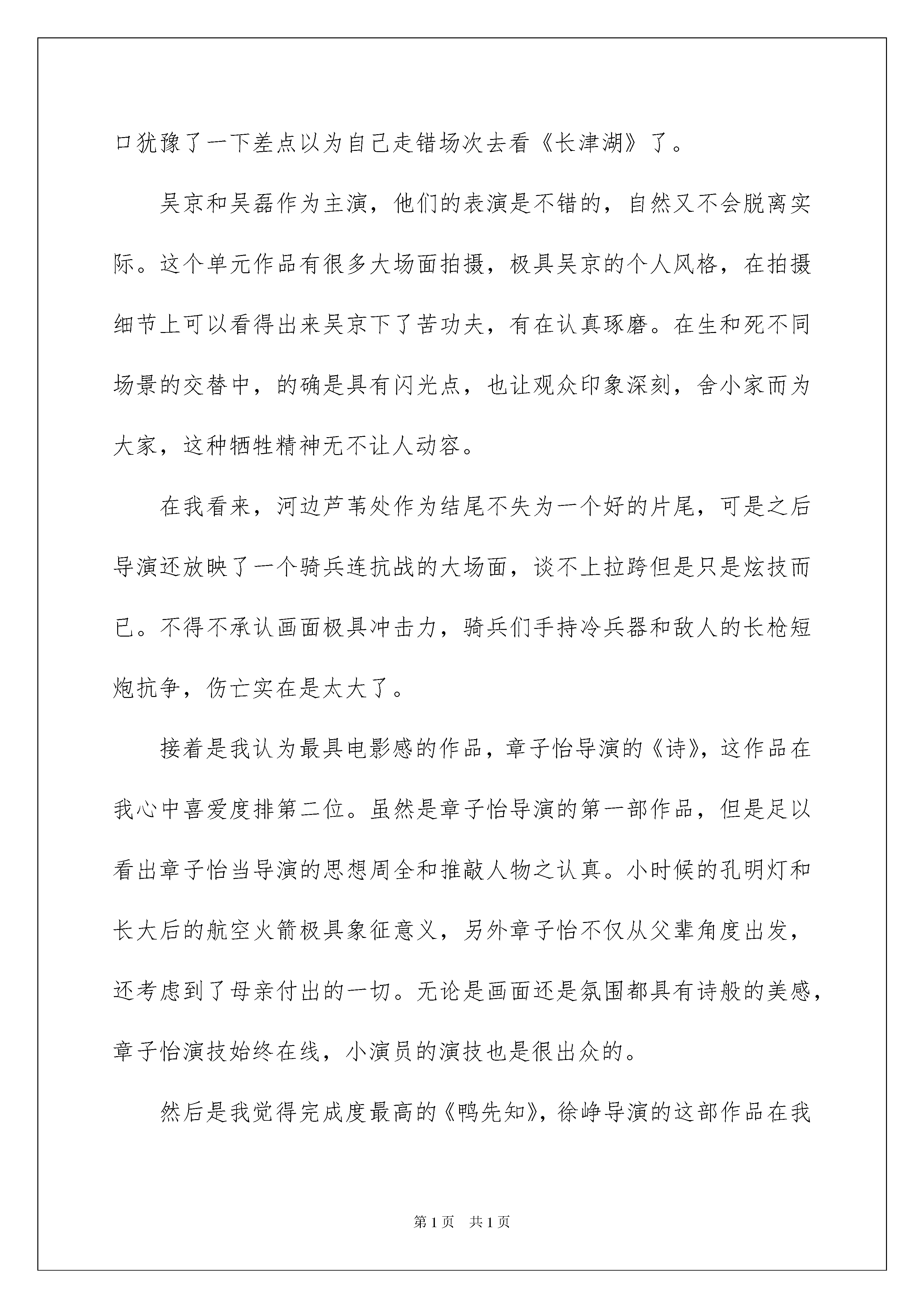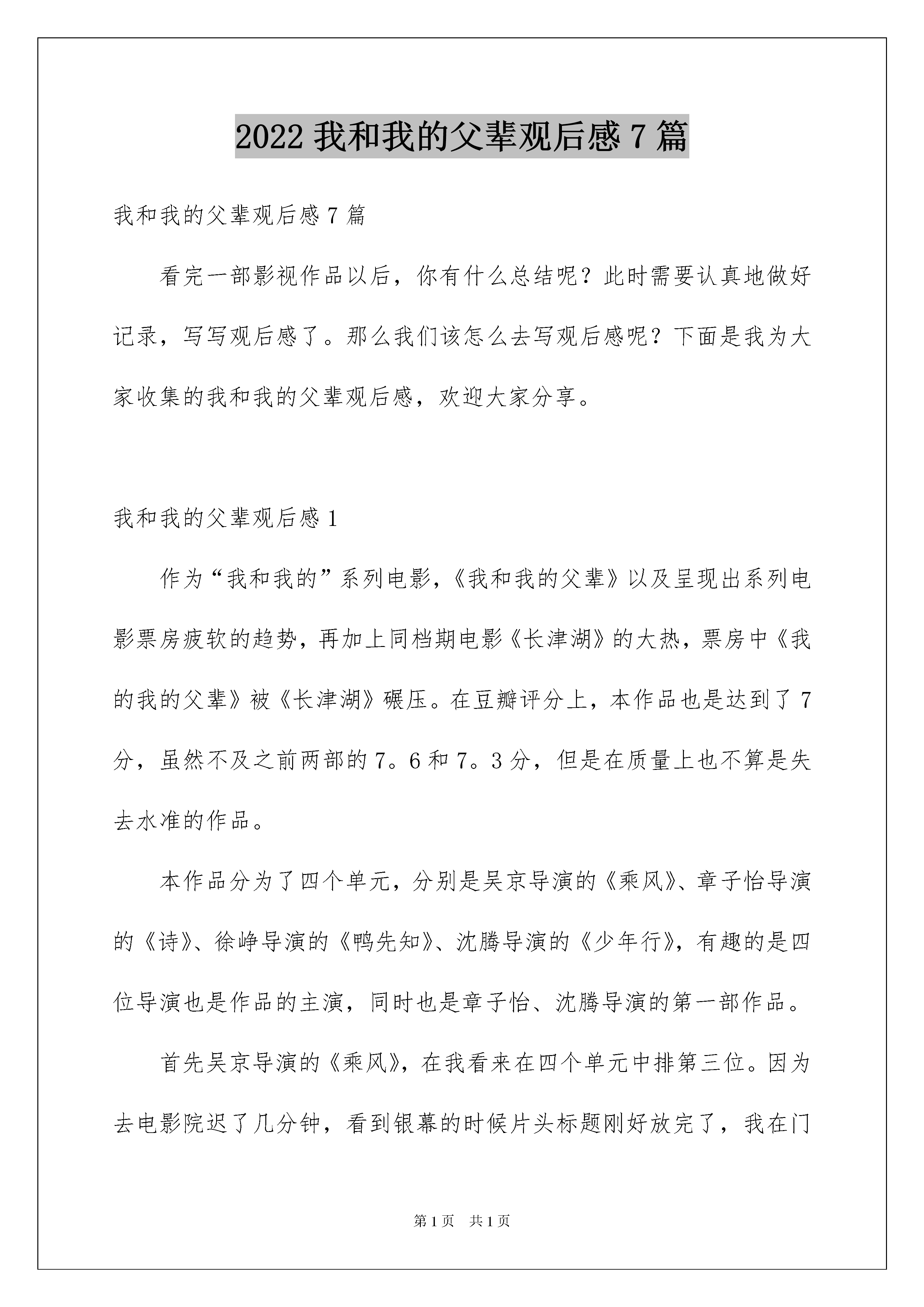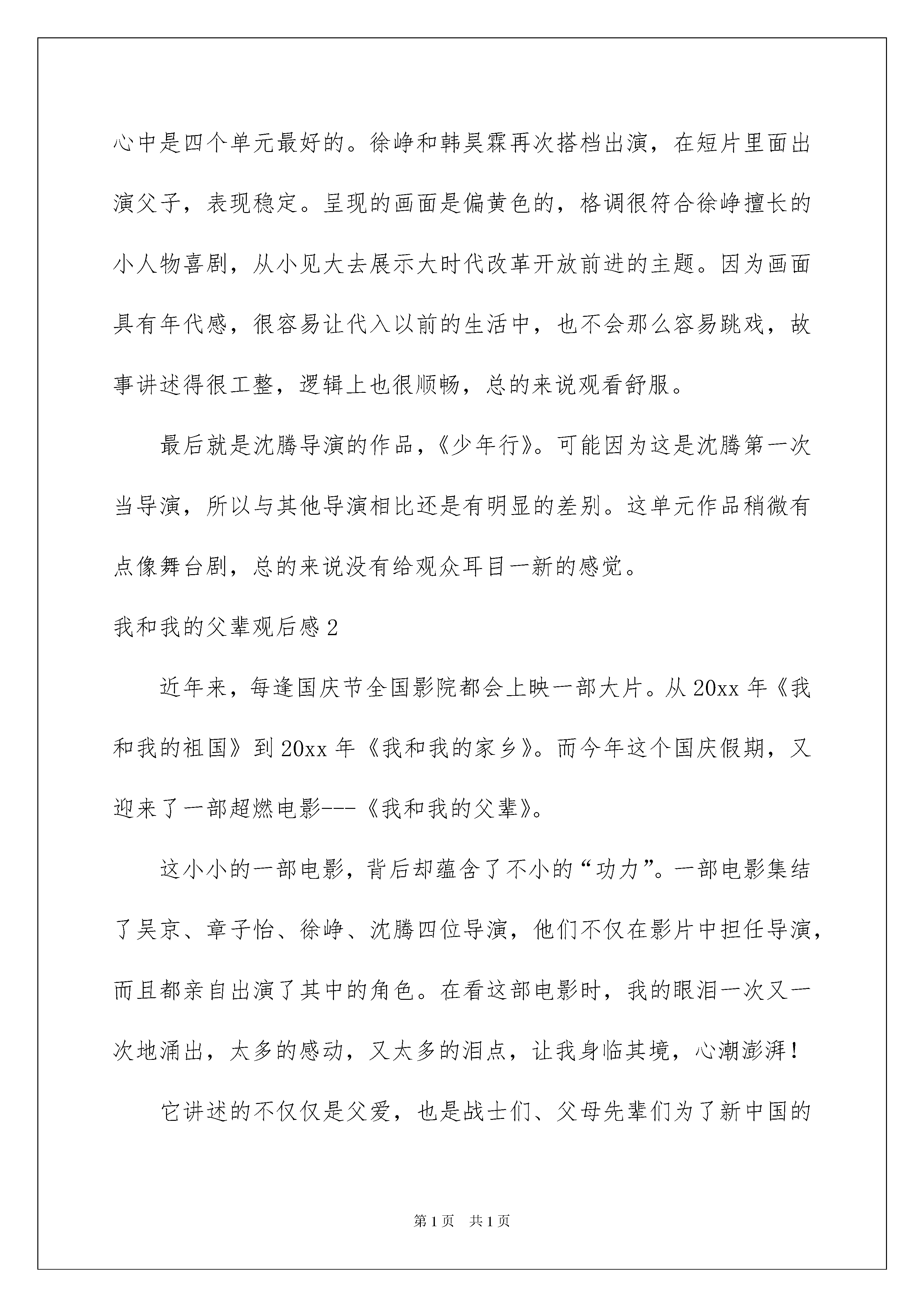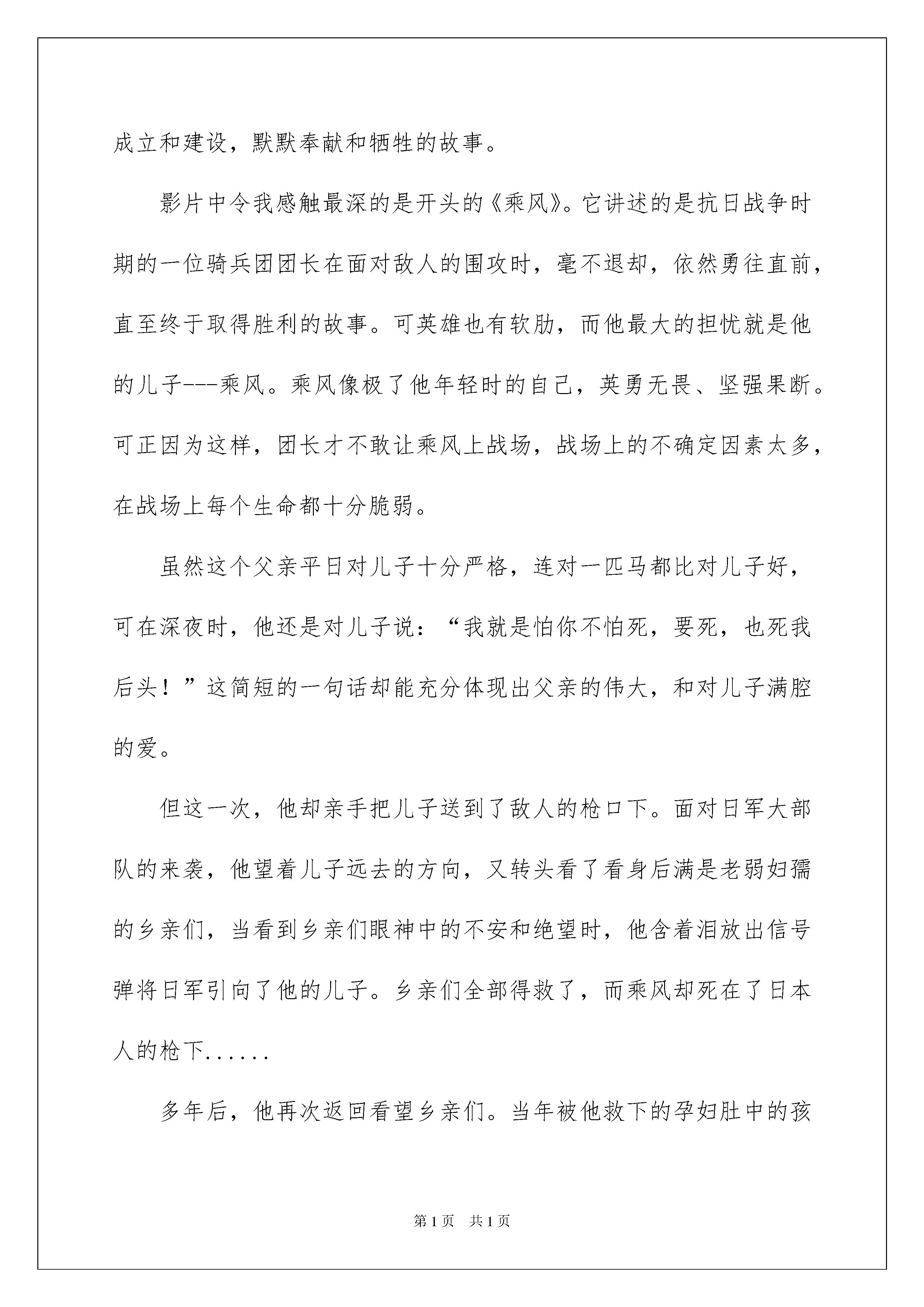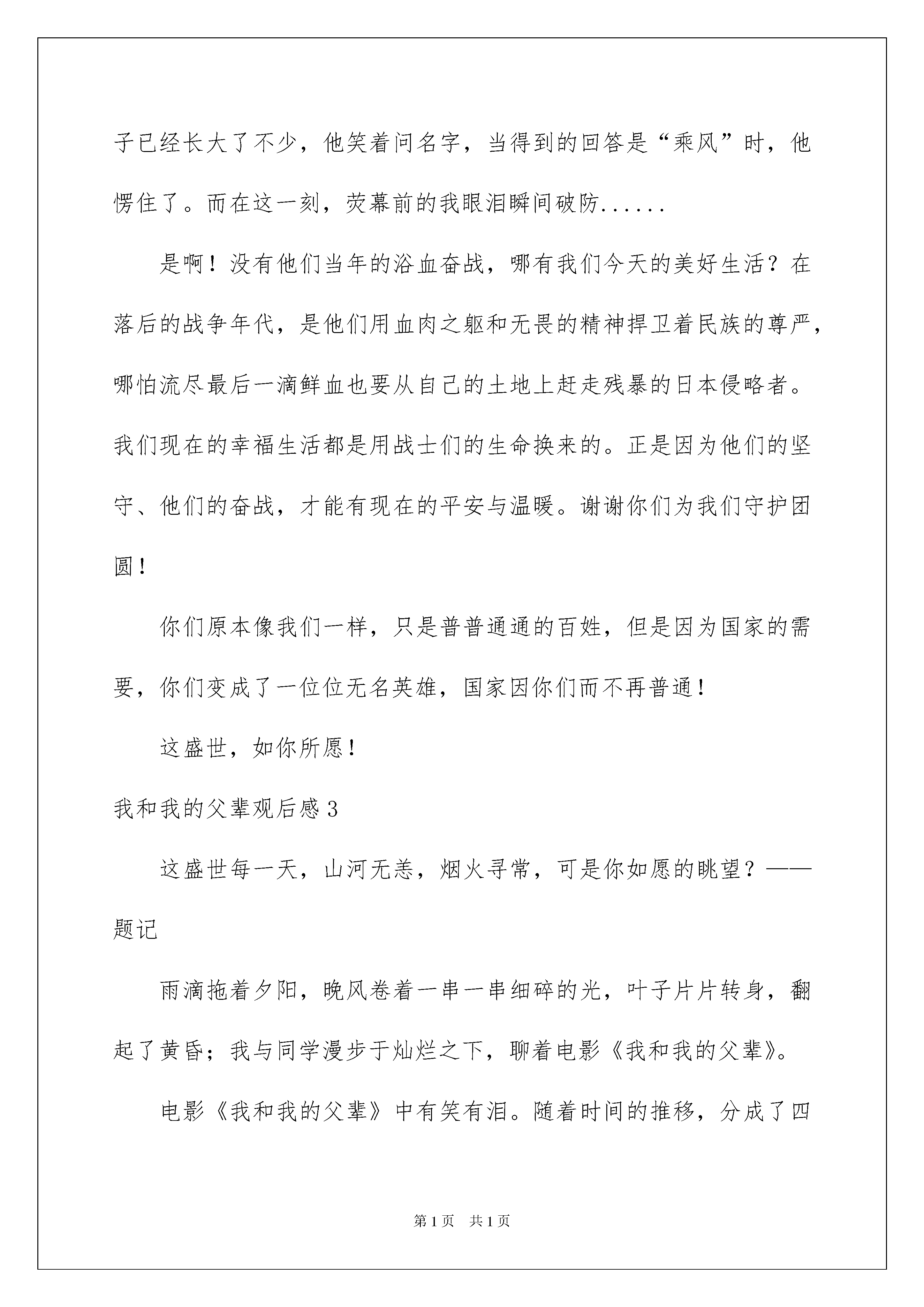 2022我和我的父辈观后感7篇我和我的父辈观后感7篇看完一部影视作品以后,你有什么总结呢?此时需要认真地做好记录,写写观后感了。那么我们该怎么去写观后感呢?下面是我为大家收集的我和我的父辈观后感,欢迎大家分享。我和我的父辈观后感1作为“我和我的”系列电影,《我和我的父辈》以及呈现出系列电影票房疲软的趋势,再加上同档期电影《长津湖》的大热,票房中《我的我的父辈》被《长津湖》碾压。在豆瓣评分上,本作品也是达到了7分,虽然不及之前两部的7。6和7。3分,但是在质量上也不算是失去水准的作品。本作品分为了四个单元,分别是吴京导演的《乘风》、章子怡导演的《诗》、徐峥导演的《鸭先知》、沈腾导演的《少年行》,有趣的是四位导演也是作品的主演,同时也是章子怡、沈腾导演的第一部作品。首先吴京导演的《乘风》,在我看来在四个单元中排第三位。因为去电影院迟了几分钟,看到银幕的时候片头标题刚好放完了,我在门口犹豫了一下差点以为自己走错场次去看《长津湖》了。吴京和吴磊作为主演,他们的表演是不错的,自然又不会脱离实际。这个单元作品有很多大场面拍摄,极具吴京的个人风格,在拍摄细节上可以看得出来吴京下了苦功夫,有在认真琢磨。在生和死不同场景的交替中,的确是具有闪光点,也让观众印象深刻,舍小家而为大家,这种牺牲精神无不让人动容。在我看来,河边芦苇处作为结尾不失为一个好的片尾,可是之后导演还放映了一个骑兵连抗战的大场面,谈不上拉跨但是只是炫技而已。不得不承认画面极具冲击力,骑兵们手持冷兵器和敌人的长枪短炮抗争,伤亡实在是太大了。接着是我认为最具电影感的作品,章子怡导演的《诗》,这作品在我心中喜爱度排第二位。虽然是章子怡导演的第一部作品,但是足以看出章子怡当导演的思想周全和推敲人物之认真。小时候的孔明灯和长大后的航空火箭极具象征意义,另外章子怡不仅从父辈角度出发,还考虑到了母亲付出的一切。无论是画面还是氛围都具有诗般的美感,章子怡演技始终在线,小演员的演技也是很出众的。然后是我觉得完成度最高的《鸭先知》,徐峥导演的这部作品在我心中是四个单元最好的。徐峥和韩昊霖再次搭档出演,在短片里面出演父子,表现稳定。呈现的画面是偏黄色的,格调很符合徐峥擅长的小人物喜剧,从小见大去展示大时代改革开放前进的主题。因为画面具有年代感,很容易让代入以前的生活中,也不会那么容易跳戏,故事讲述得很工整,逻辑上也很顺畅,总的来说观看舒服。最后就是沈腾导演的作品,《少年行》。可能因为这是沈腾第一次当导演,所以与其他导演相比还是有明显的差别。这单元作品稍微有点像舞台剧,总的来说没有给观众耳目一新的感觉。我和我的父辈观后感2近年来,每逢国庆节全国影院都会上映一部大片。从20xx年《我和我的祖国》到20xx年《我和我的家乡》。而今年这个国庆假期,又迎来了一部超燃电影---《我和我的父辈》。这小小的一部电影,背后却蕴含了不小的“功力”。一部电影集结了吴京、章子怡、徐峥、沈腾四位导演,他们不仅在影片中担任导演,而且都亲自出演了其中的角色。在看这部电影时,我的眼泪一次又一次地涌出,太多的感动,又太多的泪点,让我身临其境,心潮澎湃!它讲述的不仅仅是父爱,也是战士们、父母先辈们为了新中国的成立和建设,默默奉献和牺牲的故事。影片中令我感触最深的是开头的《乘风》。它讲述的是抗日战争时期的一位骑兵团团长在面对敌人的围攻时,毫不退却,依然勇往直前,直至终于取得胜利的故事。可英雄也有软肋,而他最大的担忧就是他的儿子---乘风。乘风像极了他年轻时的自己,英勇无畏、坚强果断。可正因为这样,团长才不敢让乘风上战场,战场上的不确定因素太多,在战场上每个生命都十分脆弱。虽然这个父亲平日对儿子十分严格,连对一匹马都比对儿子好,可在深夜时,他还是对儿子说:“我就是怕你不怕死,要死,也死我后头!”这简短的一句话却能充分体现出父亲的伟大,和对儿子满腔的爱。但这一次,他却亲手把儿子送到了敌人的枪口下。面对日军大部队的来袭,他望着儿子远去的方向,又转头看了看身后满是老弱妇孺的乡亲们,当看到乡亲们眼神中的不安和绝望时,他含着泪放出信号弹将日军引向了他的儿子。乡亲们全部得救了,而乘风却死在了日本人的枪下......多年后,他再次返回看望乡亲们。当年被他救下的孕妇肚中的孩子已经长大了不少,他笑着问名字,当得到的回答是“乘风”时,他愣住了。而在这一刻,荧幕前的我眼泪瞬间破防......是啊!没有他们当年的浴血奋战,哪有我们今天的美好生活?在落后的战争年代,是他们用血肉之躯和无畏的精神捍卫着民族的尊严,哪怕流尽最后一滴鲜血也要从自己的土地上赶走残暴的日本侵略者。我们现在的幸福生活都是用战士们的生命换来