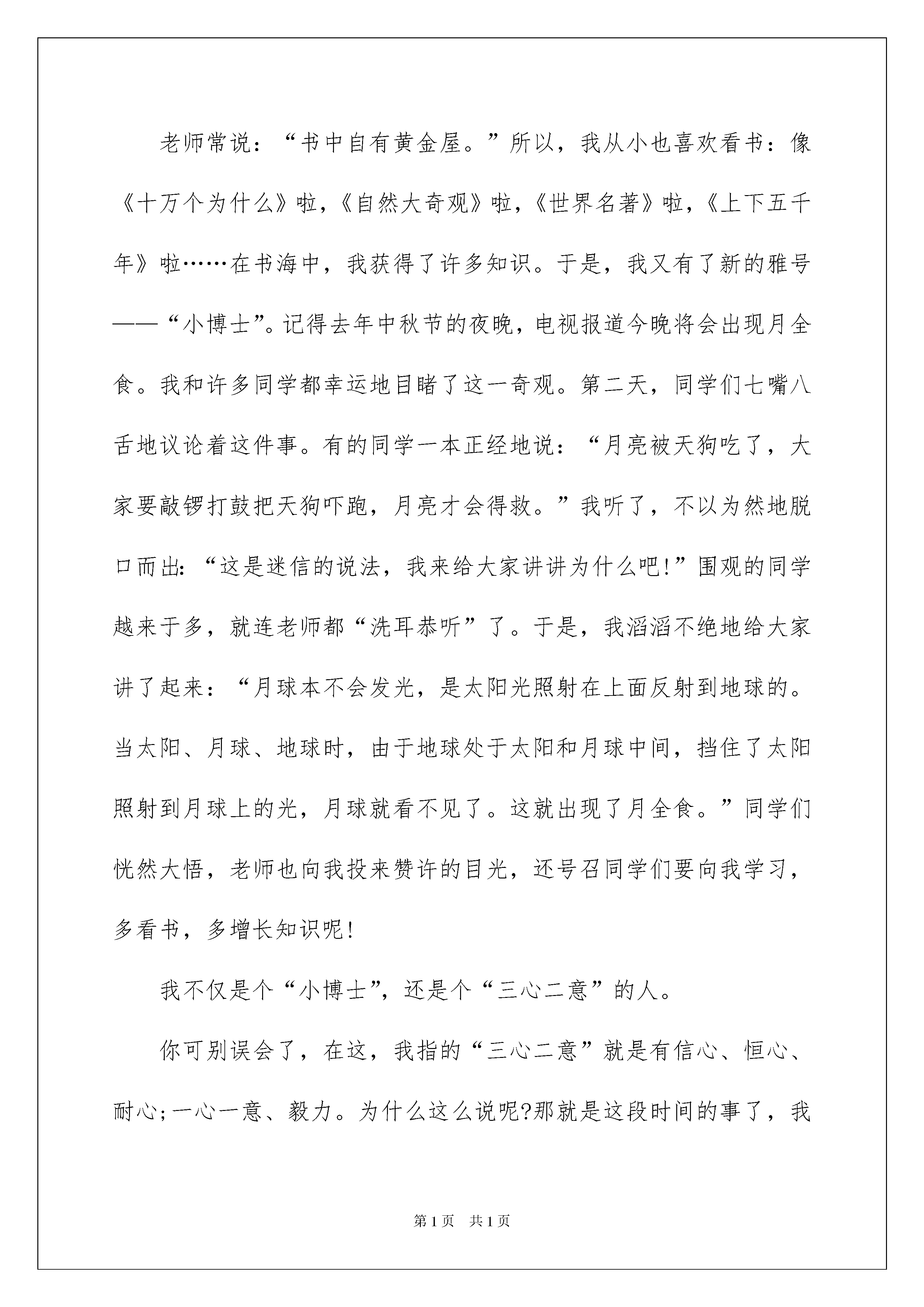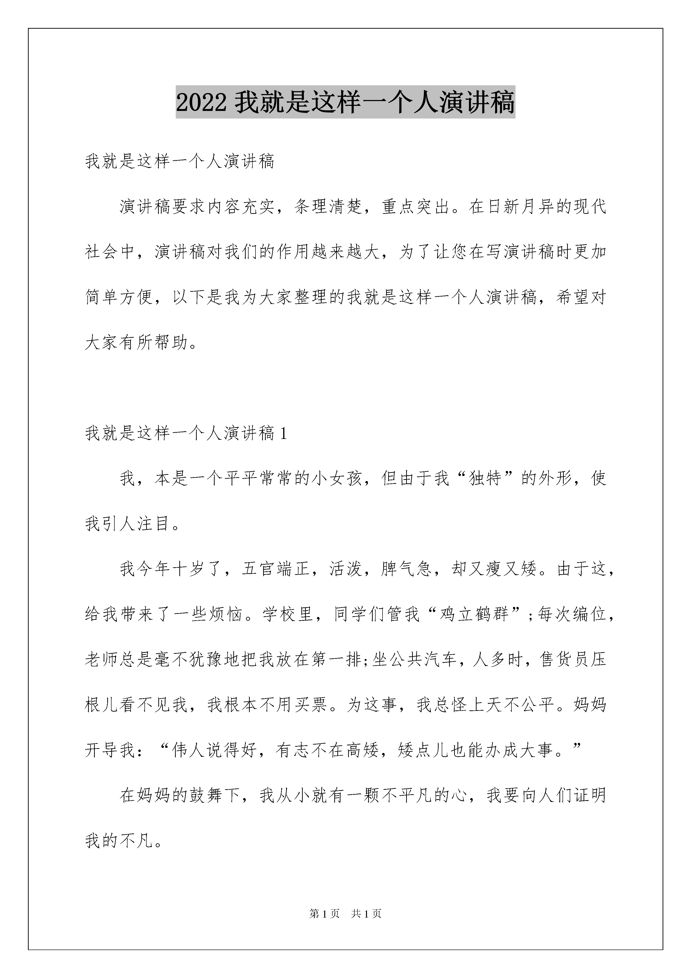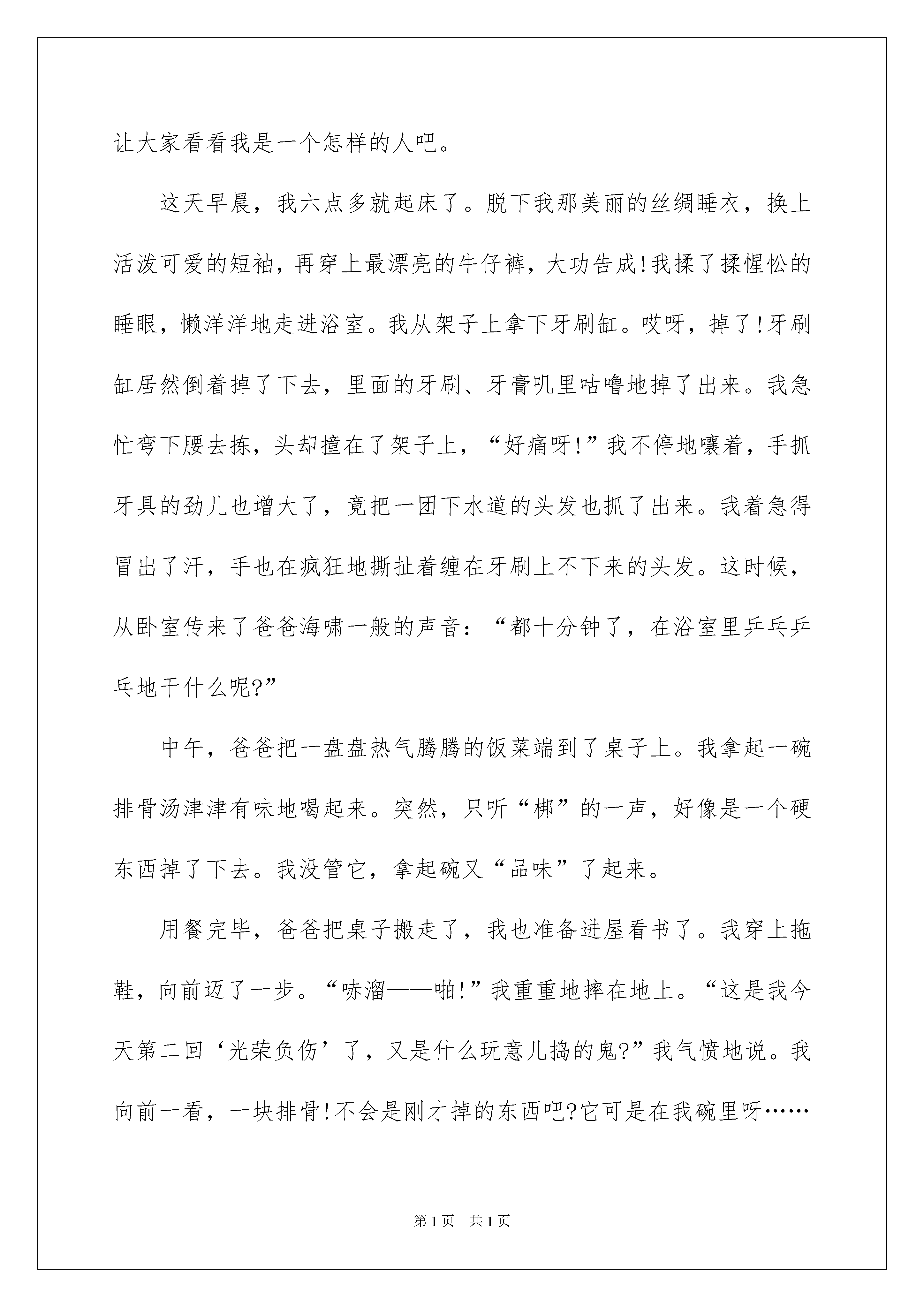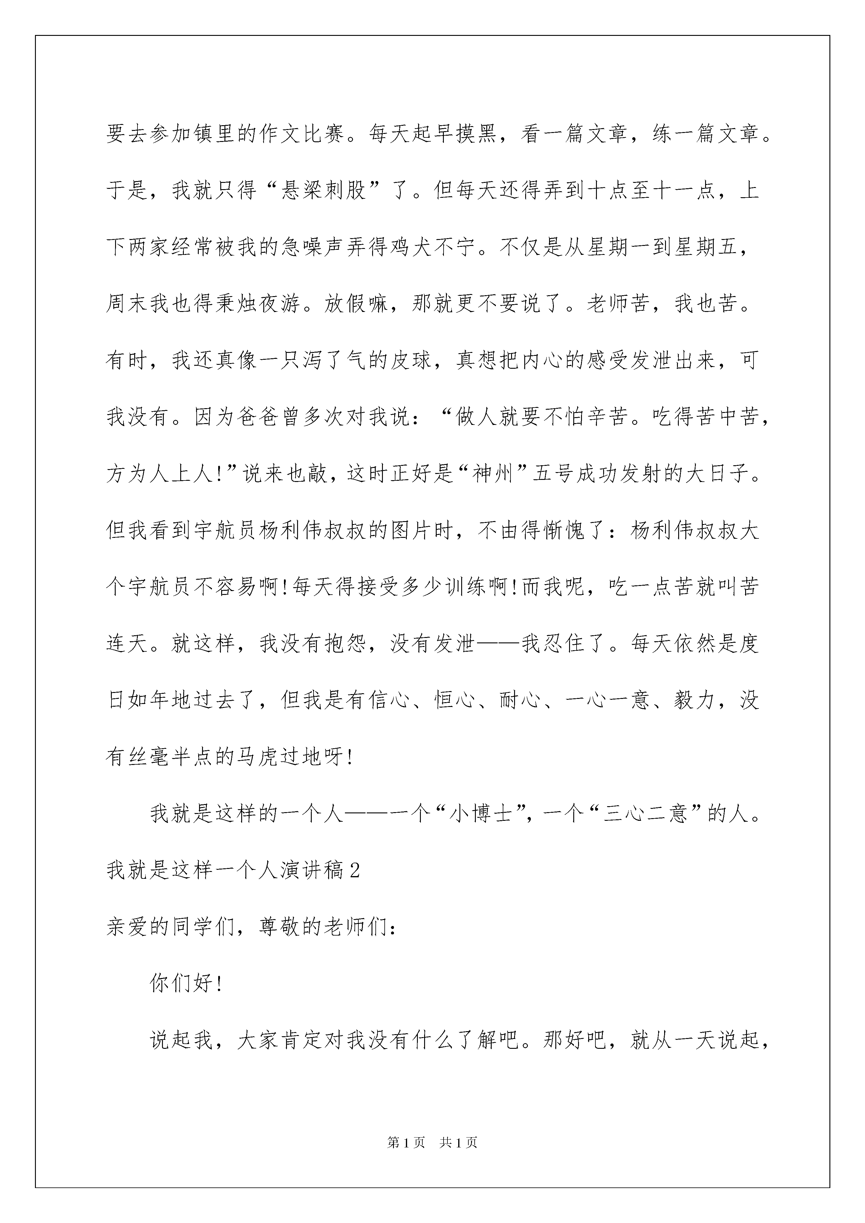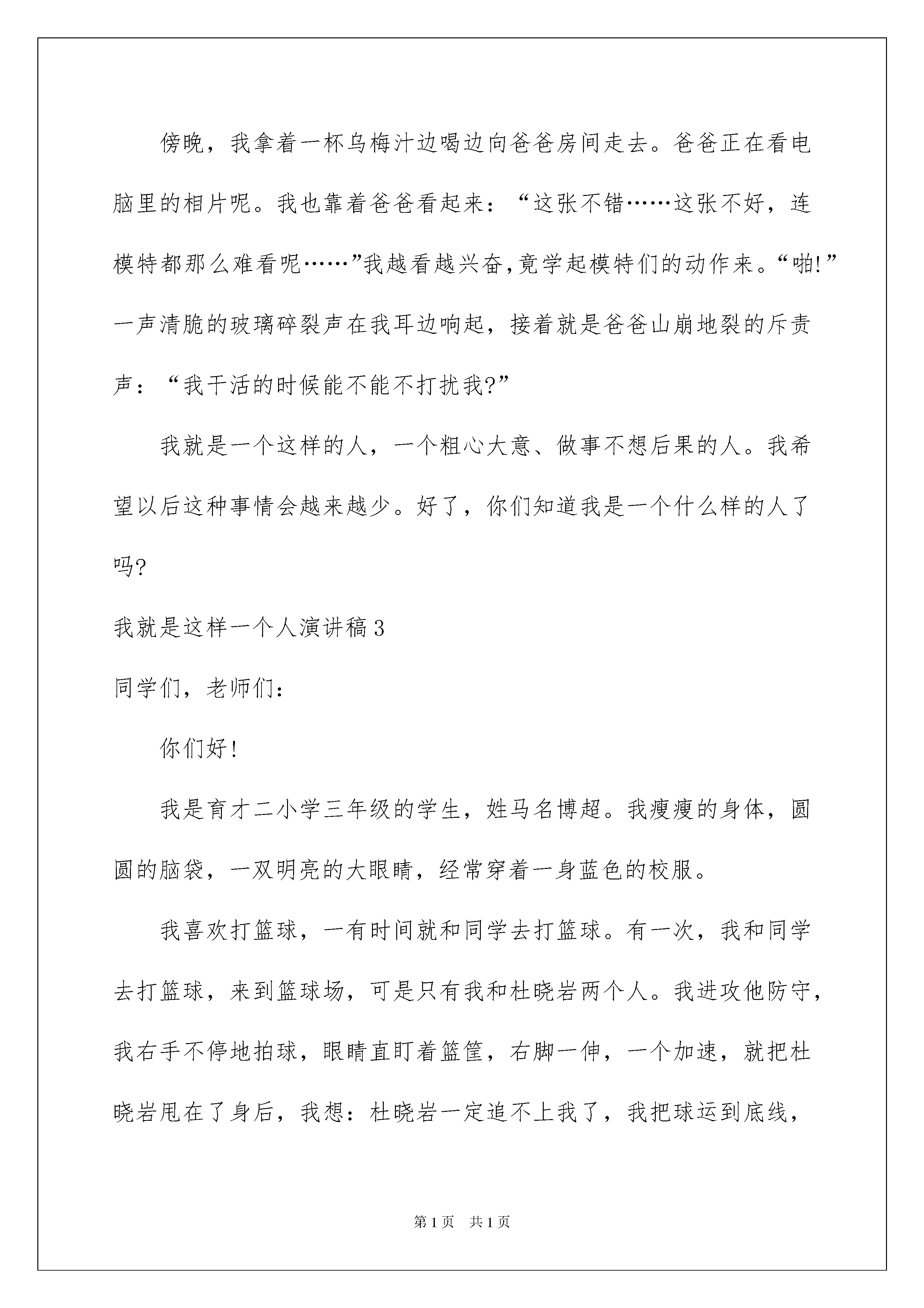 2022我就是这样一个人演讲稿我就是这样一个人演讲稿演讲稿要求内容充实,条理清楚,重点突出。在日新月异的现代社会中,演讲稿对我们的作用越来越大,为了让您在写演讲稿时更加简单方便,以下是我为大家整理的我就是这样一个人演讲稿,希望对大家有所帮助。我就是这样一个人演讲稿1我,本是一个平平常常的小女孩,但由于我“独特”的外形,使我引人注目。我今年十岁了,五官端正,活泼,脾气急,却又瘦又矮。由于这,给我带来了一些烦恼。学校里,同学们管我“鸡立鹤群”;每次编位,老师总是毫不犹豫地把我放在第一排;坐公共汽车,人多时,售货员压根儿看不见我,我根本不用买票。为这事,我总怪上天不公平。妈妈开导我:“伟人说得好,有志不在高矮,矮点儿也能办成大事。”在妈妈的鼓舞下,我从小就有一颗不平凡的心,我要向人们证明我的不凡。老师常说:“书中自有黄金屋。”所以,我从小也喜欢看书:像《十万个为什么》啦,《自然大奇观》啦,《世界名著》啦,《上下五千年》啦……在书海中,我获得了许多知识。于是,我又有了新的雅号——“小博士”。记得去年中秋节的夜晚,电视报道今晚将会出现月全食。我和许多同学都幸运地目睹了这一奇观。第二天,同学们七嘴八舌地议论着这件事。有的同学一本正经地说:“月亮被天狗吃了,大家要敲锣打鼓把天狗吓跑,月亮才会得救。”我听了,不以为然地脱口而出:“这是迷信的说法,我来给大家讲讲为什么吧!”围观的同学越来于多,就连老师都“洗耳恭听”了。于是,我滔滔不绝地给大家讲了起来:“月球本不会发光,是太阳光照射在上面反射到地球的。当太阳、月球、地球时,由于地球处于太阳和月球中间,挡住了太阳照射到月球上的光,月球就看不见了。这就出现了月全食。”同学们恍然大悟,老师也向我投来赞许的目光,还号召同学们要向我学习,多看书,多增长知识呢!我不仅是个“小博士”,还是个“三心二意”的人。你可别误会了,在这,我指的“三心二意”就是有信心、恒心、耐心;一心一意、毅力。为什么这么说呢?那就是这段时间的事了,我要去参加镇里的作文比赛。每天起早摸黑,看一篇文章,练一篇文章。于是,我就只得“悬梁刺股”了。但每天还得弄到十点至十一点,上下两家经常被我的急噪声弄得鸡犬不宁。不仅是从星期一到星期五,周末我也得秉烛夜游。放假嘛,那就更不要说了。老师苦,我也苦。有时,我还真像一只泻了气的皮球,真想把内心的感受发泄出来,可我没有。因为爸爸曾多次对我说:“做人就要不怕辛苦。吃得苦中苦,方为人上人!”说来也敲,这时正好是“神州”五号成功发射的大日子。但我看到宇航员杨利伟叔叔的图片时,不由得惭愧了:杨利伟叔叔大个宇航员不容易啊!每天得接受多少训练啊!而我呢,吃一点苦就叫苦连天。就这样,我没有抱怨,没有发泄——我忍住了。每天依然是度日如年地过去了,但我是有信心、恒心、耐心、一心一意、毅力,没有丝毫半点的马虎过地呀!我就是这样的一个人——一个“小博士”,一个“三心二意”的人。我就是这样一个人演讲稿2亲爱的同学们,尊敬的老师们:你们好!说起我,大家肯定对我没有什么了解吧。那好吧,就从一天说起,让大家看看我是一个怎样的人吧。这天早晨,我六点多就起床了。脱下我那美丽的丝绸睡衣,换上活泼可爱的短袖,再穿上最漂亮的牛仔裤,大功告成!我揉了揉惺忪的睡眼,懒洋洋地走进浴室。我从架子上拿下牙刷缸。哎呀,掉了!牙刷缸居然倒着掉了下去,里面的牙刷、牙膏叽里咕噜地掉了出来。我急忙弯下腰去拣,头却撞在了架子上,“好痛呀!”我不停地嚷着,手抓牙具的劲儿也增大了,竟把一团下水道的头发也抓了出来。我着急得冒出了汗,手也在疯狂地撕扯着缠在牙刷上不下来的头发。这时候,从卧室传来了爸爸海啸一般的声音:“都十分钟了,在浴室里乒乓乒乓地干什么呢?”中午,爸爸把一盘盘热气腾腾的饭菜端到了桌子上。我拿起一碗排骨汤津津有味地喝起来。突然,只听“梆”的一声,好像是一个硬东西掉了下去。我没管它,拿起碗又“品味”了起来。用餐完毕,爸爸把桌子搬走了,我也准备进屋看书了。我穿上拖鞋,向前迈了一步。“哧溜——啪!”我重重地摔在地上。“这是我今天第二回‘光荣负伤’了,又是什么玩意儿捣的鬼?”我气愤地说。我向前一看,一块排骨!不会是刚才掉的东西吧?它可是在我碗里呀……傍晚,我拿着一杯乌梅汁边喝边向爸爸房间走去。爸爸正在看电脑里的相片呢。我也靠着爸爸看起来:“这张不错……这张不好,连模特都那么难看呢……”我越看越兴奋,竟学起模特们的动作来。“啪!”一声清脆的玻璃碎裂声在我耳边响起,接着就是爸爸山崩地裂的斥责声:“我干活的时候能不能不打扰我?”我就是一个这样的人,一个粗心大意、做事不想后果的人。我希望以后这种事情会越来越少。好了,
