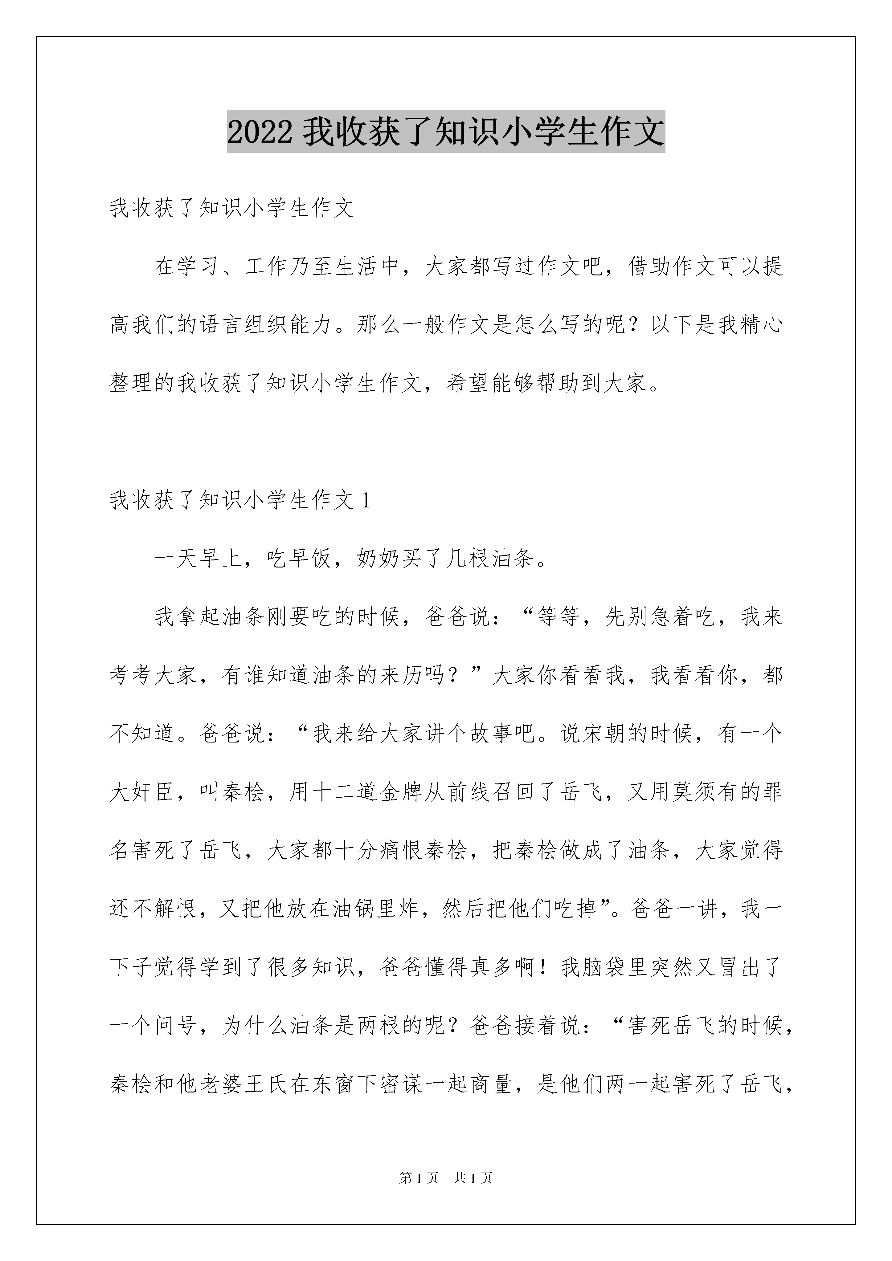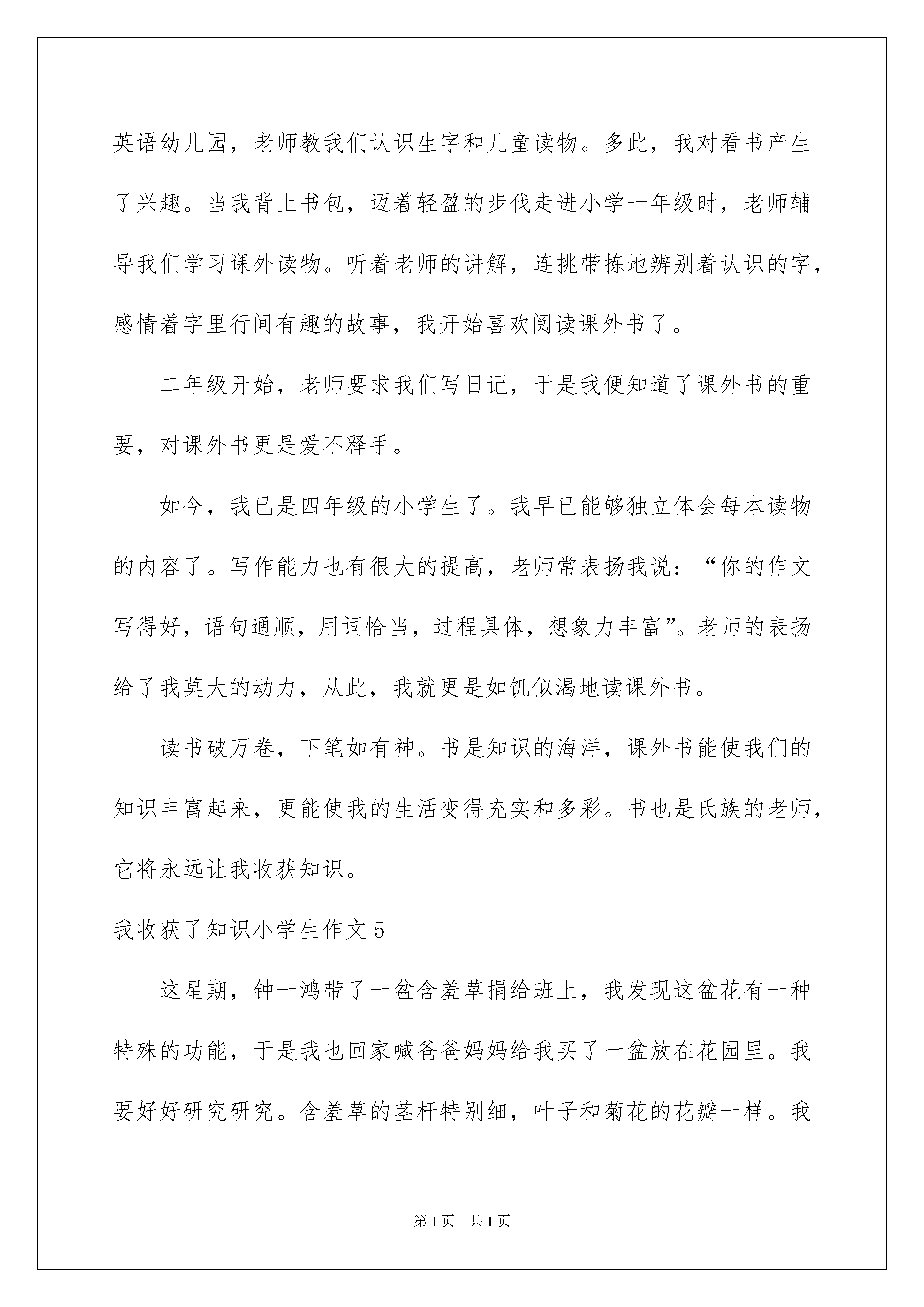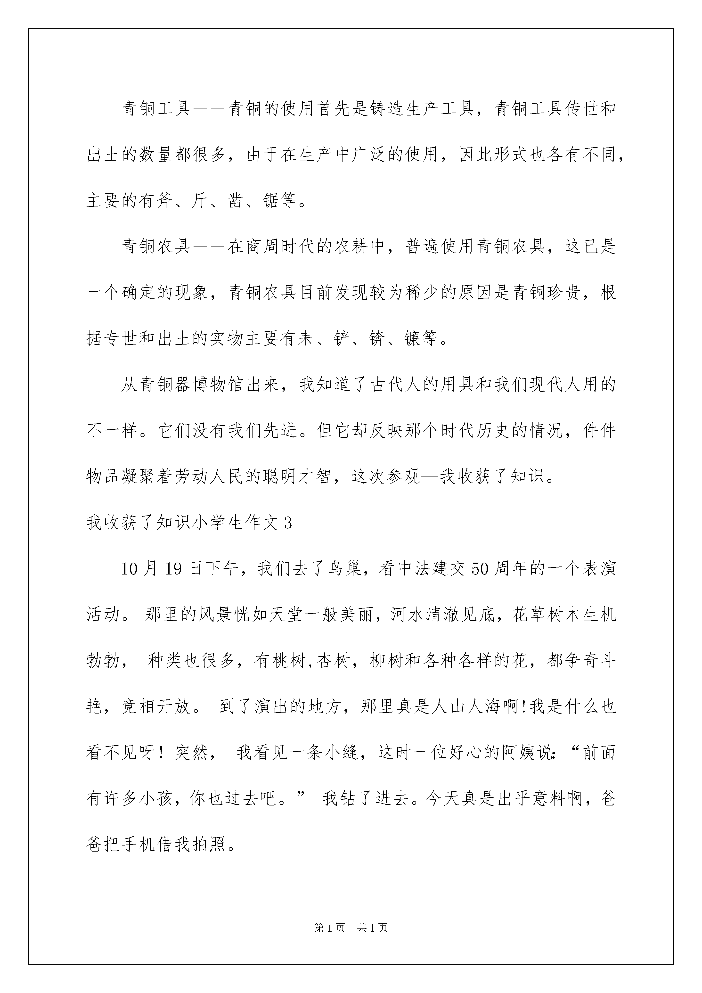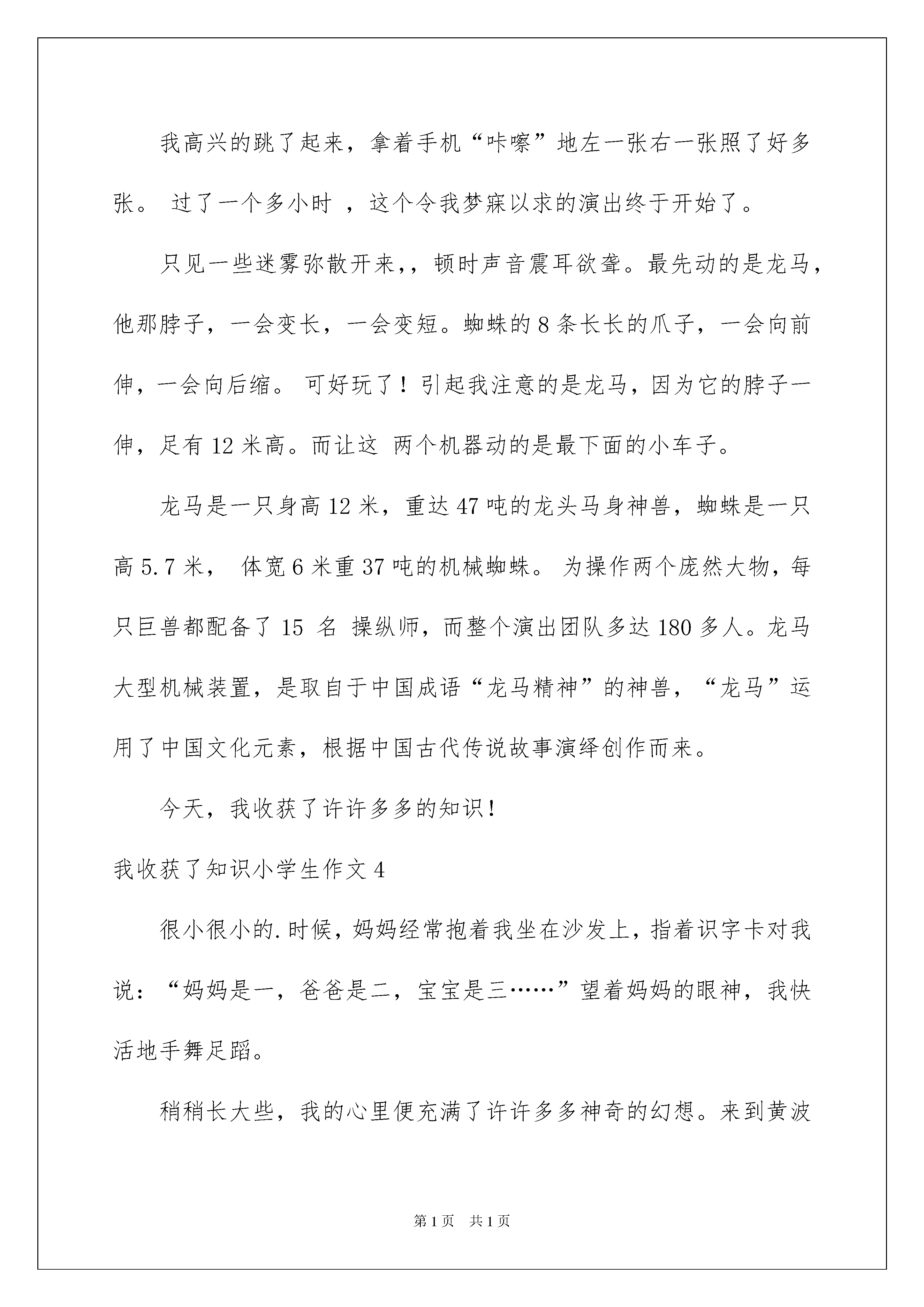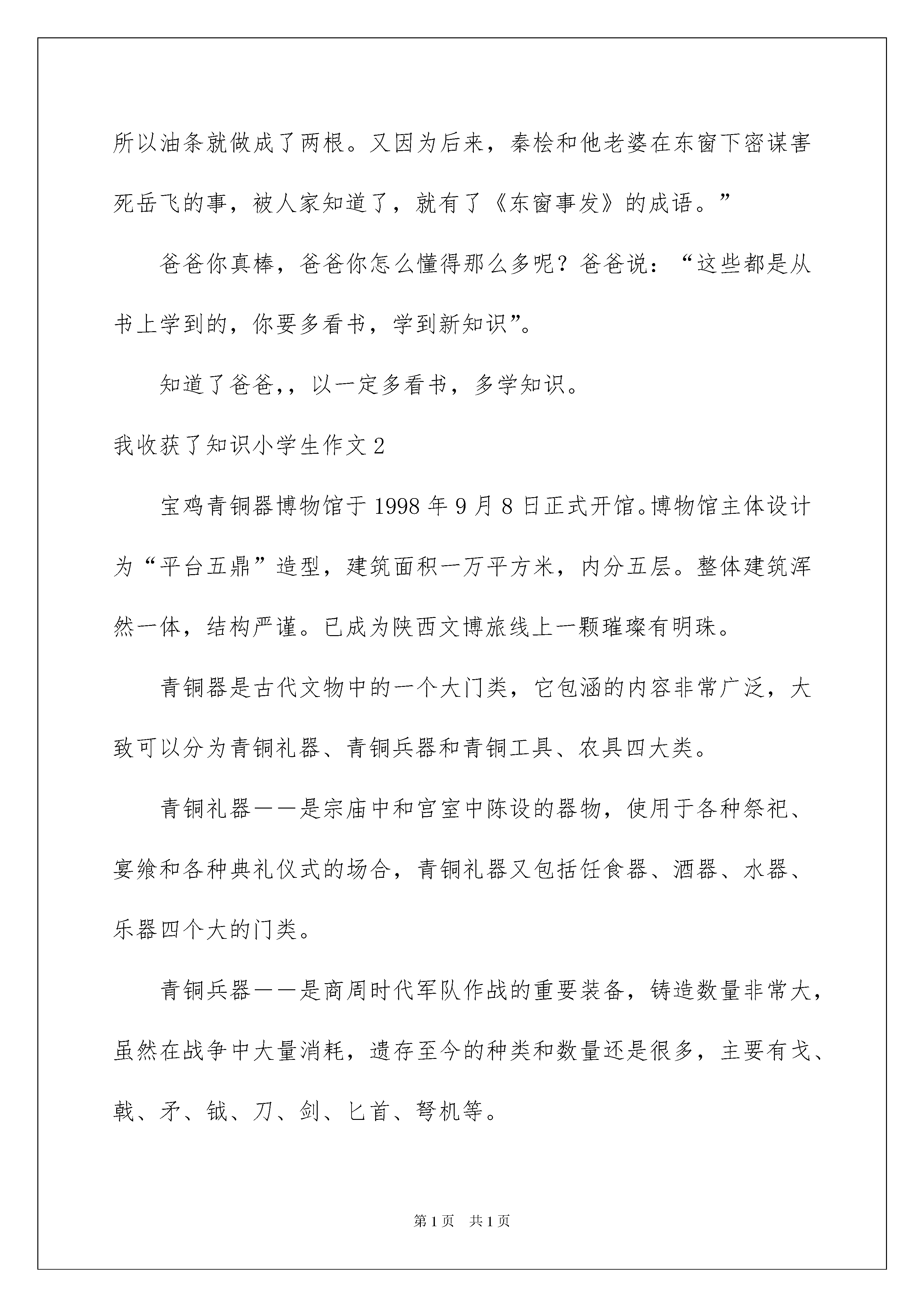 2022我收获了知识小学生作文我收获了知识小学生作文在学习、工作乃至生活中,大家都写过作文吧,借助作文可以提高我们的语言组织能力。那么一般作文是怎么写的呢?以下是我精心整理的我收获了知识小学生作文,希望能够帮助到大家。我收获了知识小学生作文1一天早上,吃早饭,奶奶买了几根油条。我拿起油条刚要吃的时候,爸爸说:“等等,先别急着吃,我来考考大家,有谁知道油条的来历吗?”大家你看看我,我看看你,都不知道。爸爸说:“我来给大家讲个故事吧。说宋朝的时候,有一个大奸臣,叫秦桧,用十二道金牌从前线召回了岳飞,又用莫须有的罪名害死了岳飞,大家都十分痛恨秦桧,把秦桧做成了油条,大家觉得还不解恨,又把他放在油锅里炸,然后把他们吃掉”。爸爸一讲,我一下子觉得学到了很多知识,爸爸懂得真多啊!我脑袋里突然又冒出了一个问号,为什么油条是两根的呢?爸爸接着说:“害死岳飞的时候,秦桧和他老婆王氏在东窗下密谋一起商量,是他们两一起害死了岳飞,所以油条就做成了两根。又因为后来,秦桧和他老婆在东窗下密谋害死岳飞的事,被人家知道了,就有了《东窗事发》的成语。”爸爸你真棒,爸爸你怎么懂得那么多呢?爸爸说:“这些都是从书上学到的,你要多看书,学到新知识”。知道了爸爸,,以一定多看书,多学知识。我收获了知识小学生作文2宝鸡青铜器博物馆于1998年9月8日正式开馆。博物馆主体设计为“平台五鼎”造型,建筑面积一万平方米,内分五层。整体建筑浑然一体,结构严谨。已成为陕西文博旅线上一颗璀璨有明珠。青铜器是古代文物中的一个大门类,它包涵的内容非常广泛,大致可以分为青铜礼器、青铜兵器和青铜工具、农具四大类。青铜礼器――是宗庙中和宫室中陈设的器物,使用于各种祭祀、宴飨和各种典礼仪式的场合,青铜礼器又包括饪食器、酒器、水器、乐器四个大的门类。青铜兵器――是商周时代军队作战的重要装备,铸造数量非常大,虽然在战争中大量消耗,遗存至今的种类和数量还是很多,主要有戈、戟、矛、钺、刀、剑、匕首、弩机等。青铜工具――青铜的使用首先是铸造生产工具,青铜工具传世和出土的数量都很多,由于在生产中广泛的使用,因此形式也各有不同,主要的有斧、斤、凿、锯等。青铜农具――在商周时代的农耕中,普遍使用青铜农具,这已是一个确定的现象,青铜农具目前发现较为稀少的原因是青铜珍贵,根据专世和出土的实物主要有耒、铲、锛、镰等。从青铜器博物馆出来,我知道了古代人的用具和我们现代人用的不一样。它们没有我们先进。但它却反映那个时代历史的情况,件件物品凝聚着劳动人民的聪明才智,这次参观—我收获了知识。我收获了知识小学生作文310月19日下午,我们去了鸟巢,看中法建交50周年的一个表演活动。那里的风景恍如天堂一般美丽,河水清澈见底,花草树木生机勃勃,种类也很多,有桃树,杏树,柳树和各种各样的花,都争奇斗艳,竞相开放。到了演出的地方,那里真是人山人海啊!我是什么也看不见呀!突然,我看见一条小缝,这时一位好心的阿姨说:“前面有许多小孩,你也过去吧。”我钻了进去。今天真是出乎意料啊,爸爸把手机借我拍照。我高兴的跳了起来,拿着手机“咔嚓”地左一张右一张照了好多张。过了一个多小时,这个令我梦寐以求的演出终于开始了。只见一些迷雾弥散开来,,顿时声音震耳欲聋。最先动的是龙马,他那脖子,一会变长,一会变短。蜘蛛的8条长长的爪子,一会向前伸,一会向后缩。可好玩了!引起我注意的是龙马,因为它的脖子一伸,足有12米高。而让这两个机器动的是最下面的小车子。龙马是一只身高12米,重达47吨的龙头马身神兽,蜘蛛是一只高5.7米,体宽6米重37吨的机械蜘蛛。为操作两个庞然大物,每只巨兽都配备了15名操纵师,而整个演出团队多达180多人。龙马大型机械装置,是取自于中国成语“龙马精神”的神兽,“龙马”运用了中国文化元素,根据中国古代传说故事演绎创作而来。今天,我收获了许许多多的知识!我收获了知识小学生作文4很小很小的.时候,妈妈经常抱着我坐在沙发上,指着识字卡对我说:“妈妈是一,爸爸是二,宝宝是三……”望着妈妈的眼神,我快活地手舞足蹈。稍稍长大些,我的心里便充满了许许多多神奇的幻想。来到黄波英语幼儿园,老师教我们认识生字和儿童读物。多此,我对看书产生了兴趣。当我背上书包,迈着轻盈的步伐走进小学一年级时,老师辅导我们学习课外读物。听着老师的讲解,连挑带拣地辨别着认识的字,感情着字里行间有趣的故事,我开始喜欢阅读课外书了。二年级开始,老师要求我们写日记,于是我便知道了课外书的重要,对课外书更是爱不释手。如今,我已是四年级的小学生了。我早已能够独立体会每本读物的内容了。写作能力也有很大的提高,老师常表扬我说:“你的作文